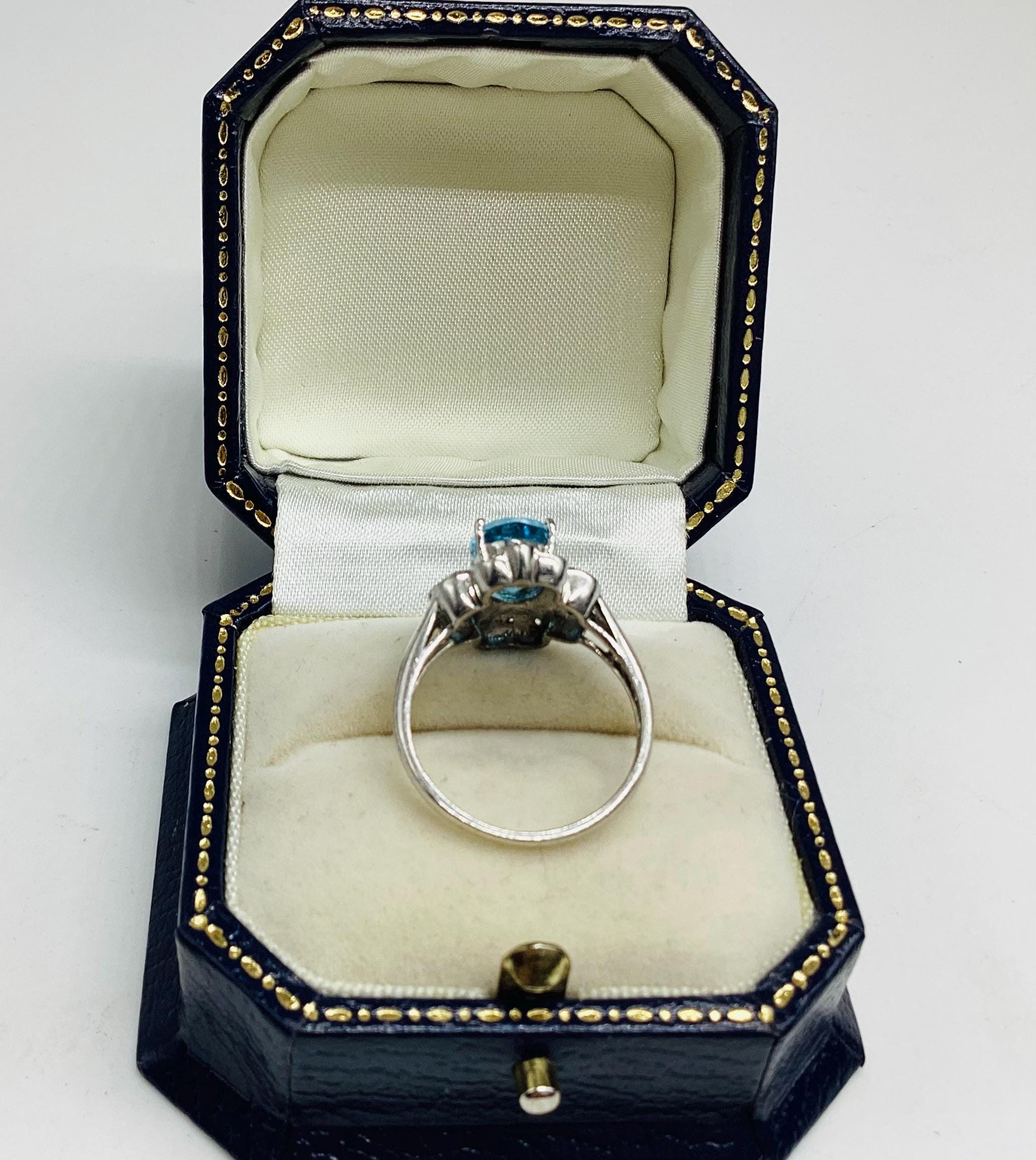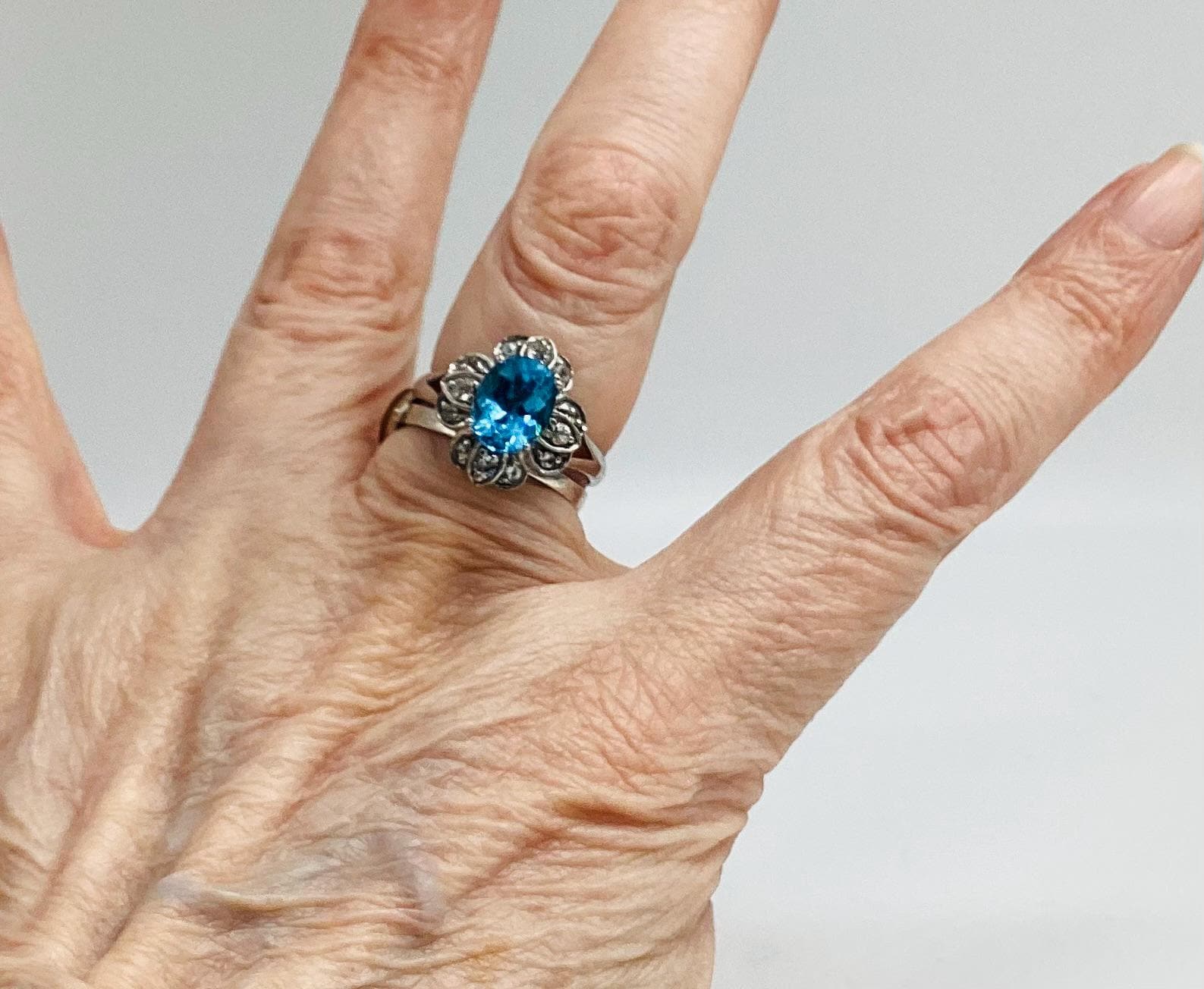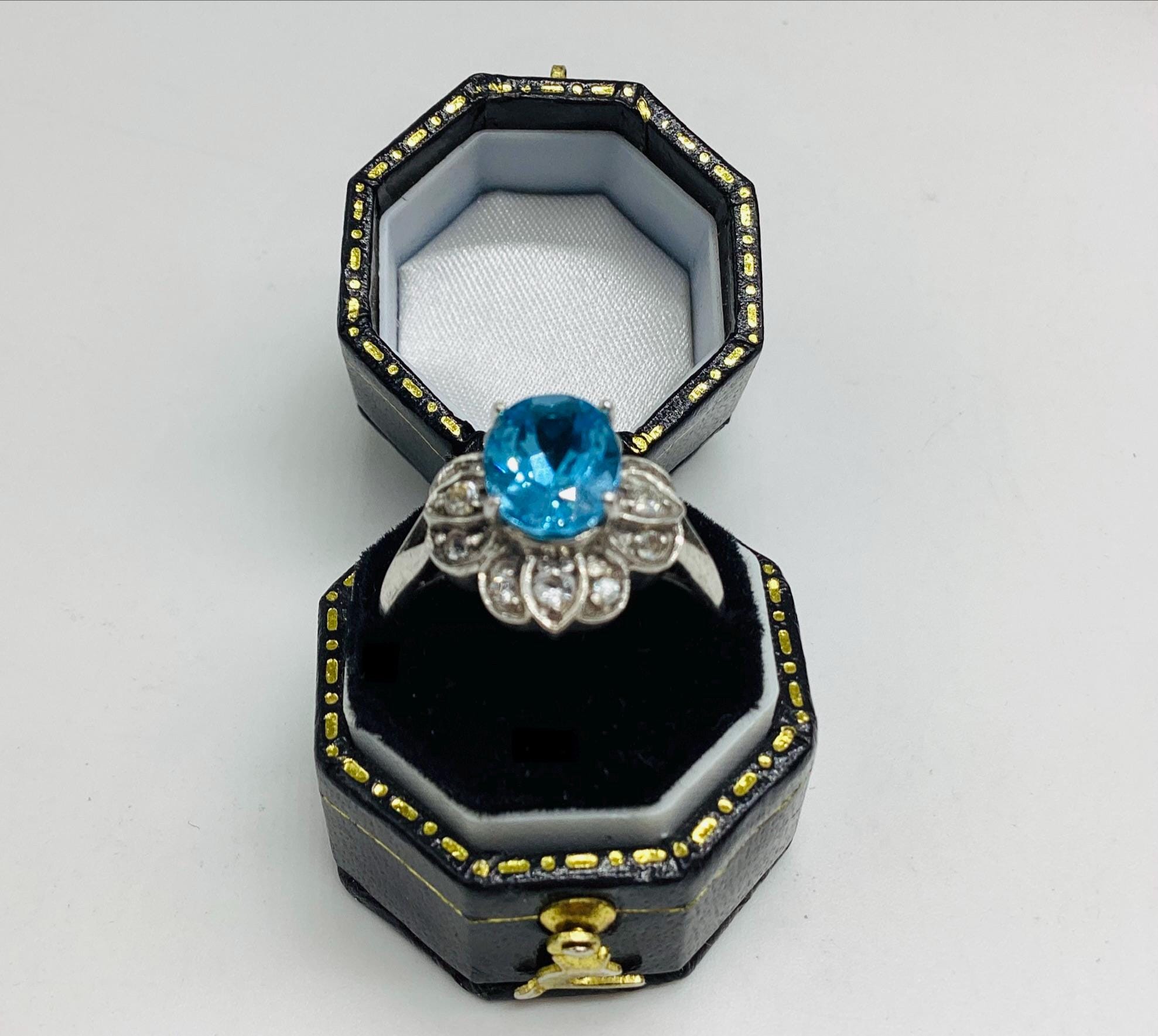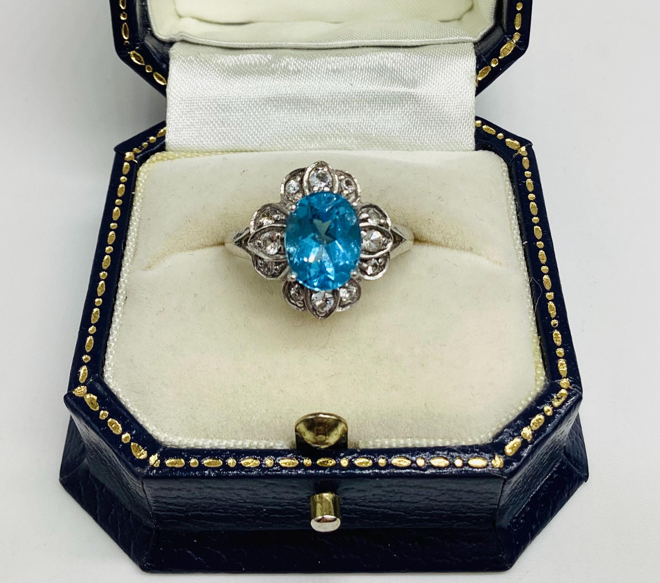 A very pretty brilliant cut blue topaz with faceted quartz crystals in a daisy setting.