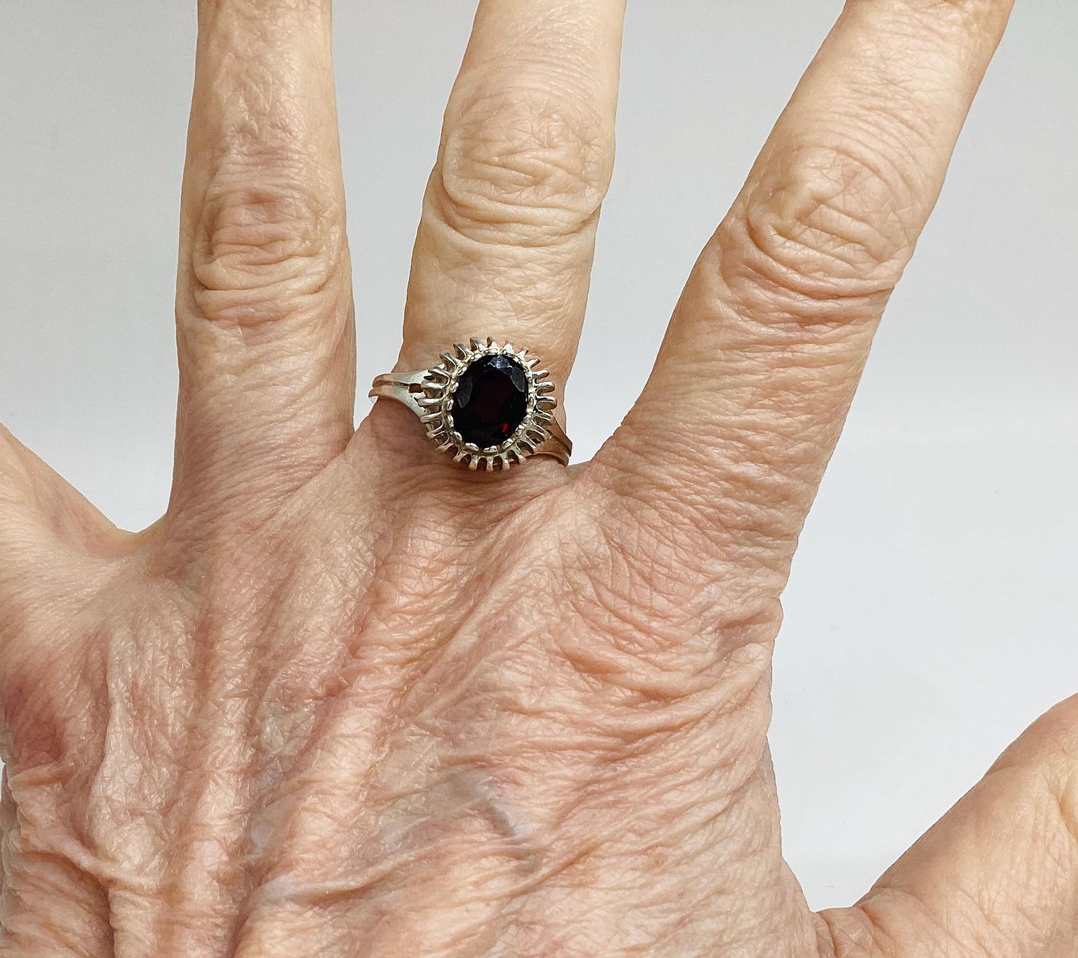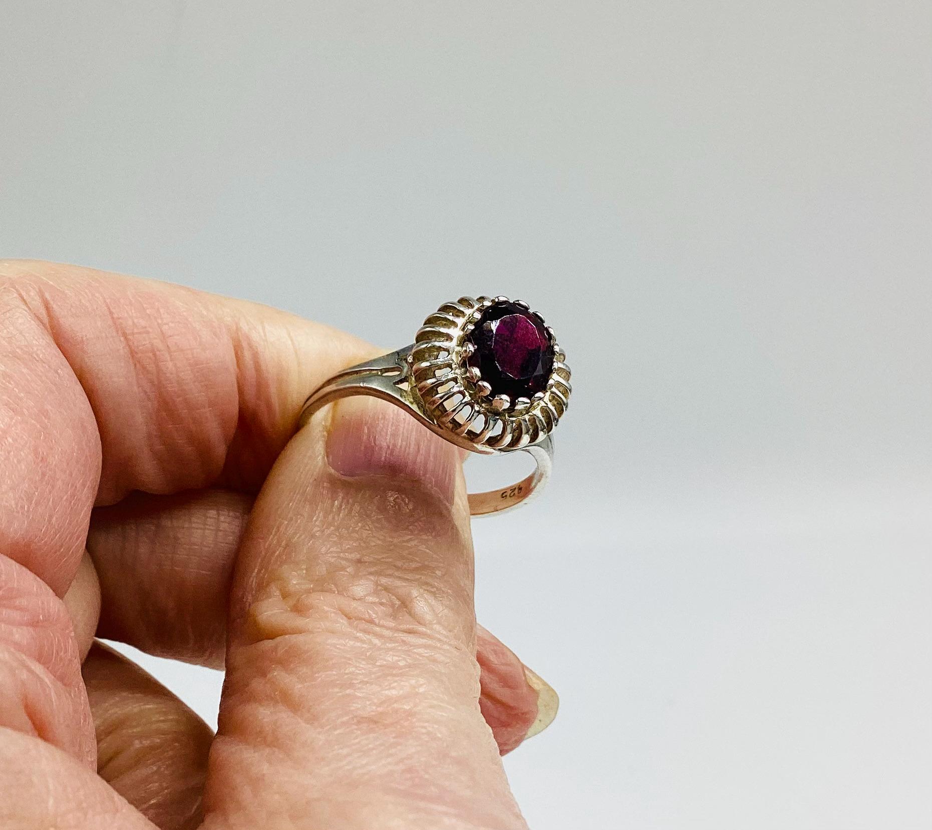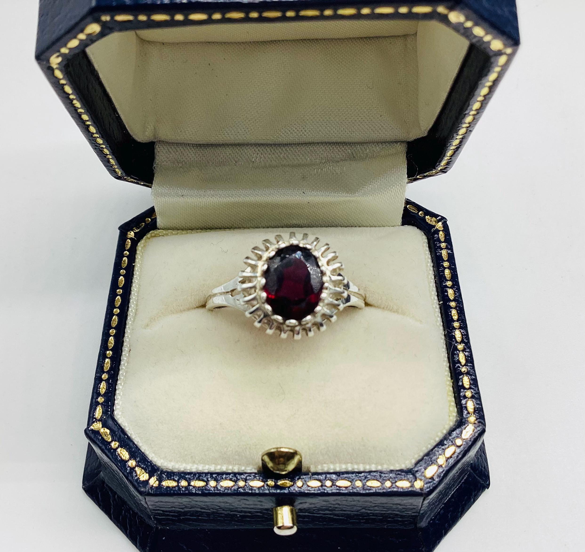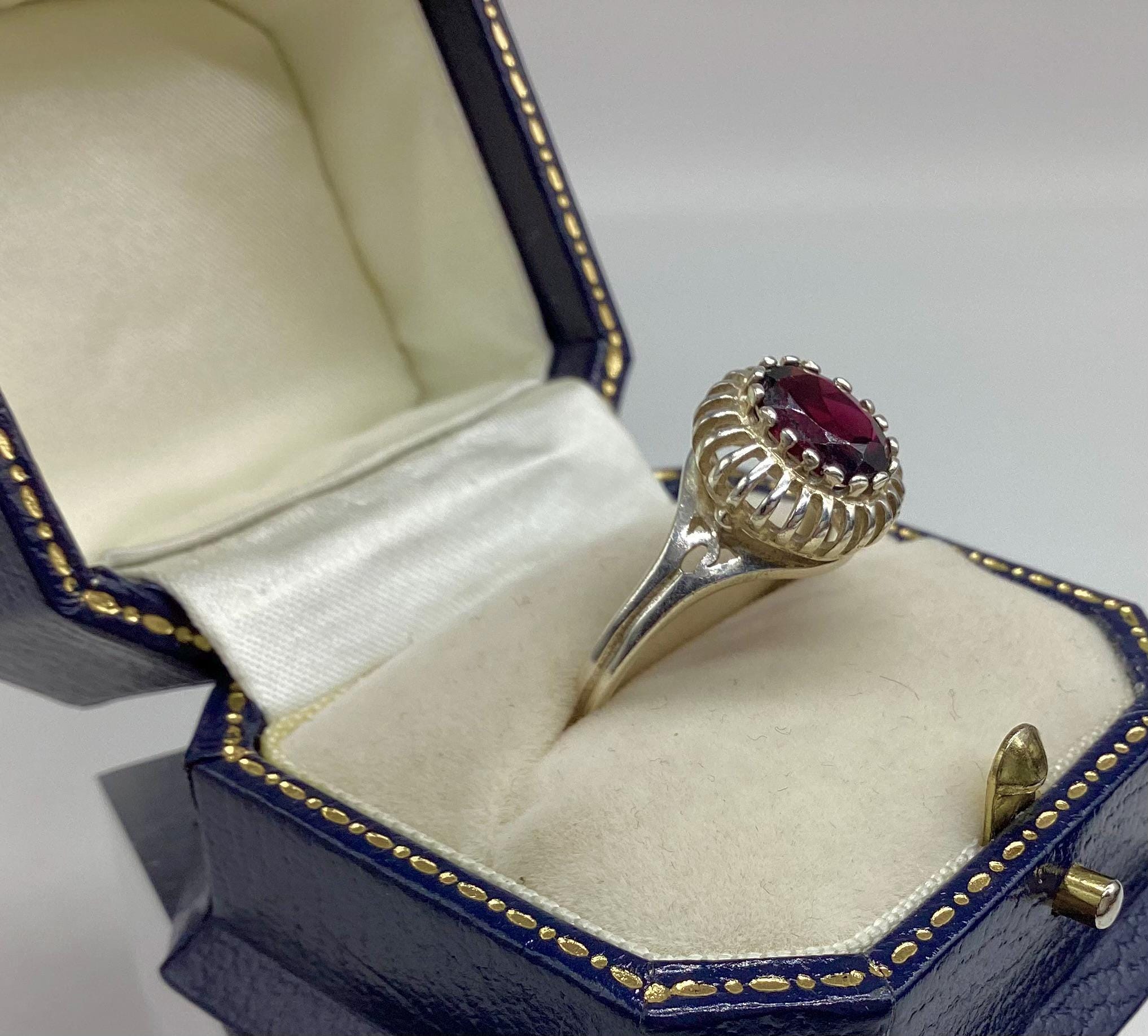 A beautiful vintage sterling silver garnet ring featuring a rich deep-red oval garnet set in an unusual raised crown gallery. The sculptural radiating mount gives the ring a striking mid-century cocktail style while allowing light to pass through the stone, enhancing the garnet’s warm wine-red colour. Elegant and eye-catching, this is a lovely vintage piece dating from around the 1950s–1960s.