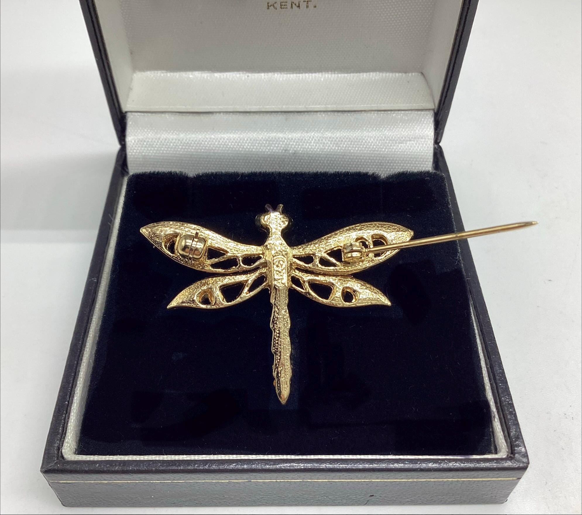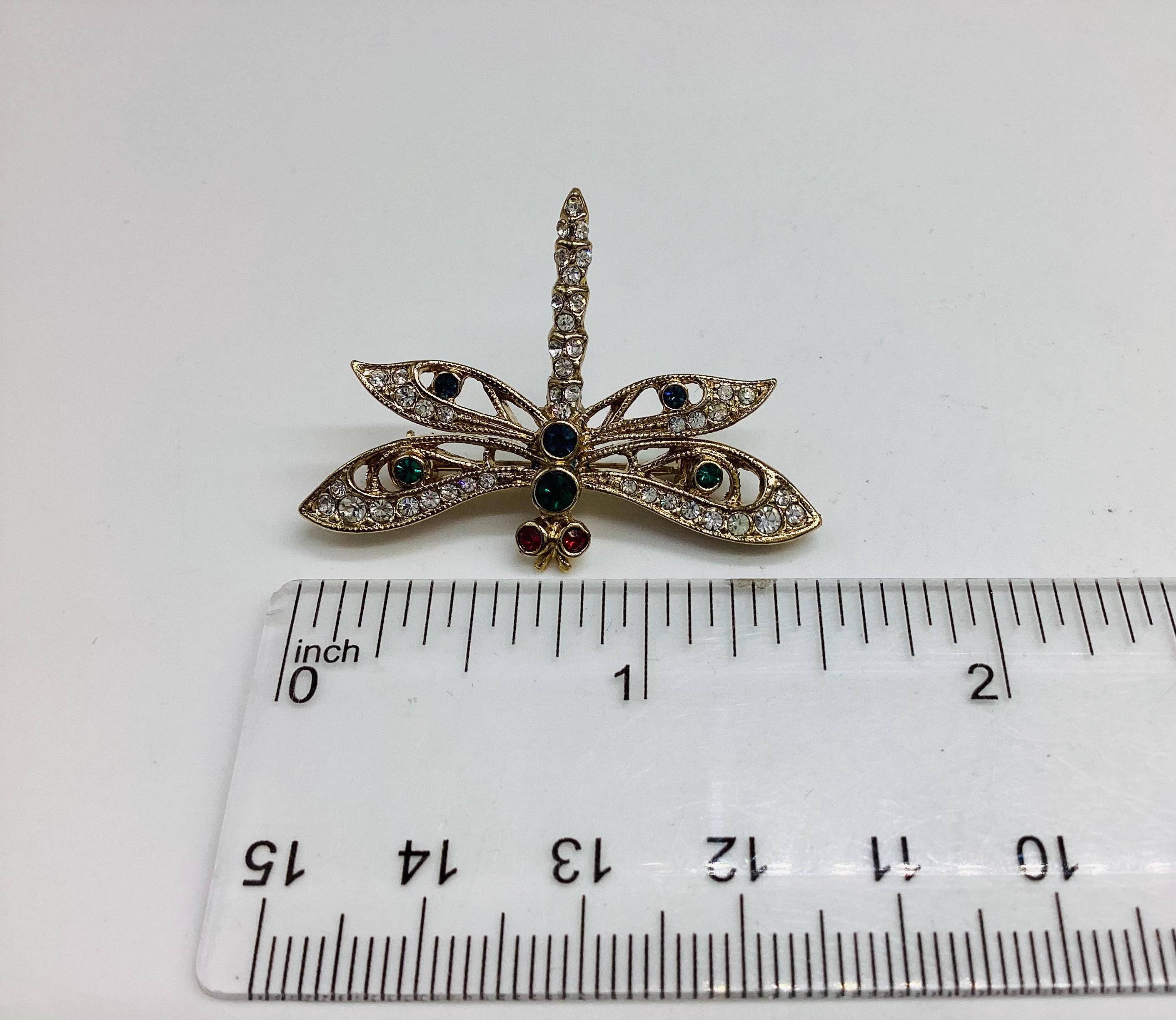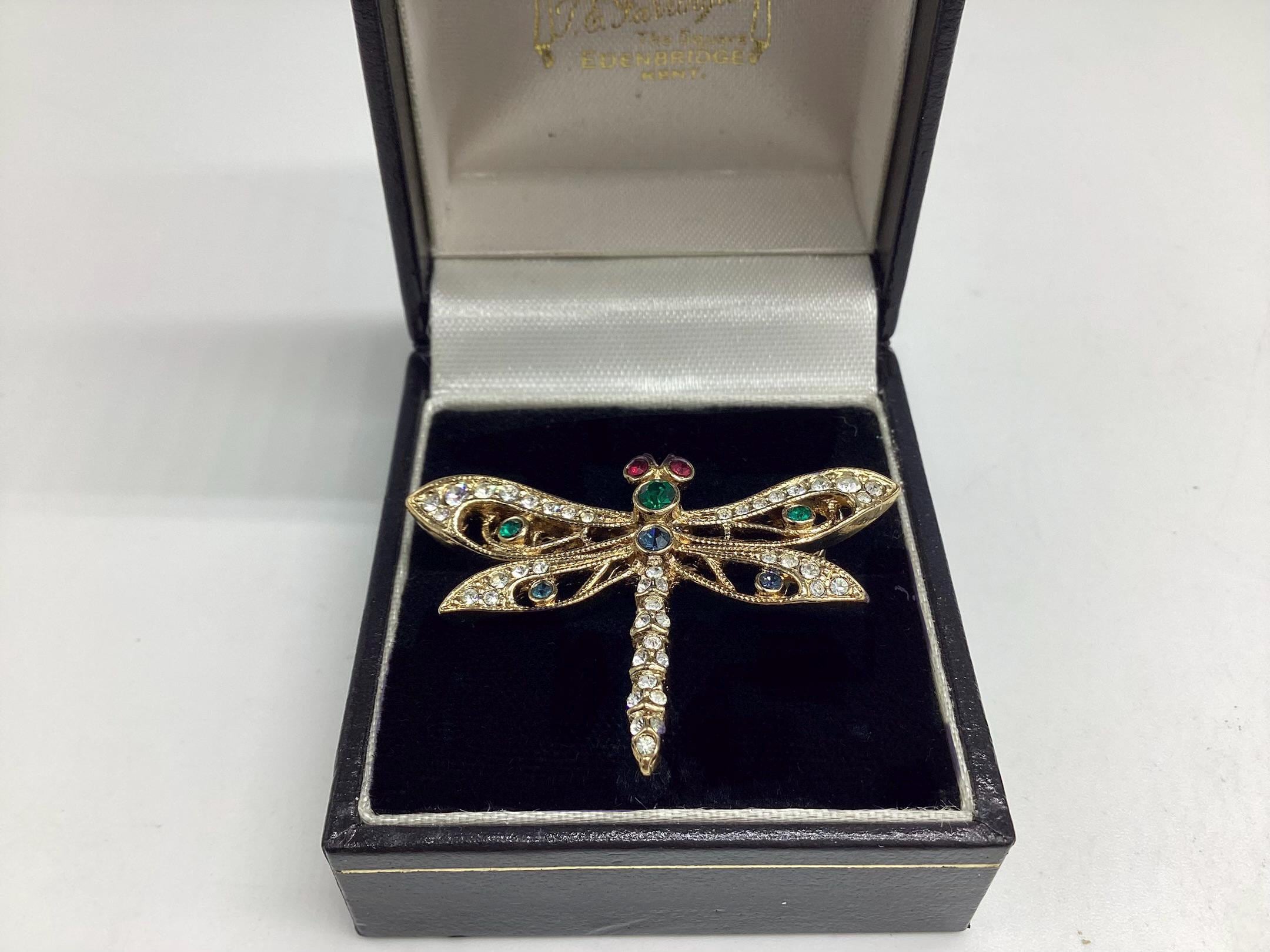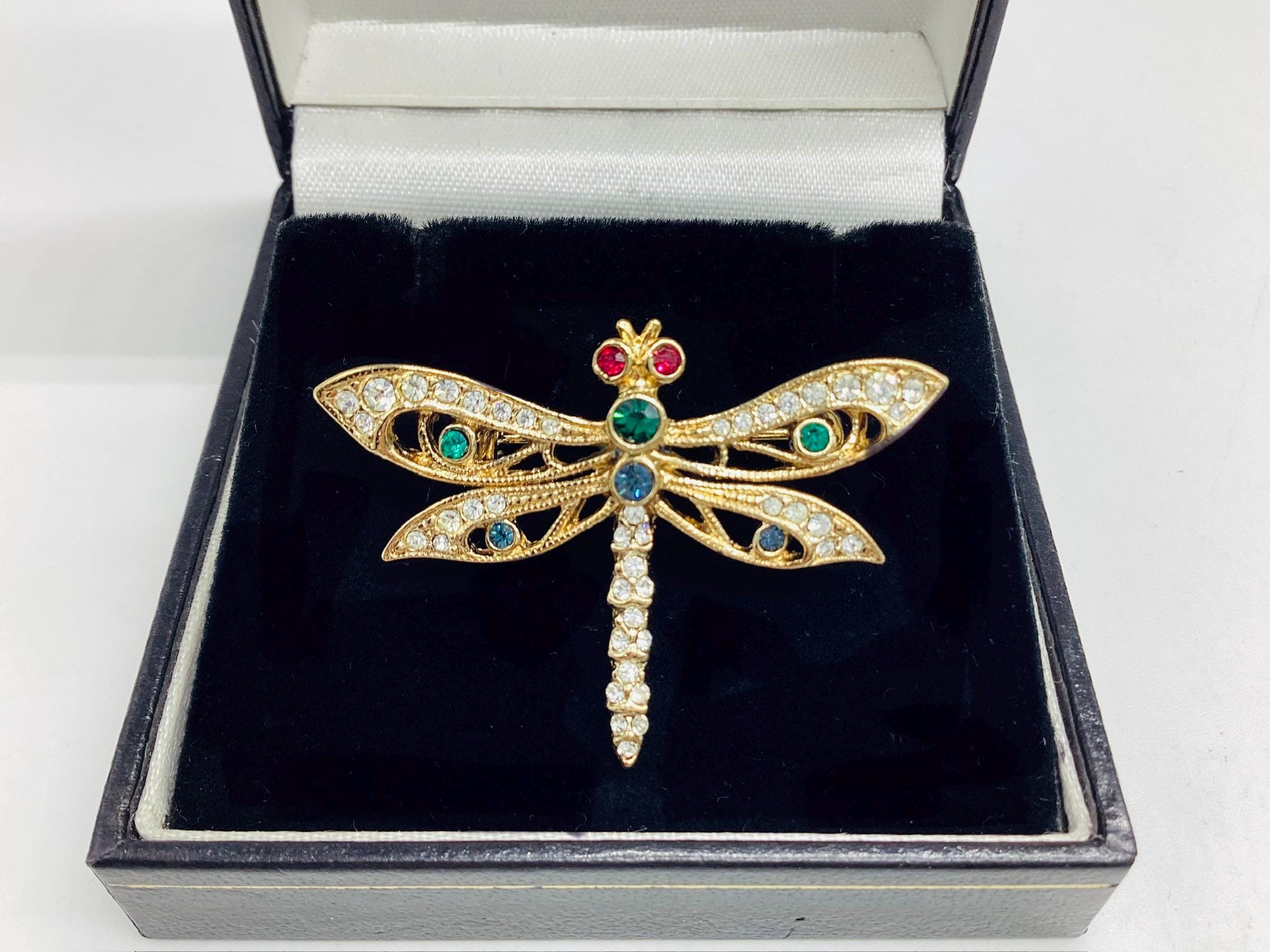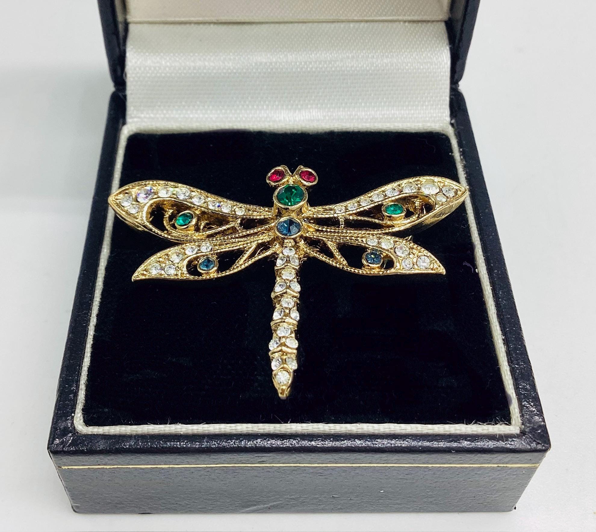 A stunningly beautiful multicolored Swarovski crystal set 22ct gold plated dragonfly. In an Attwood and Sawyer box. Lovely condition with all stones in place.