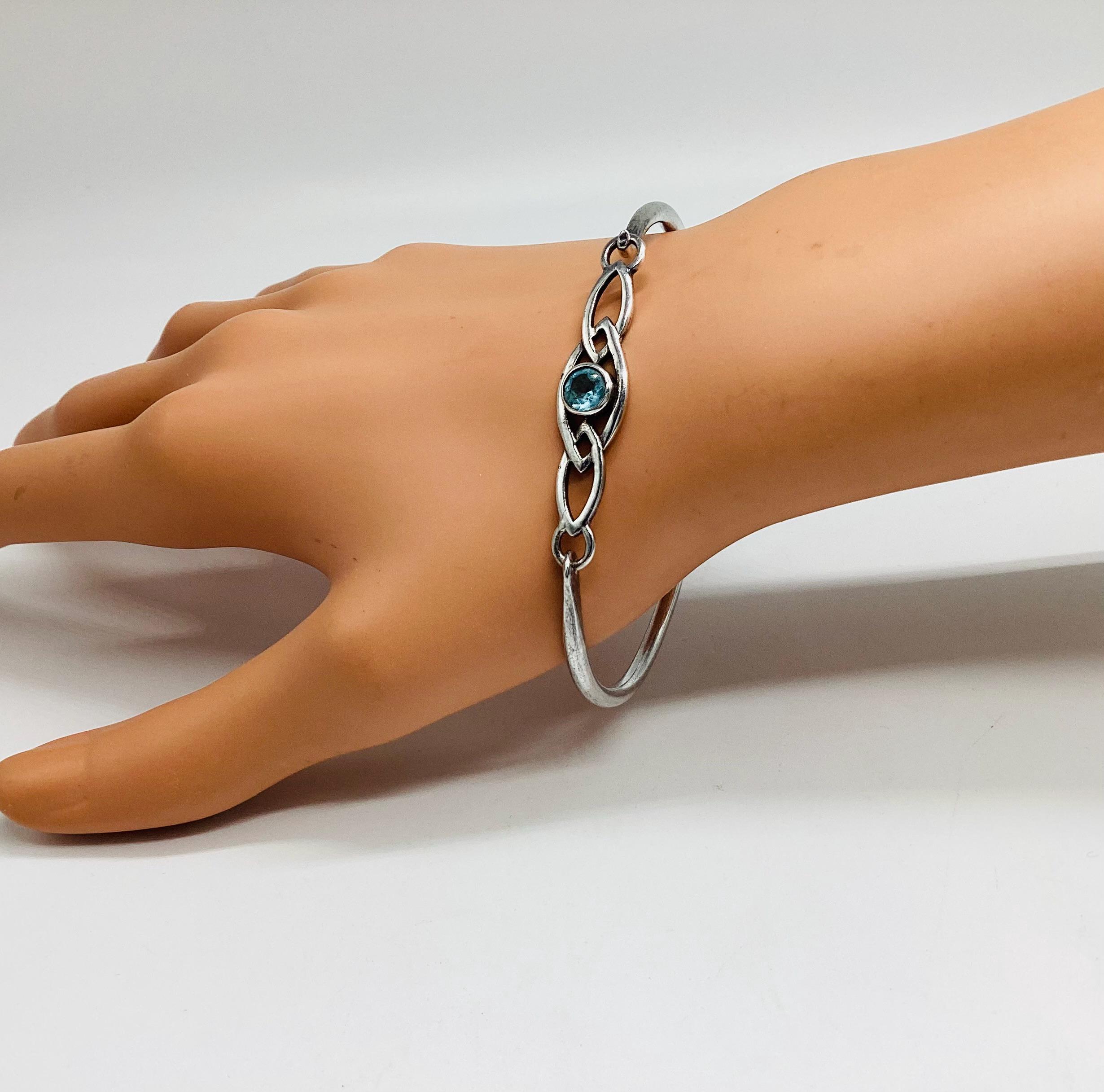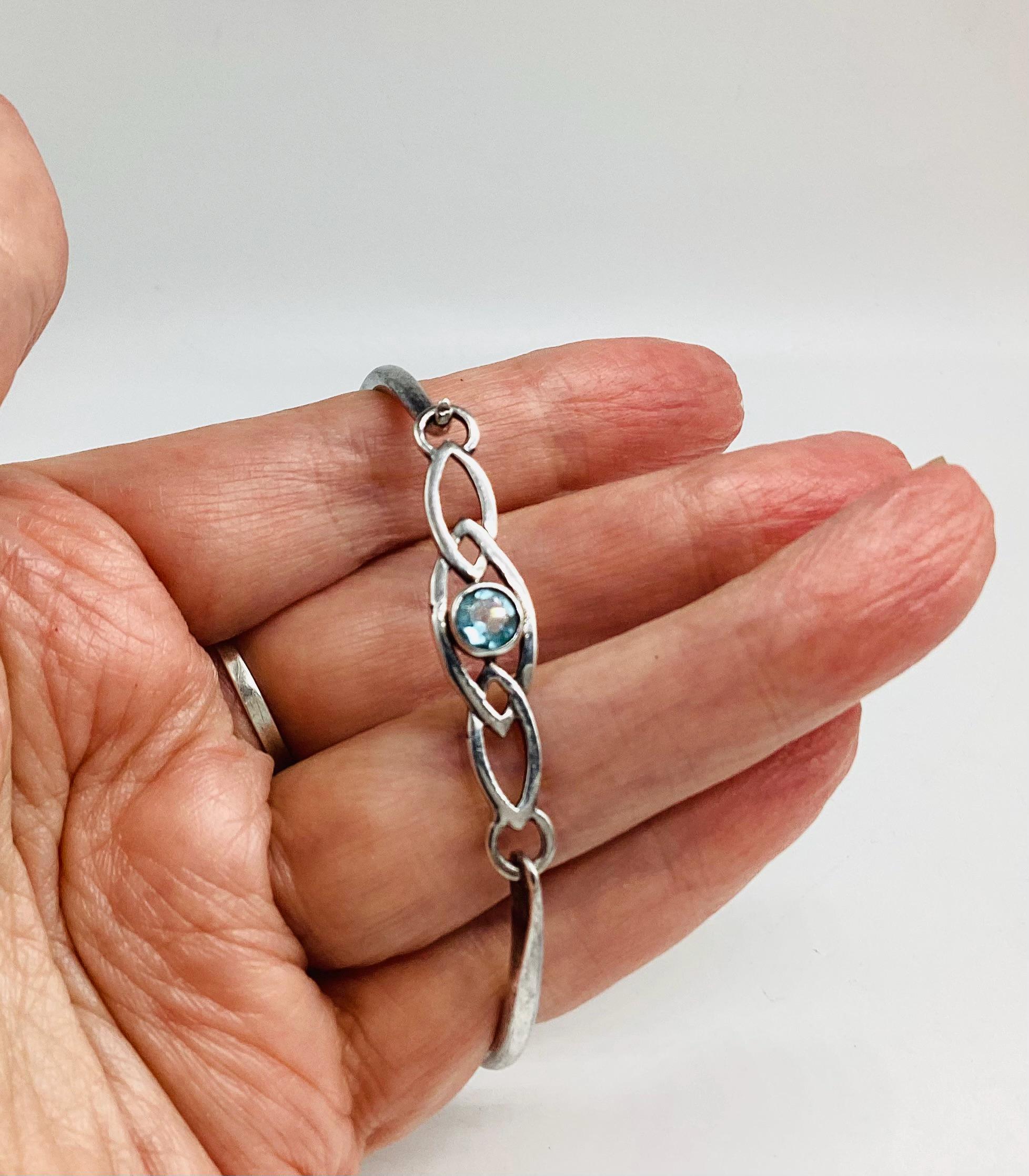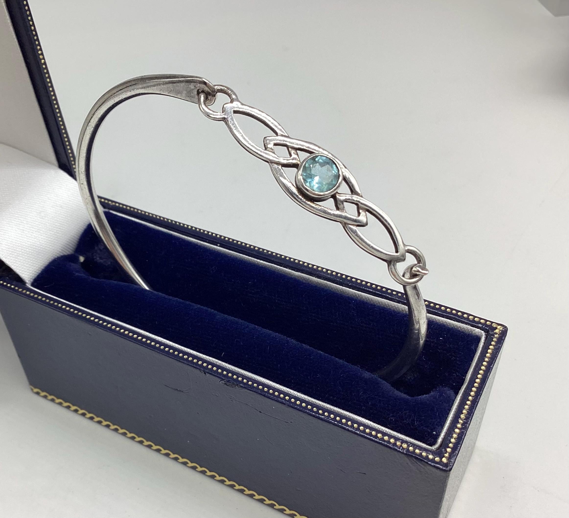 Delightful silver bangle with a faceted blue topaz. Classic Celtic setting. Lovely as gifts or a treat for yourself. Would make great wedding bangles and look good against a summer tan. Stamped 925 as shown in final photo.