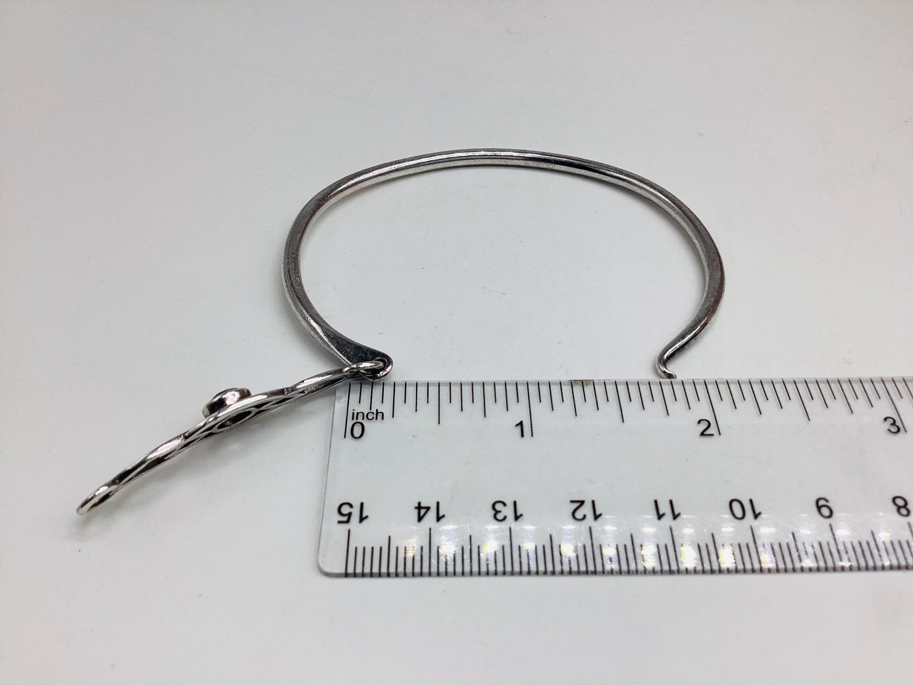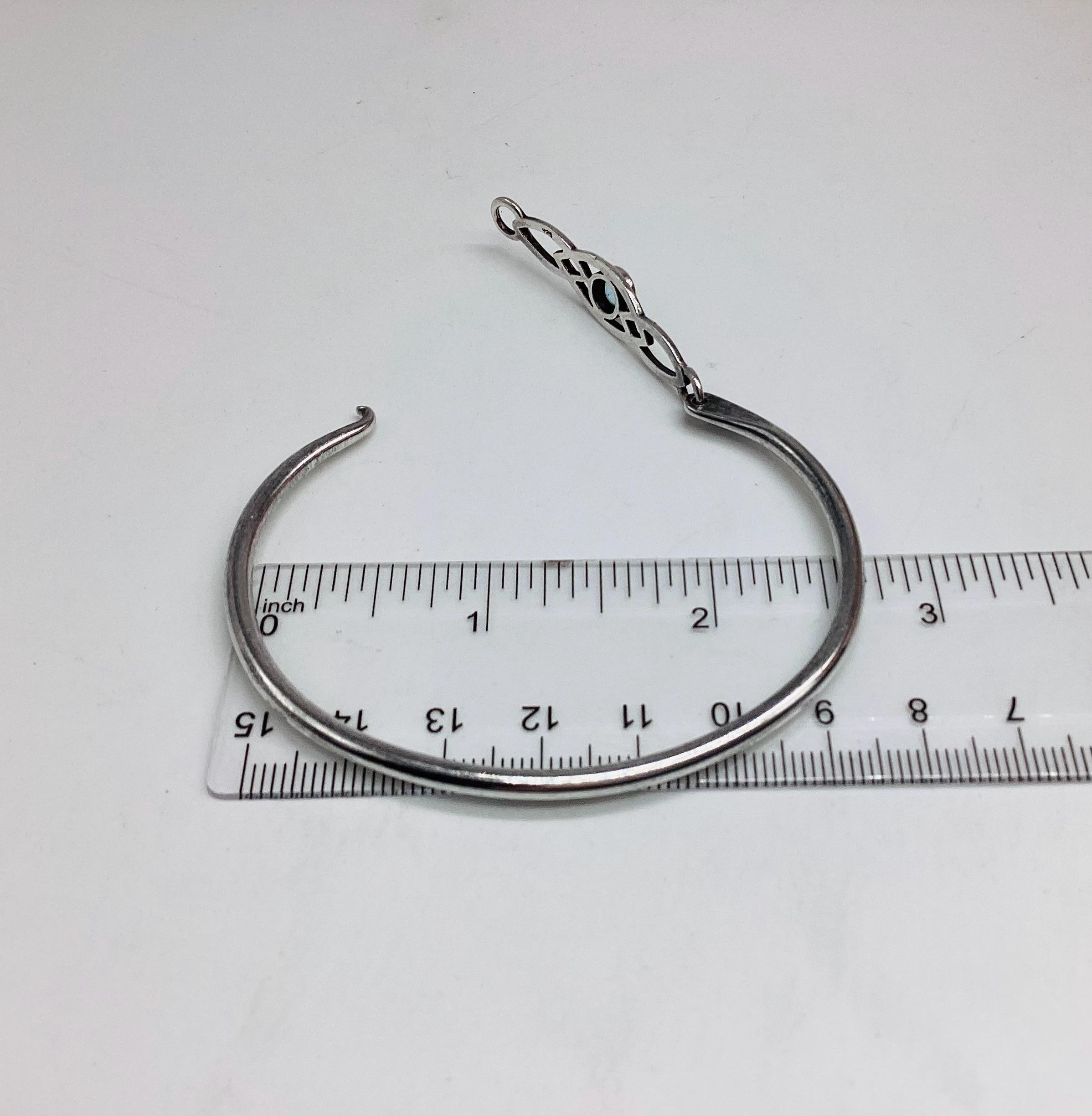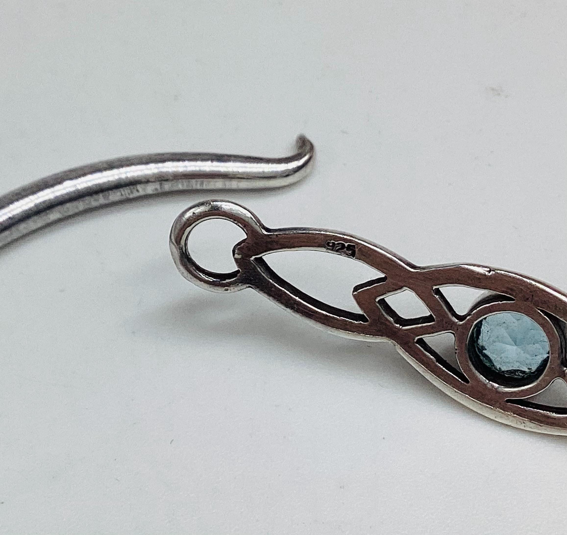 Delightful silver bangle with a faceted blue topaz. Classic Celtic setting. Lovely as gifts or a treat for yourself. Would make great wedding bangles and look good against a summer tan. Stamped 925 as shown in final photo.