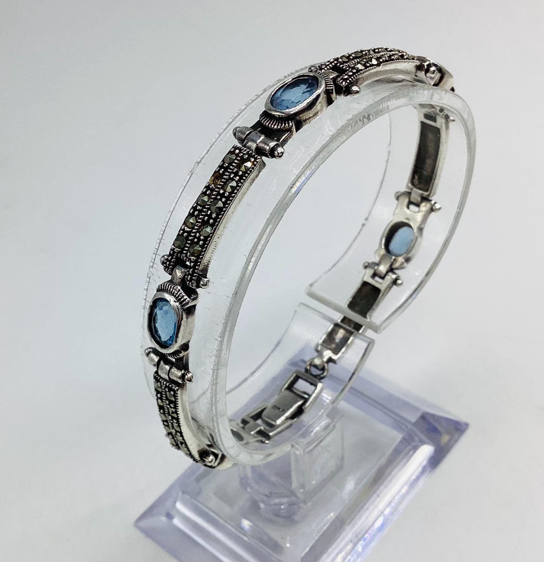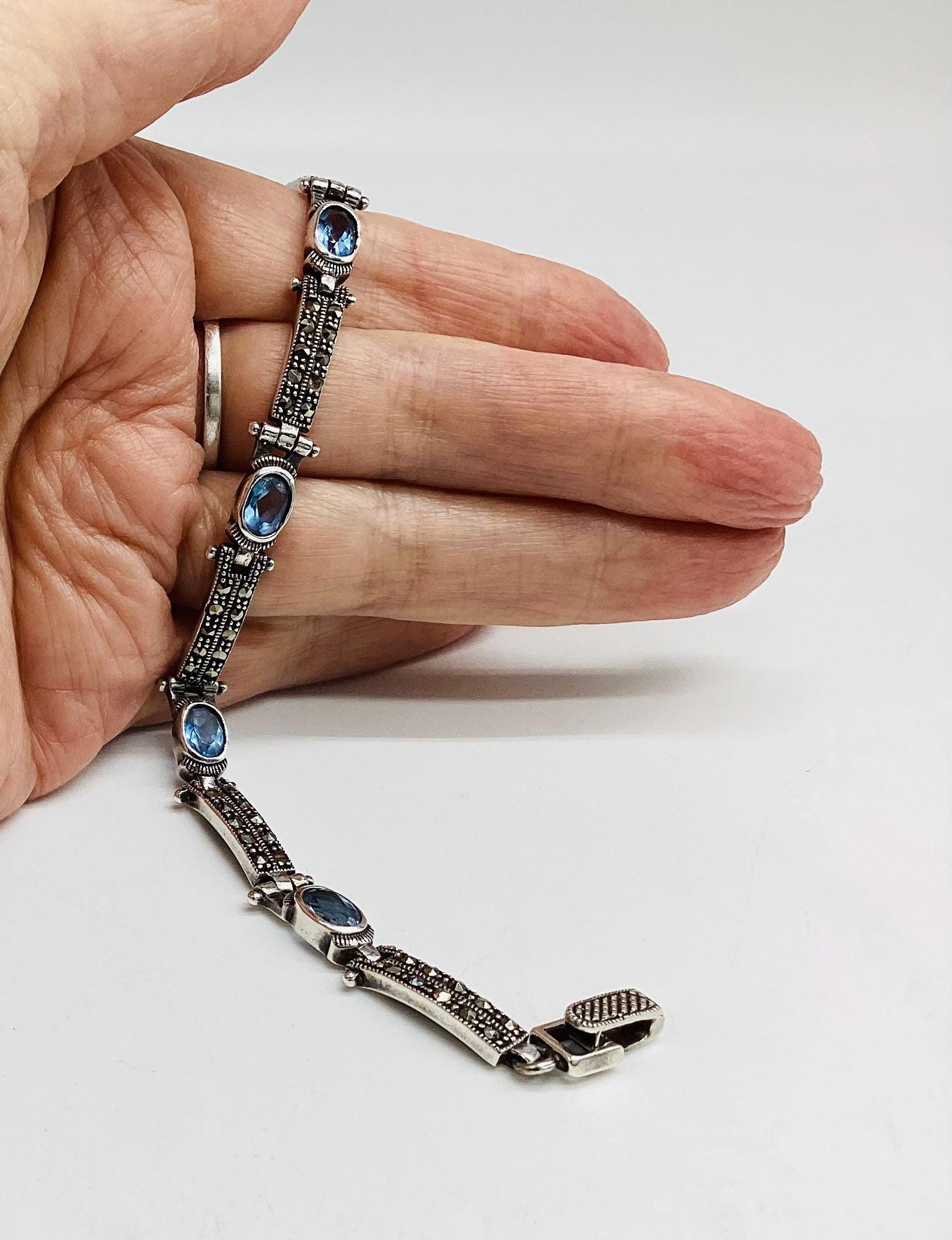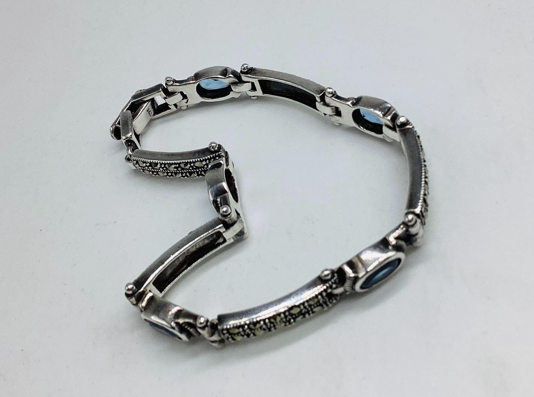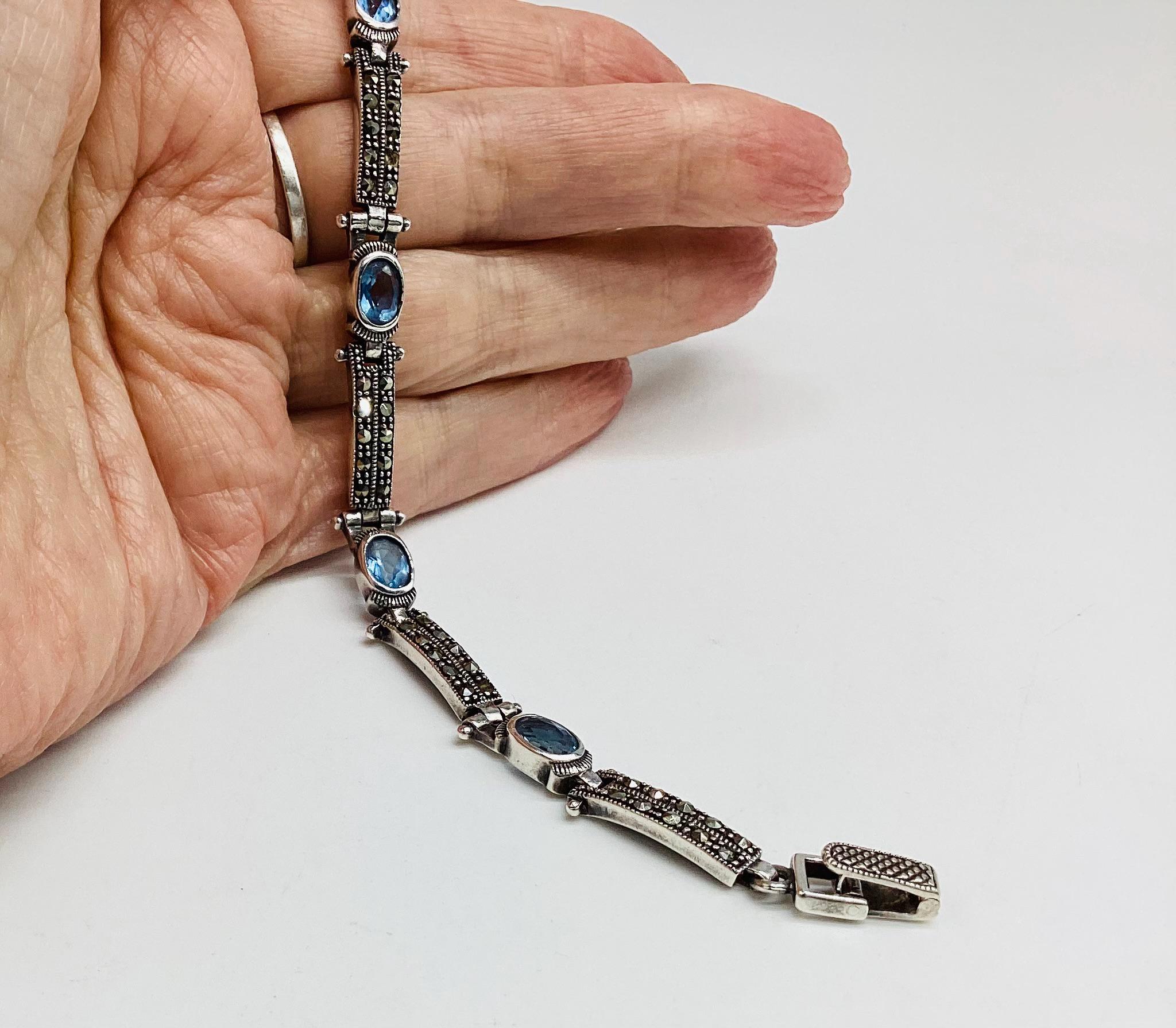A delightfully pretty bracelet with super ice blue topaz stones in solid sterling silver with marcasite. Each panel is hinged giving the whole piece a wonderful articulated and liquid feel. Lovely wedding or bridal bracelet. "Something Old, Something Blue" November birthstone