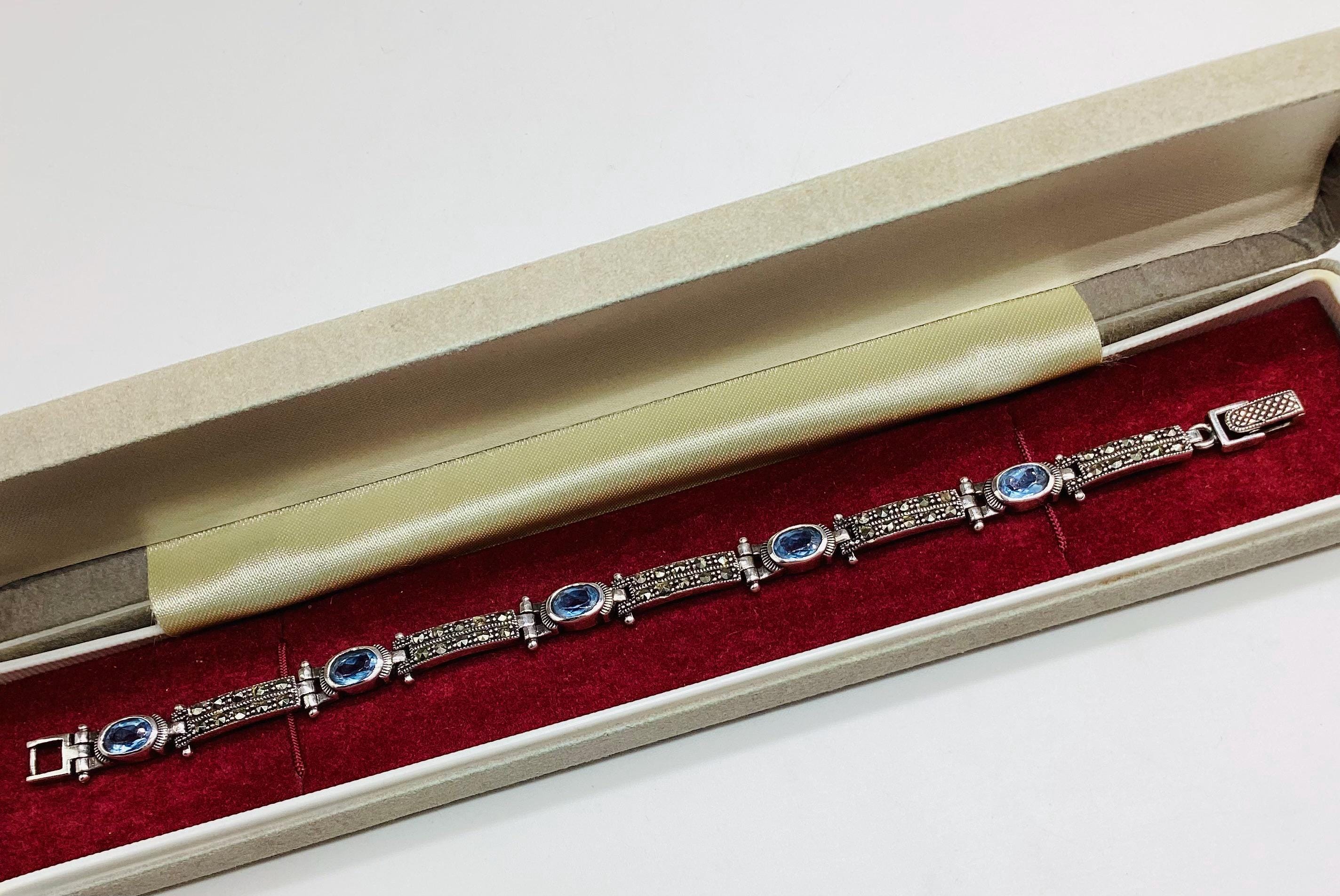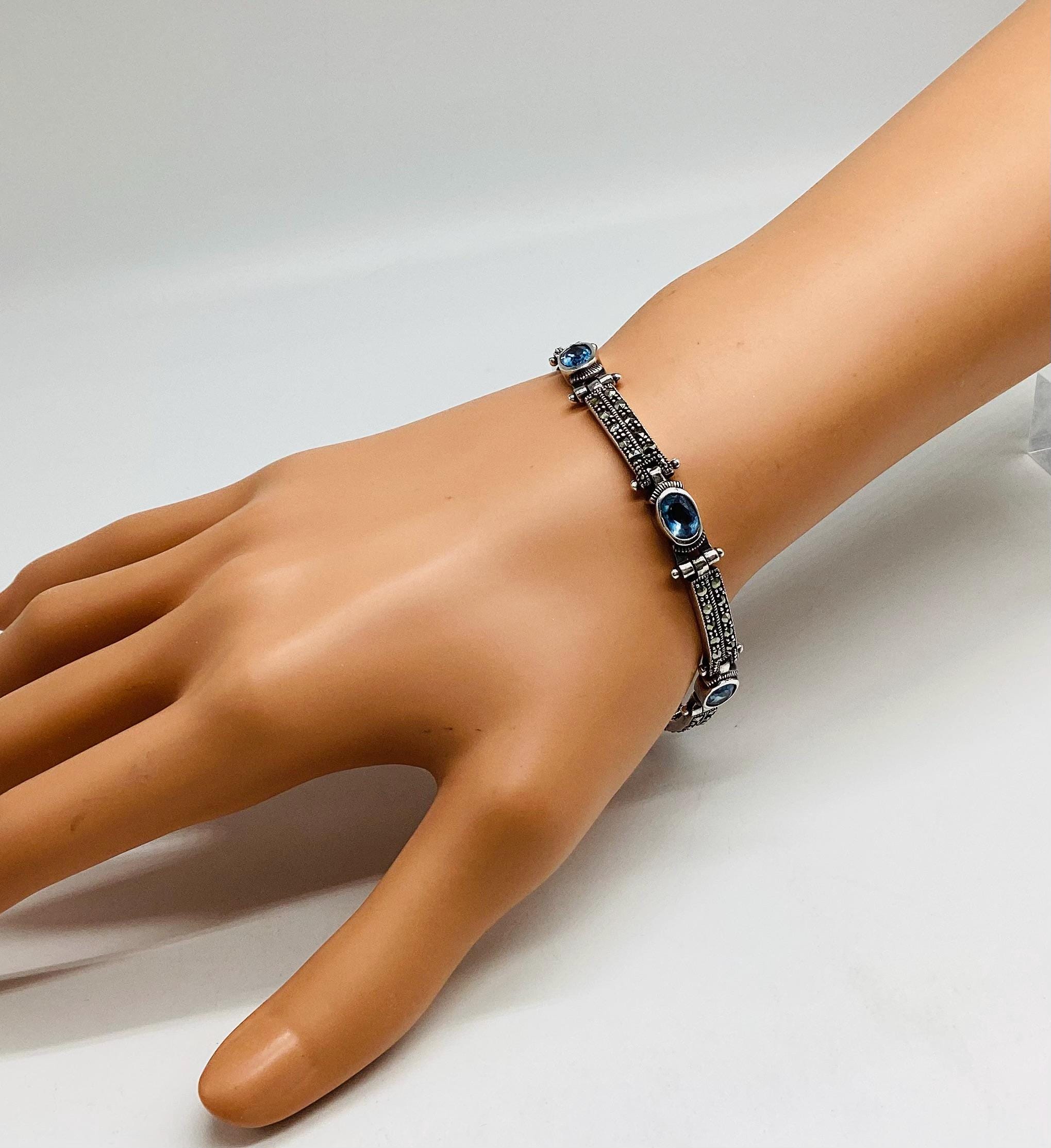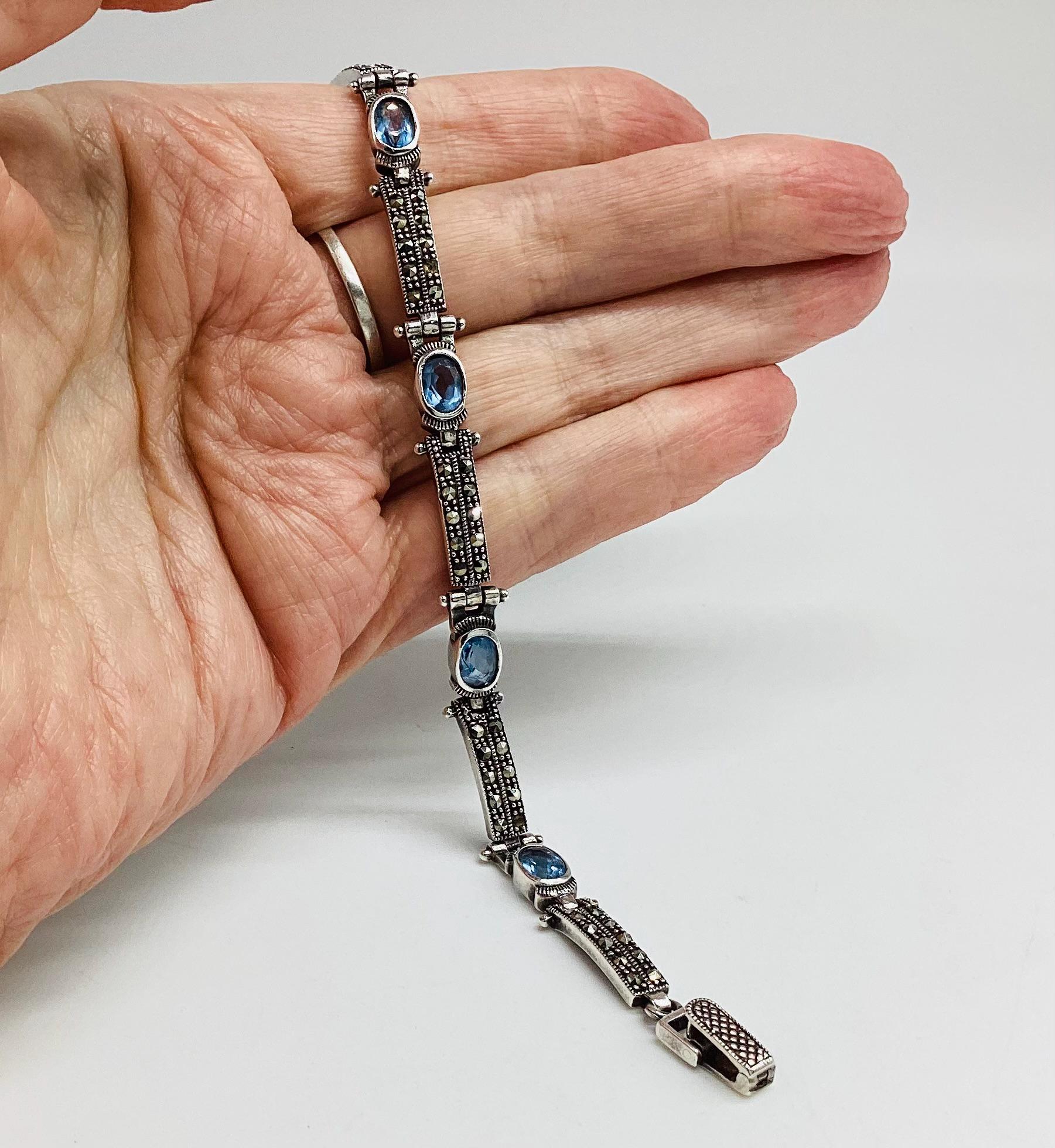 A delightfully pretty bracelet with super ice blue topaz stones in solid sterling silver with marcasite. Each panel is hinged giving the whole piece a wonderful articulated and liquid feel. Lovely wedding or bridal bracelet. "Something Old, Something Blue" November birthstone