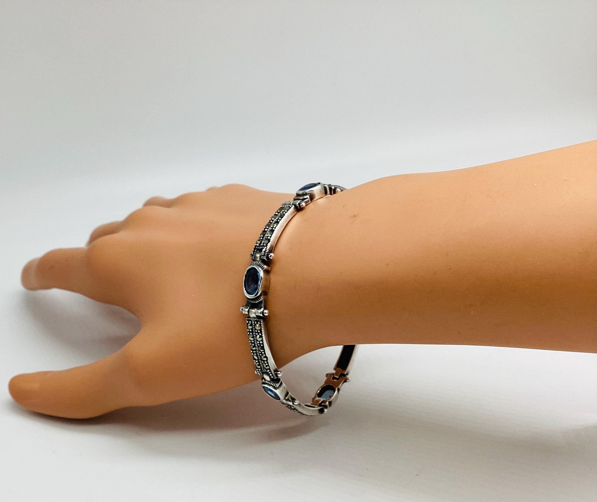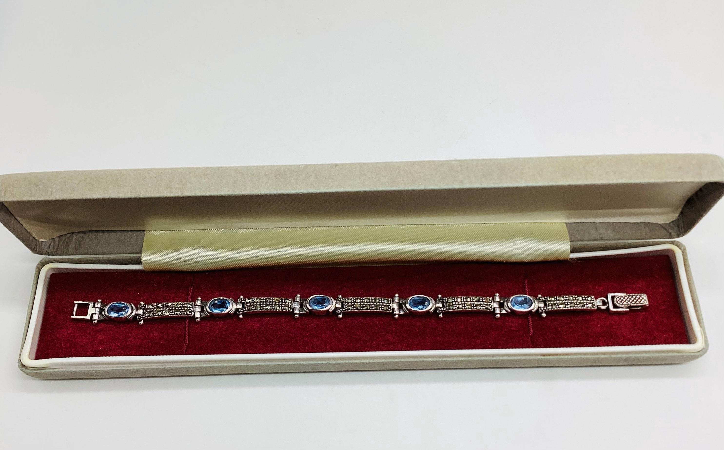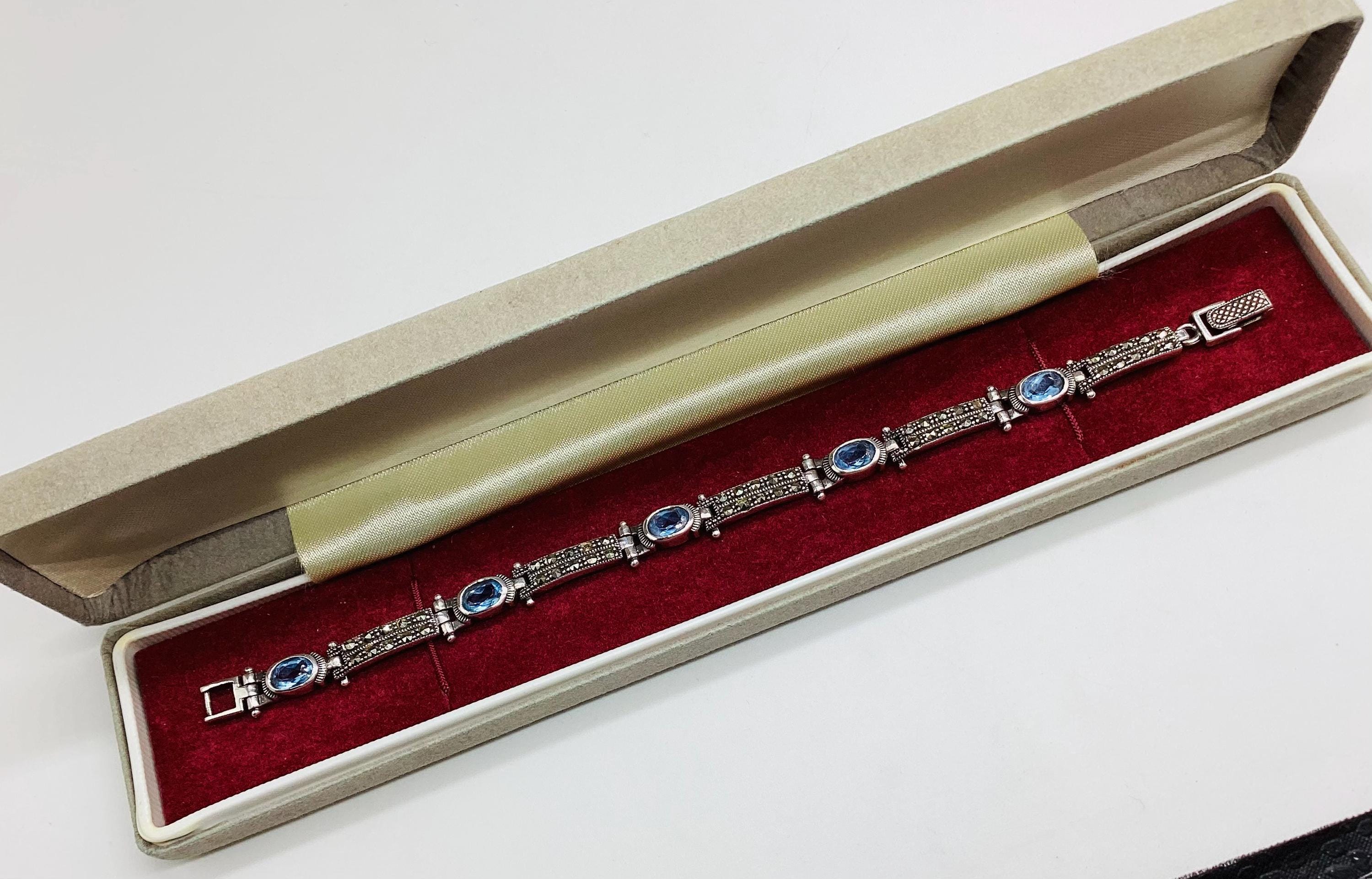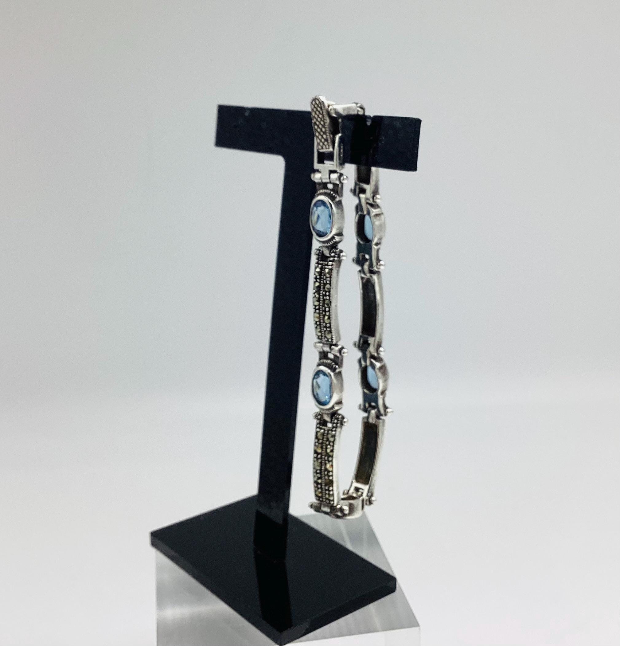 A delightfully pretty bracelet with super ice blue topaz stones in solid sterling silver with marcasite. Each panel is hinged giving the whole piece a wonderful articulated and liquid feel. Lovely wedding or bridal bracelet. "Something Old, Something Blue" November birthstone