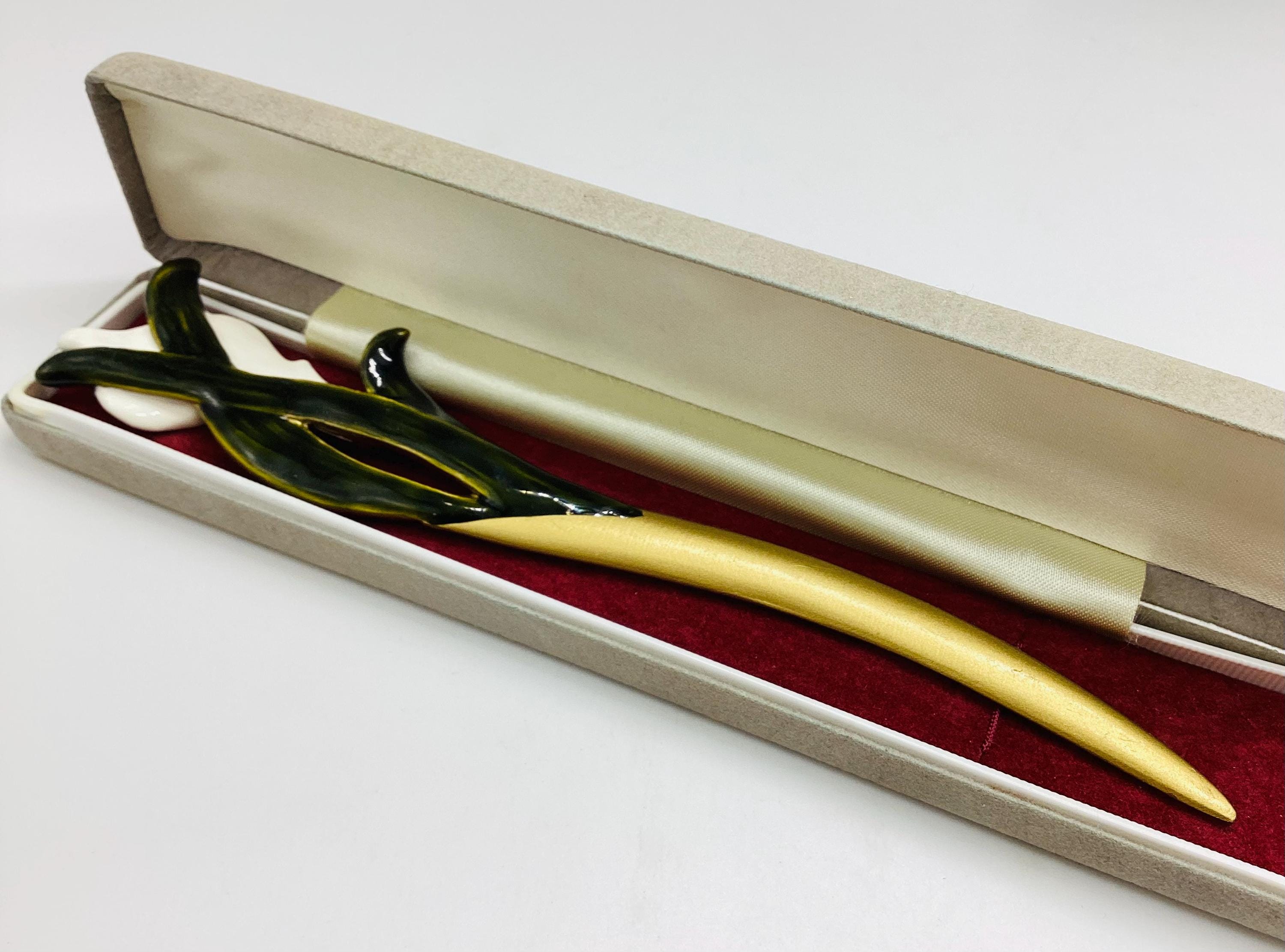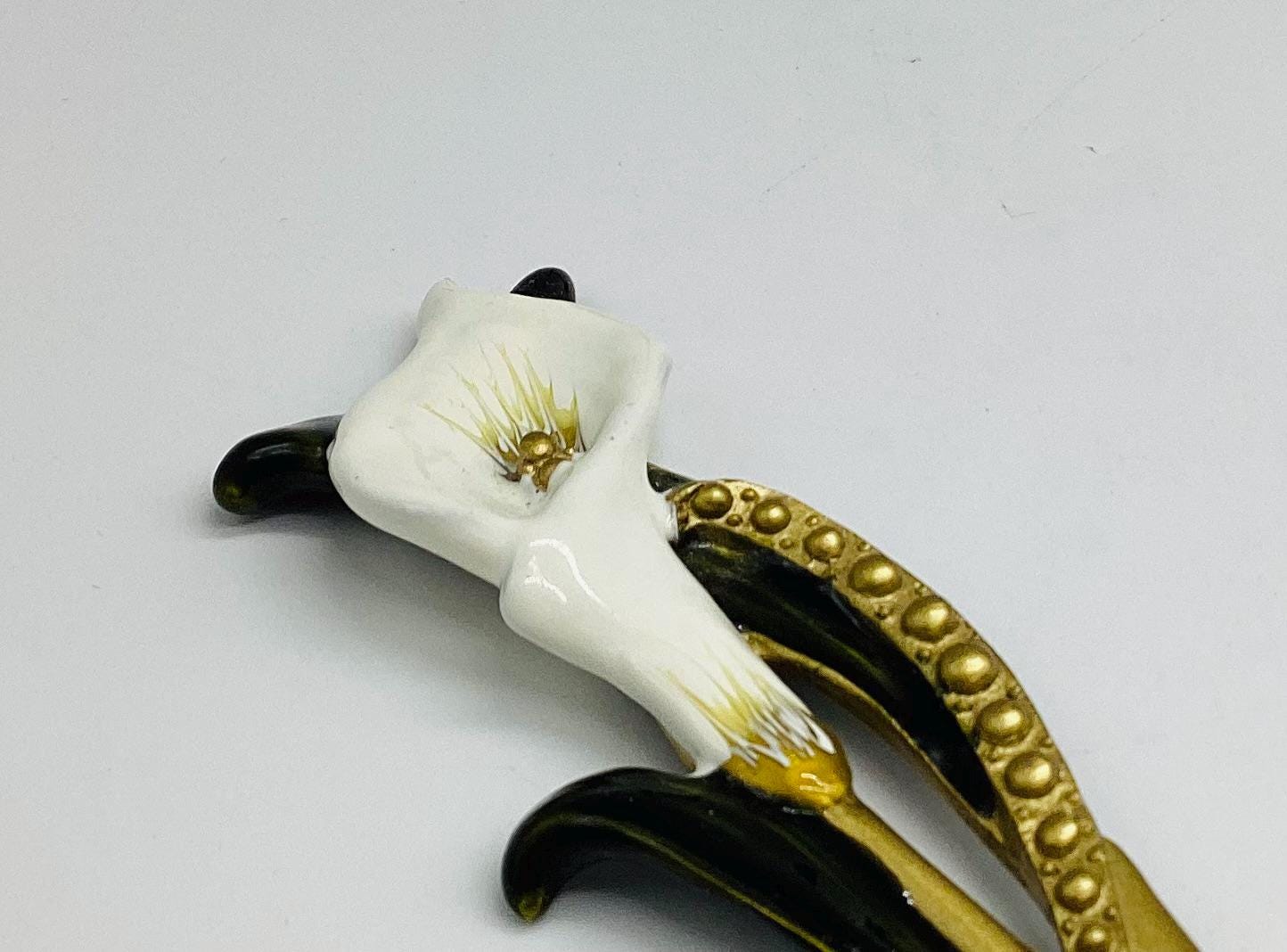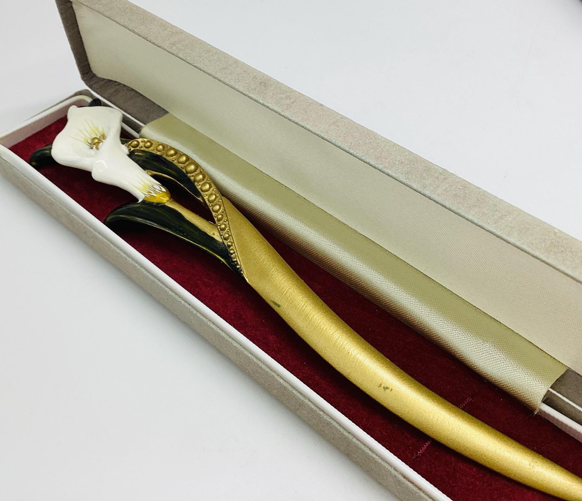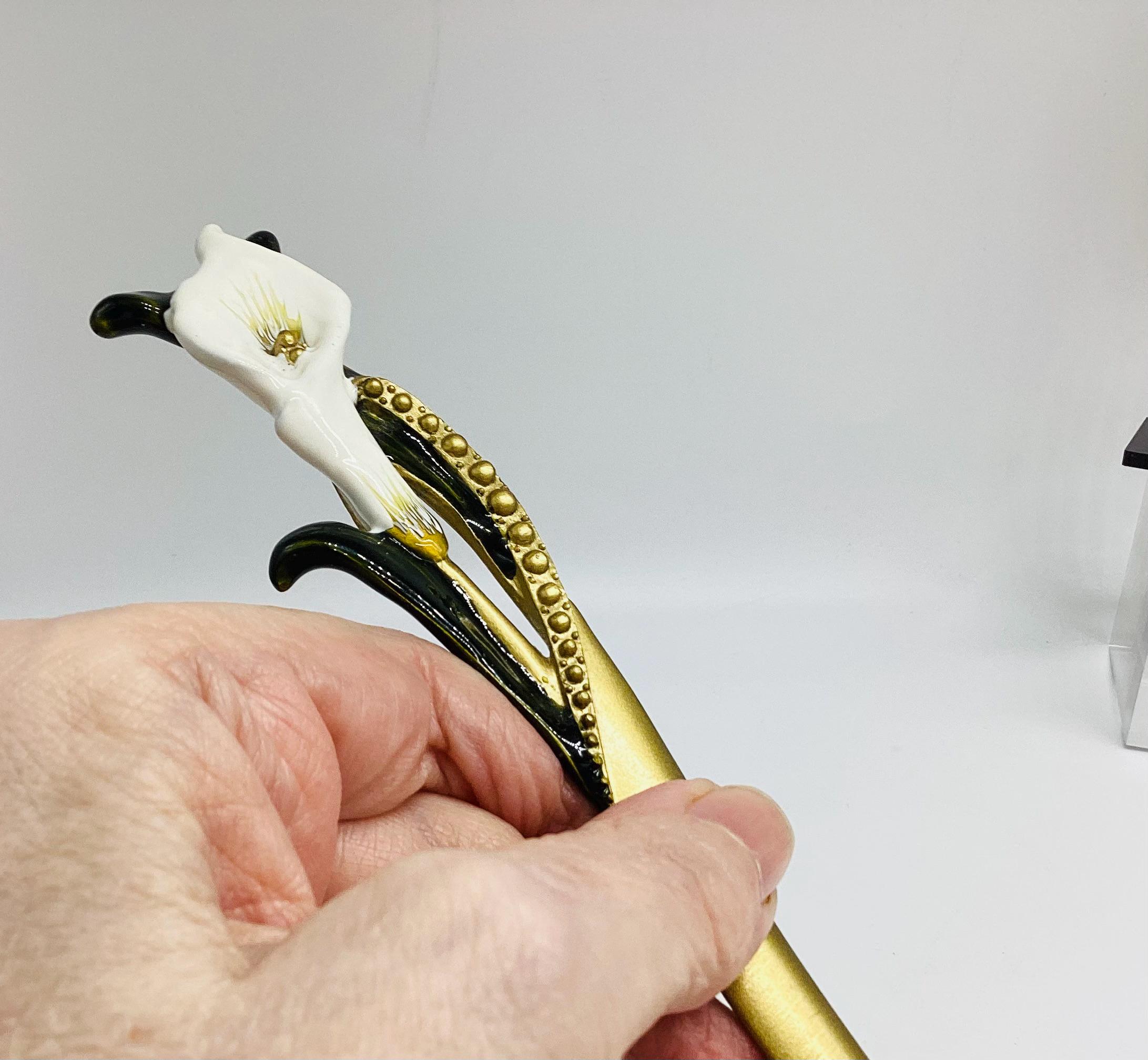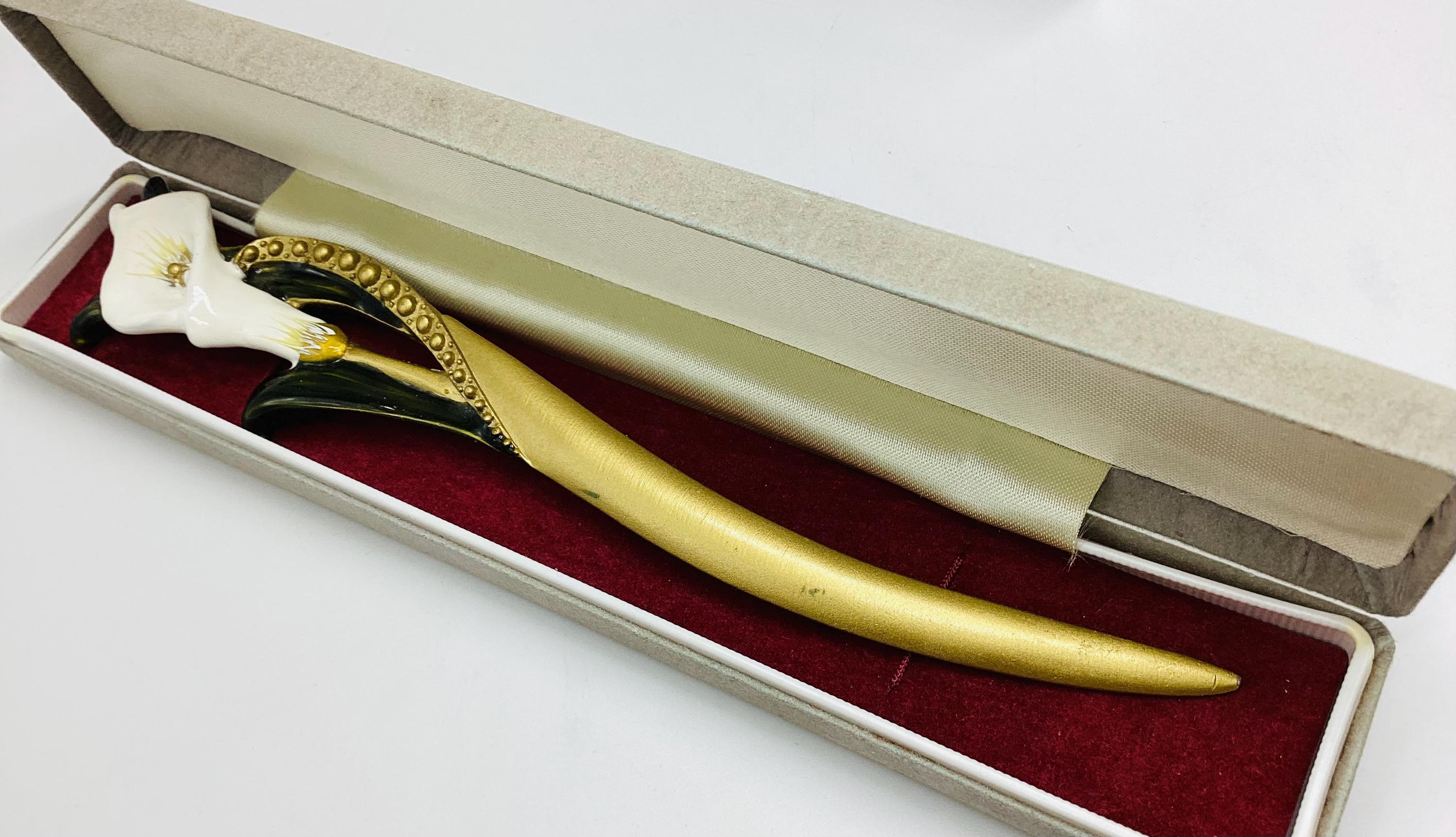 A very pretty ceramic and enamel cala lily letter opener, a vintage collectable made in the United Kingdom. Featuring a delicate lily design. Perfect for those who appreciate vintage items and quality craftsmanship.