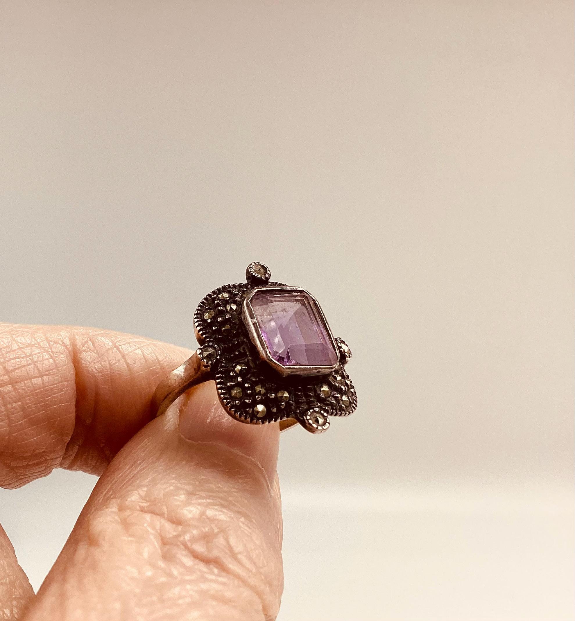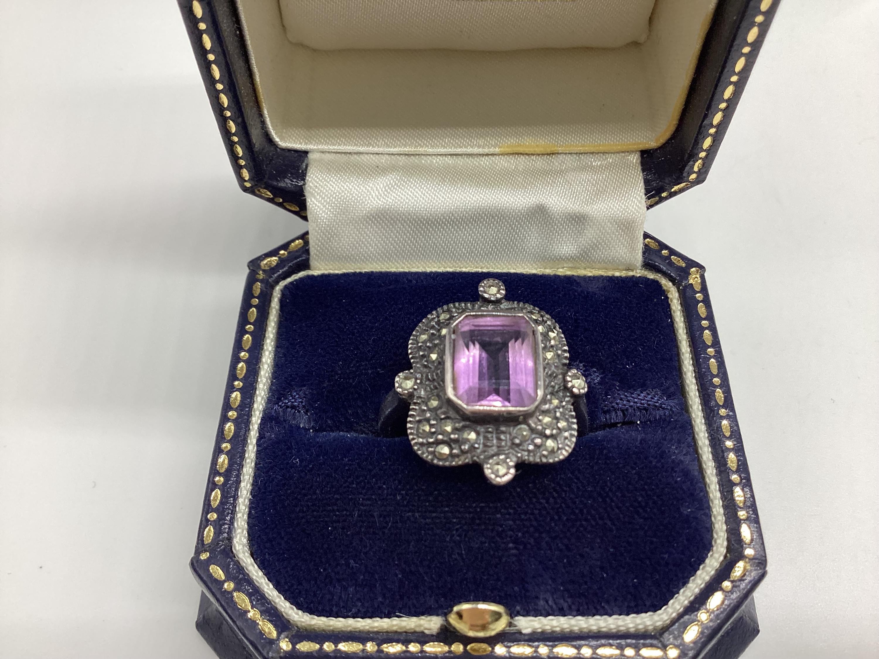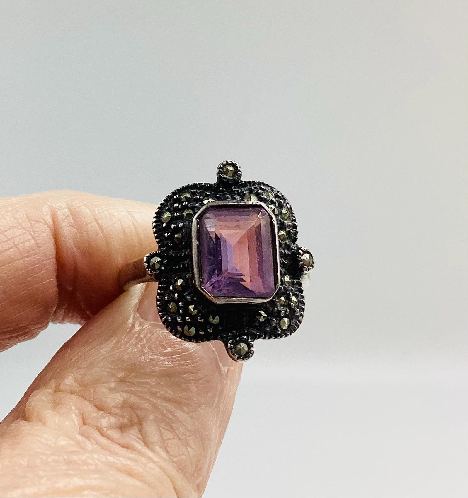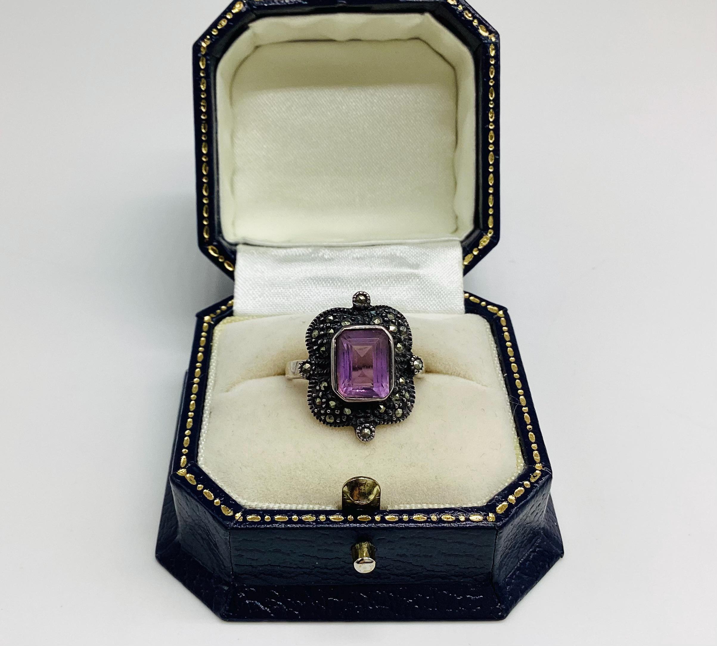 A large and attractive Edwardian ring with a lavender purple paste stone set in a beautiful and unusual square marcasite and silver setting. Stone and setting in excellent condition.