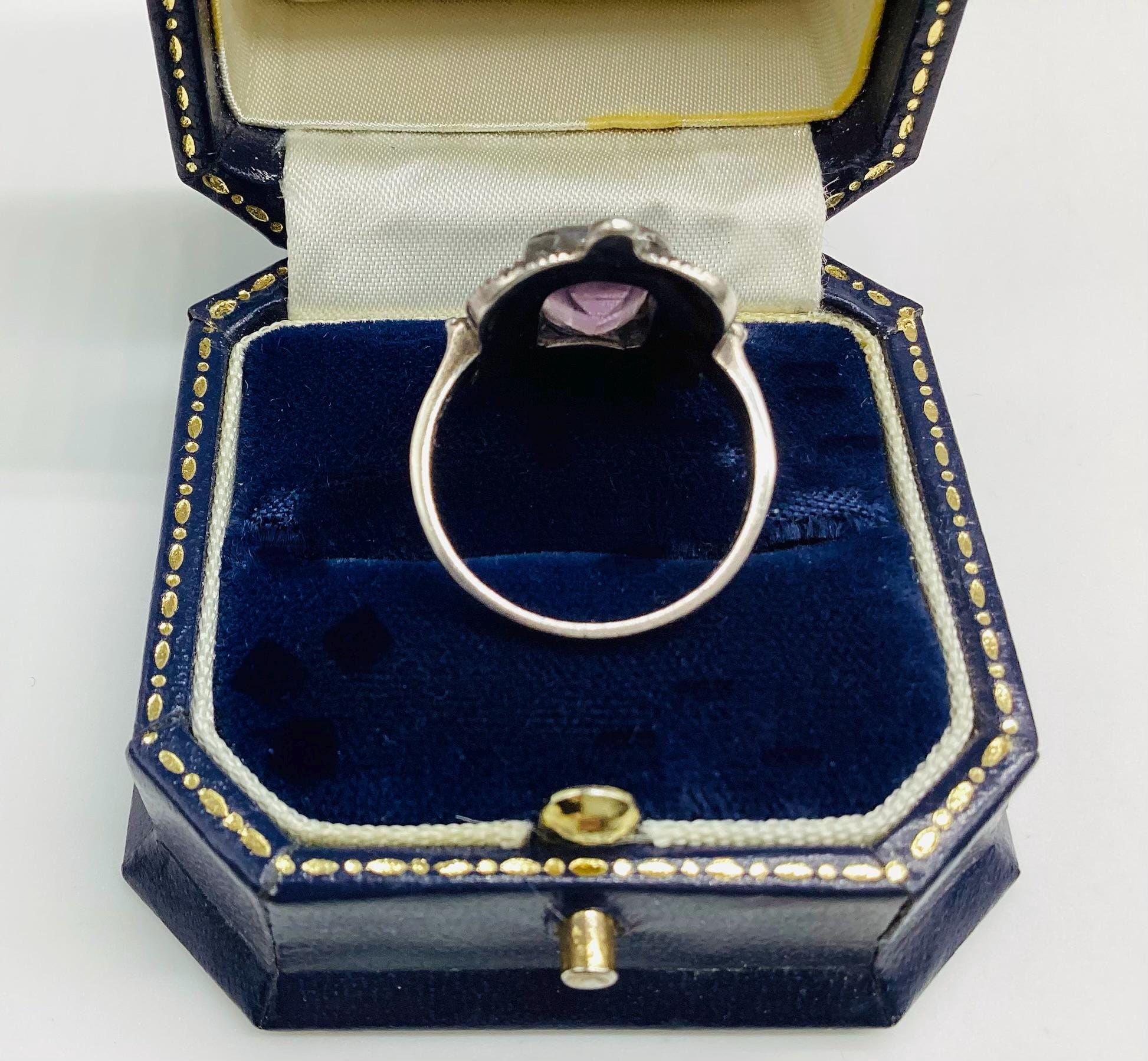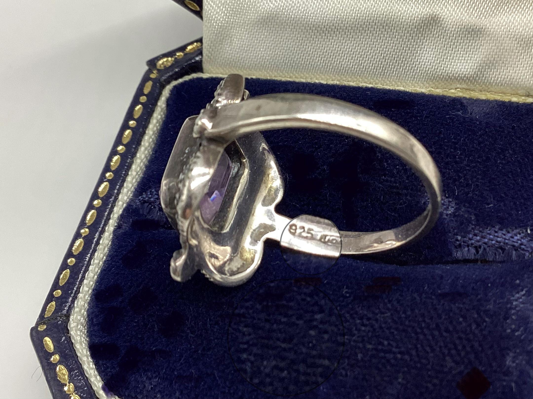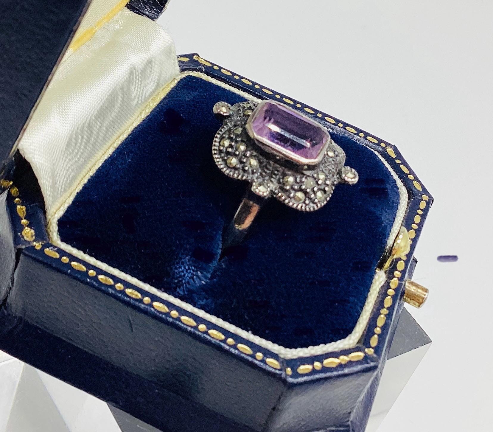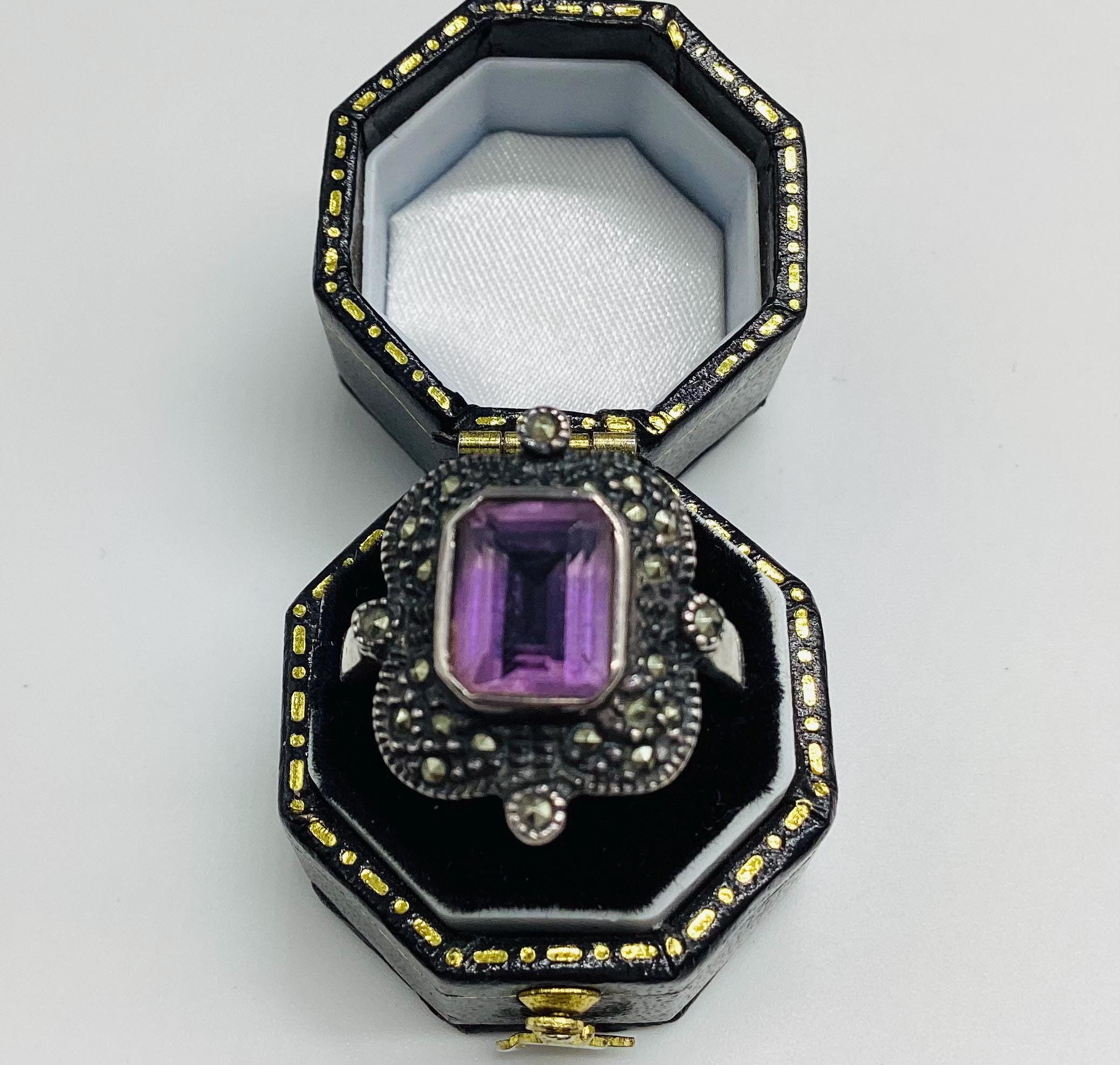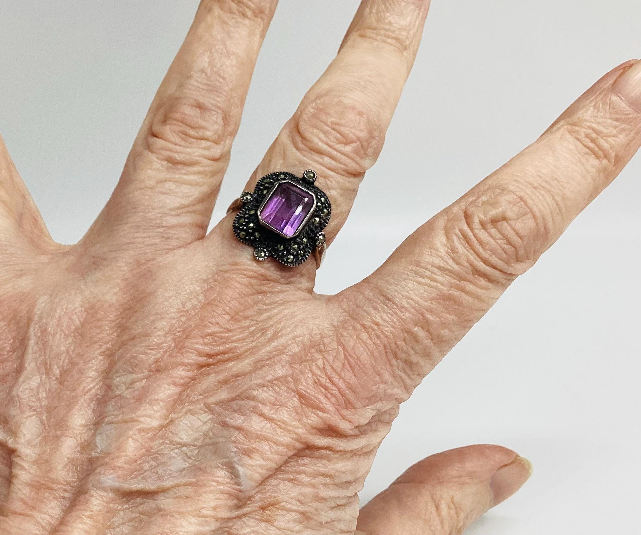 A large and attractive Edwardian ring with a lavender purple paste stone set in a beautiful and unusual square marcasite and silver setting. Stone and setting in excellent condition.