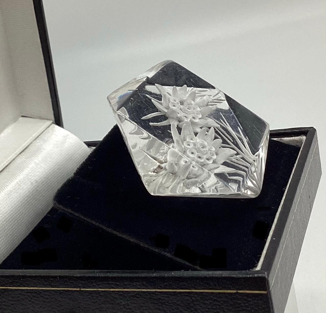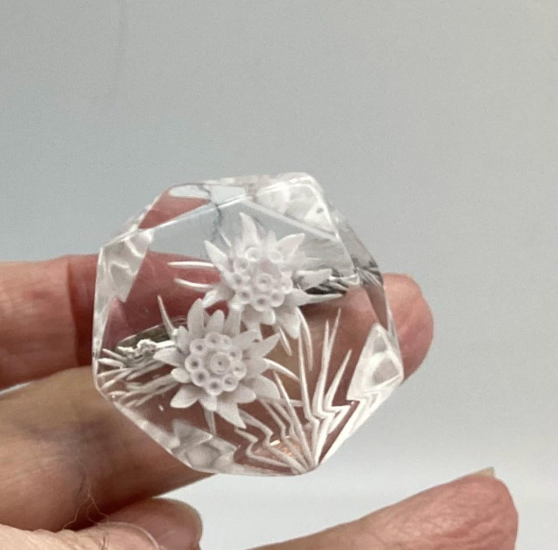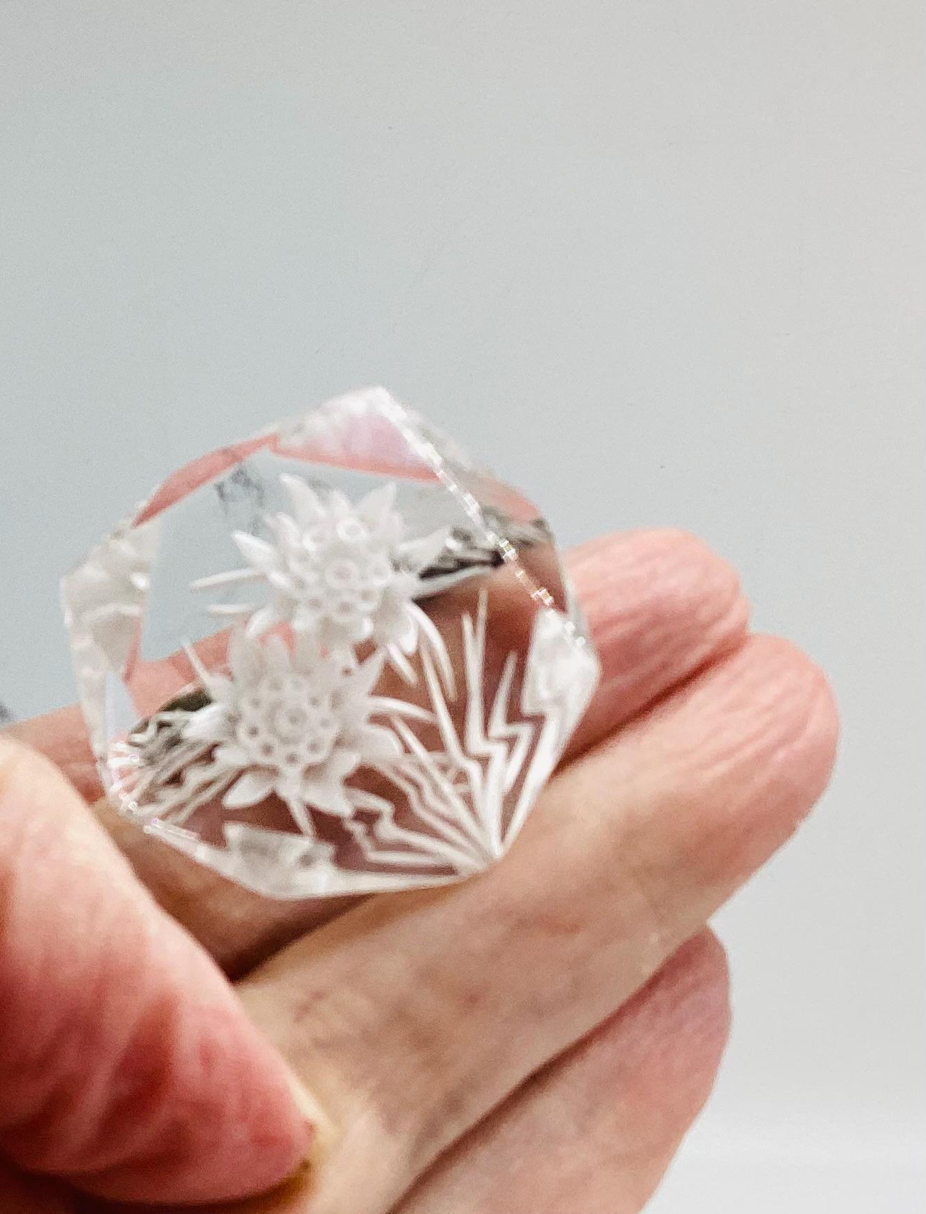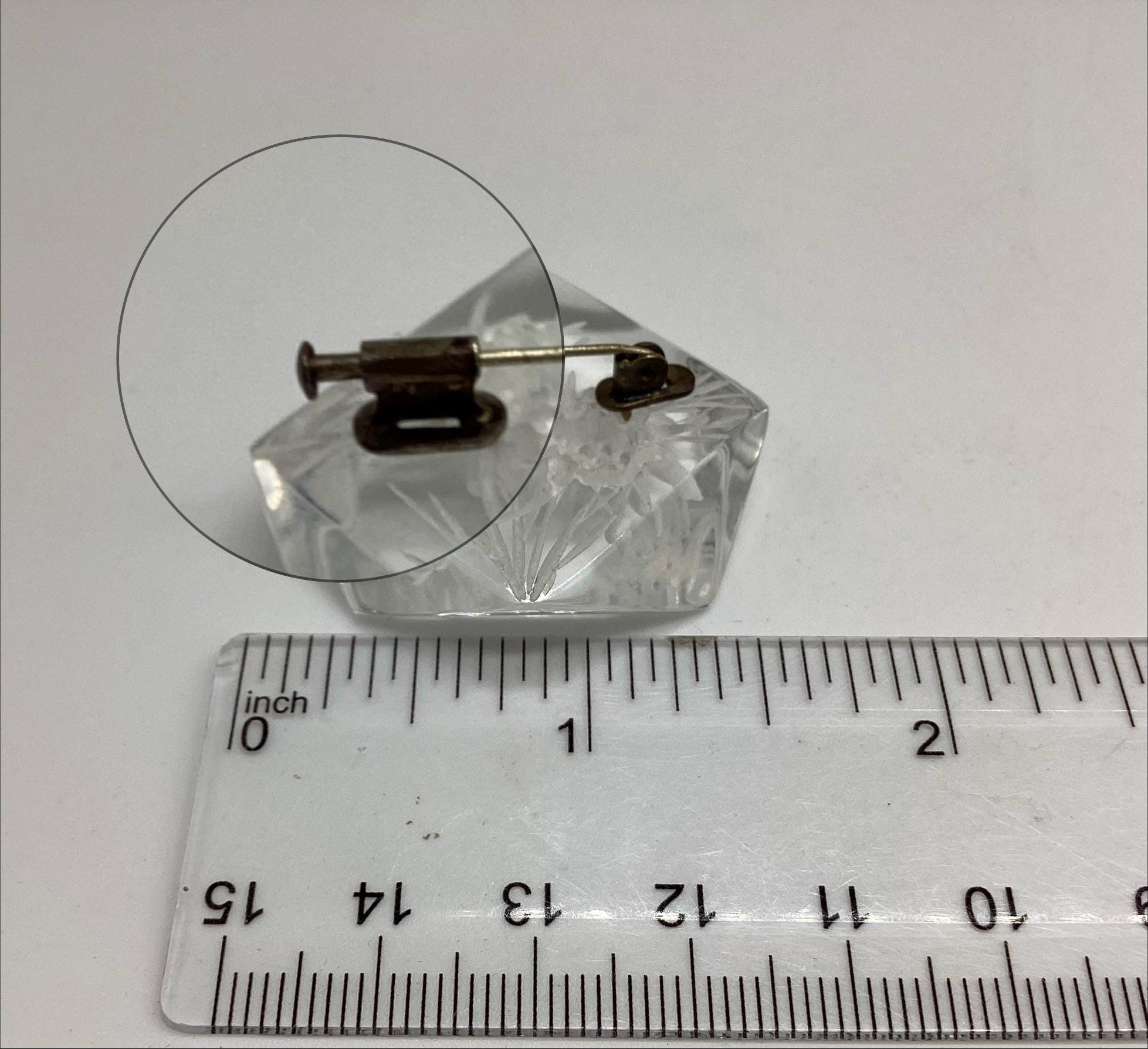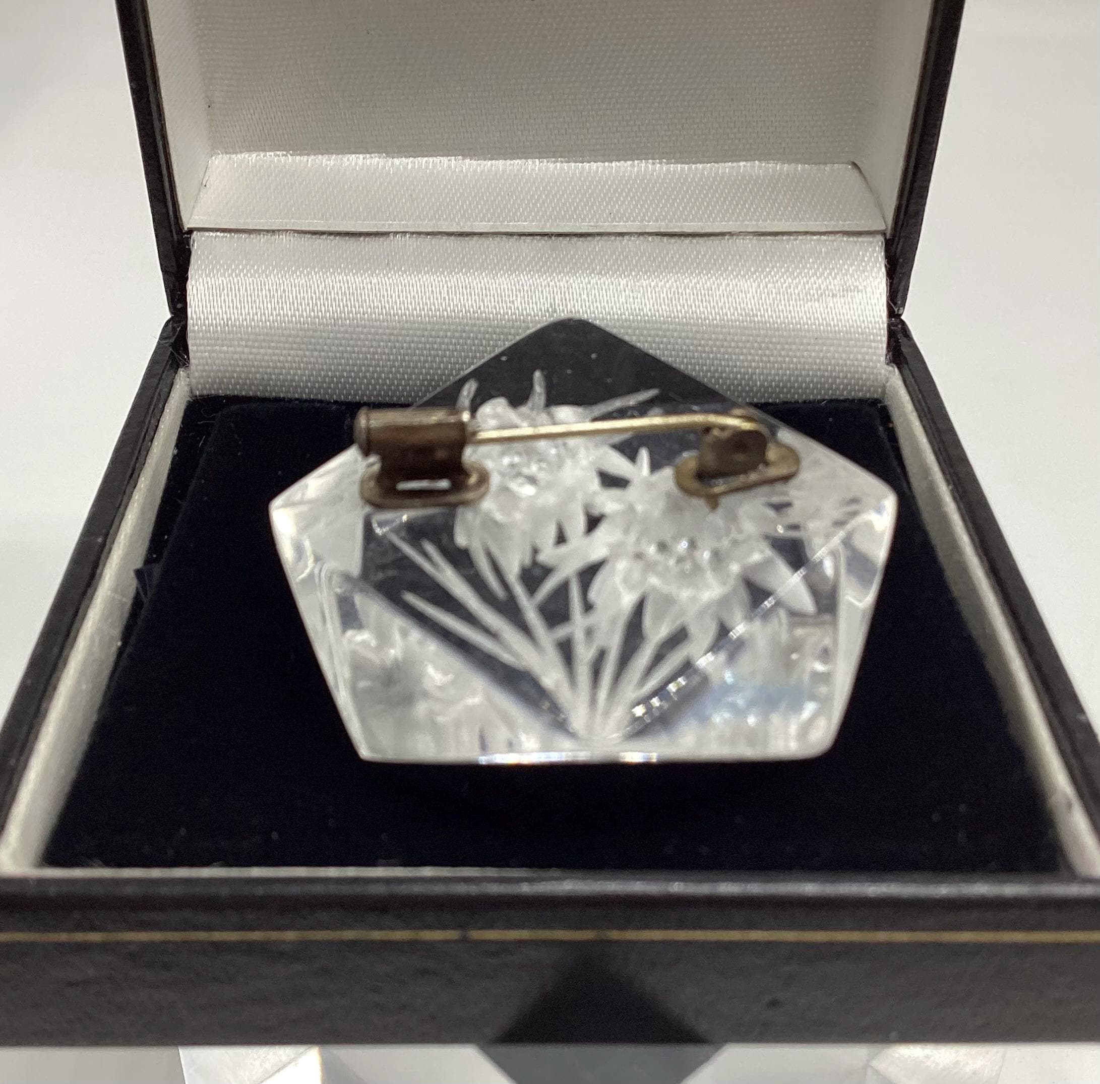 A beautiful reverse carved lucite brooch. Geometric cut setting giving prism effect with flashes of rainbow colours. A rare vintage piece of jewellery with a trombone clasp still in perfect working order. An early example this has been kept safe and sound in a jewellery box for many years and is in excellent condition. A rare and collectable piece.