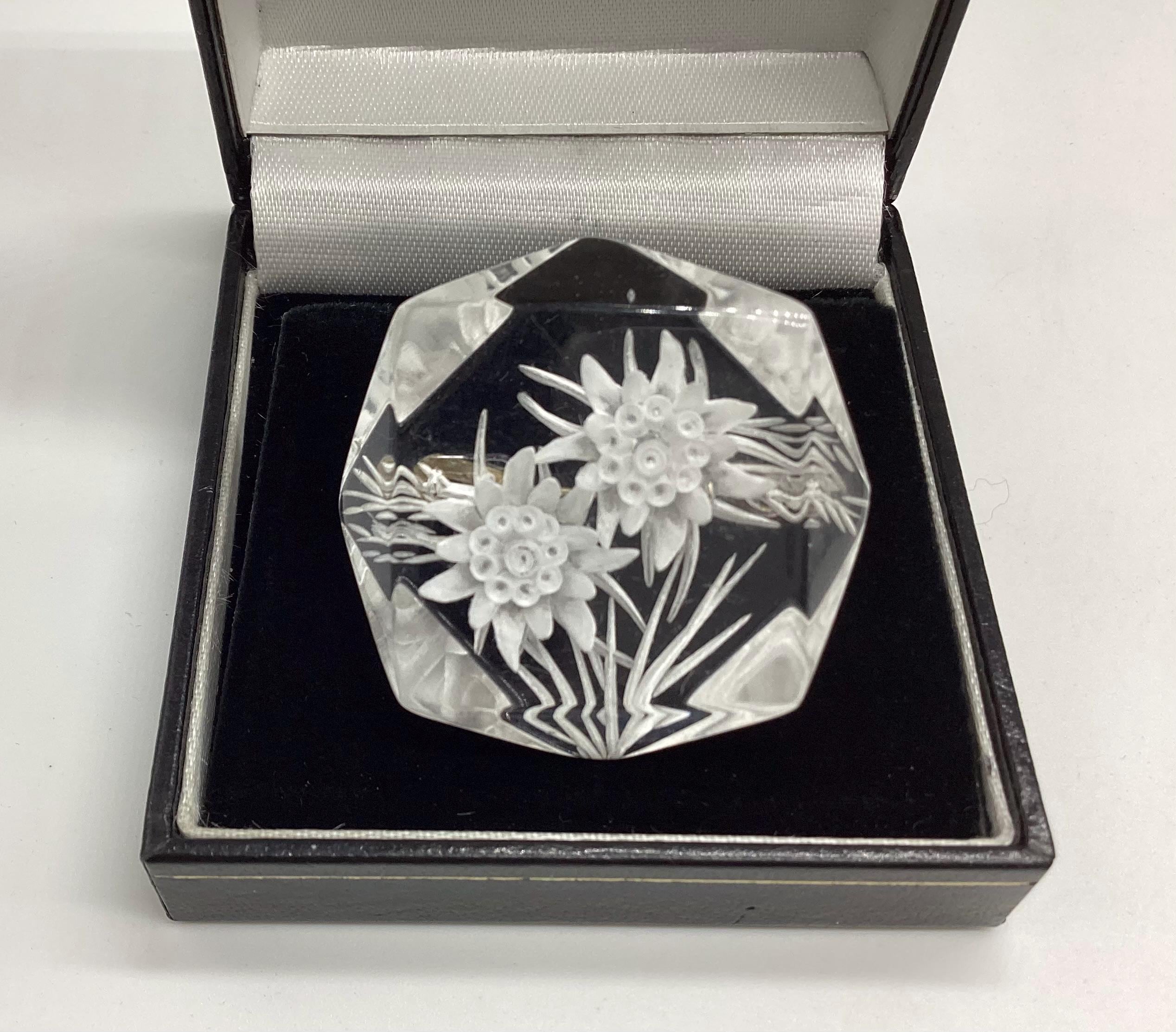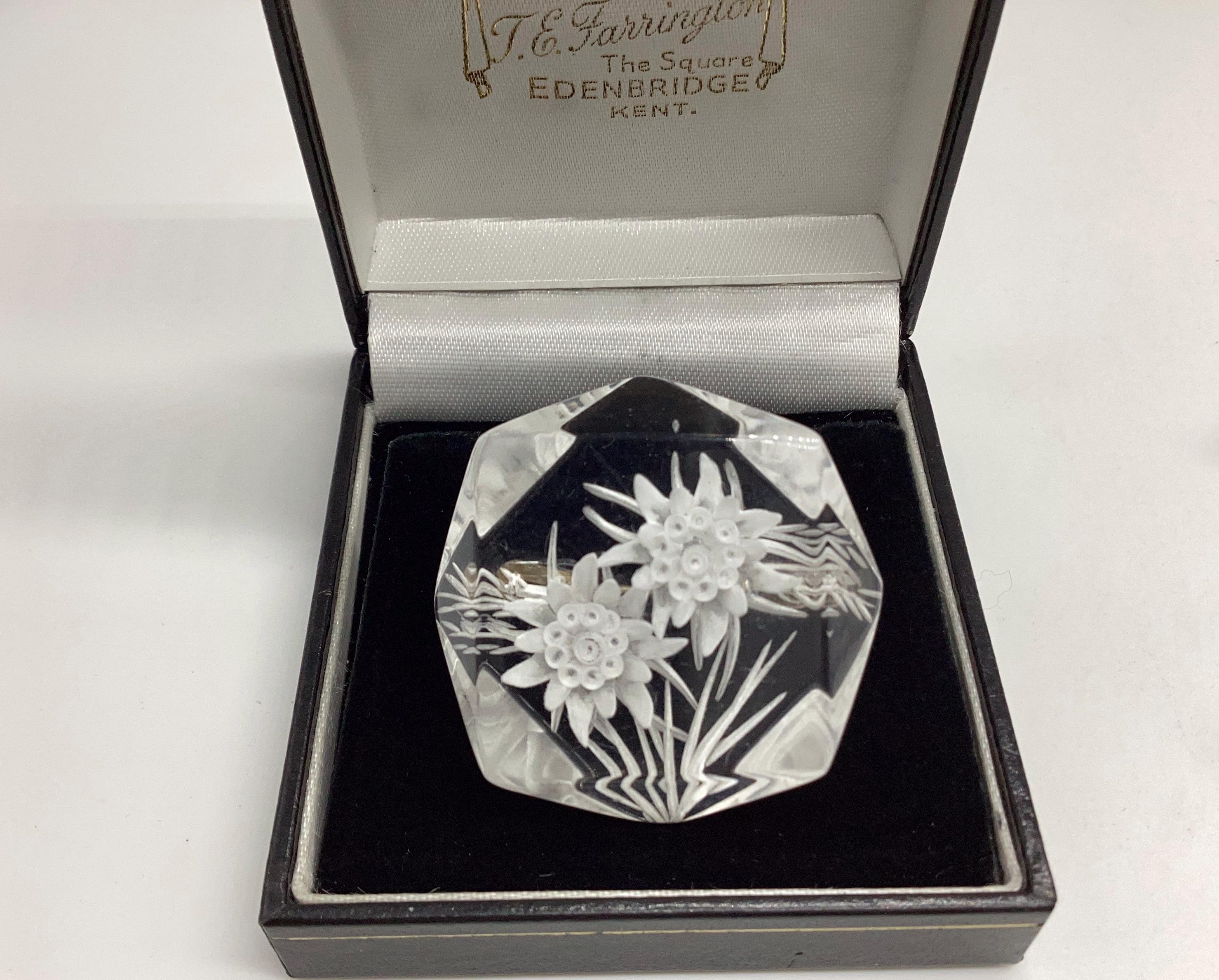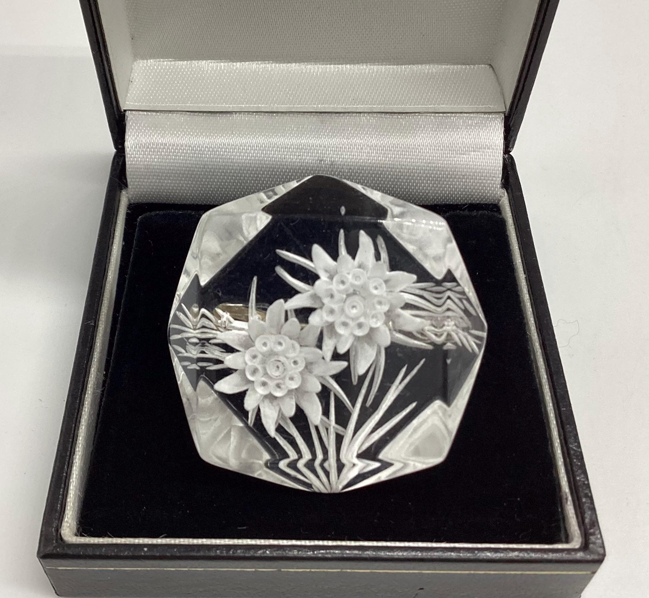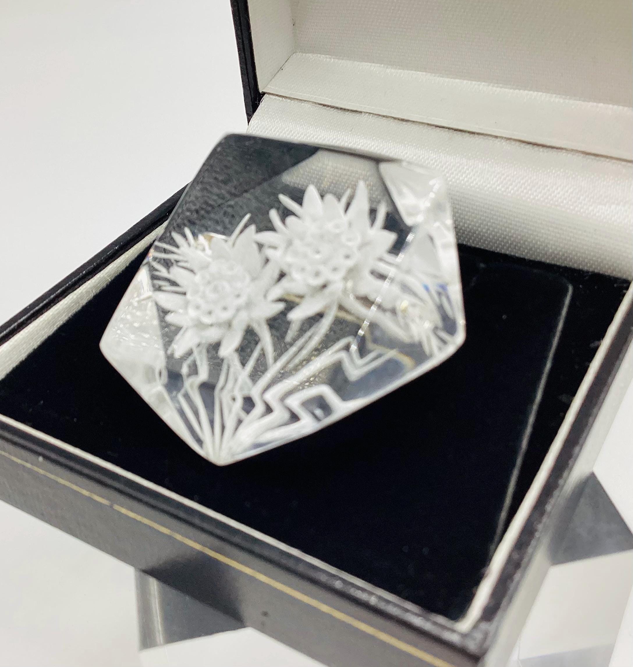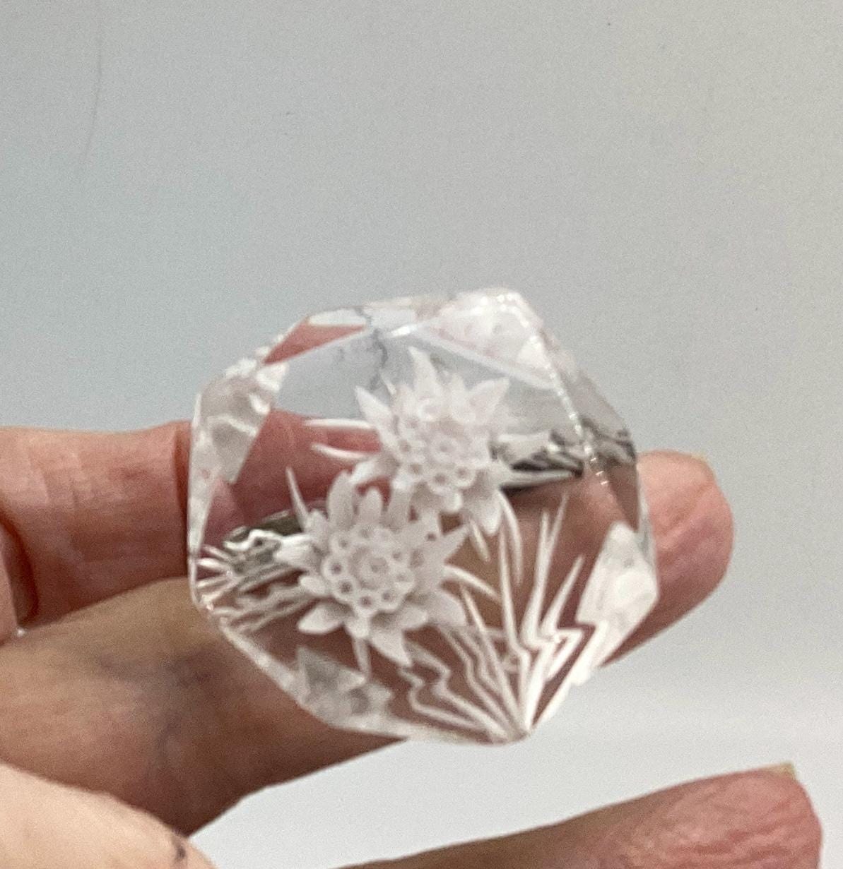 A beautiful reverse carved lucite brooch. Geometric cut setting giving prism effect with flashes of rainbow colours. A rare vintage piece of jewellery with a trombone clasp still in perfect working order. An early example this has been kept safe and sound in a jewellery box for many years and is in excellent condition. A rare and collectable piece.