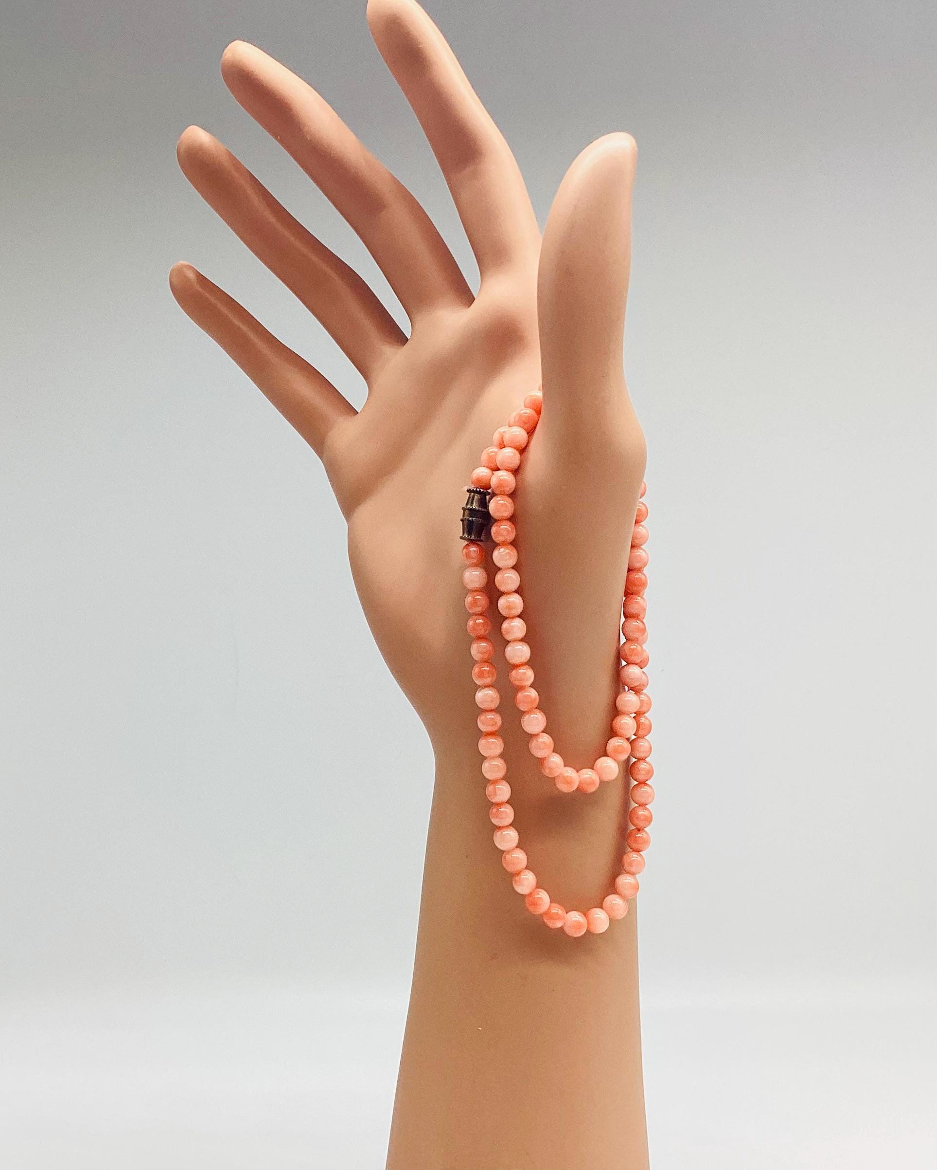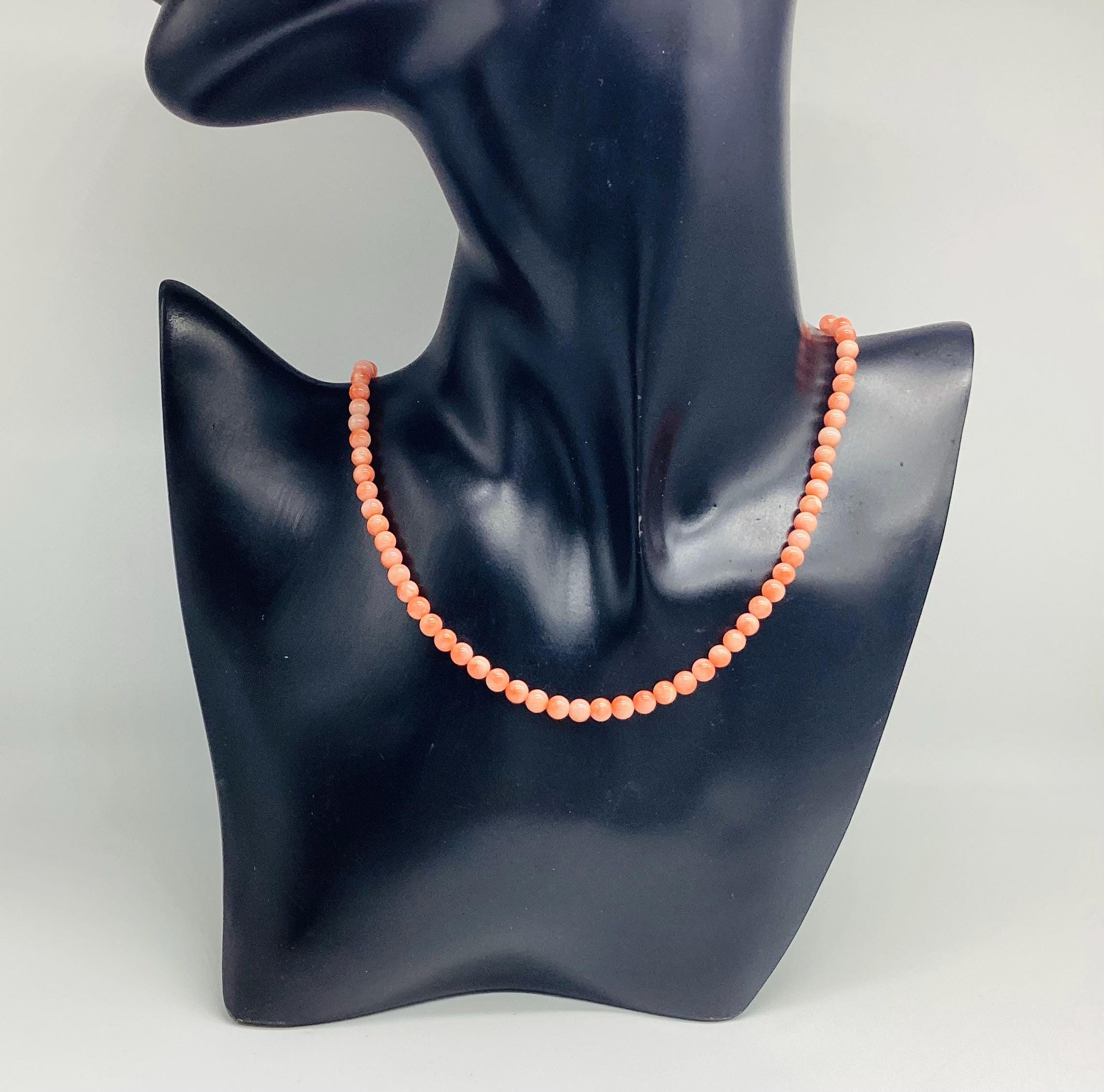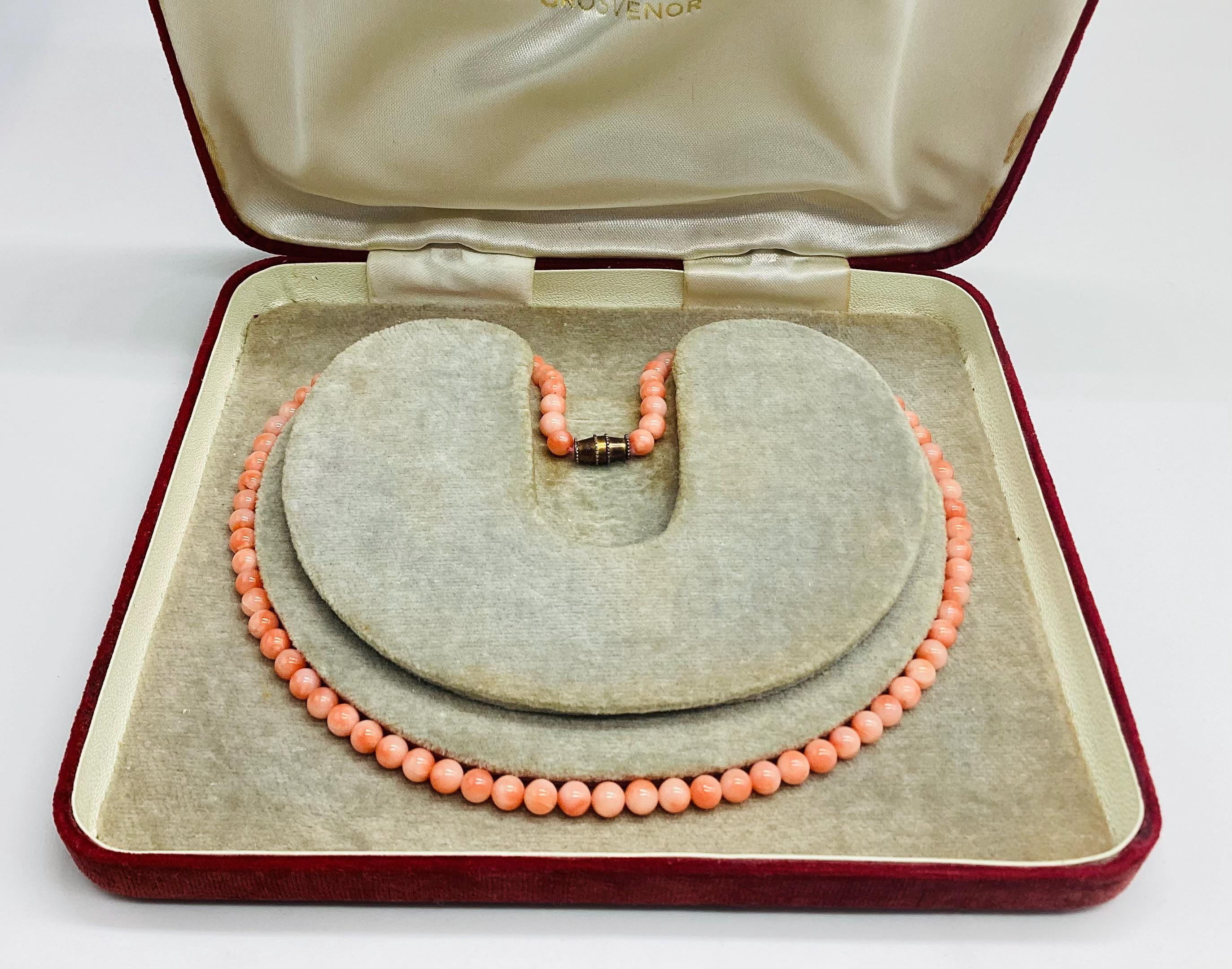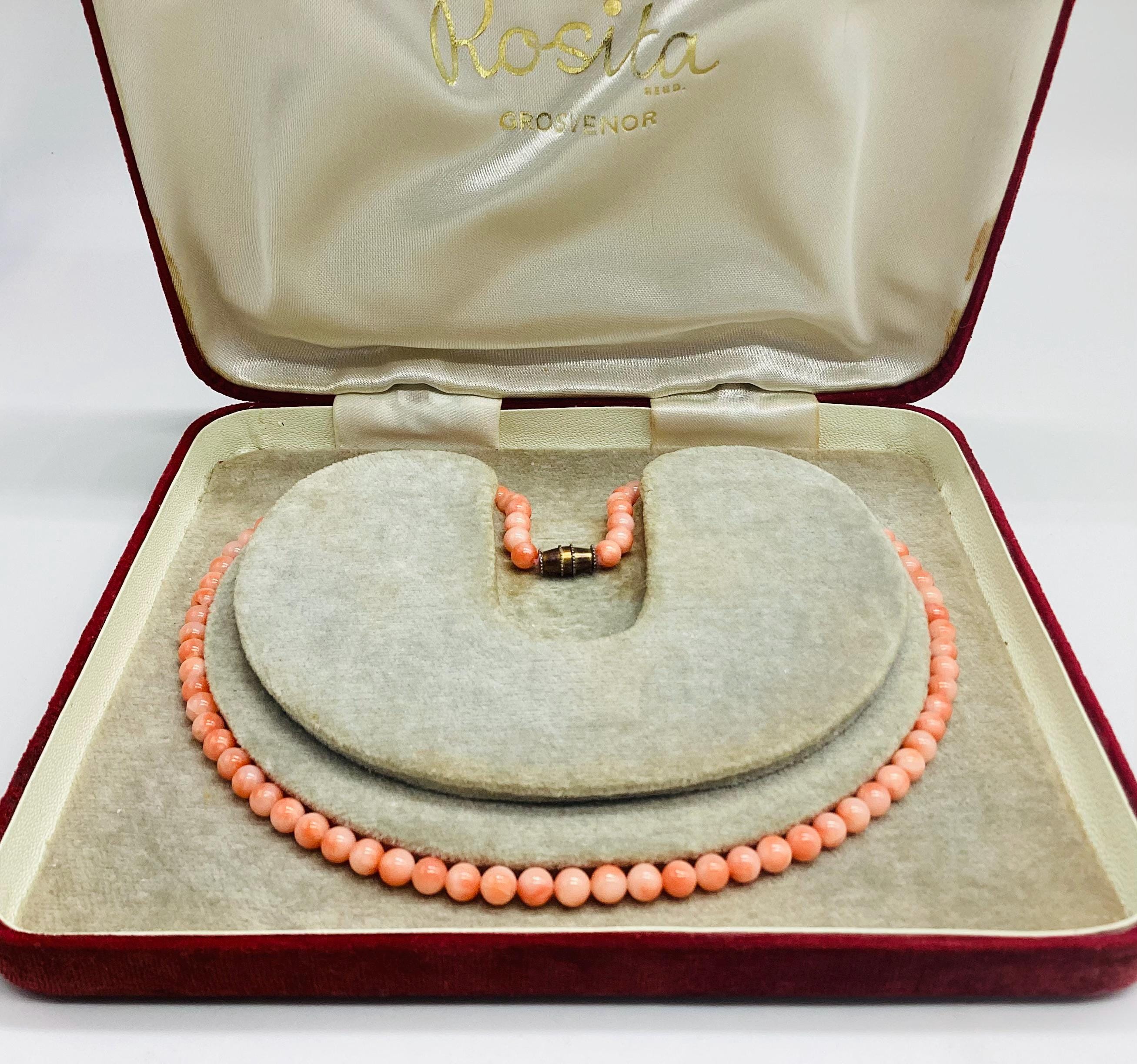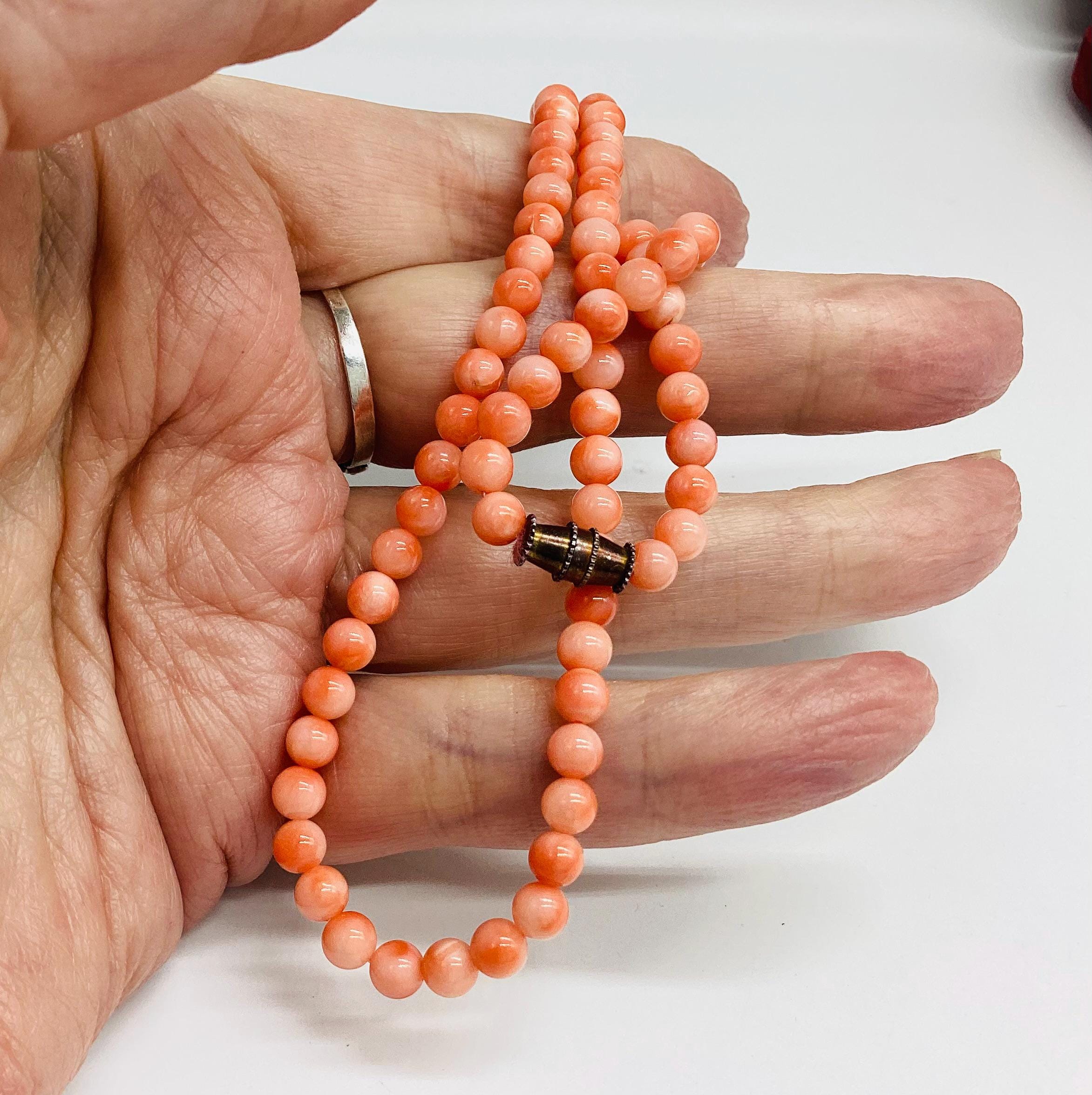 Delightful angel skin coral bead necklace. Momo Corals are found in the tropical waters north of Taiwan and Japan. "Momo" means "peach" in Japanese language and beautifully describes the paler shaded circles that are to be seen on these beads. Wonderful wedding jewellery or birthday gift, coming of age. These super necklaces were very popular during the forties and fifties as the first piece of proper jewellery for girls or teenagers and I love this idea. Also perfect for wedding or bridesmaid jewellery. I have several for sale at the moment, in various combinations of pretty gemstones and pearls. So versatile just as good with a white shirt and T shirt as with an evening dress. I have a particular passion for coral jewellery in all shape and form.