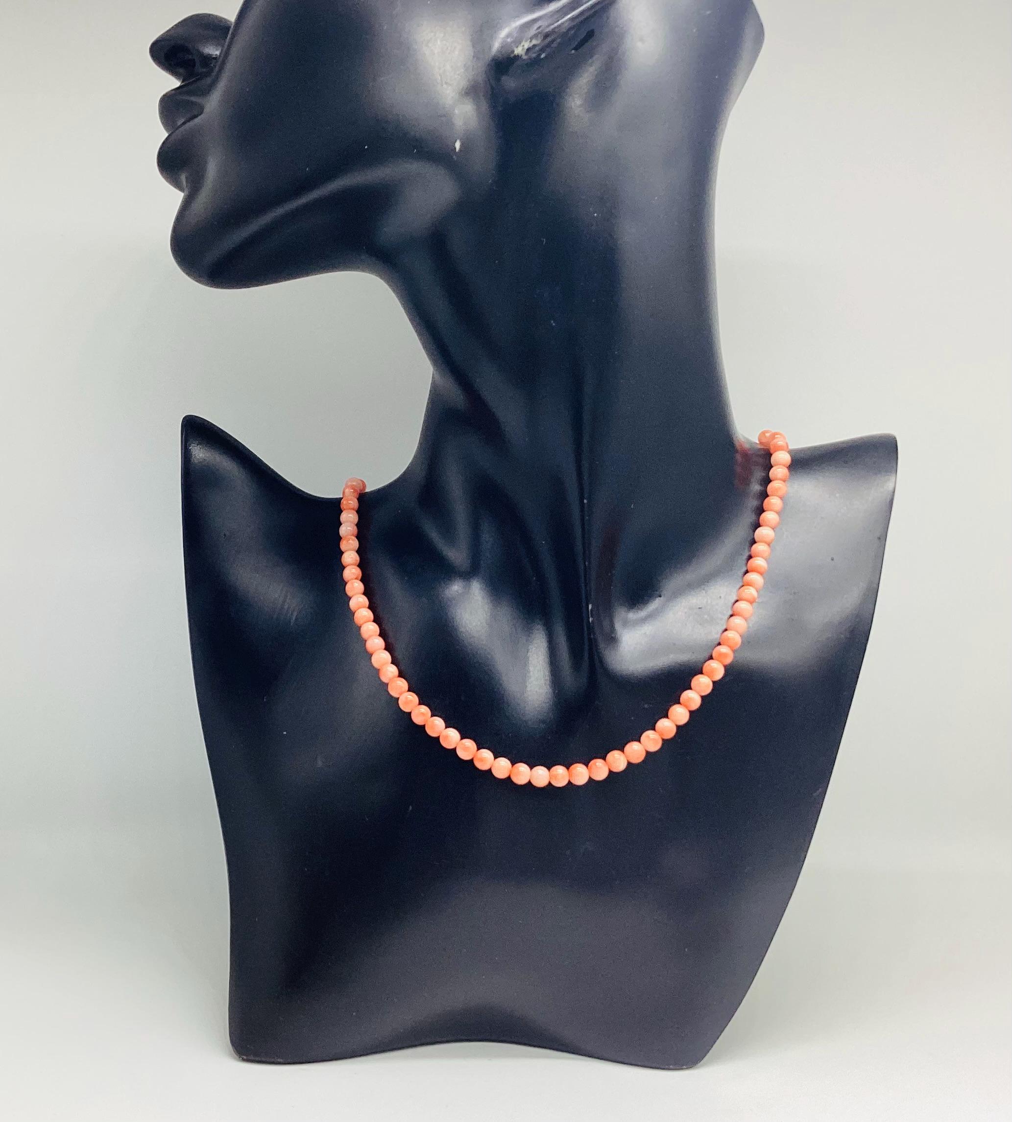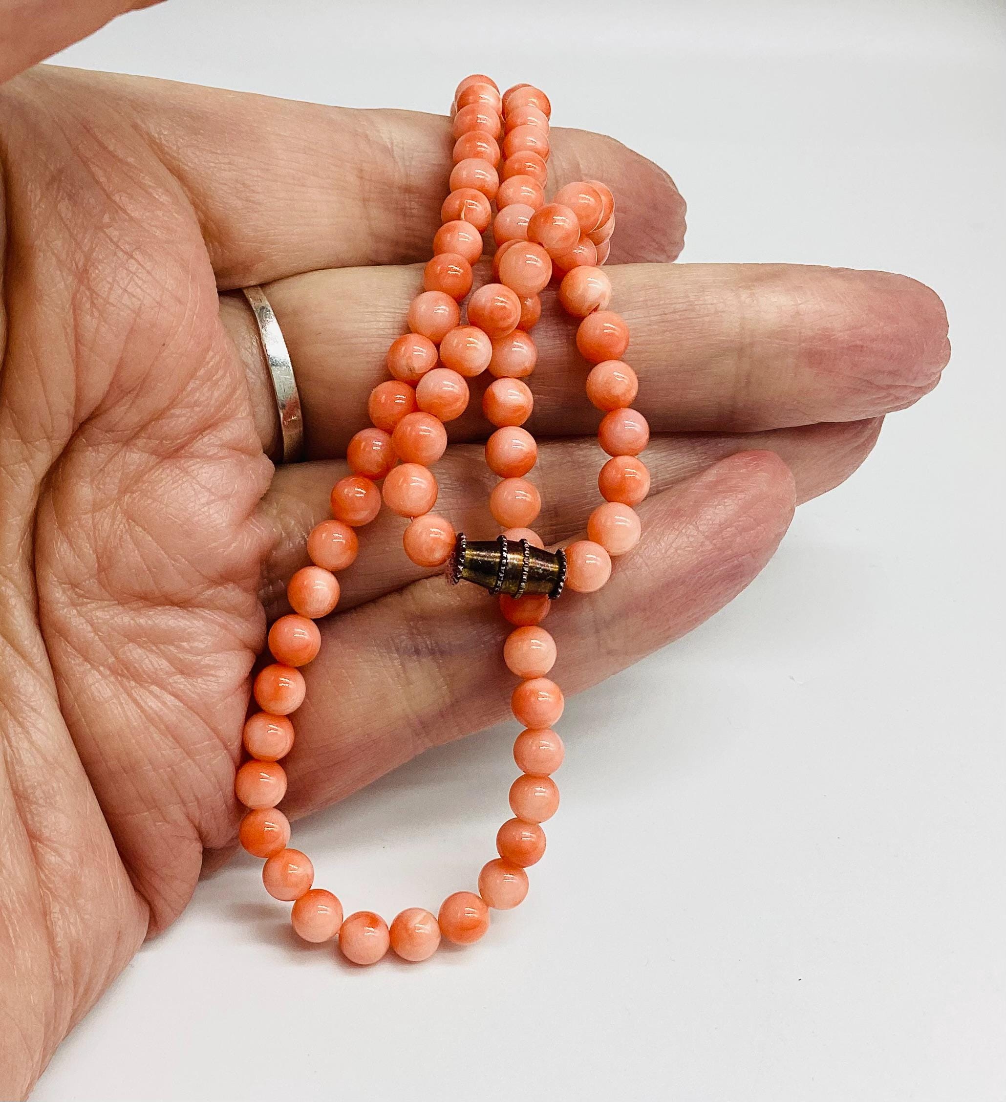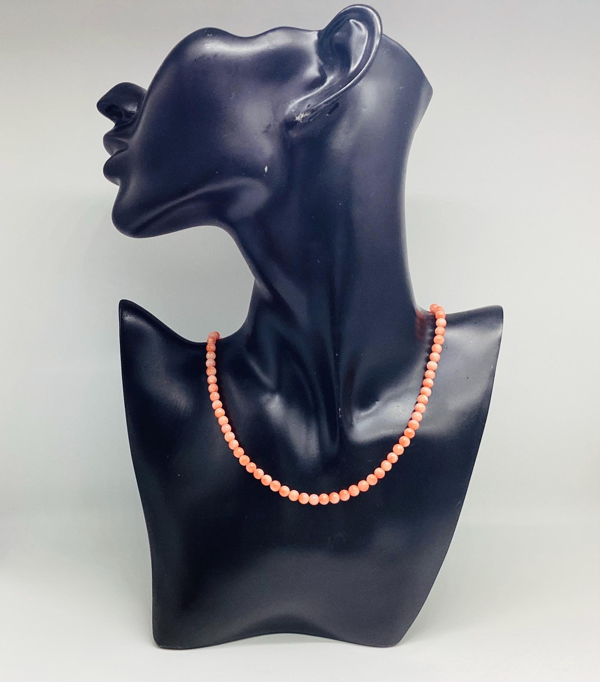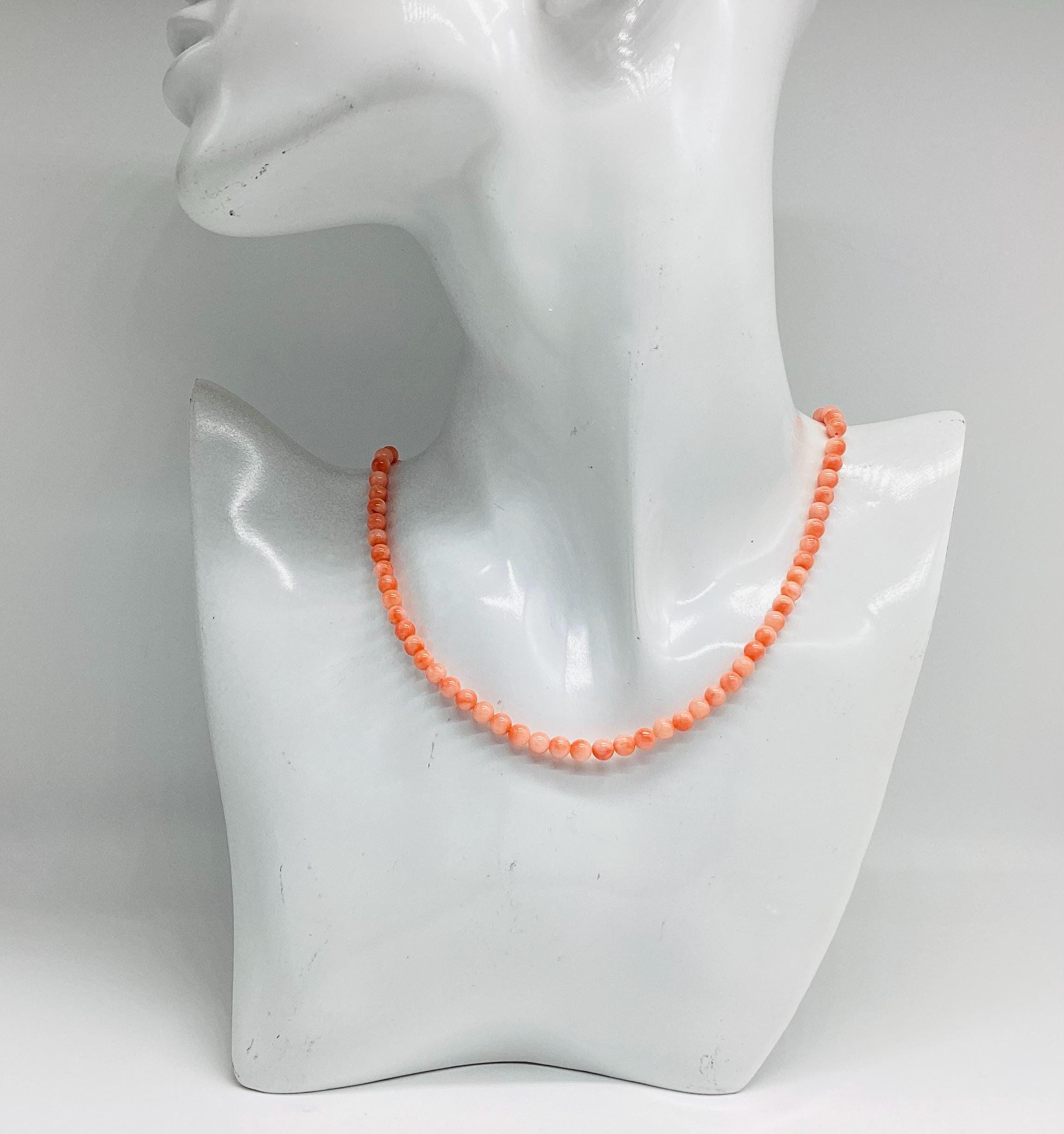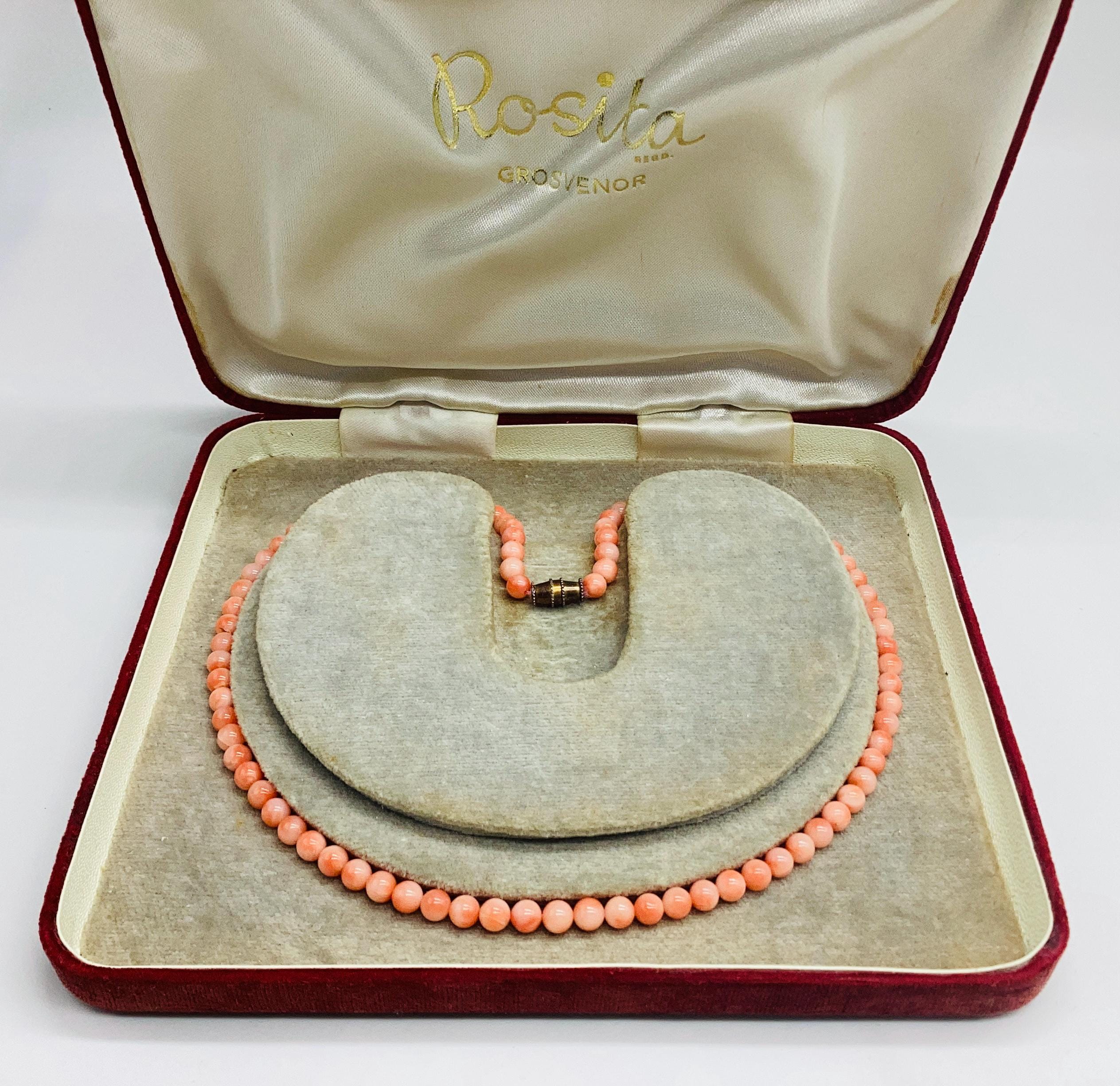 Delightful angel skin coral bead necklace. Momo Corals are found in the tropical waters north of Taiwan and Japan. "Momo" means "peach" in Japanese language and beautifully describes the paler shaded circles that are to be seen on these beads. Wonderful wedding jewellery or birthday gift, coming of age. These super necklaces were very popular during the forties and fifties as the first piece of proper jewellery for girls or teenagers and I love this idea. Also perfect for wedding or bridesmaid jewellery. I have several for sale at the moment, in various combinations of pretty gemstones and pearls. So versatile just as good with a white shirt and T shirt as with an evening dress. I have a particular passion for coral jewellery in all shape and form.
