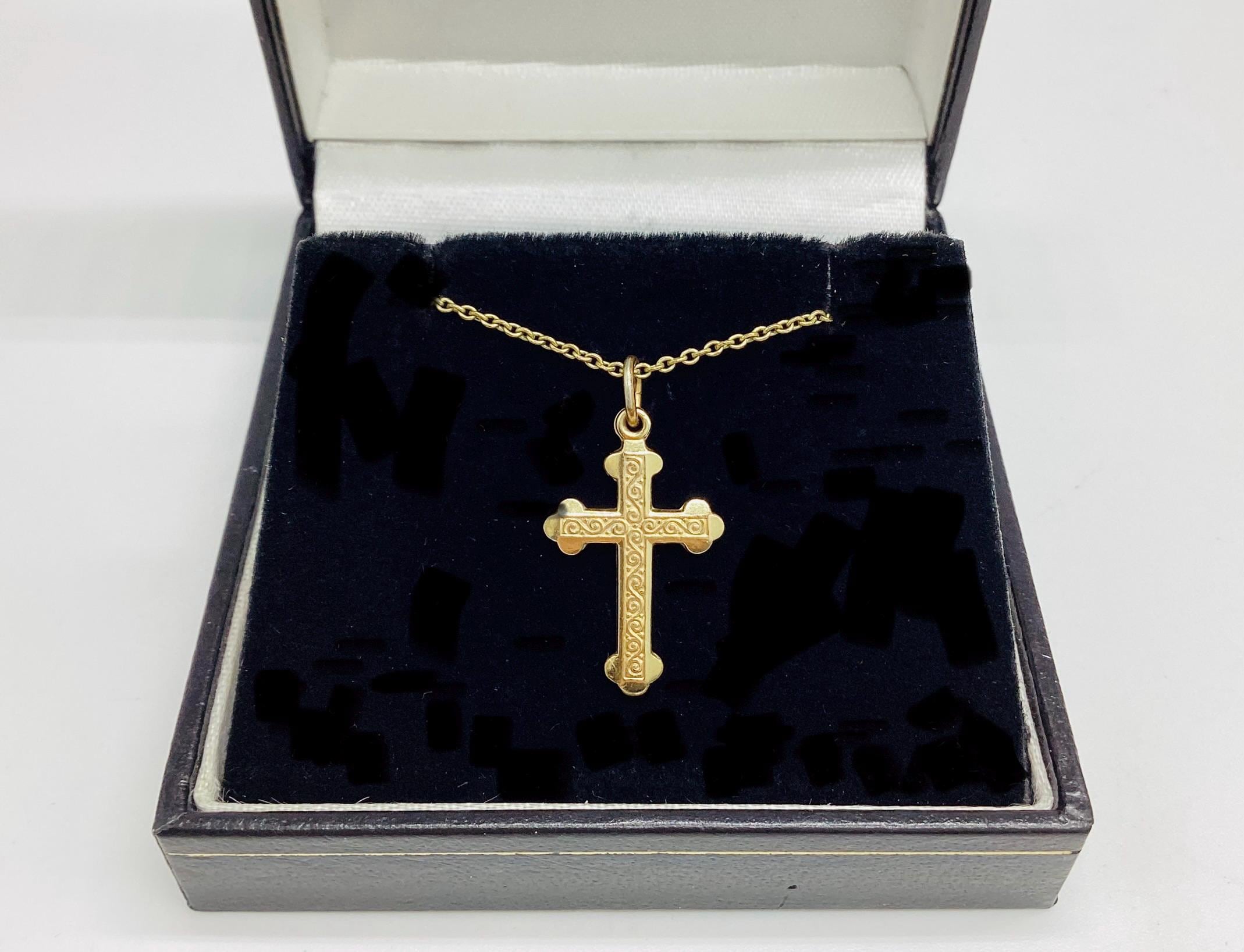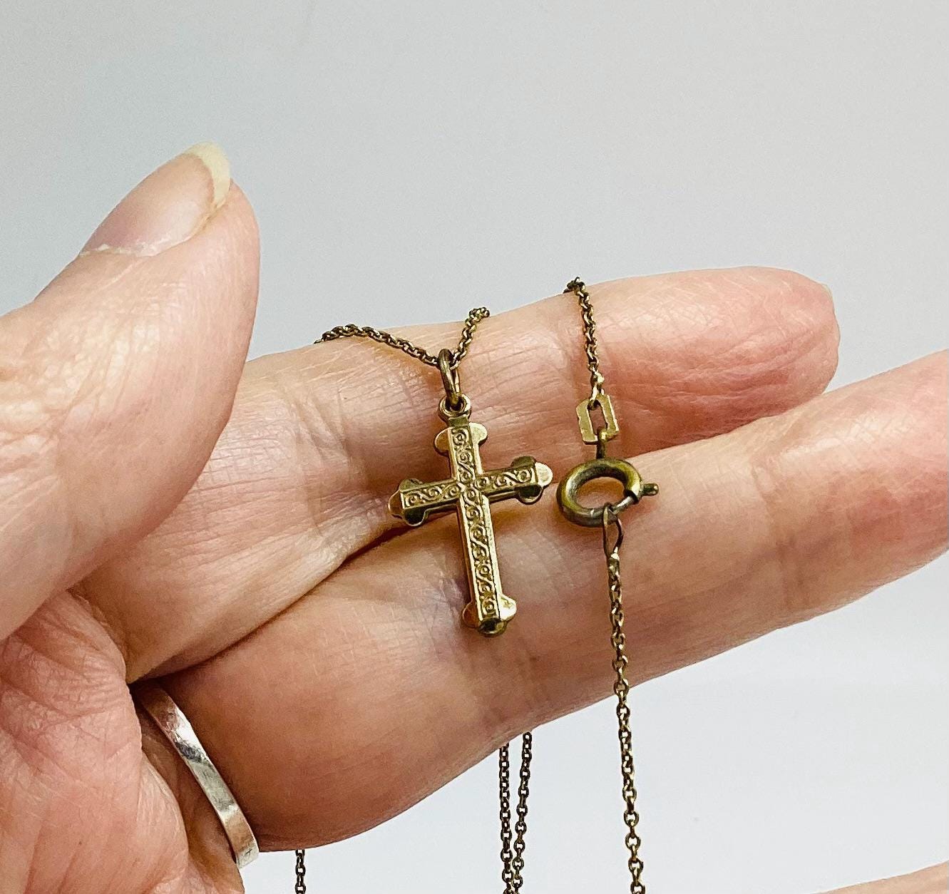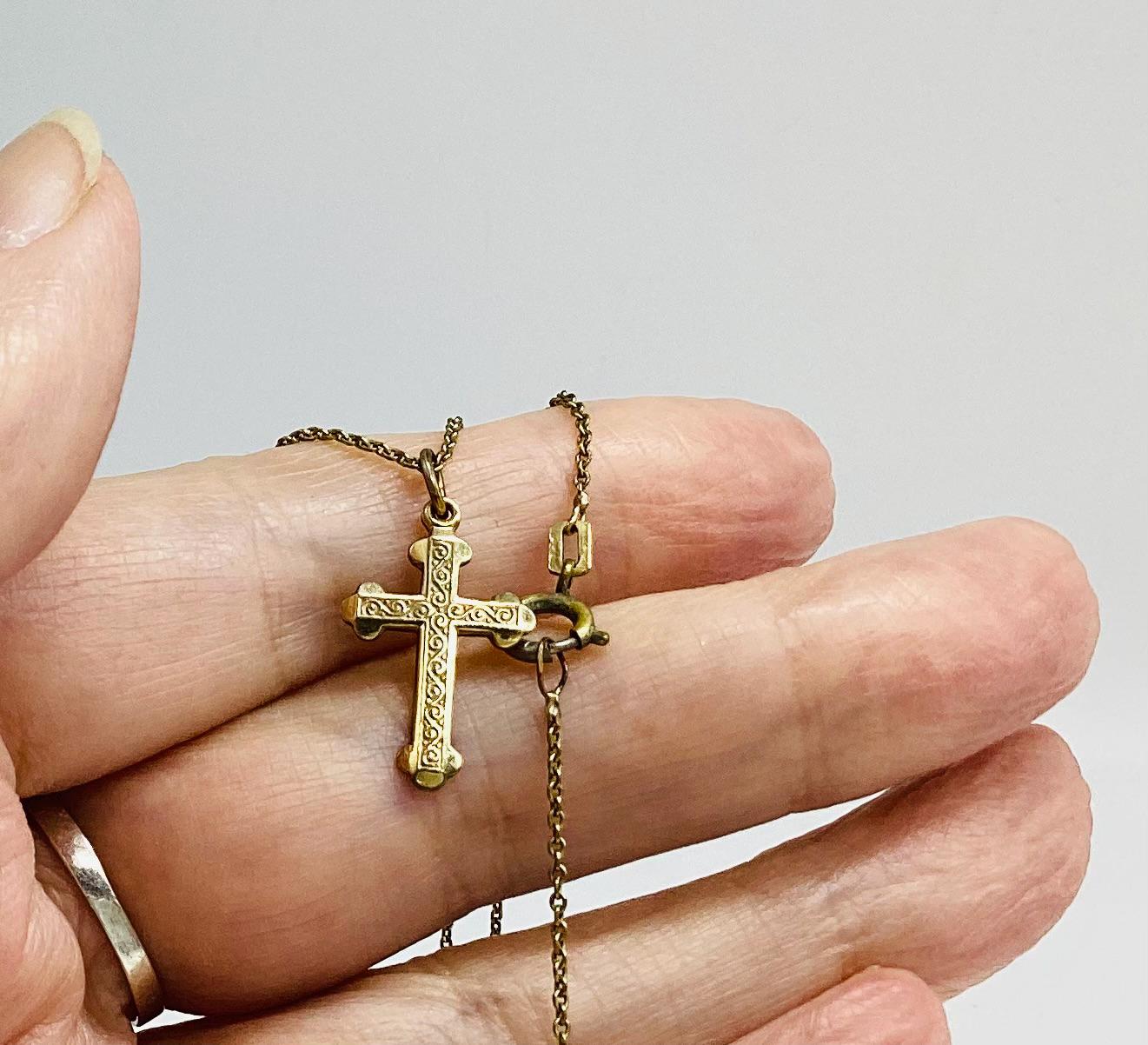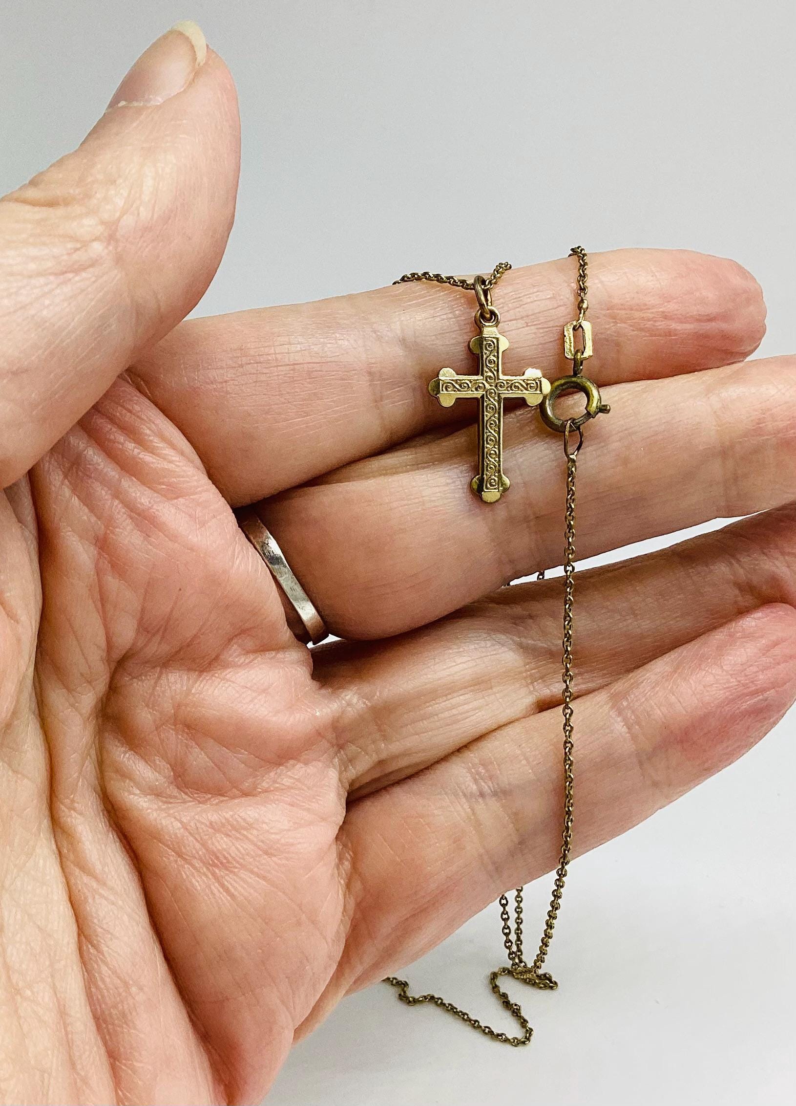 A dainty vintage crucifix with very pretty engraving hung on a fine rolled gold chain. The chain measures 18 inches and is