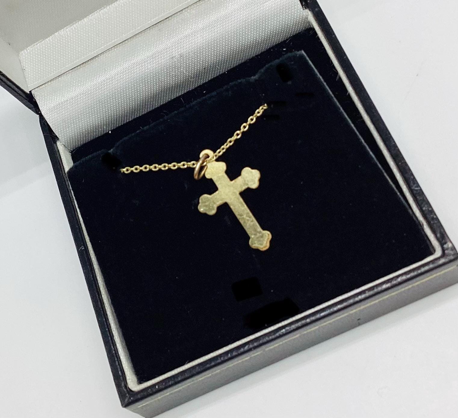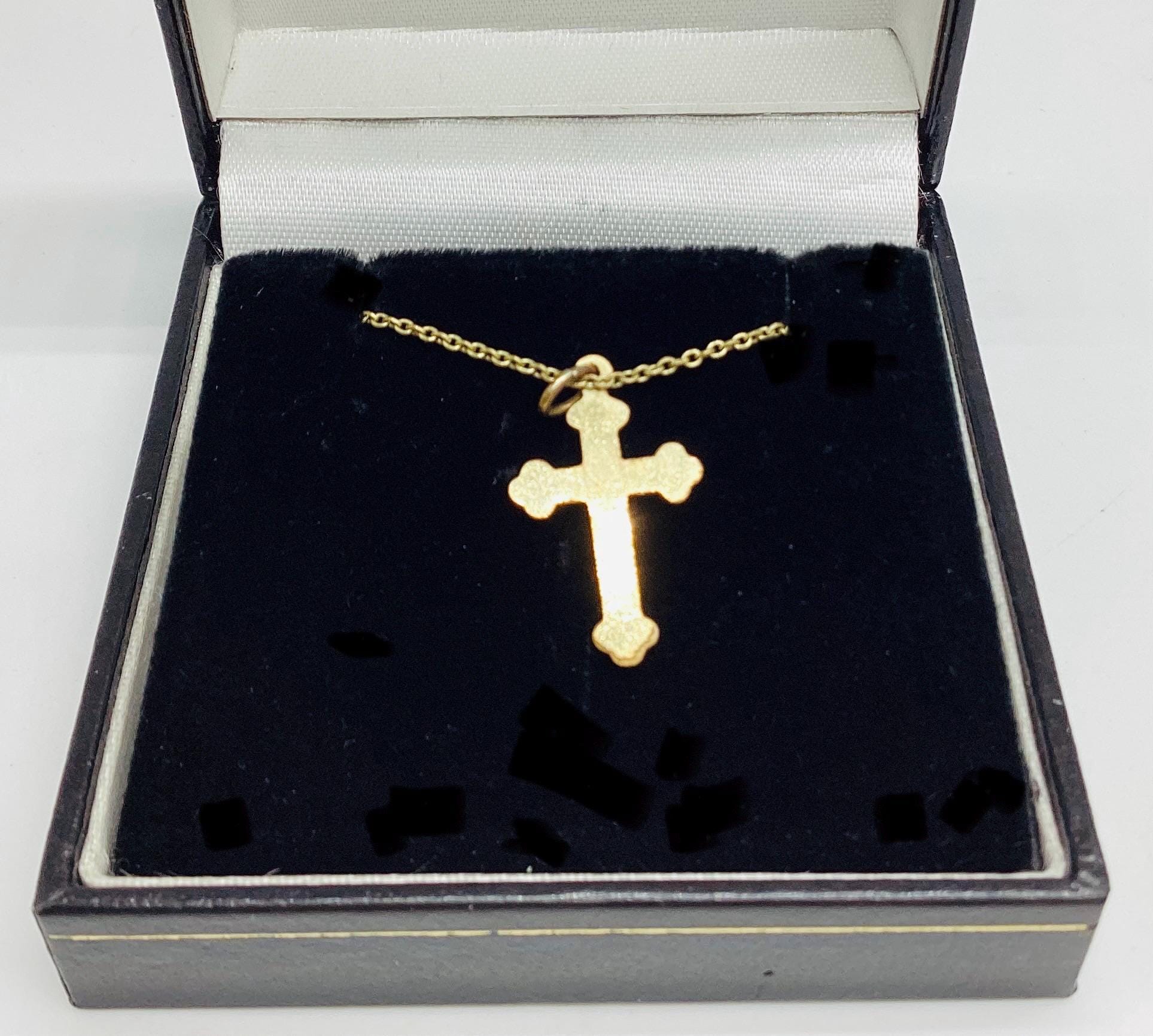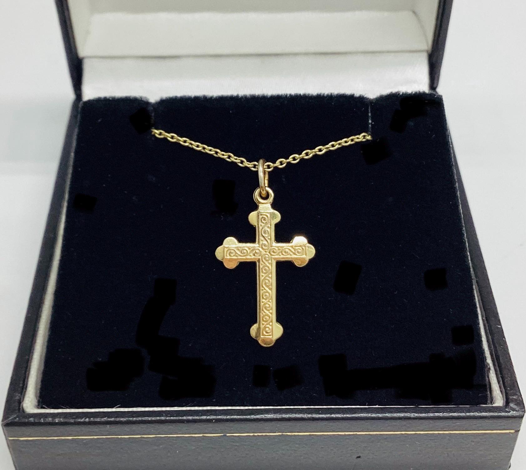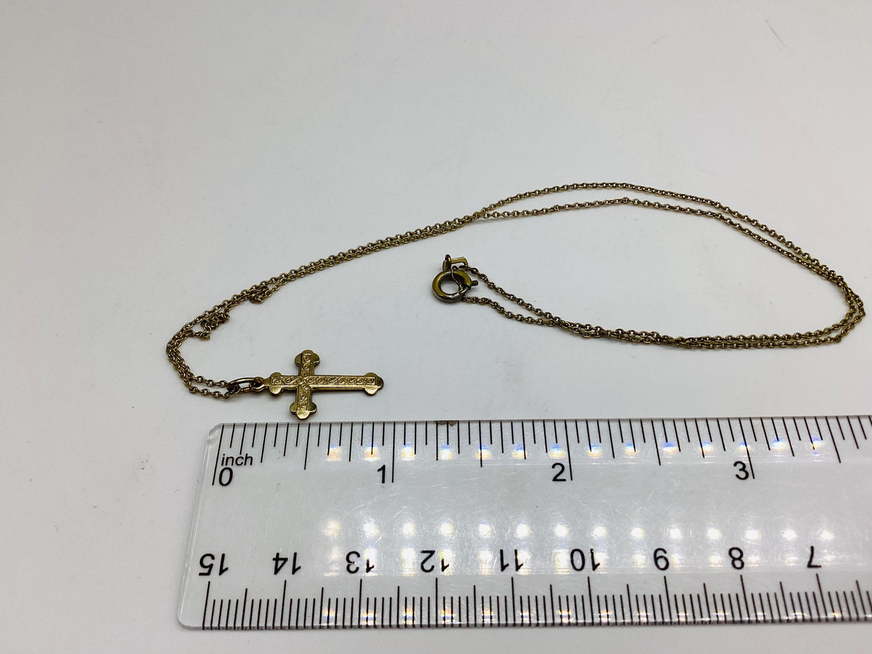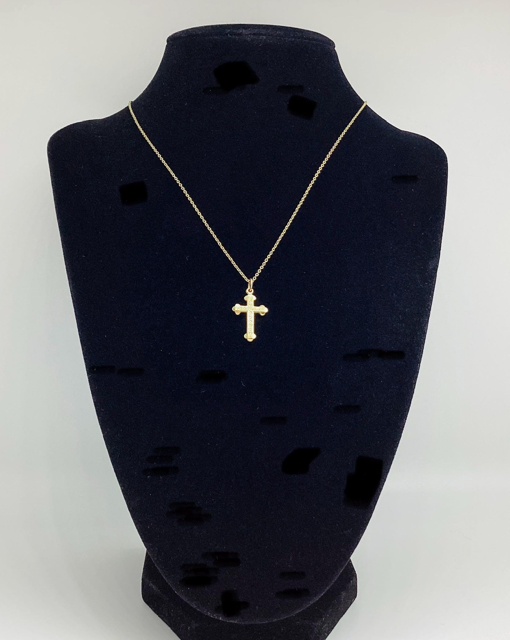 A dainty vintage crucifix with very pretty engraving hung on a fine rolled gold chain. The chain measures 18 inches and is