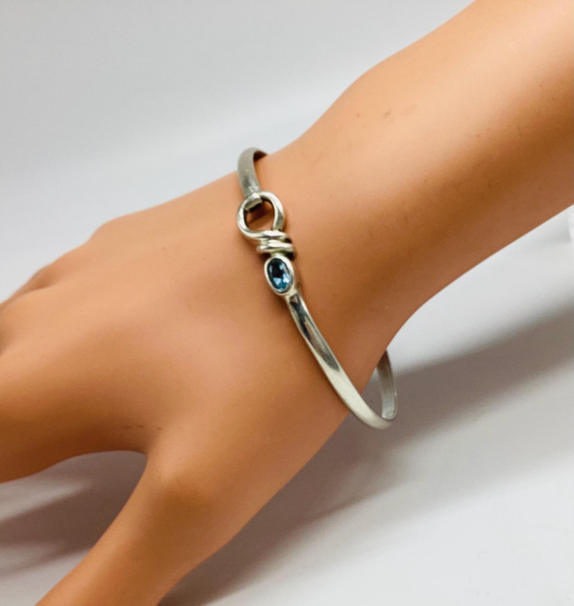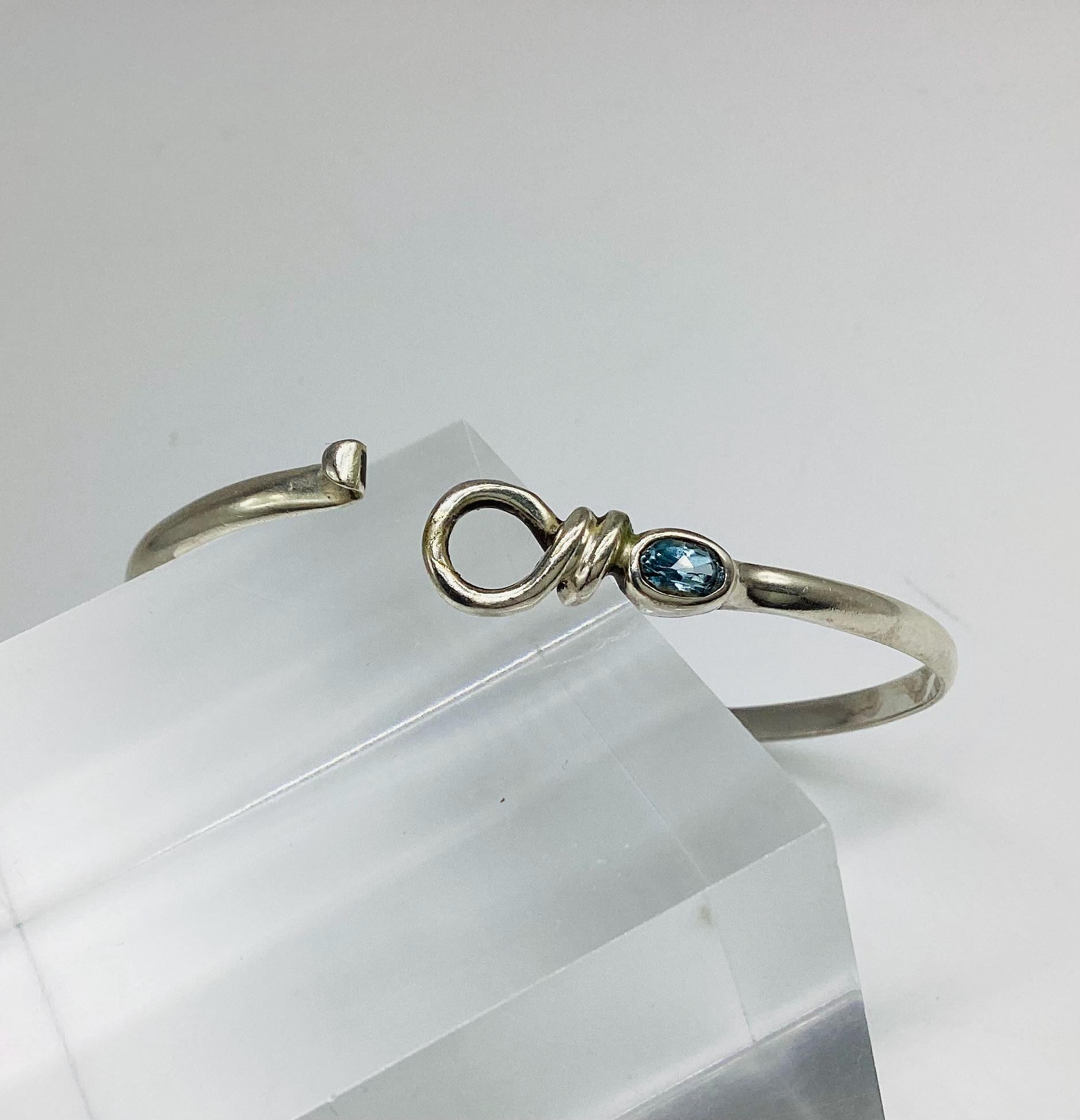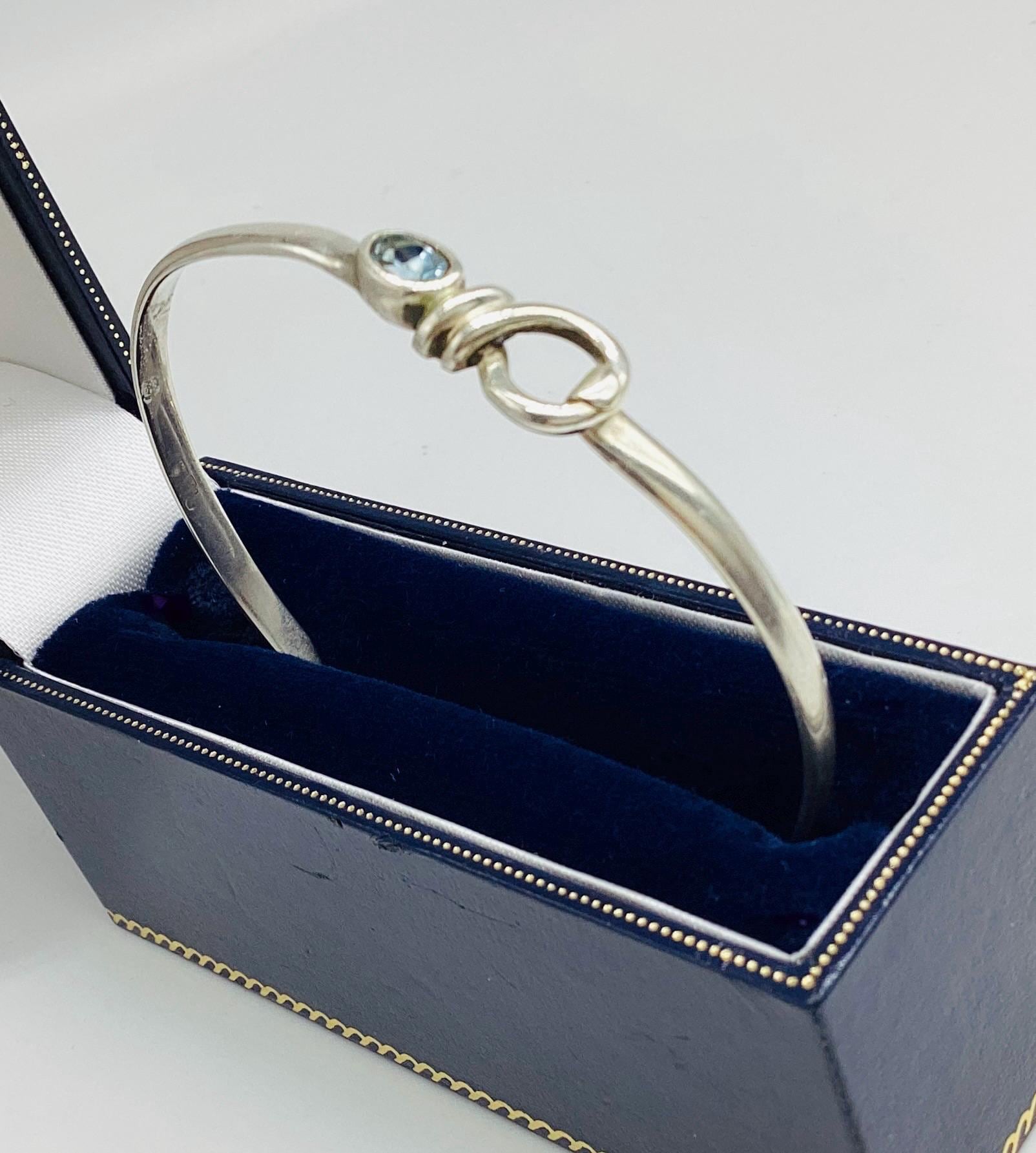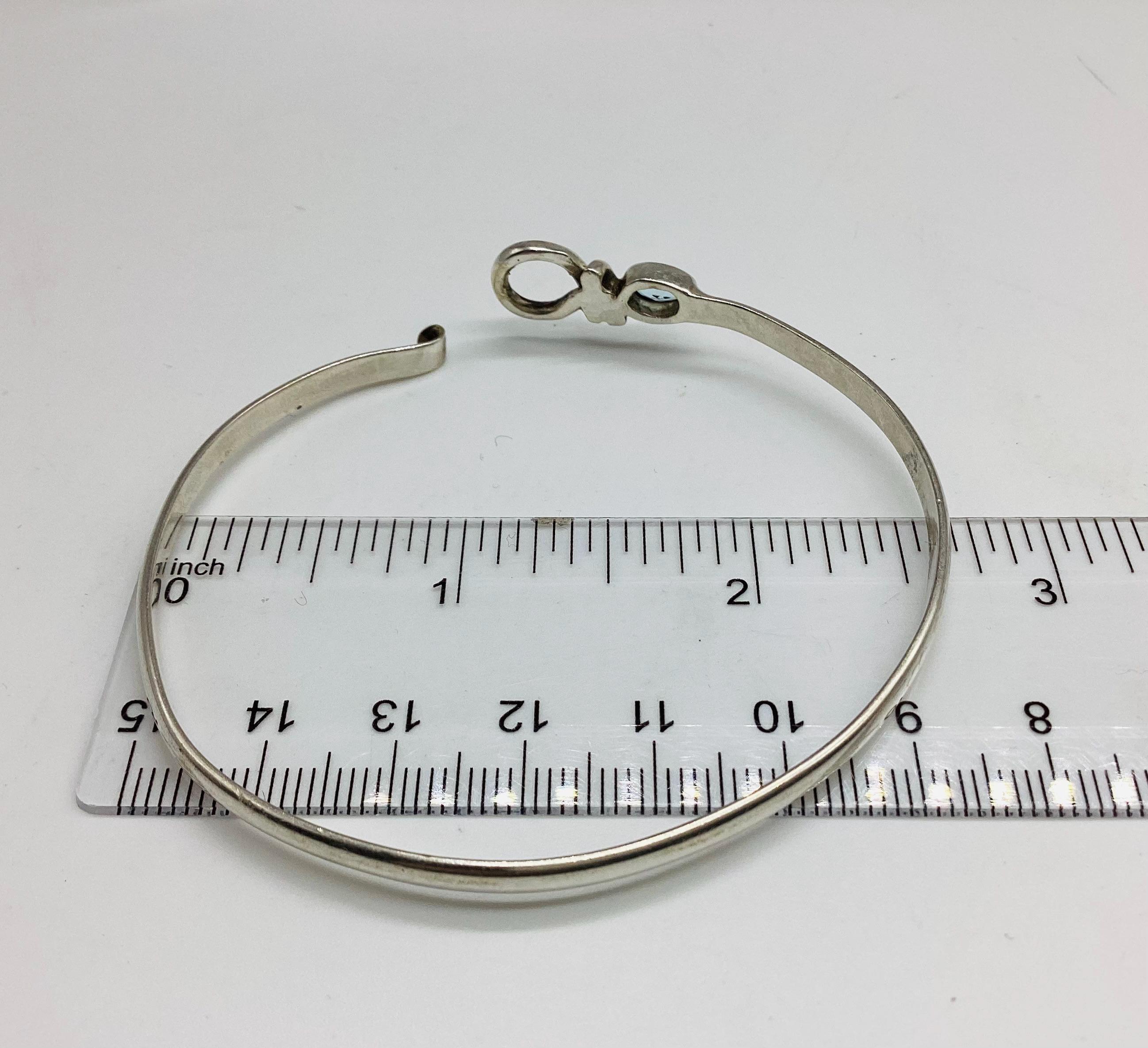 Delightful silver bangle with a faceted blue topaz. Lovely as gifts or a treat for yourself. Would make great wedding bangles and look good against a summer tan. Stamped 925 as shown in final photo.