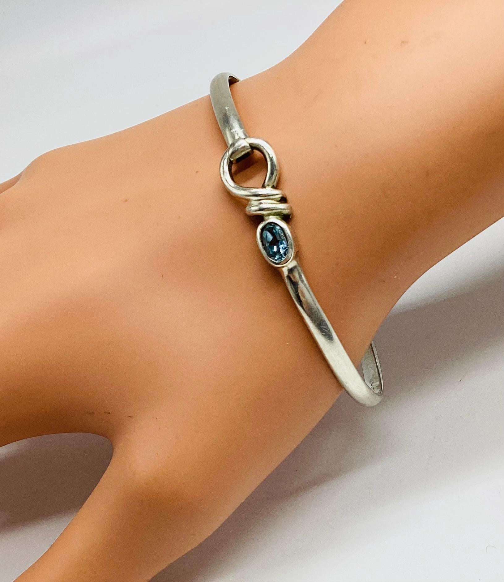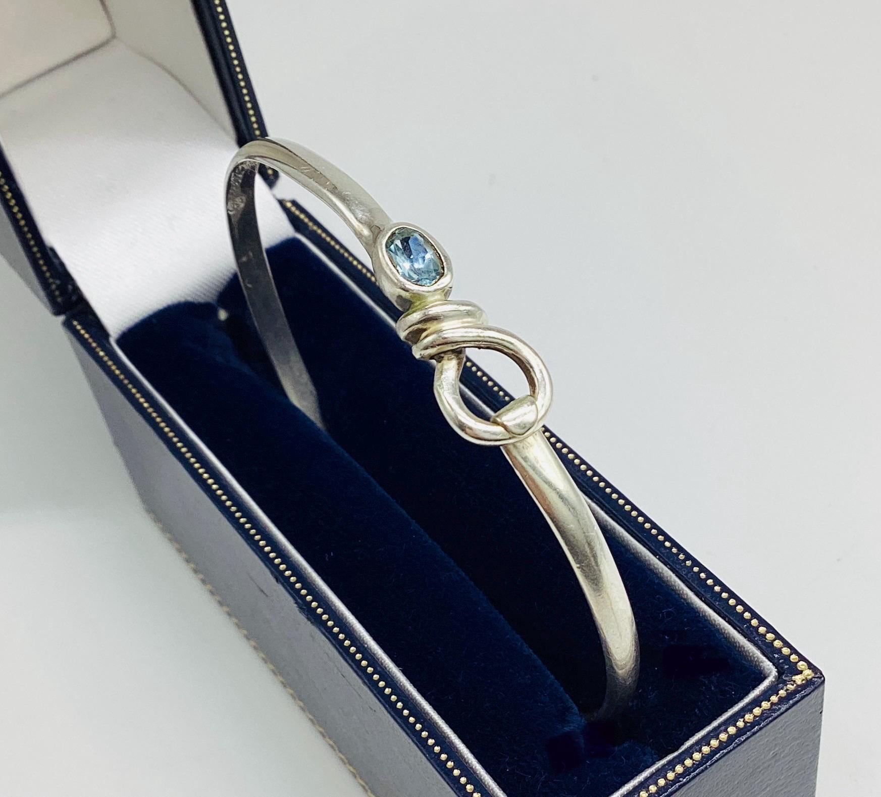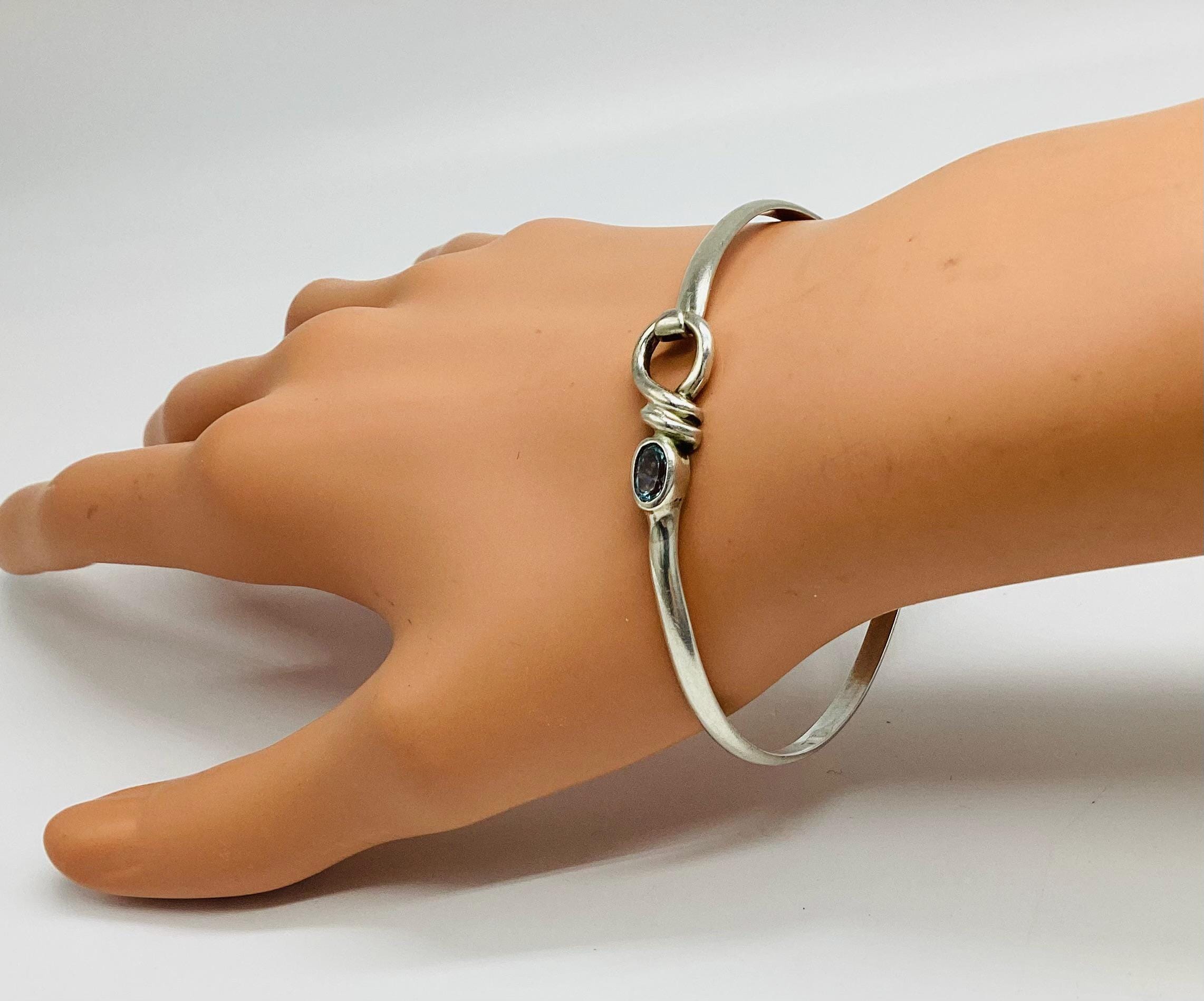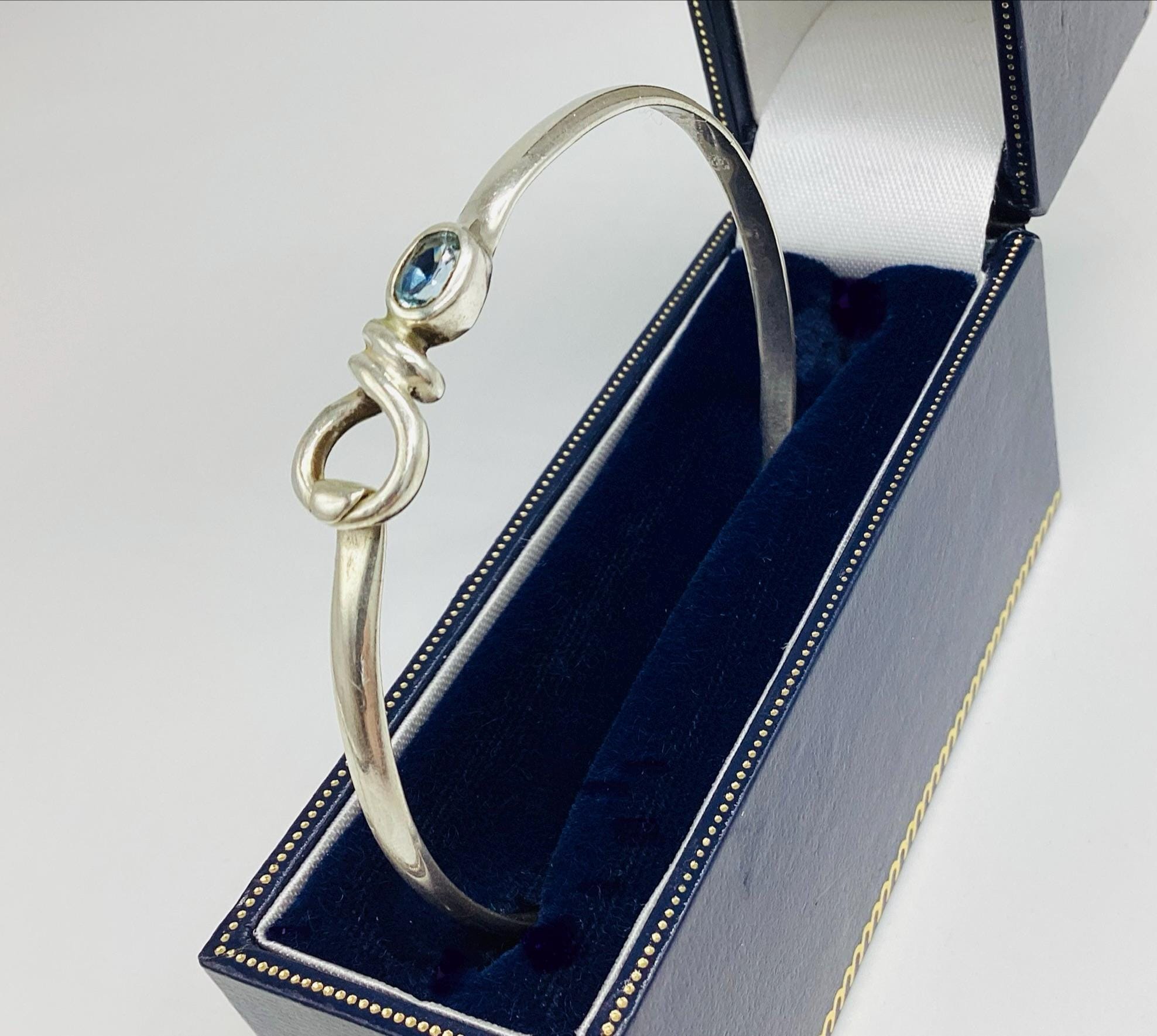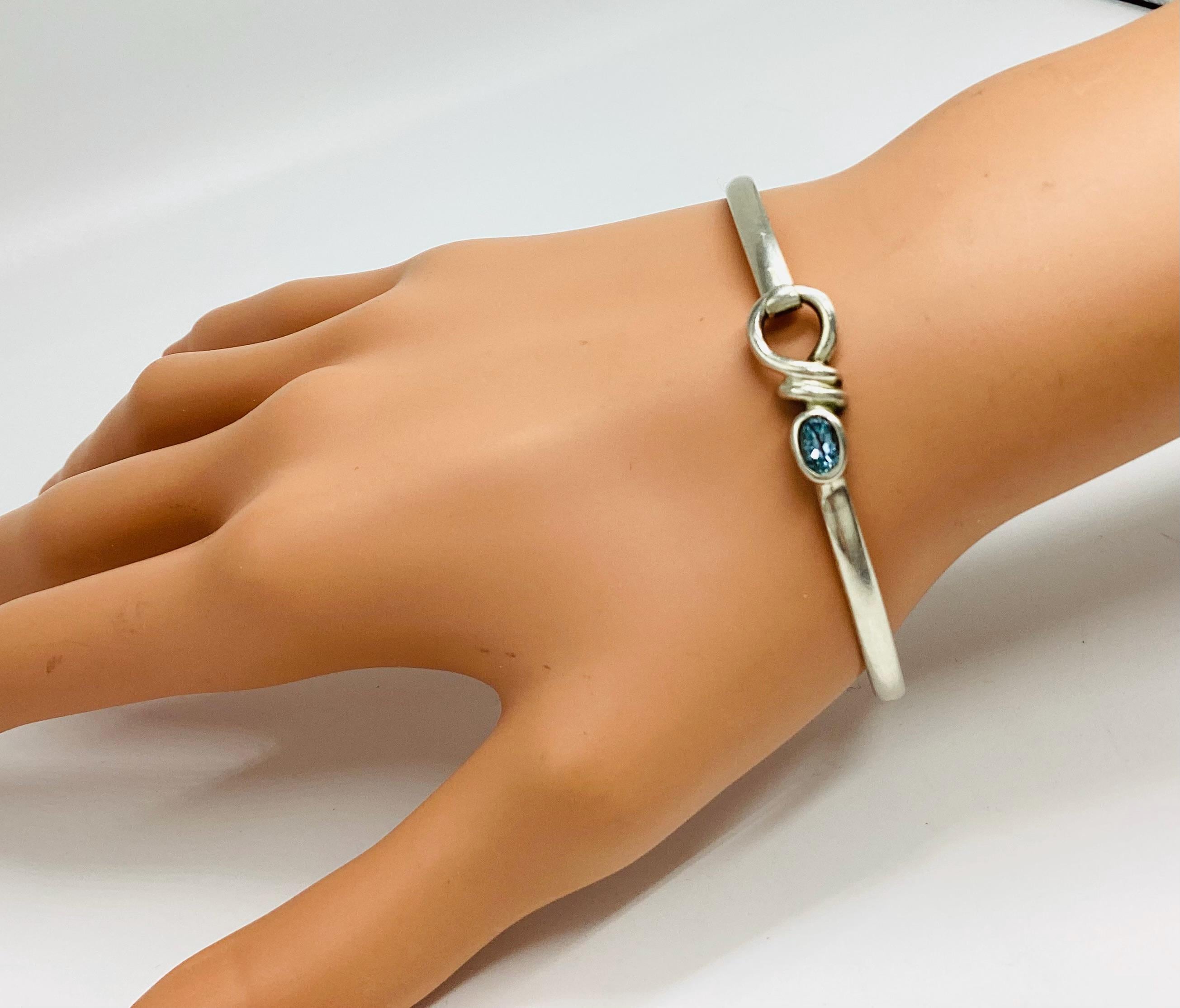 Delightful silver bangle with a faceted blue topaz. Lovely as gifts or a treat for yourself. Would make great wedding bangles and look good against a summer tan. Stamped 925 as shown in final photo.