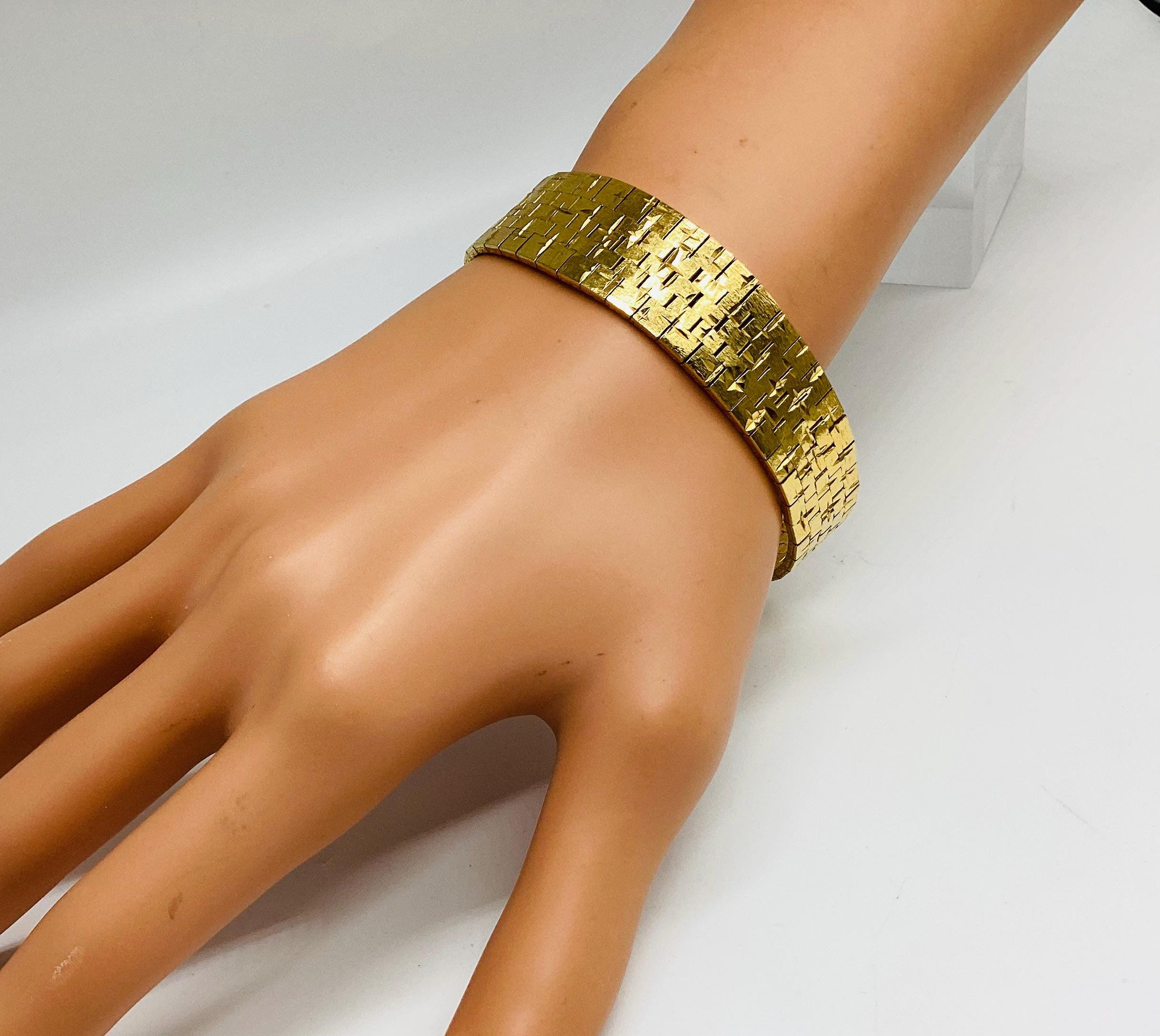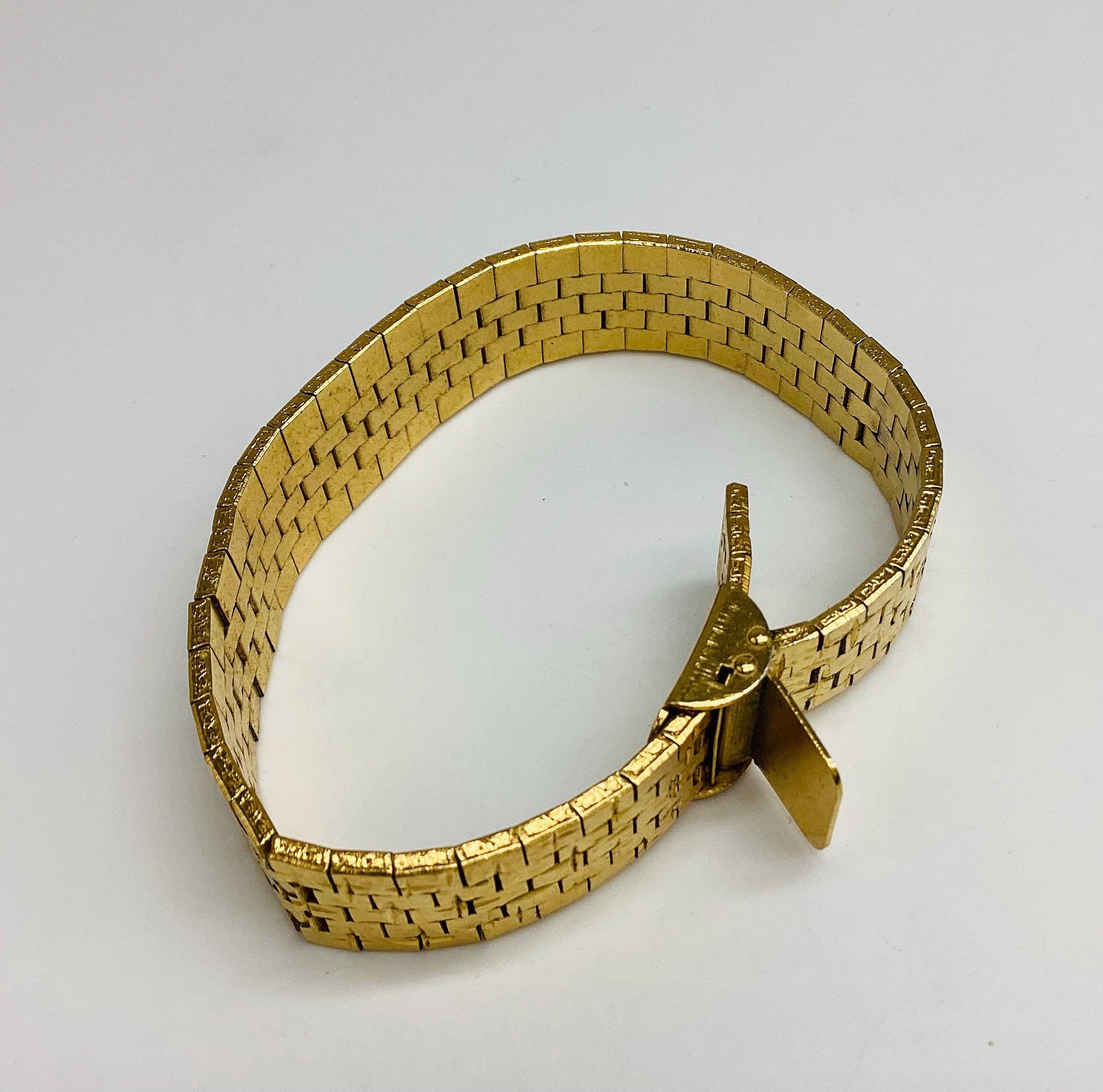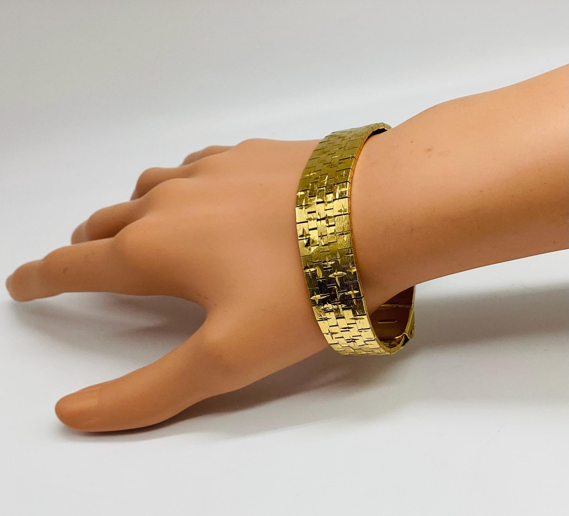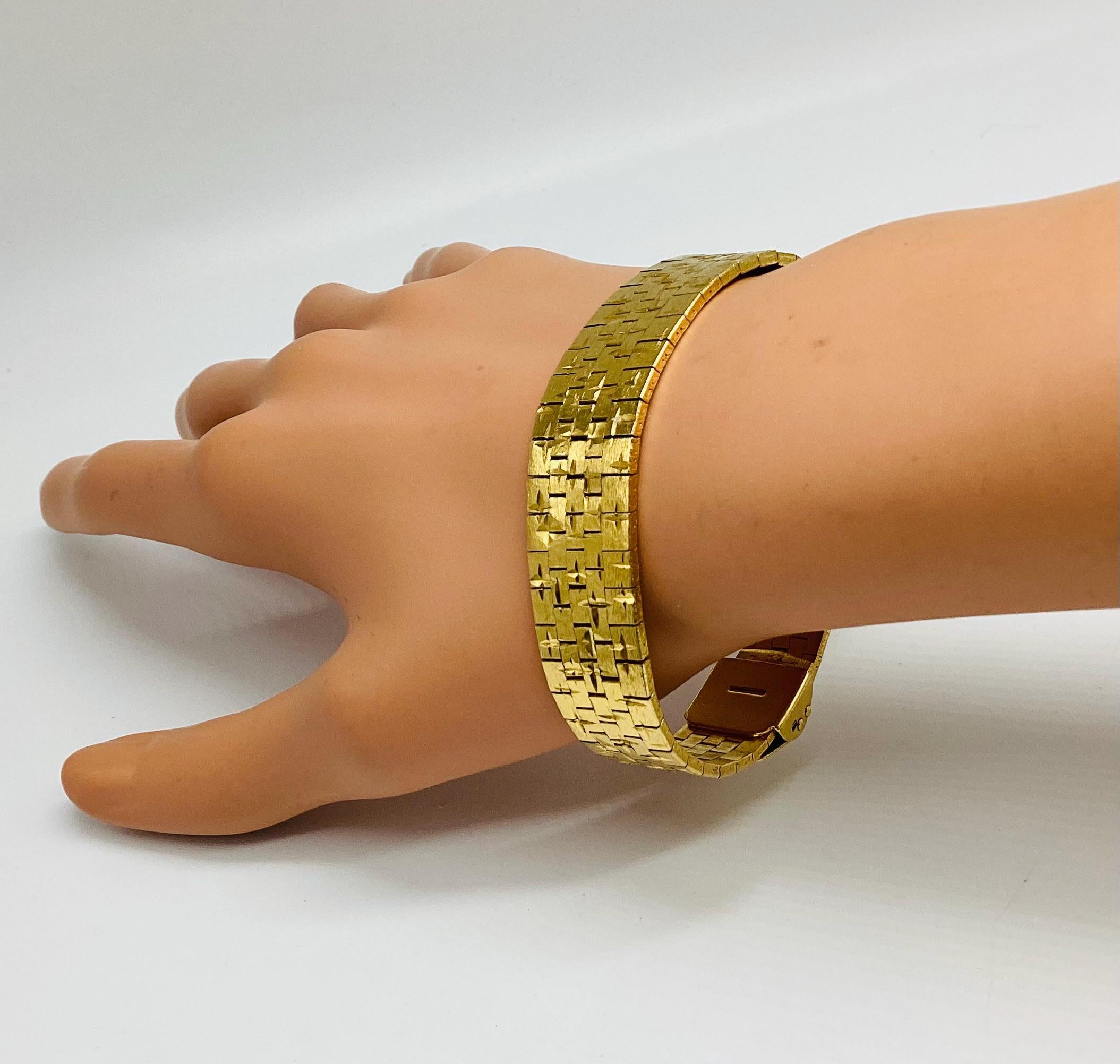 A lovely quality vintage bracelet. Graduated brick brutalist style, beautifully articulate and flexible. In excellent condition. Super belt and buckle clasp, adjustable. Looks good worn alone or with other bangles and chains. Nicely weighted.
