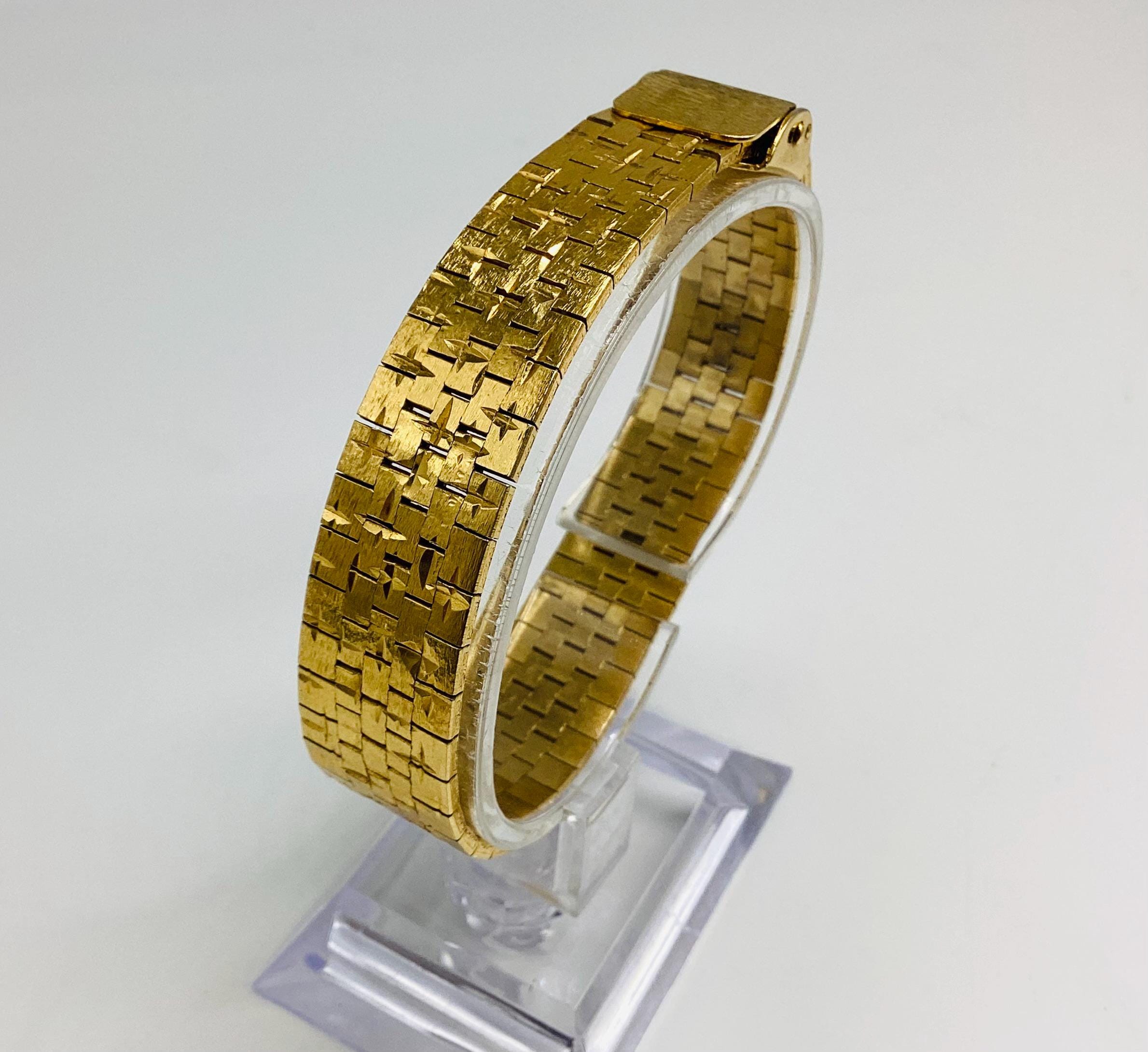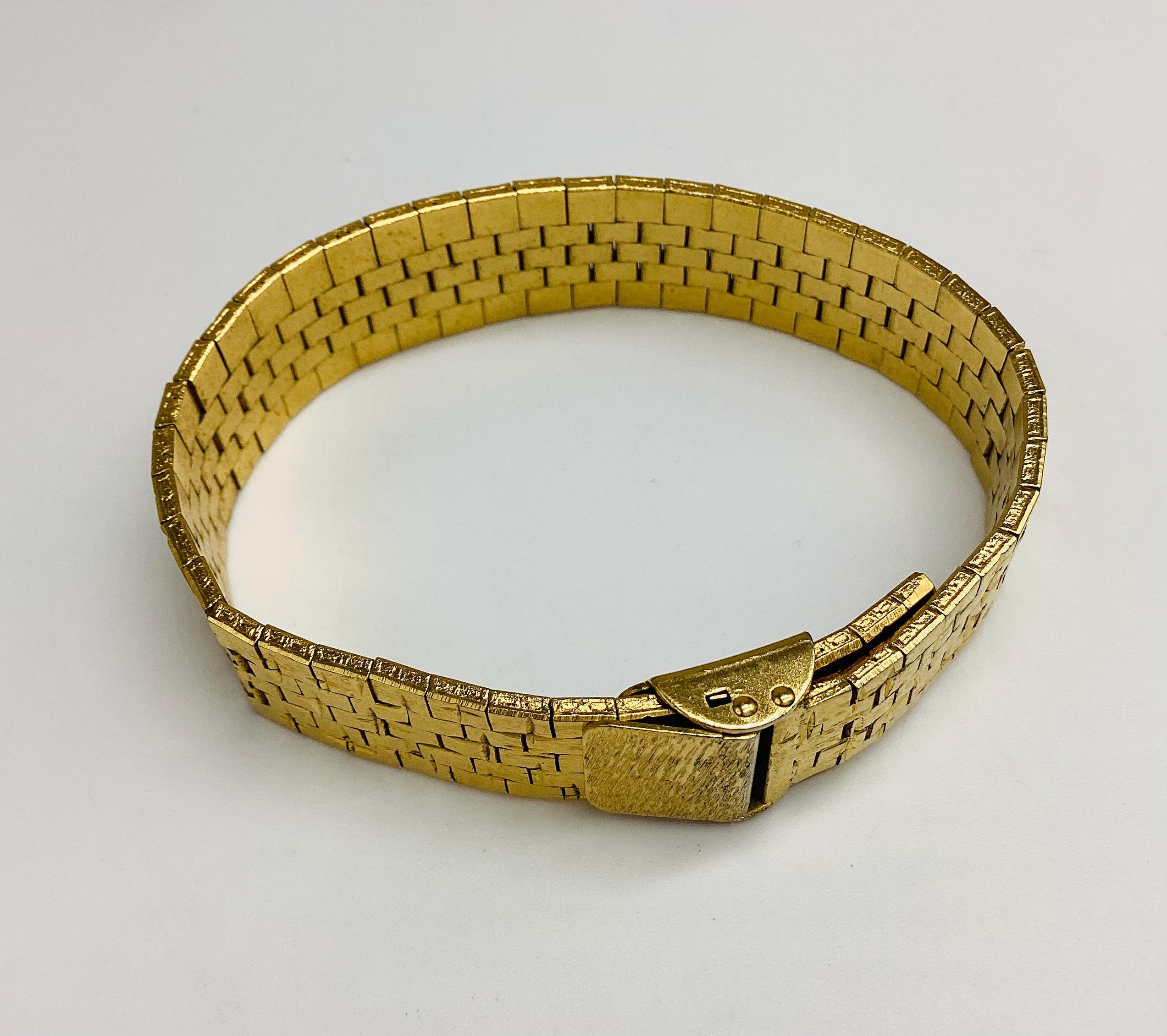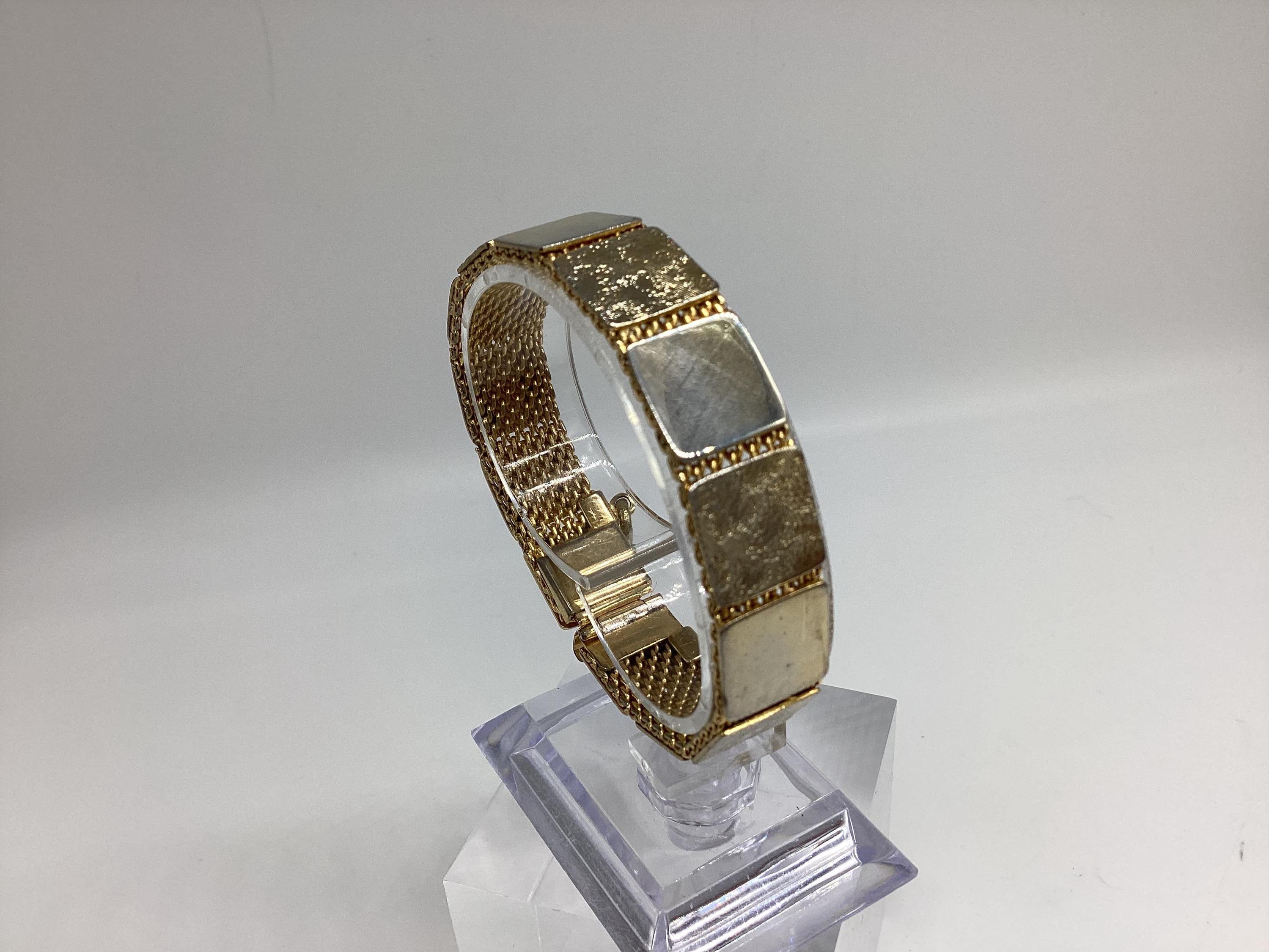 A lovely quality vintage bracelet. Graduated brick brutalist style, beautifully articulate and flexible. In excellent condition. Super belt and buckle clasp, adjustable. Looks good worn alone or with other bangles and chains. Nicely weighted.