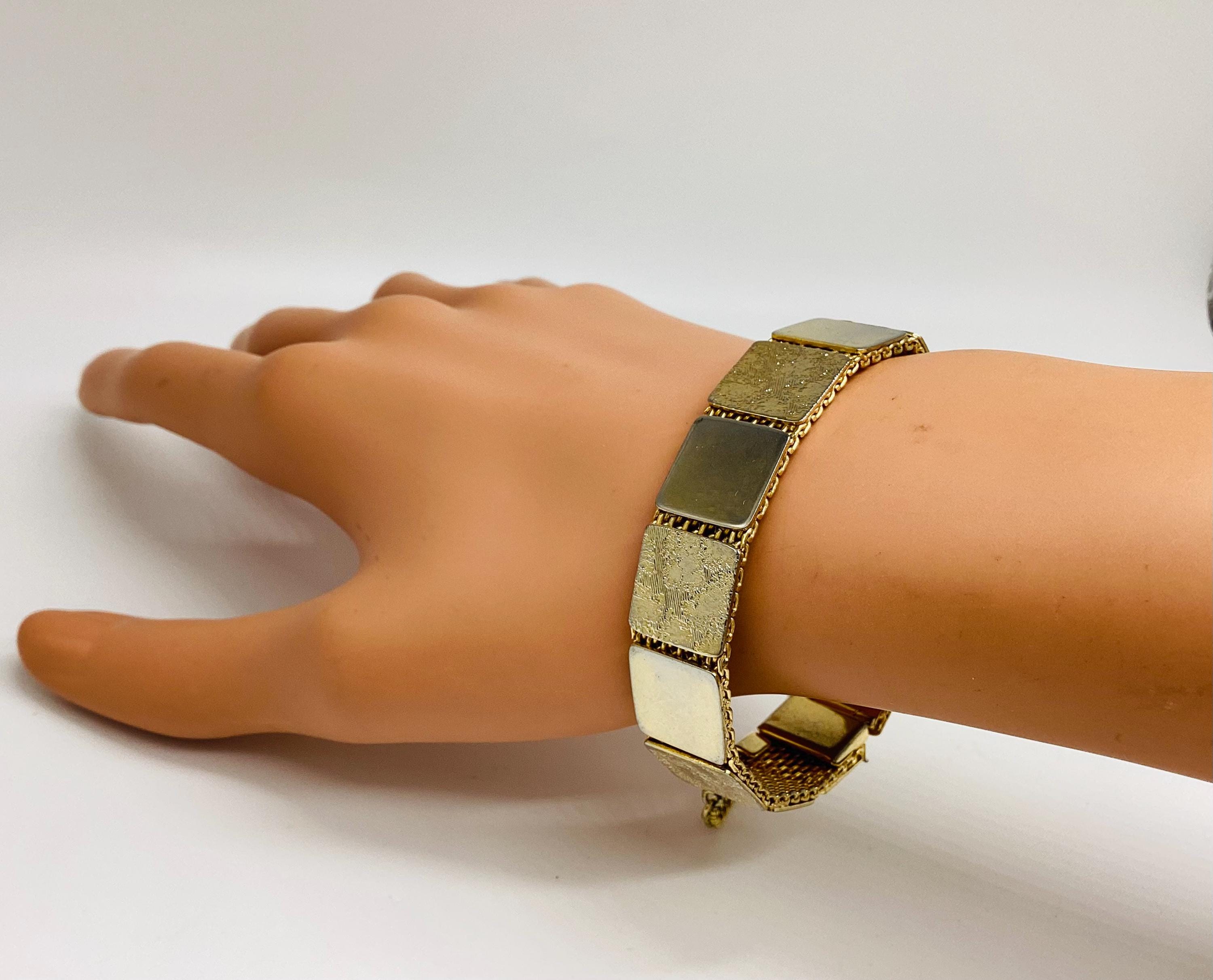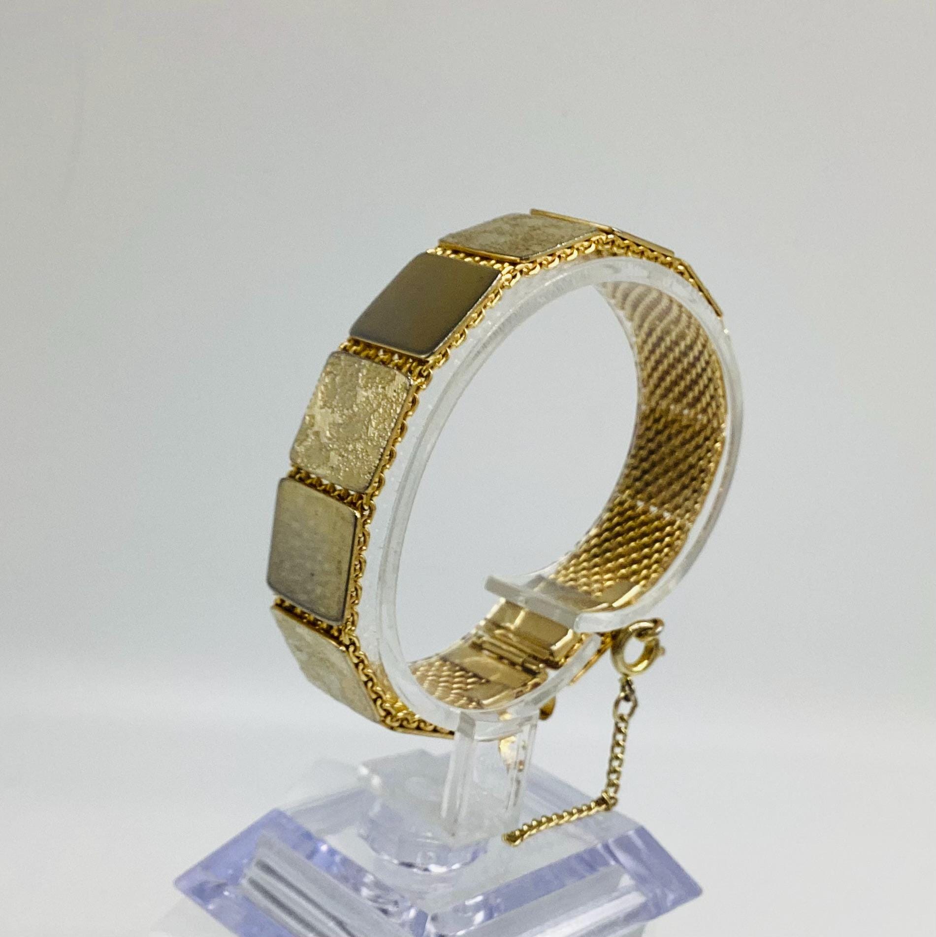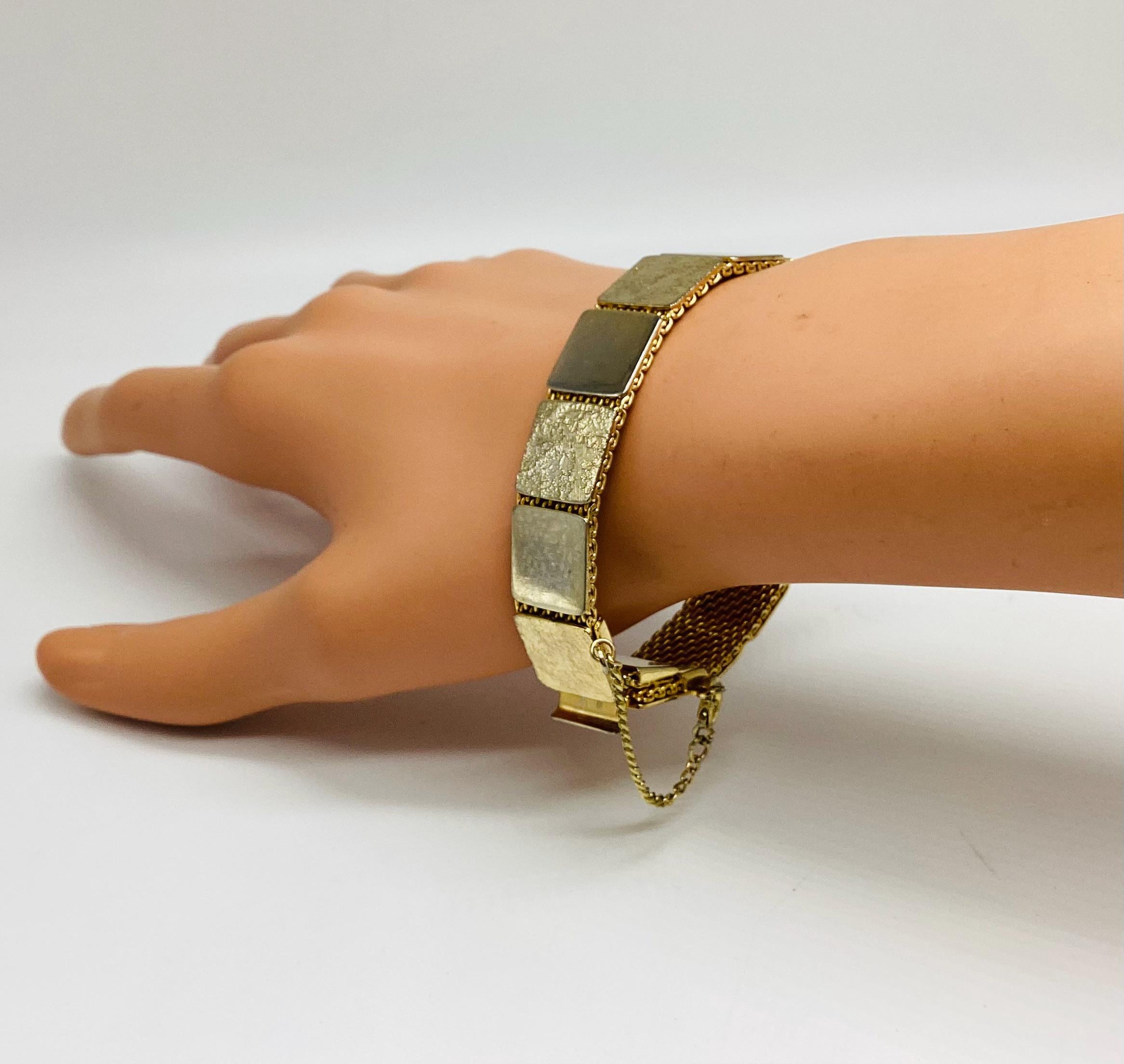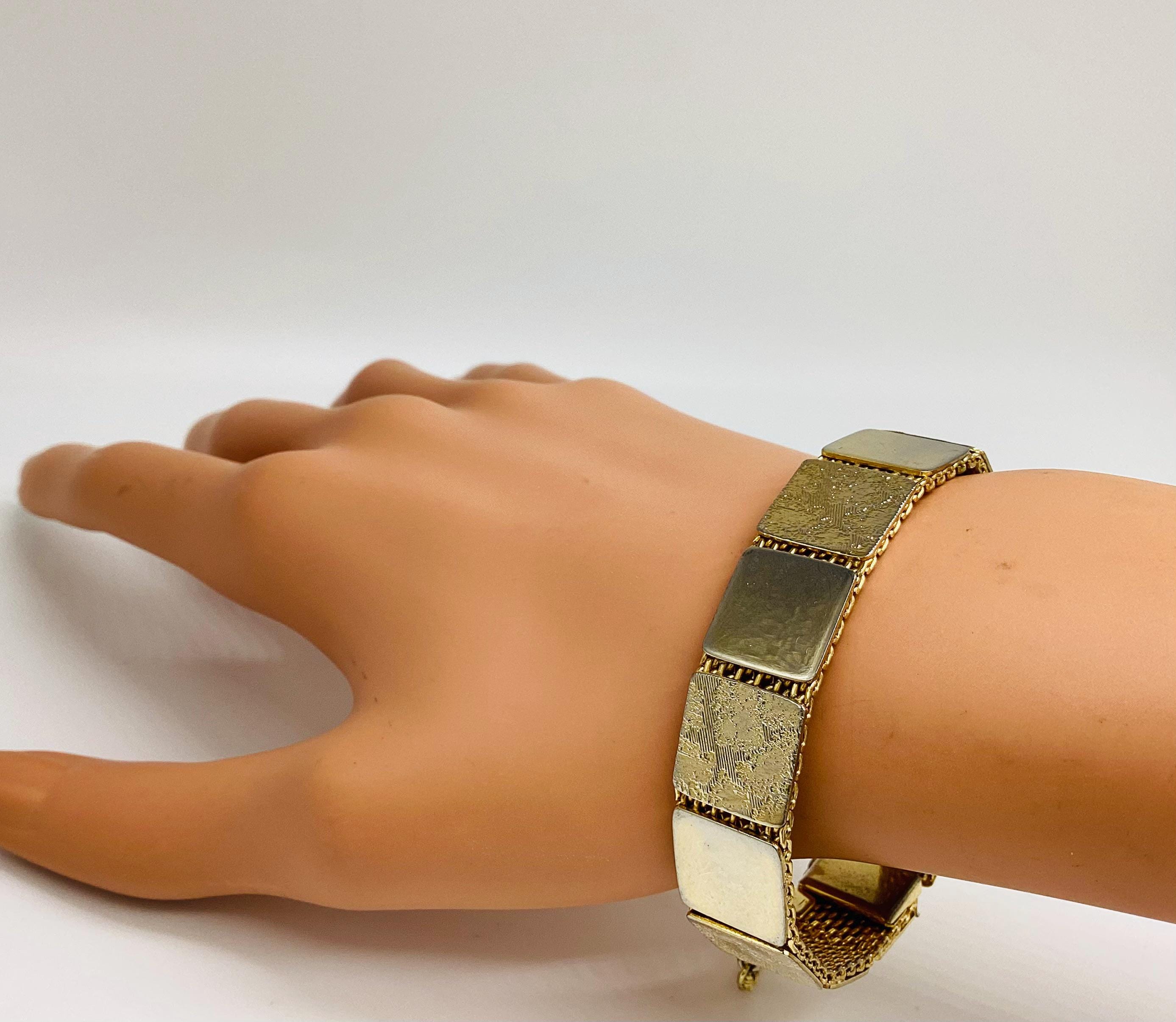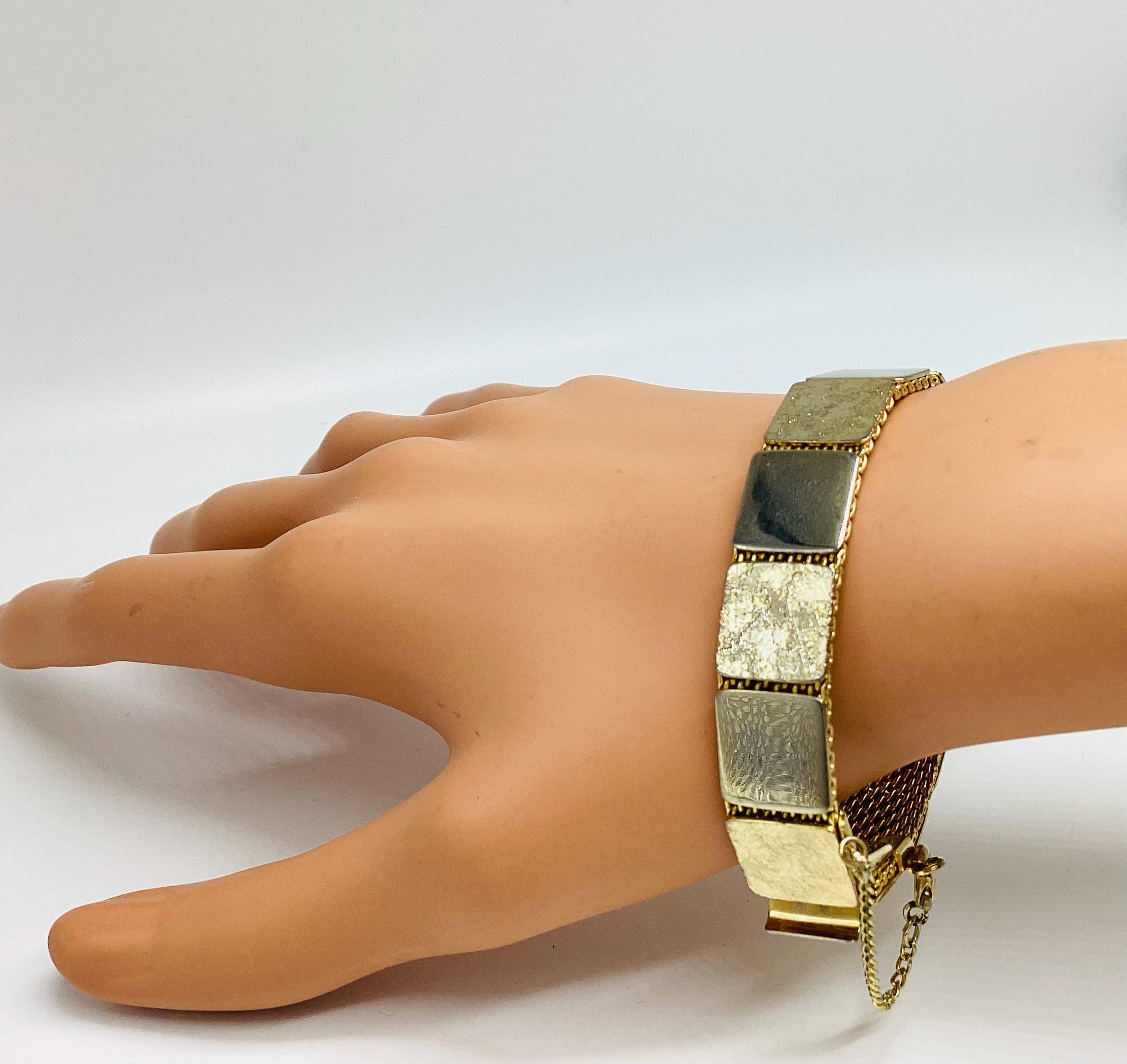 A lovely quality vintage bracelet. Alternately etched and plain square panels, linked with a continuous mesh backing. Beautifully articulate and flexible in good condition. Looks good worn alone or with other bangles and chains. Nicely weighted.