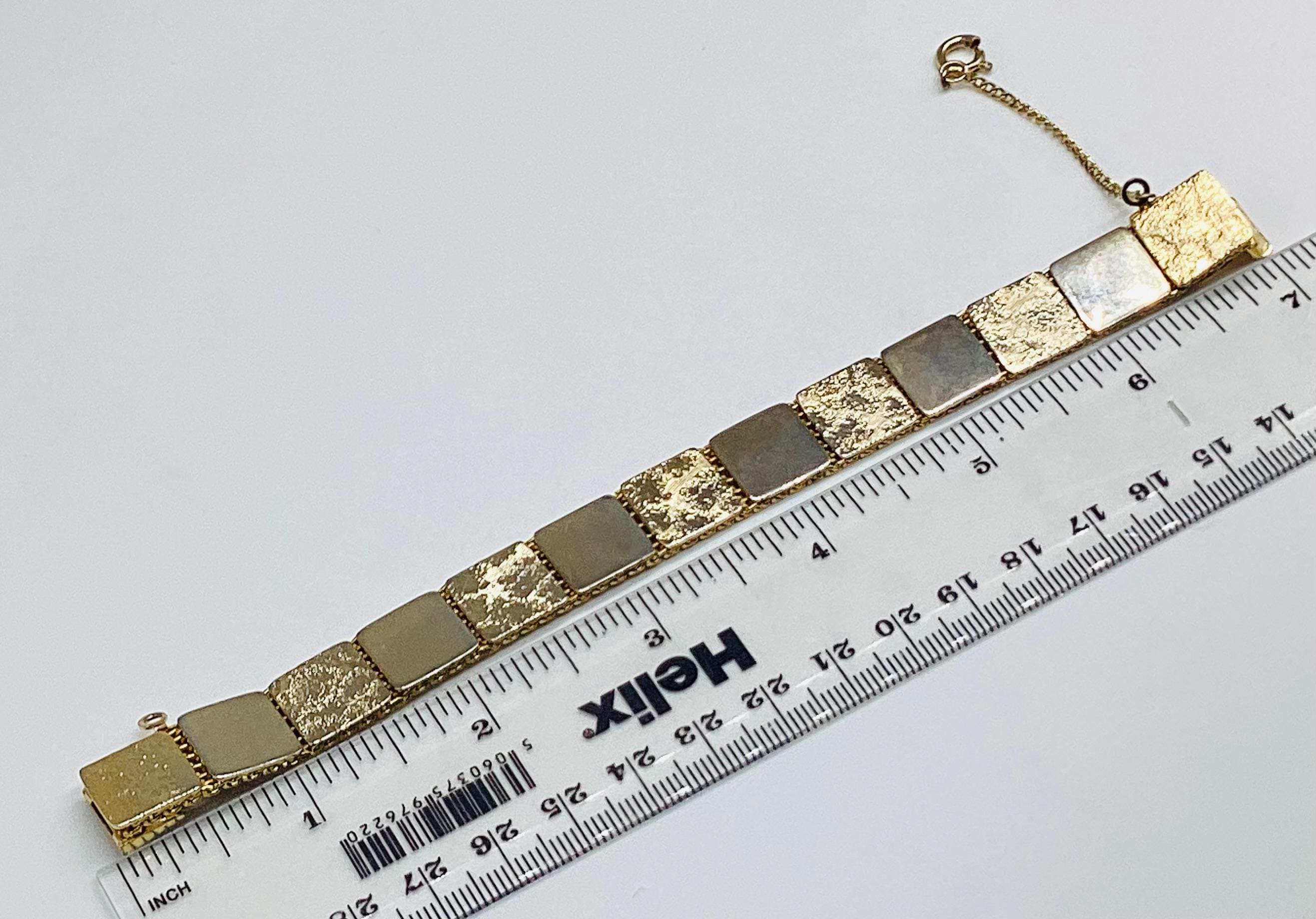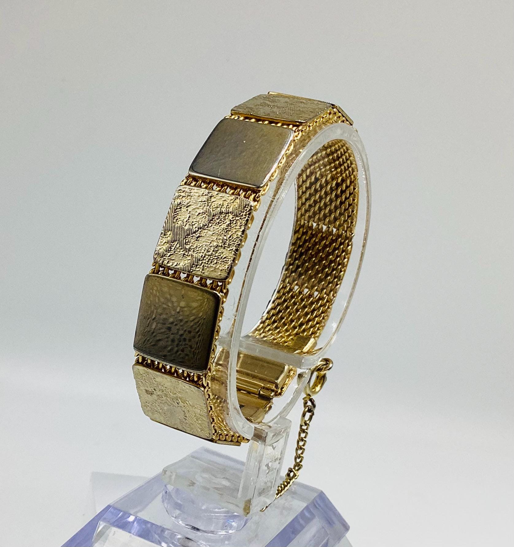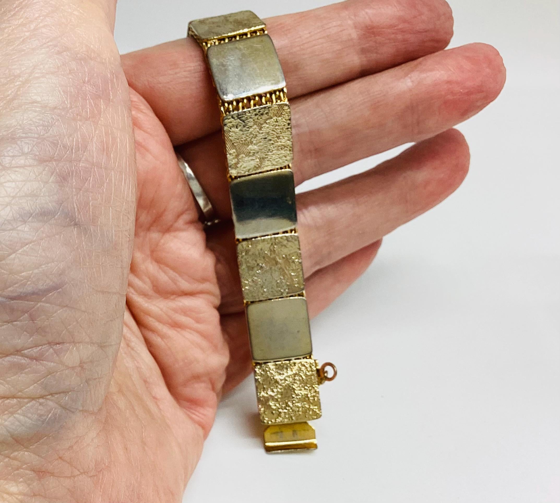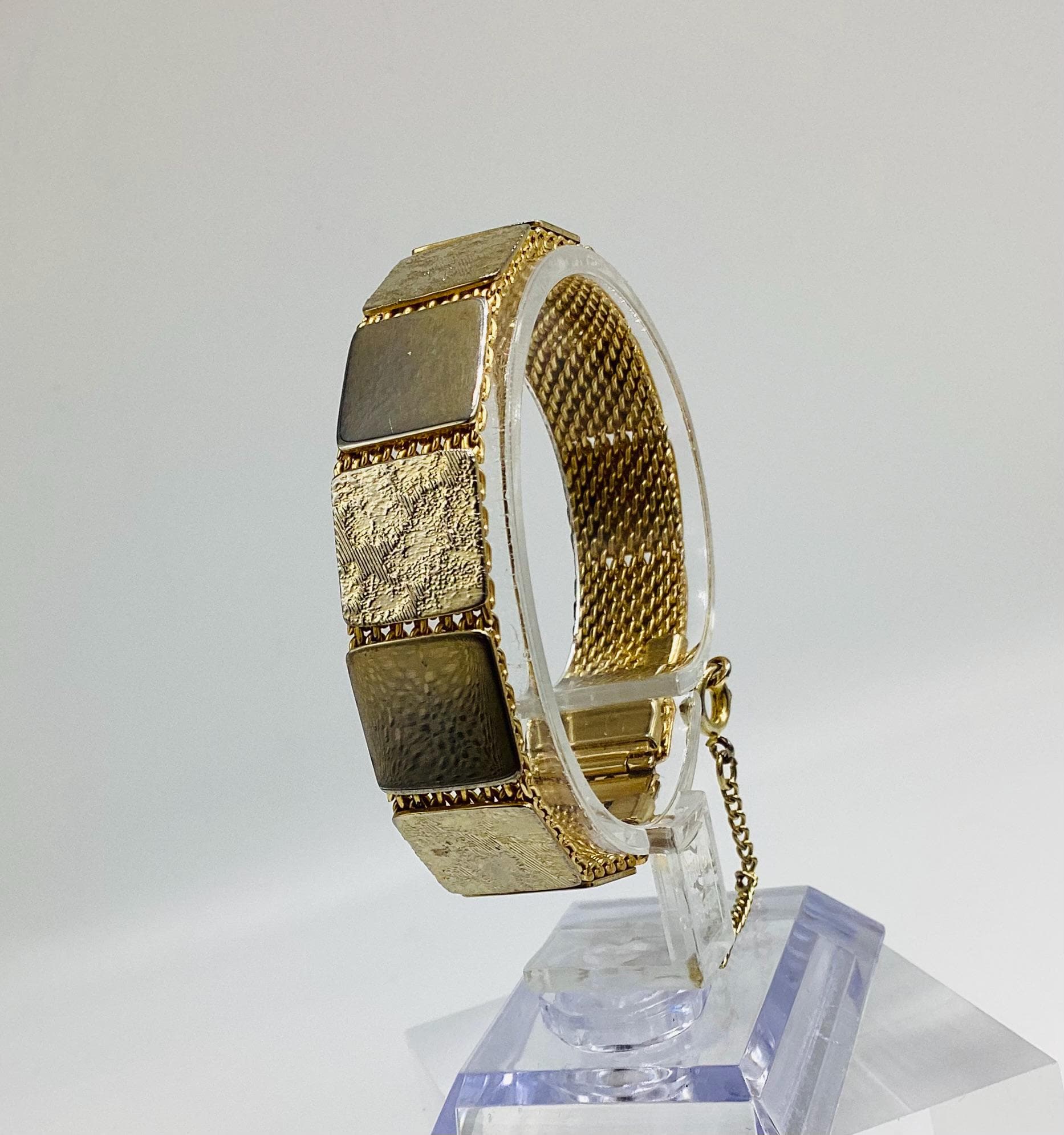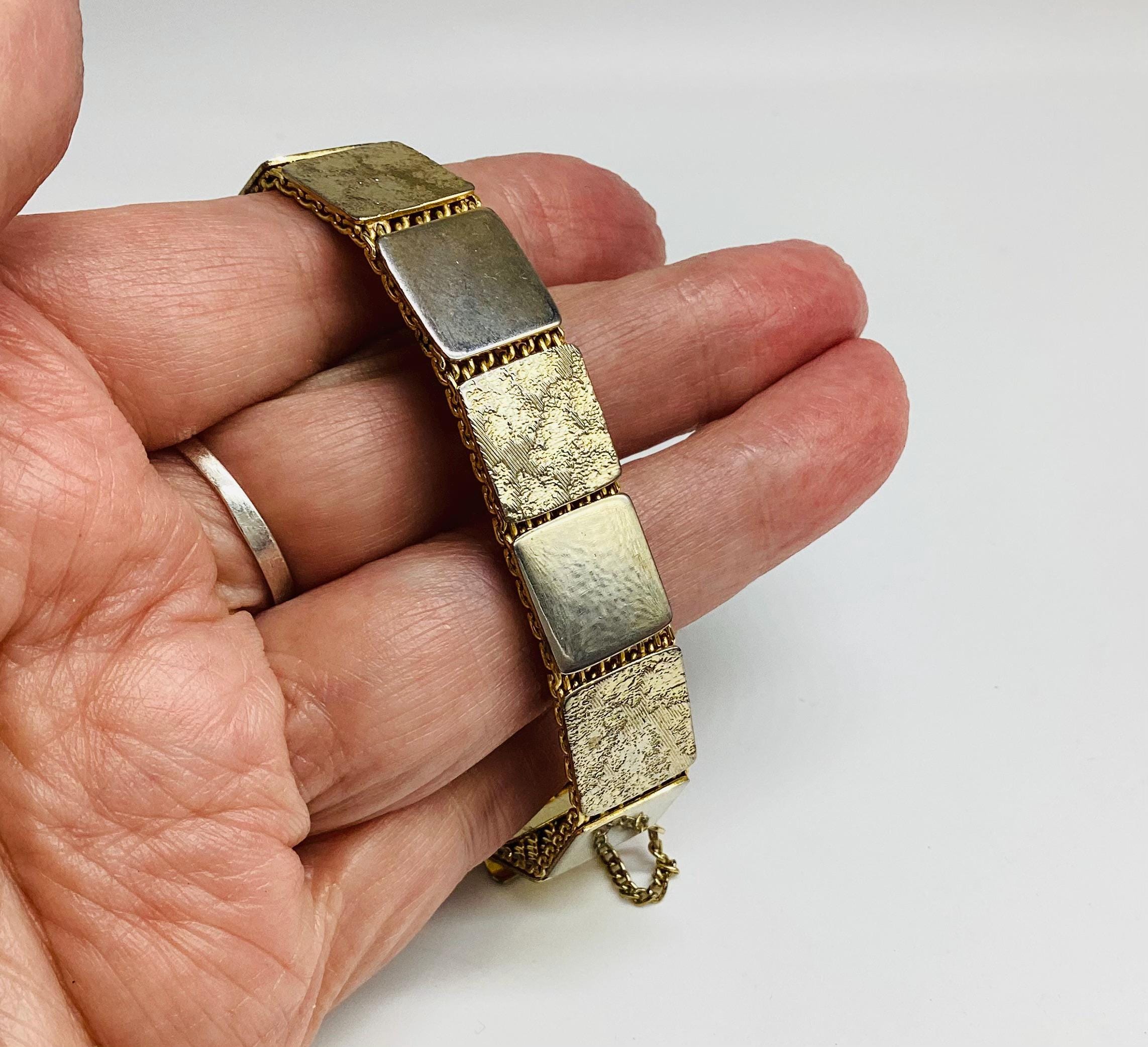 A lovely quality vintage bracelet. Alternately etched and plain square panels, linked with a continuous mesh backing. Beautifully articulate and flexible in good condition. Looks good worn alone or with other bangles and chains. Nicely weighted.