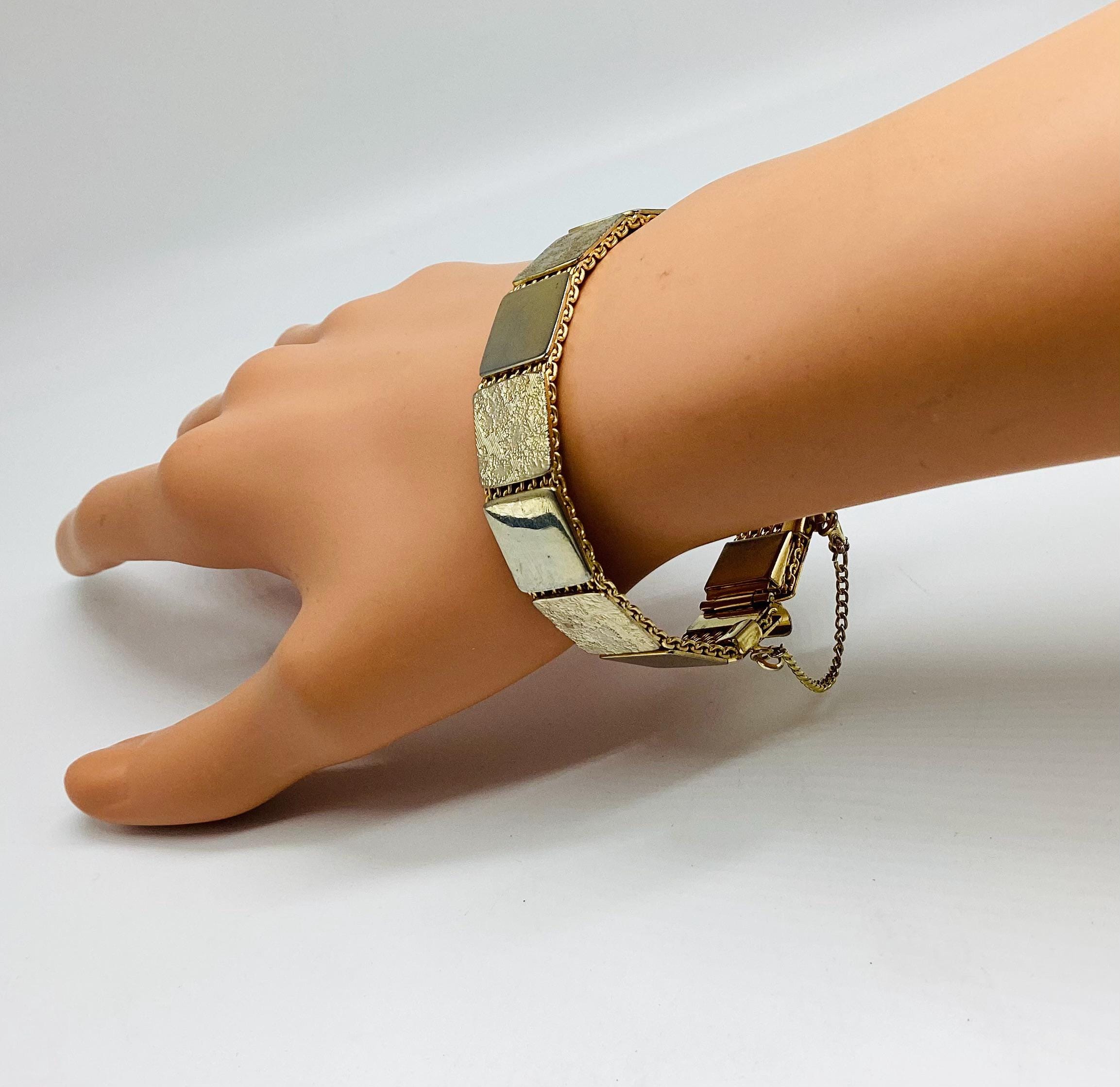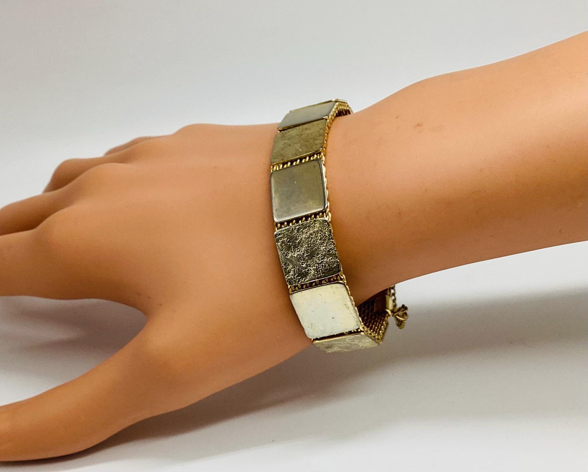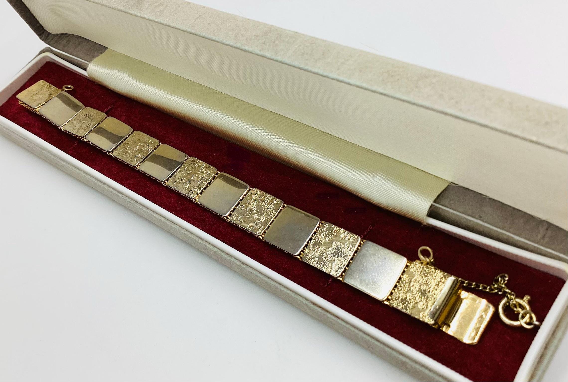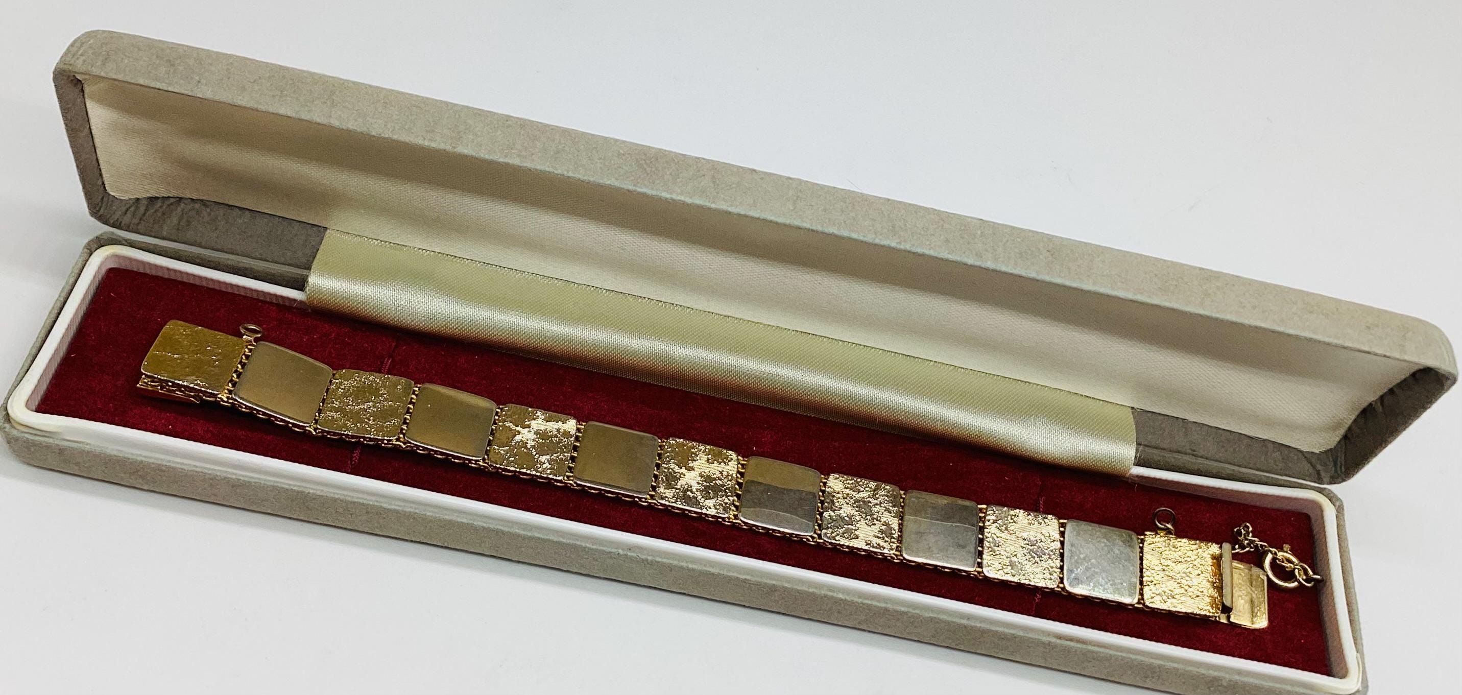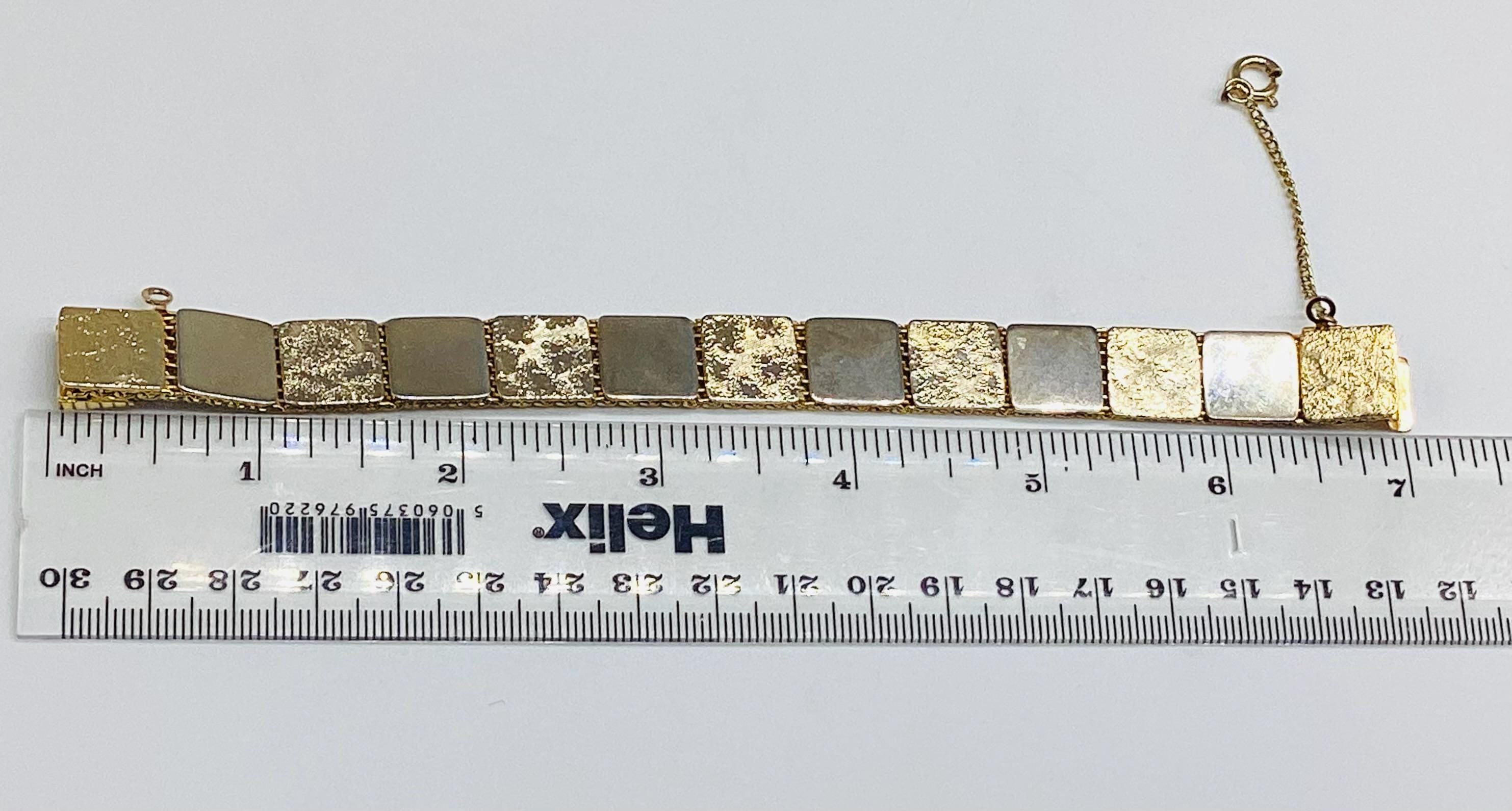A lovely quality vintage bracelet. Alternately etched and plain square panels, linked with a continuous mesh backing. Beautifully articulate and flexible in good condition. Looks good worn alone or with other bangles and chains. Nicely weighted.