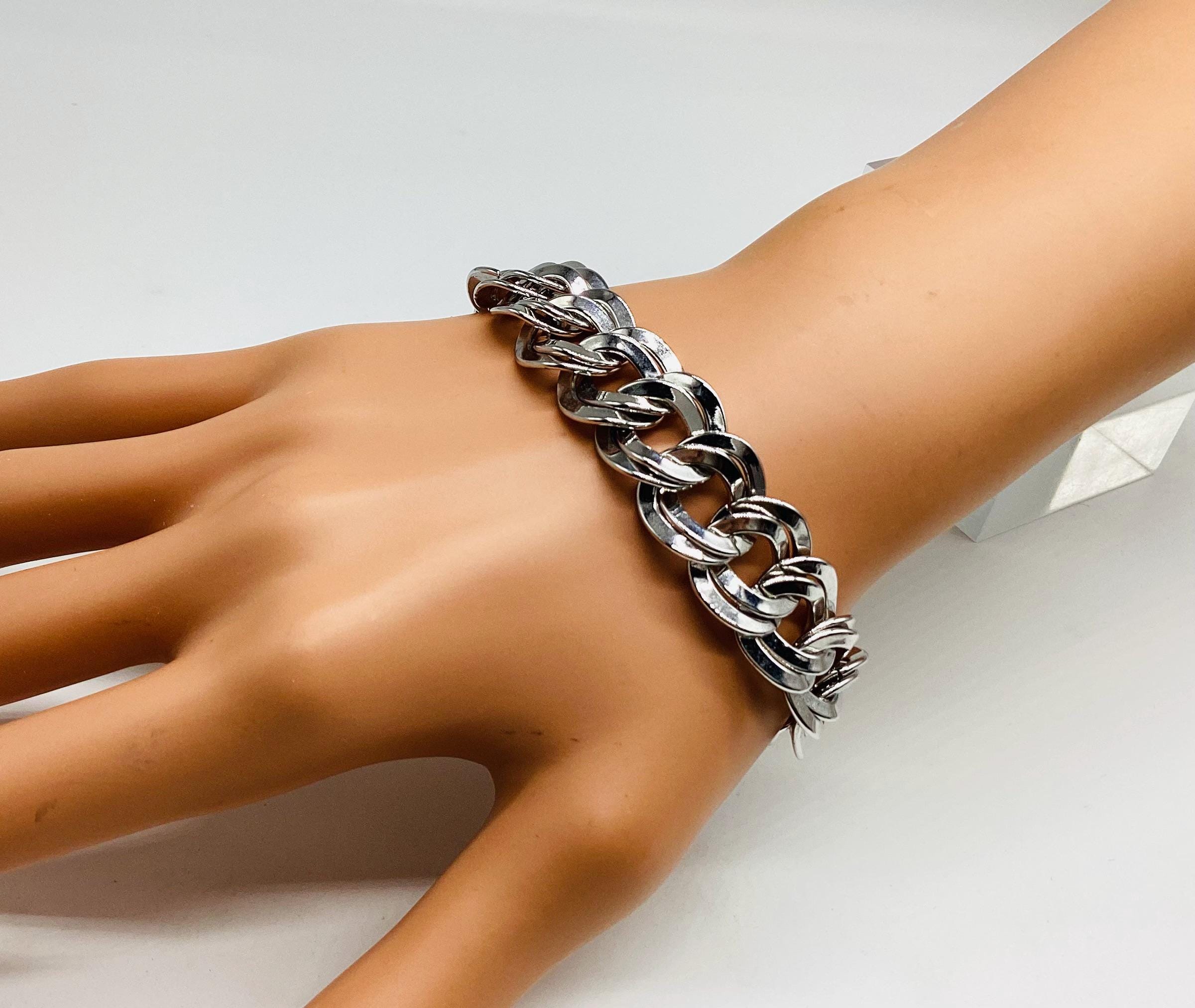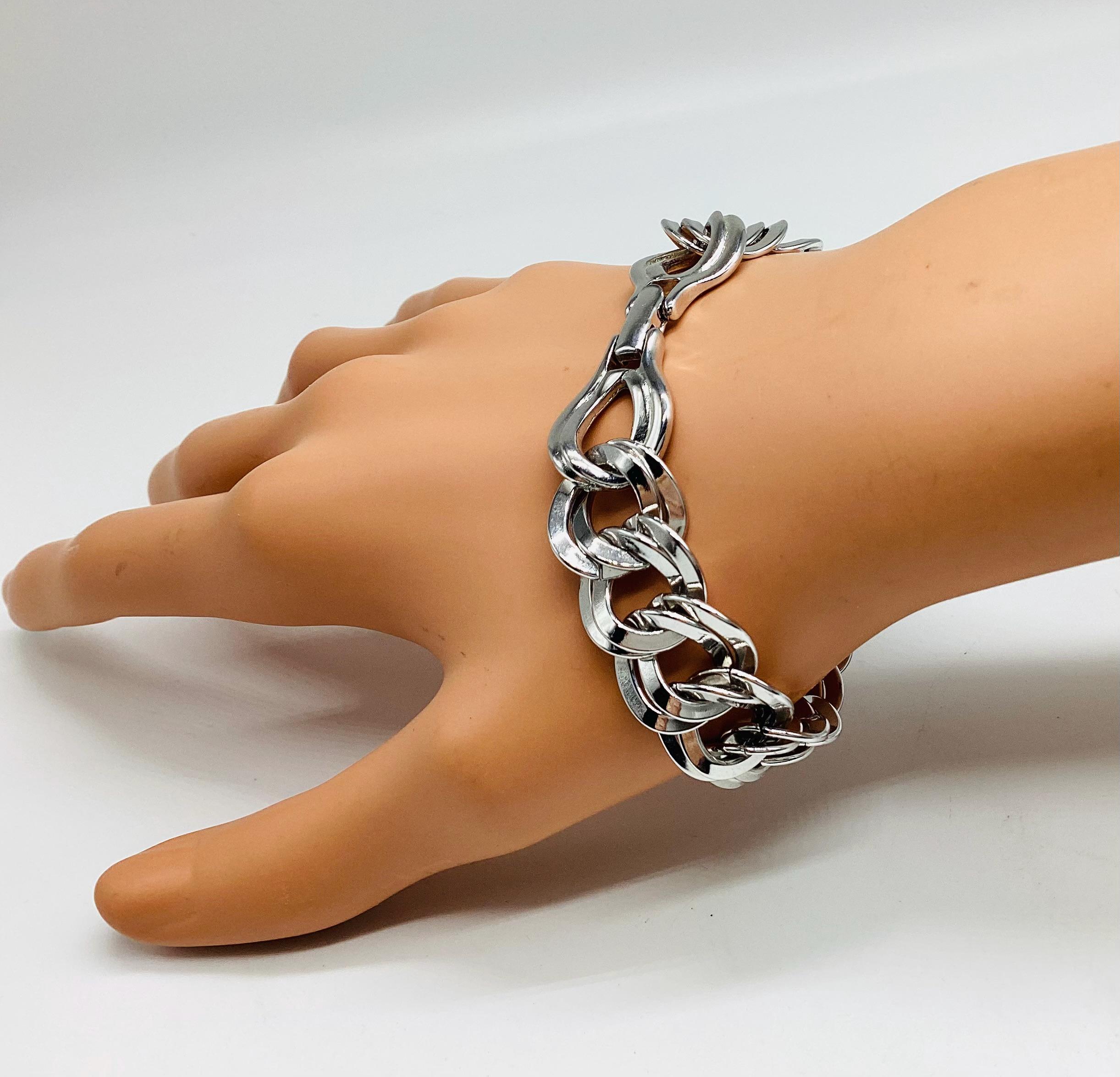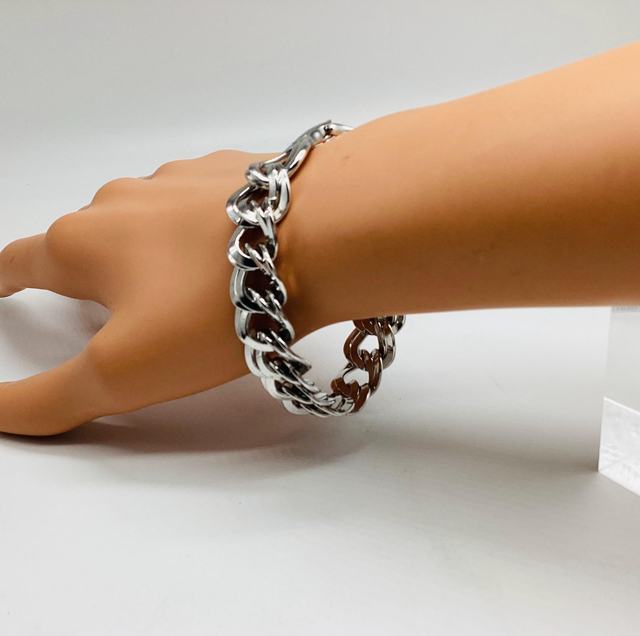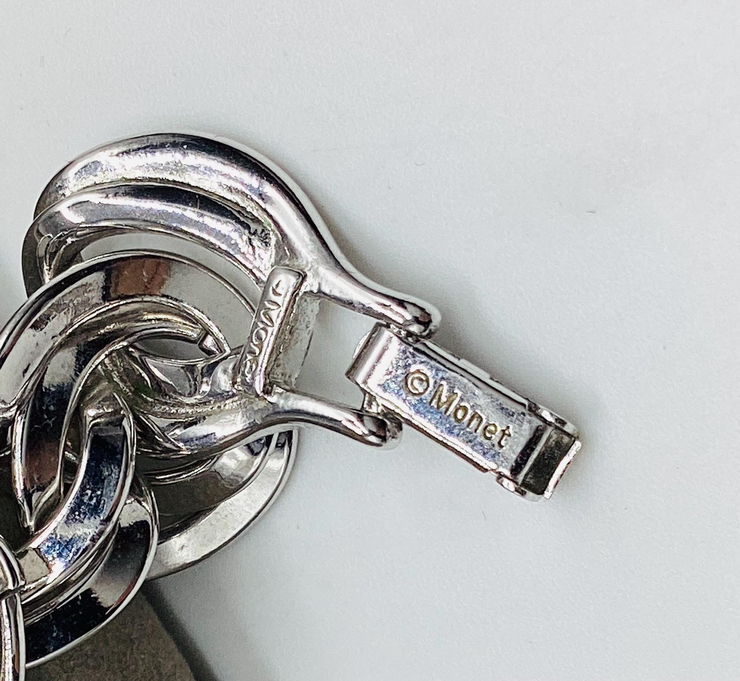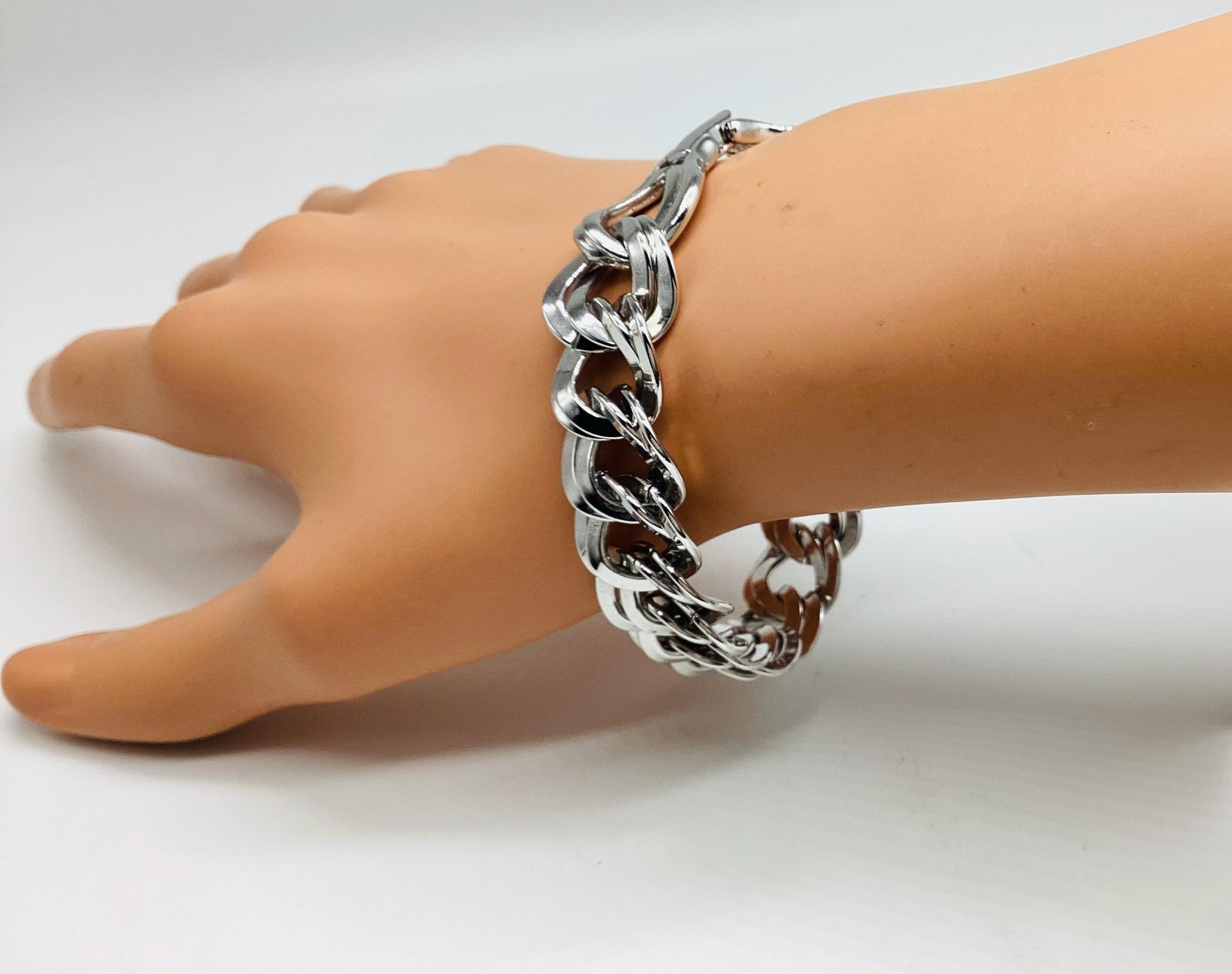 A super signed Monet chunky double chain bracelet. Shiny silver tone metal. Great worn alone or layered with other bead, bangles and chains. The history of Monet jewellery began in 1927, when Russian-Jewish immigrants Michael and Joseph Chernow founded their own company in Providence Rhode Island. They named the company Monocraft Products Co. Under this name the Chernow brothers worked for ten years, although they created the first jewellery in 1929. Initially, the company’s craftsmen made gilded monograms and ornaments for handbags. Jewellery from the Chernov brothers branded «Monet» first appeared in 1937. Considered classics today, Monet occupies a prominent position among the world’s most illustrious fashion houses.