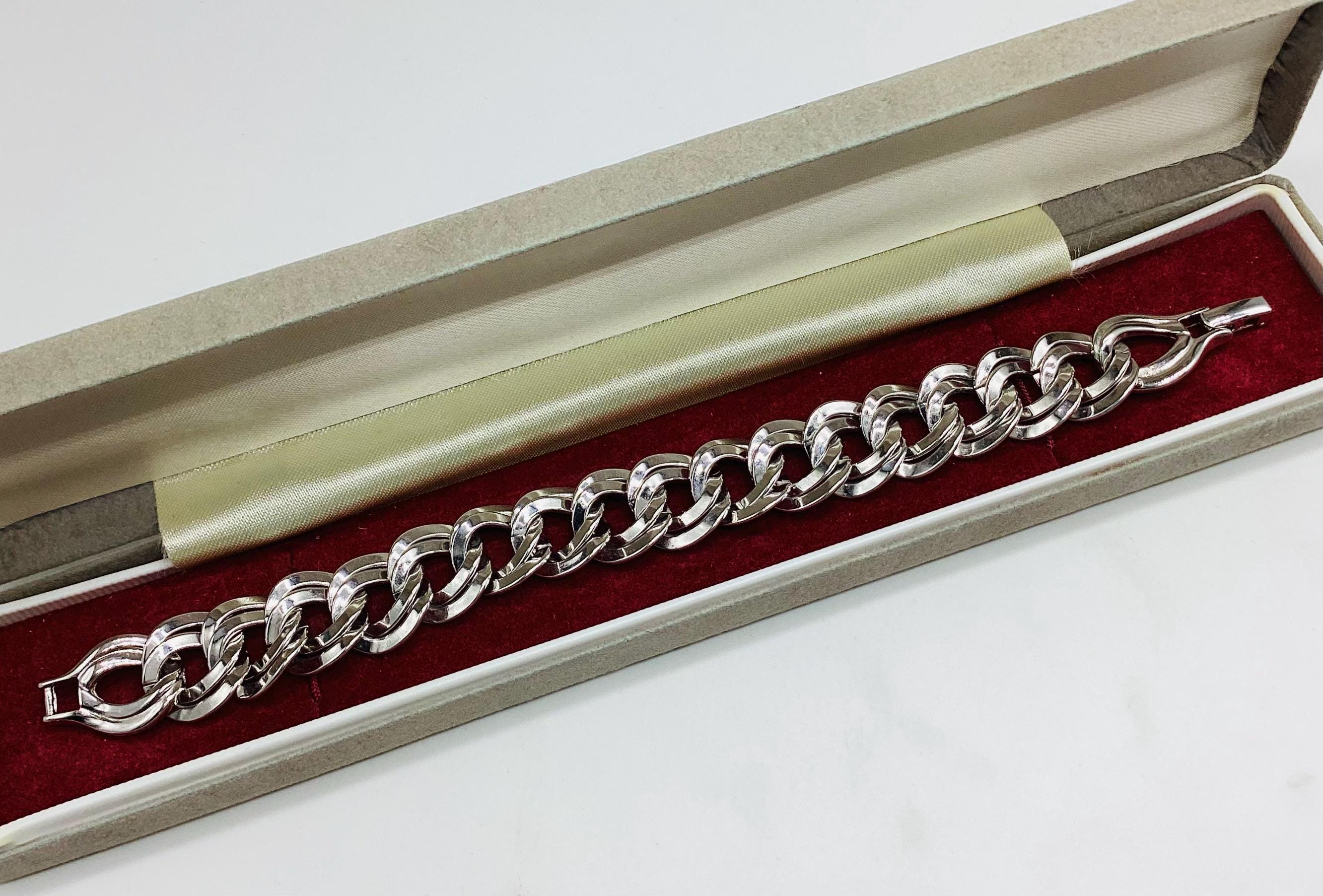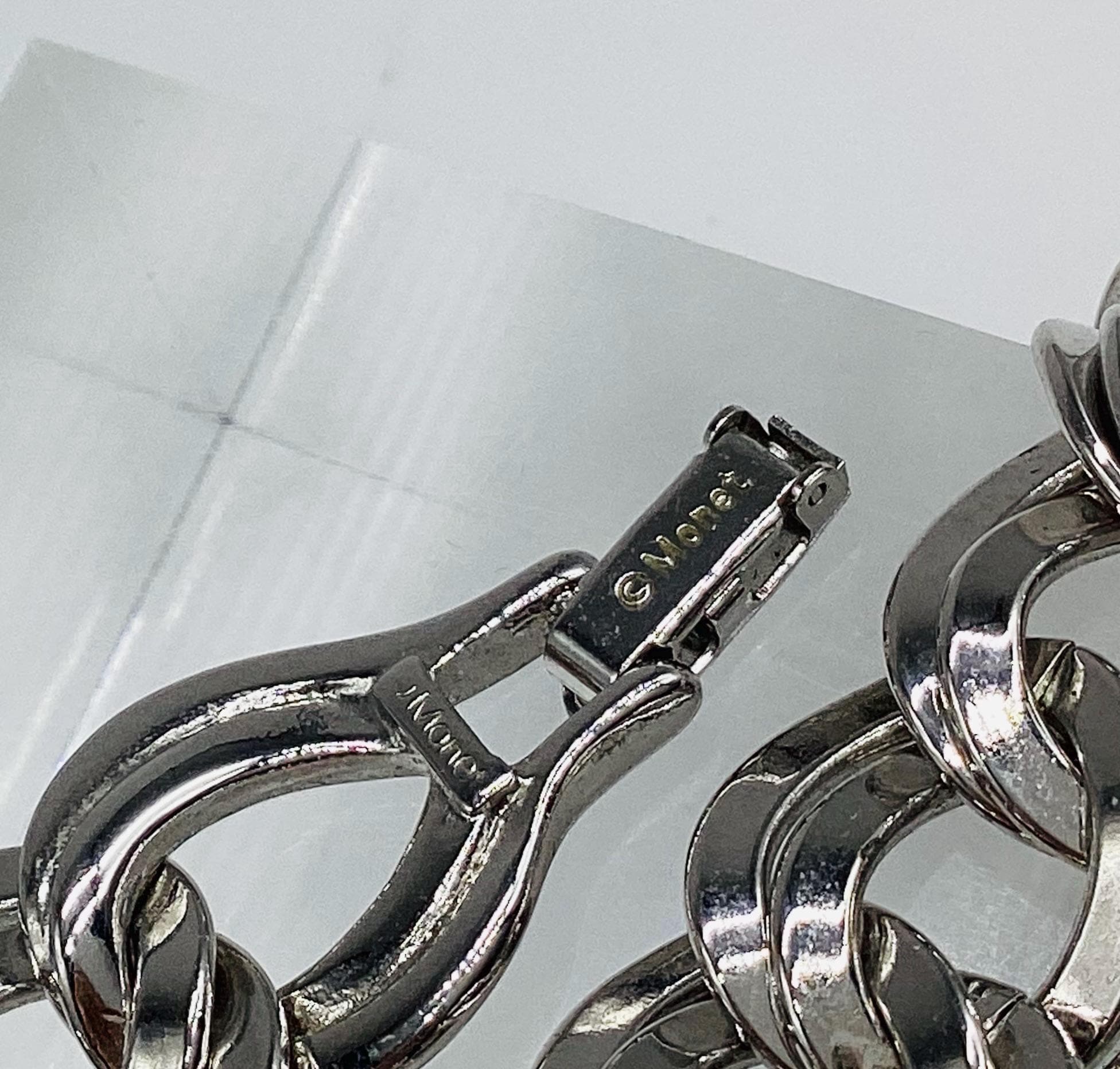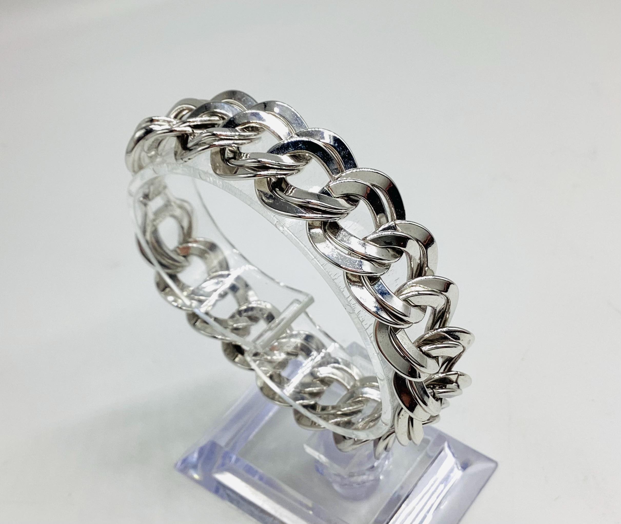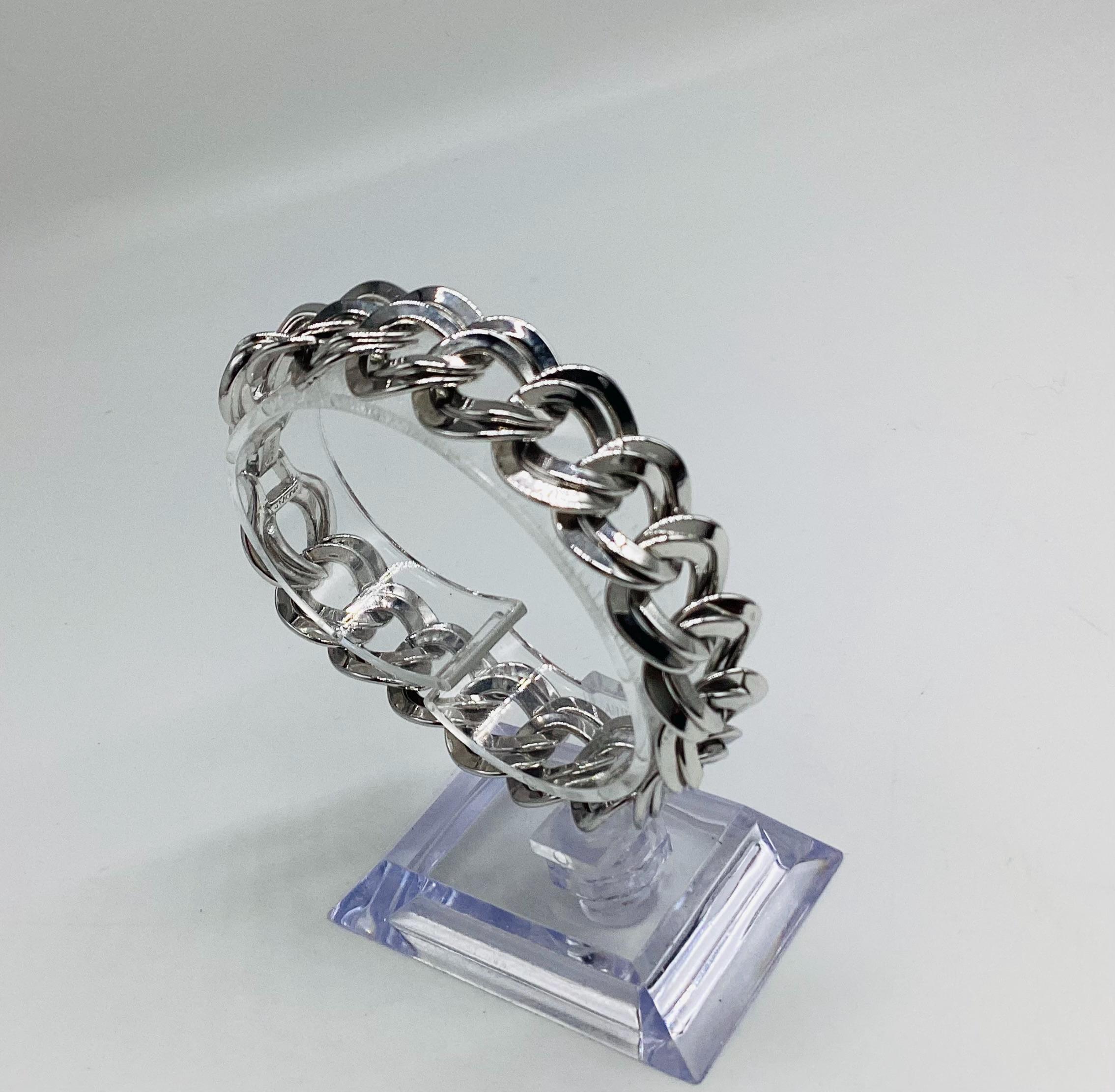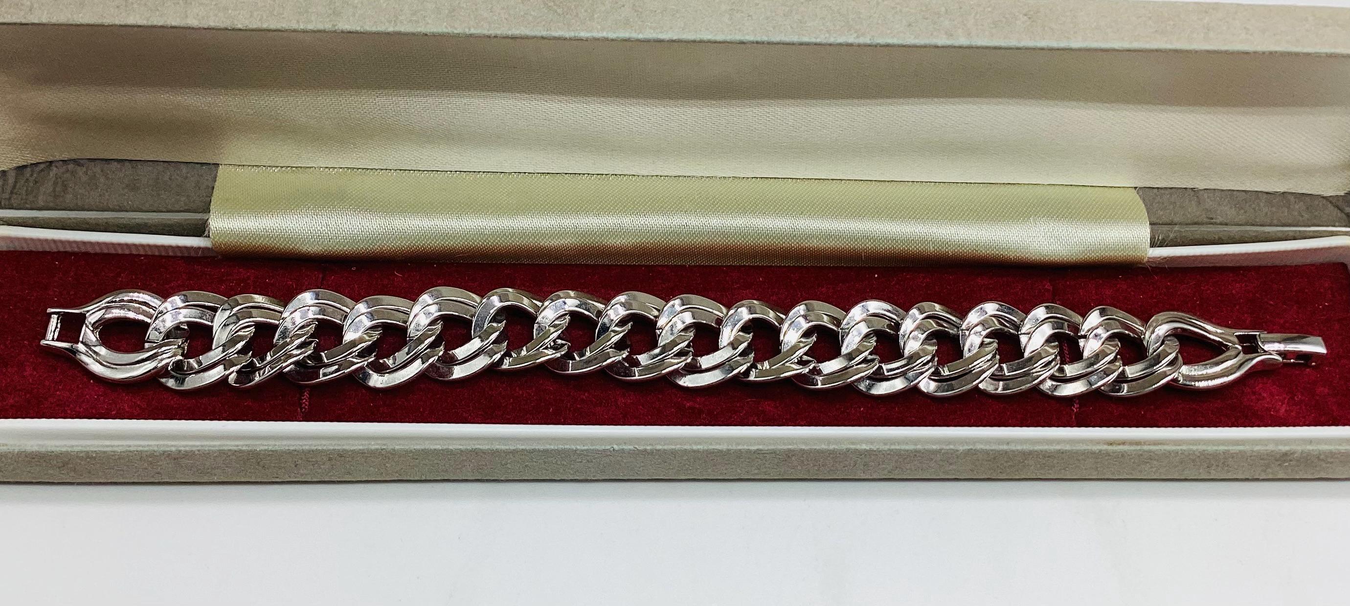 A super signed Monet chunky double chain bracelet. Shiny silver tone metal. Great worn alone or layered with other bead, bangles and chains. The history of Monet jewellery began in 1927, when Russian-Jewish immigrants Michael and Joseph Chernow founded their own company in Providence Rhode Island. They named the company Monocraft Products Co. Under this name the Chernow brothers worked for ten years, although they created the first jewellery in 1929. Initially, the company’s craftsmen made gilded monograms and ornaments for handbags. Jewellery from the Chernov brothers branded «Monet» first appeared in 1937. Considered classics today, Monet occupies a prominent position among the world’s most illustrious fashion houses.