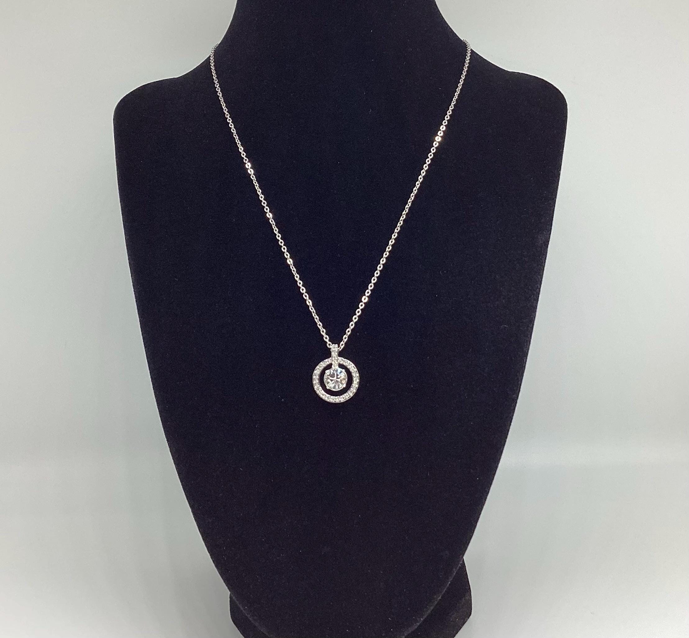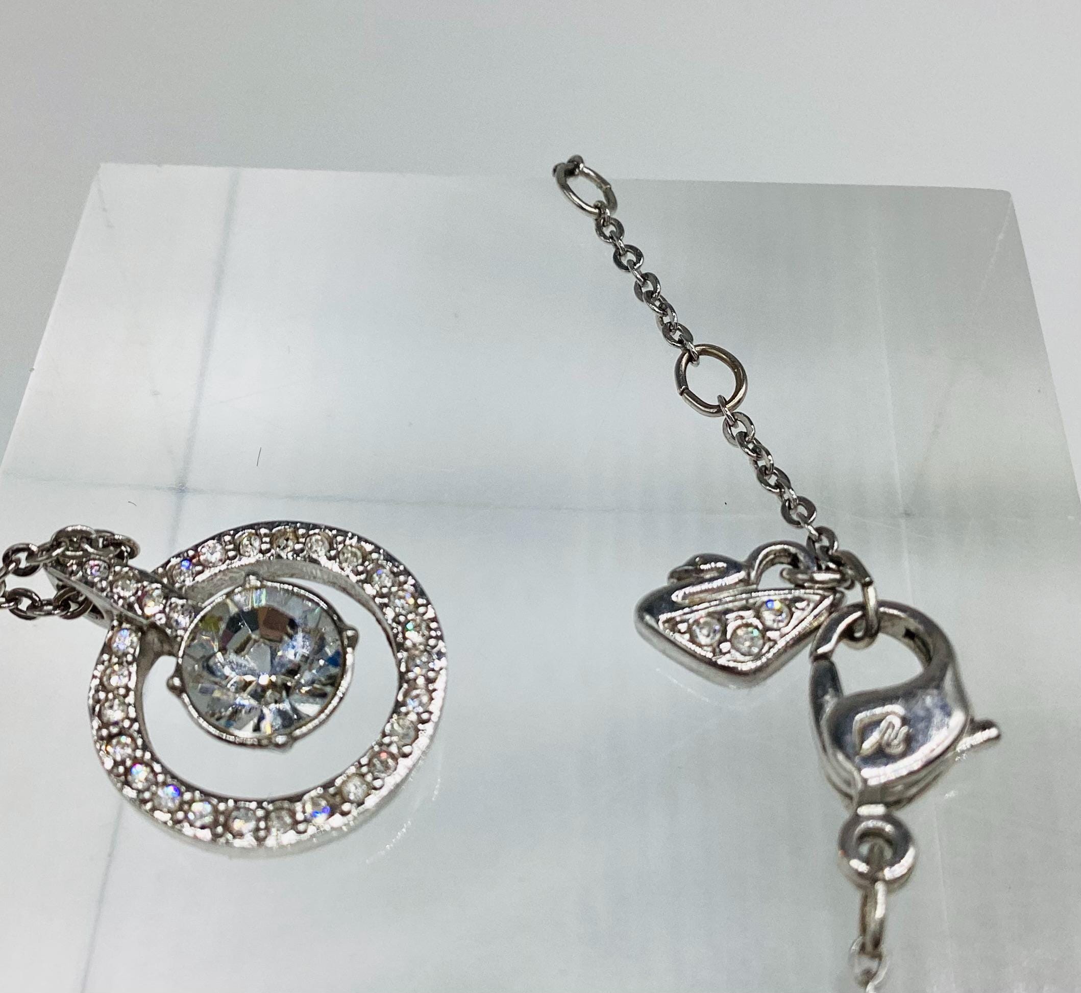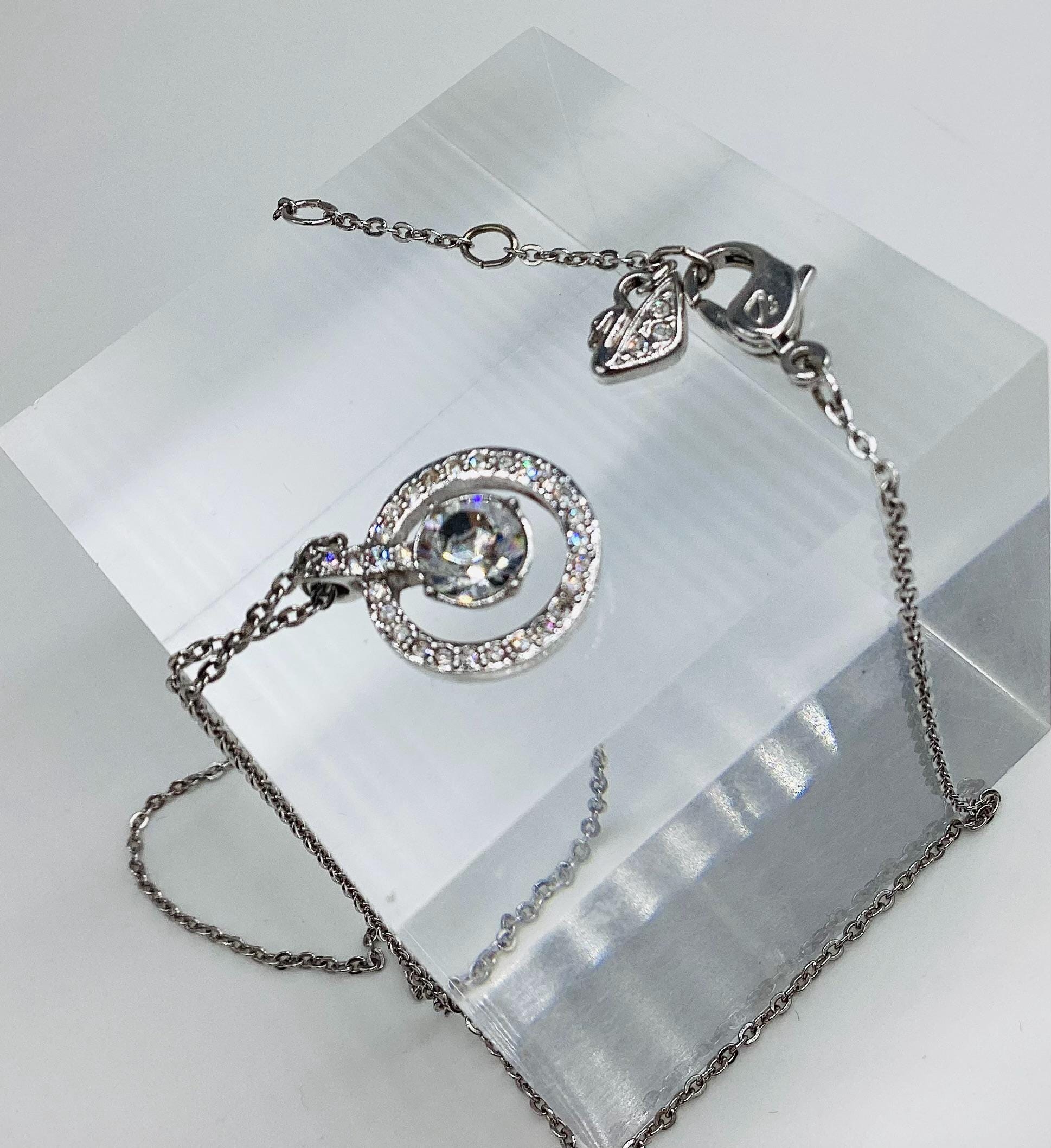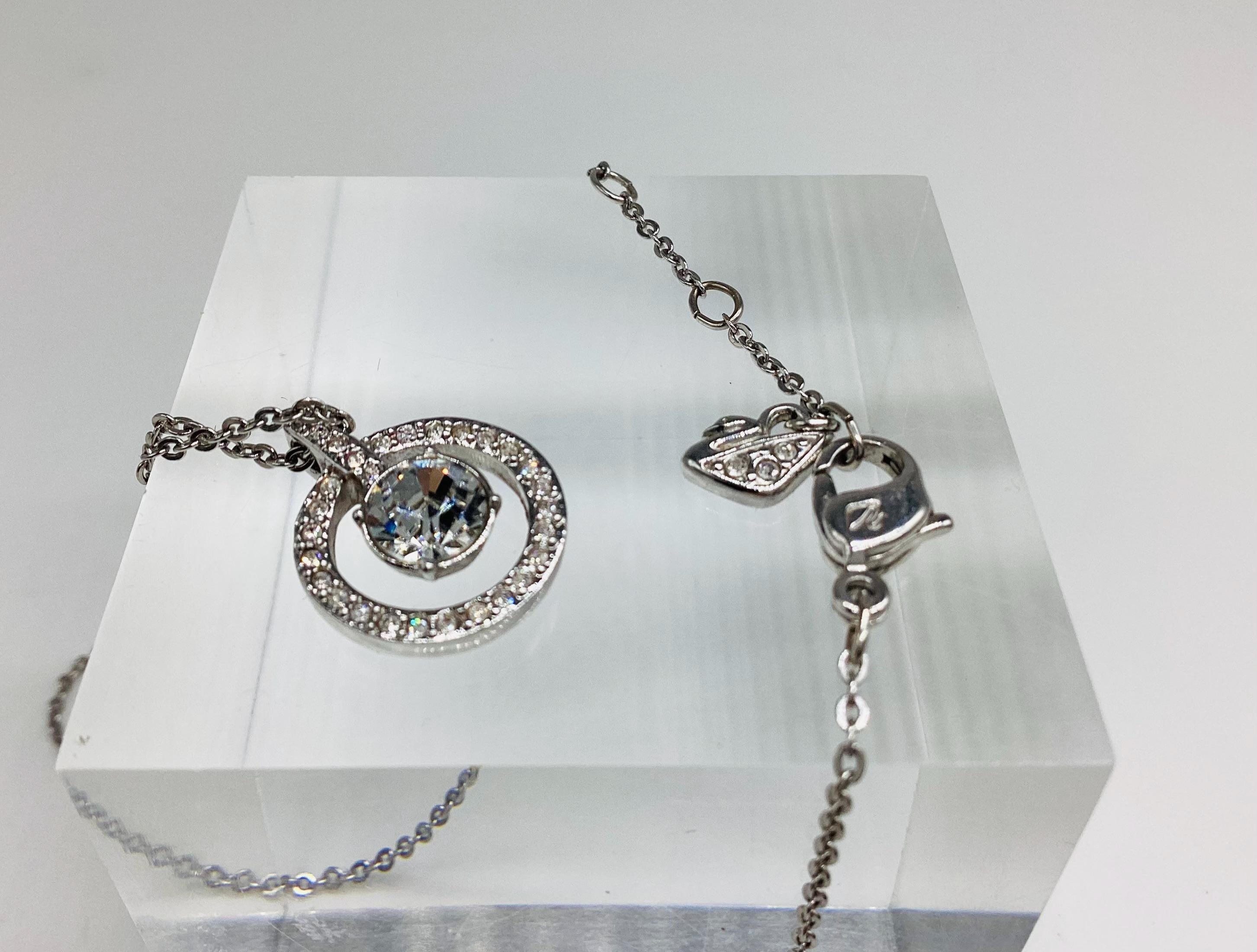 A beautifully sophisticated pendant featuring a stunning large Swarovski jewel framed by a halo of smaller shimmering crystals. This is strung on a signed chain of adjustable length. Signed by the Swarovski swan.