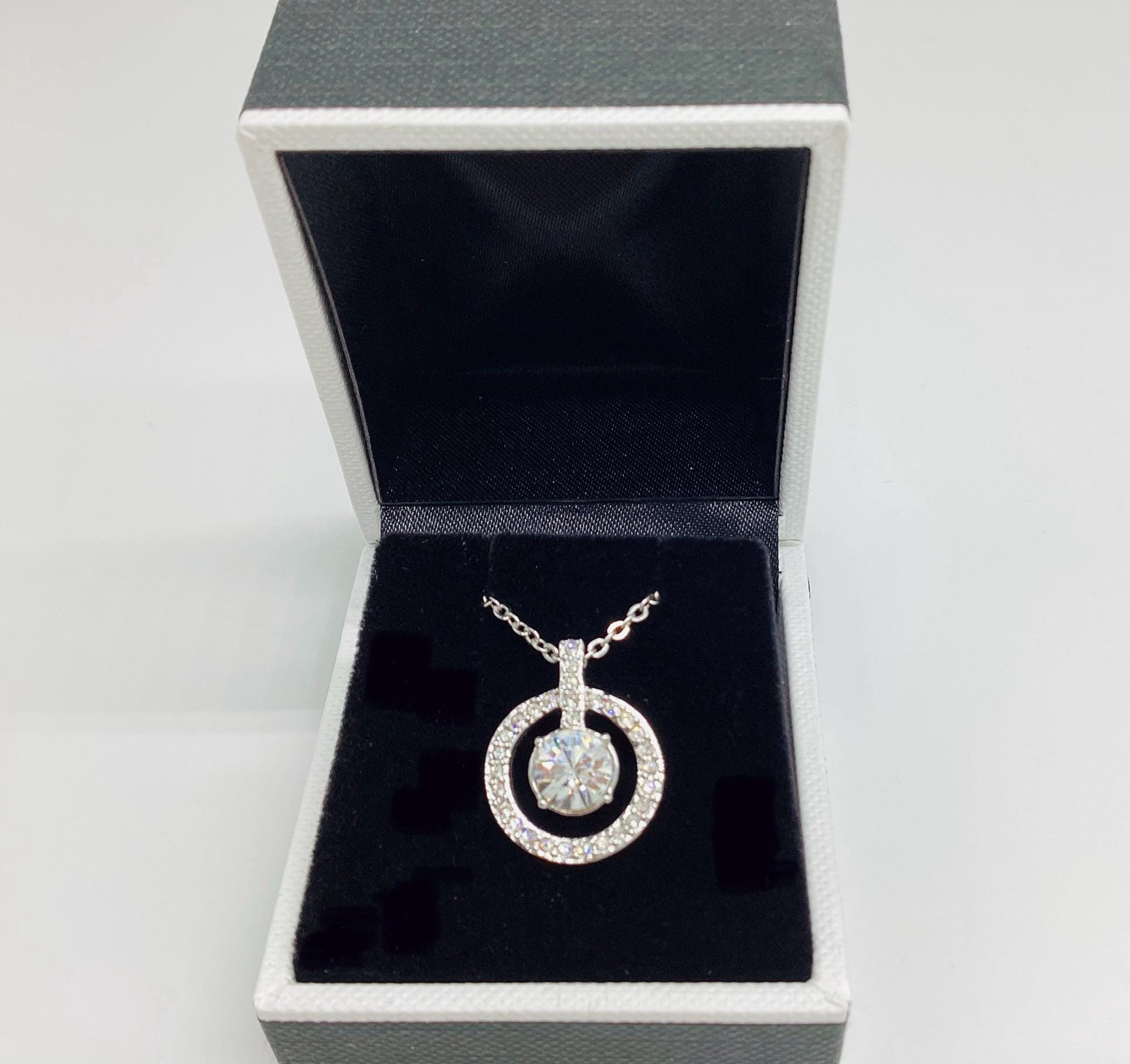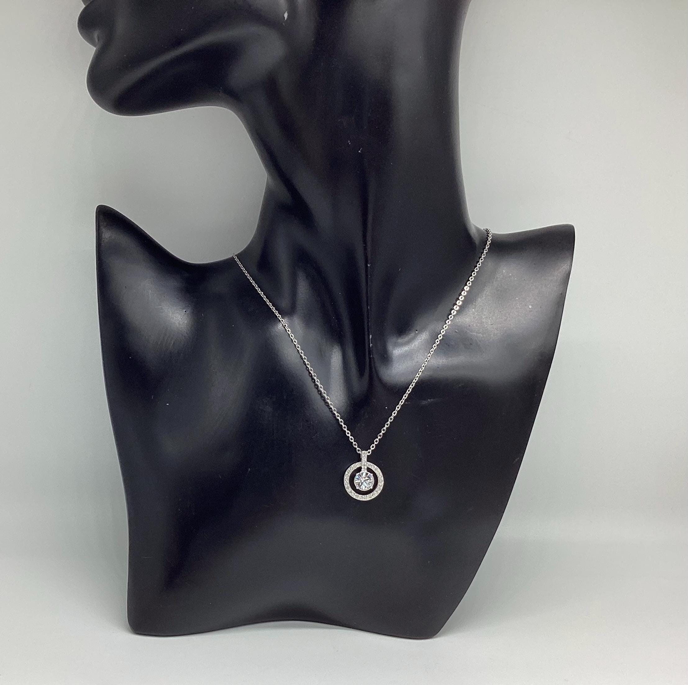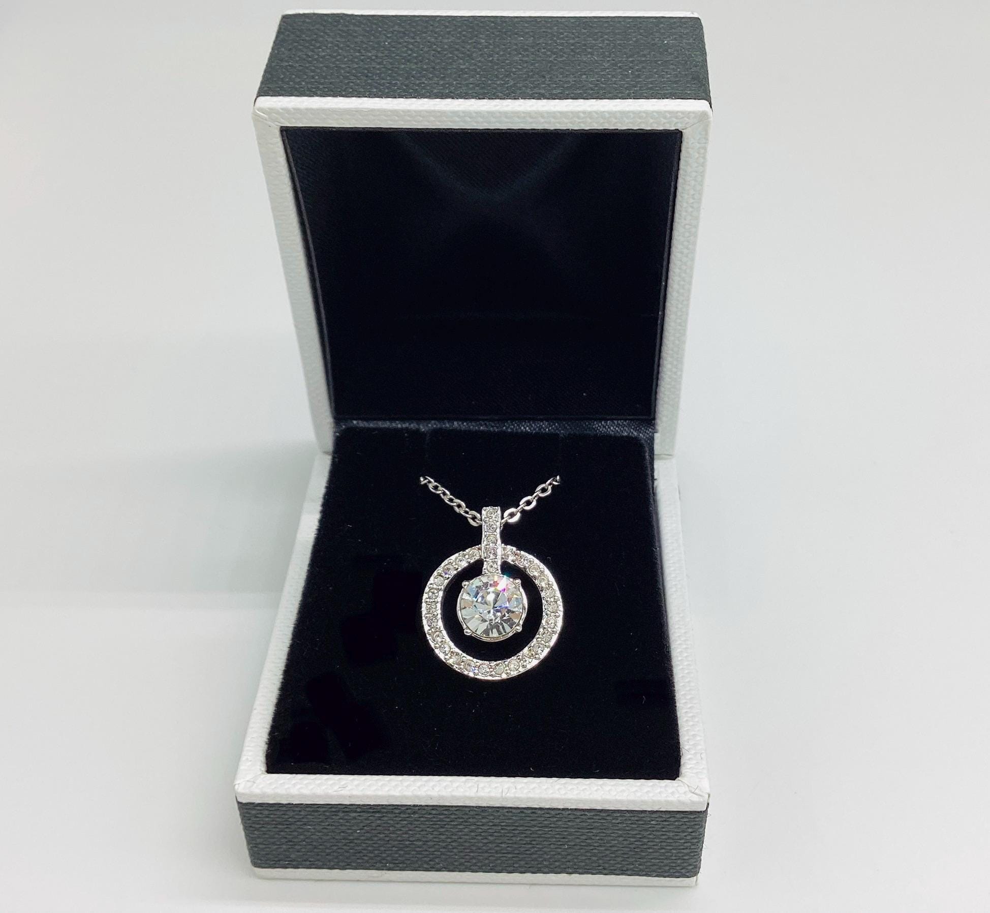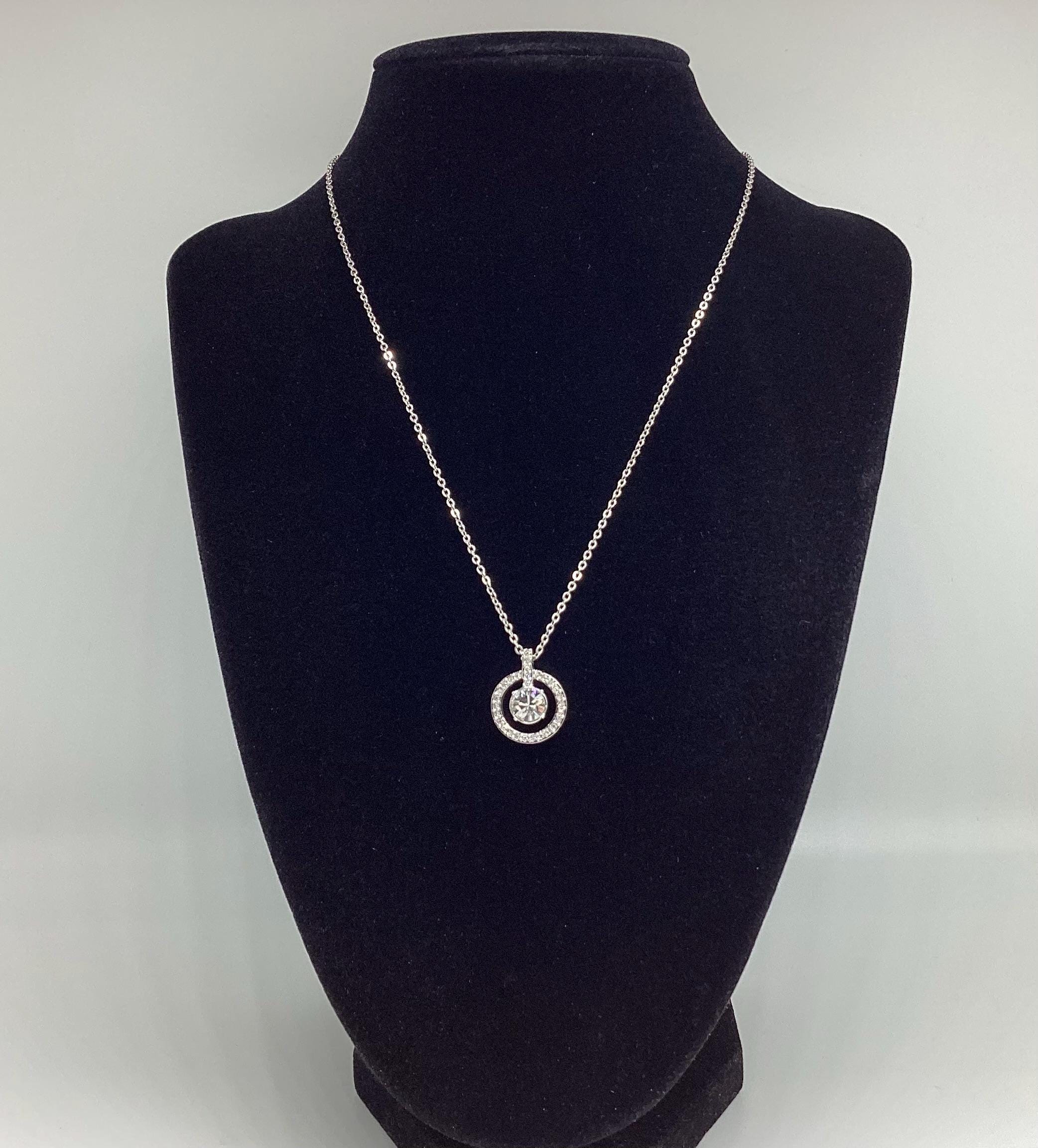 A beautifully sophisticated pendant featuring a stunning large Swarovski jewel framed by a halo of smaller shimmering crystals. This is strung on a signed chain of adjustable length. Signed by the Swarovski swan.