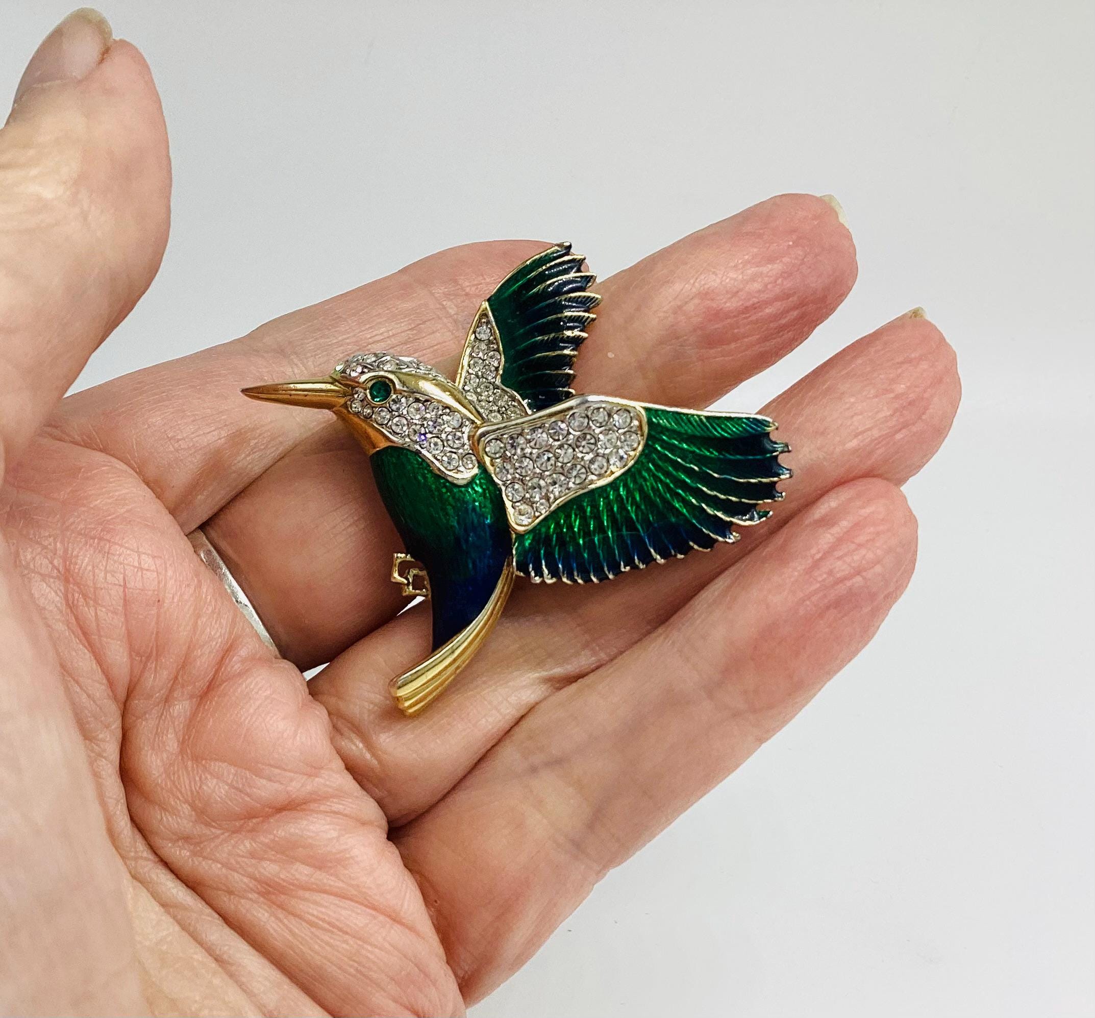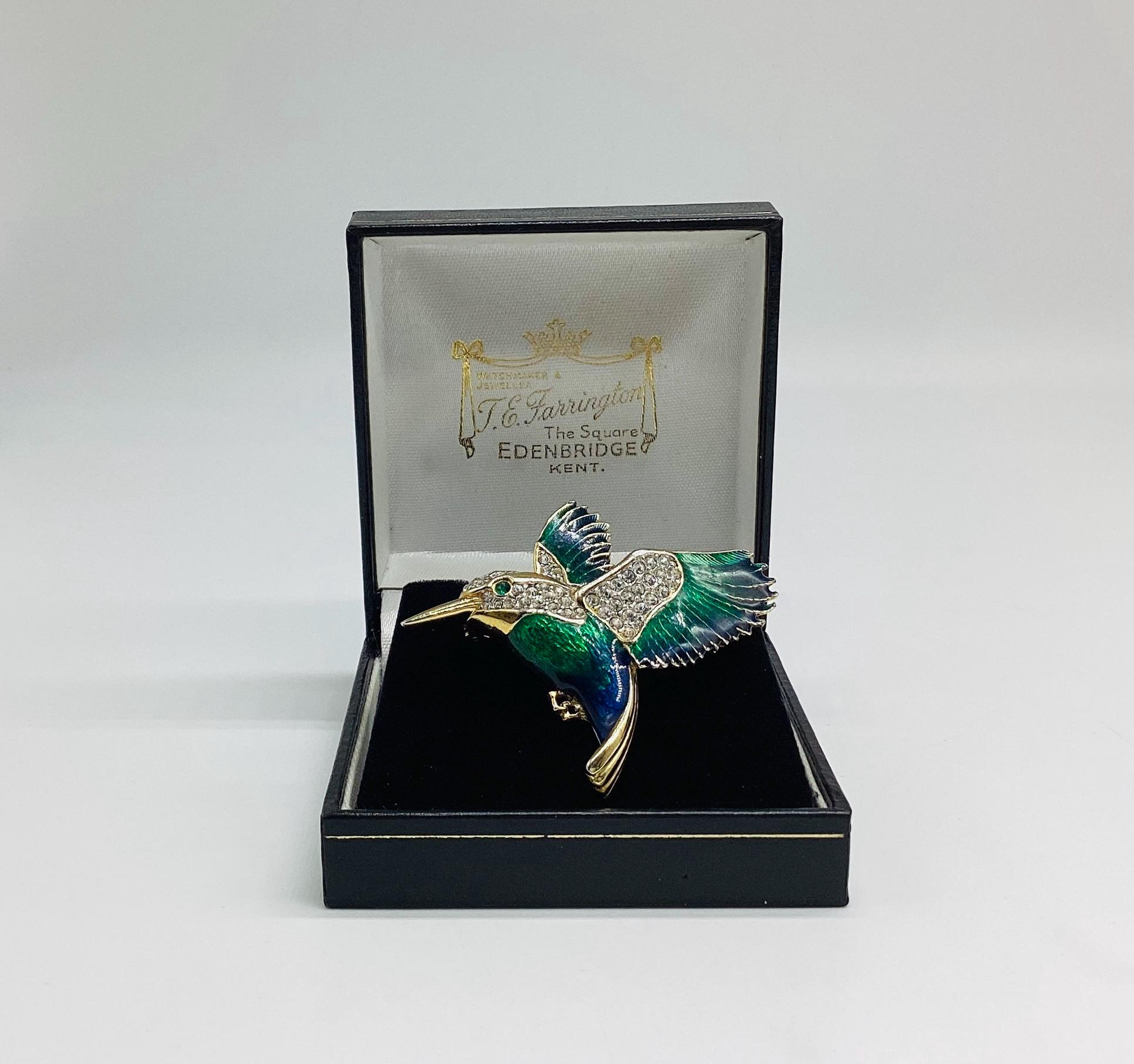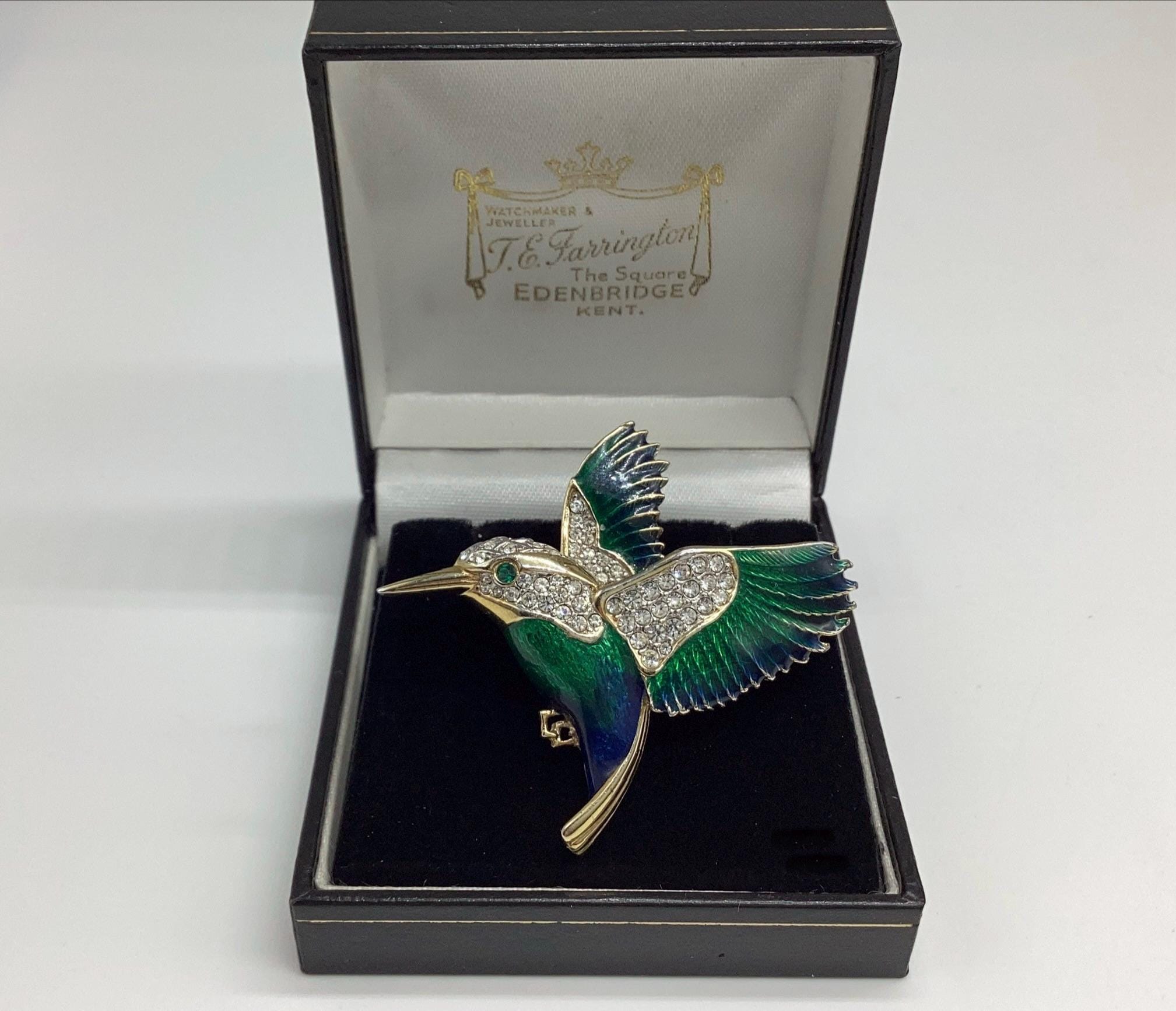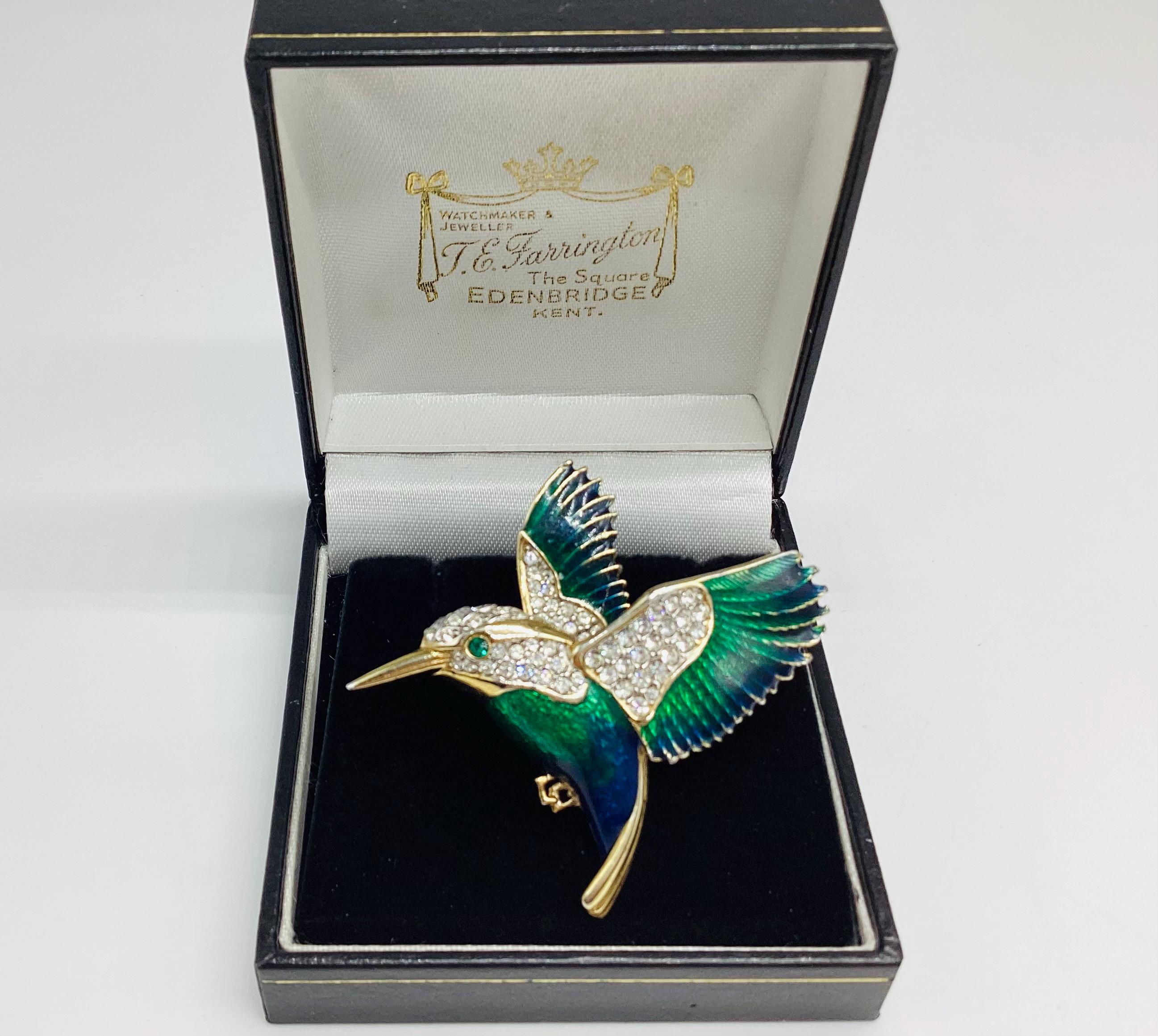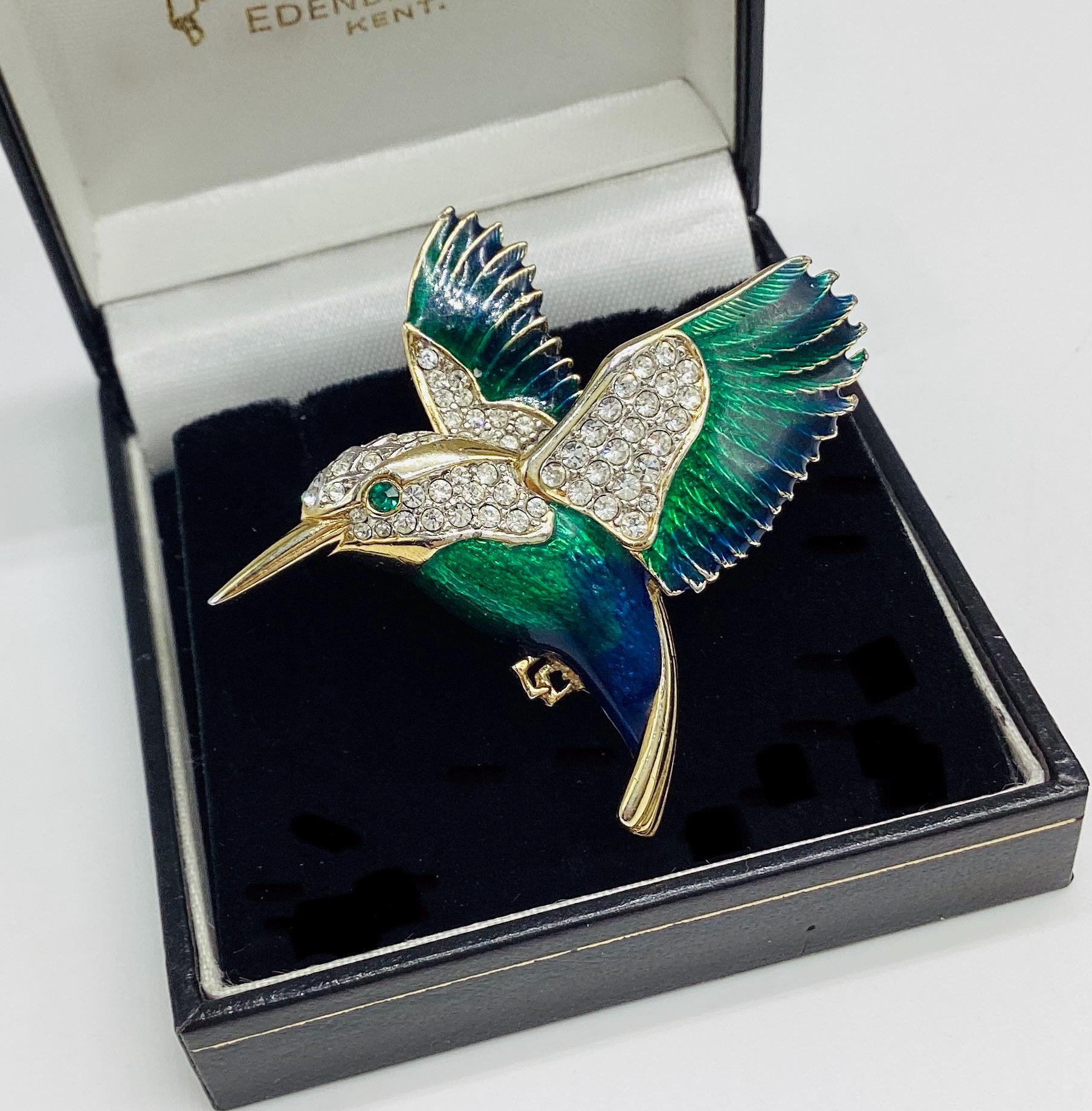 Fabulous Attwood and Sawyer brooch. The beautiful colours of the kingfisher suit the stunning jewel like colours of blue and green of enamel and crystal. A rare and very popular piece of Attwood and Sawyer jewellery. I have a particular love for this maker, well known for the superb quality and attention to detail. Founded in Wales in 1956 by Horace Atwood, Atwood and Sawyer produced copies of precious ornaments from the 18th to 19th centuries. Many pieces were made for the television series “Dallas” and “Dynasty”, as well as exclusive compositions for the beauty contest “Miss World”. The firm produced high-end imitation jewellery and sold their decorations at prestigious retail outlets across the UK, Europe and other countries around the world, as well as on cruise ships and Airliners.