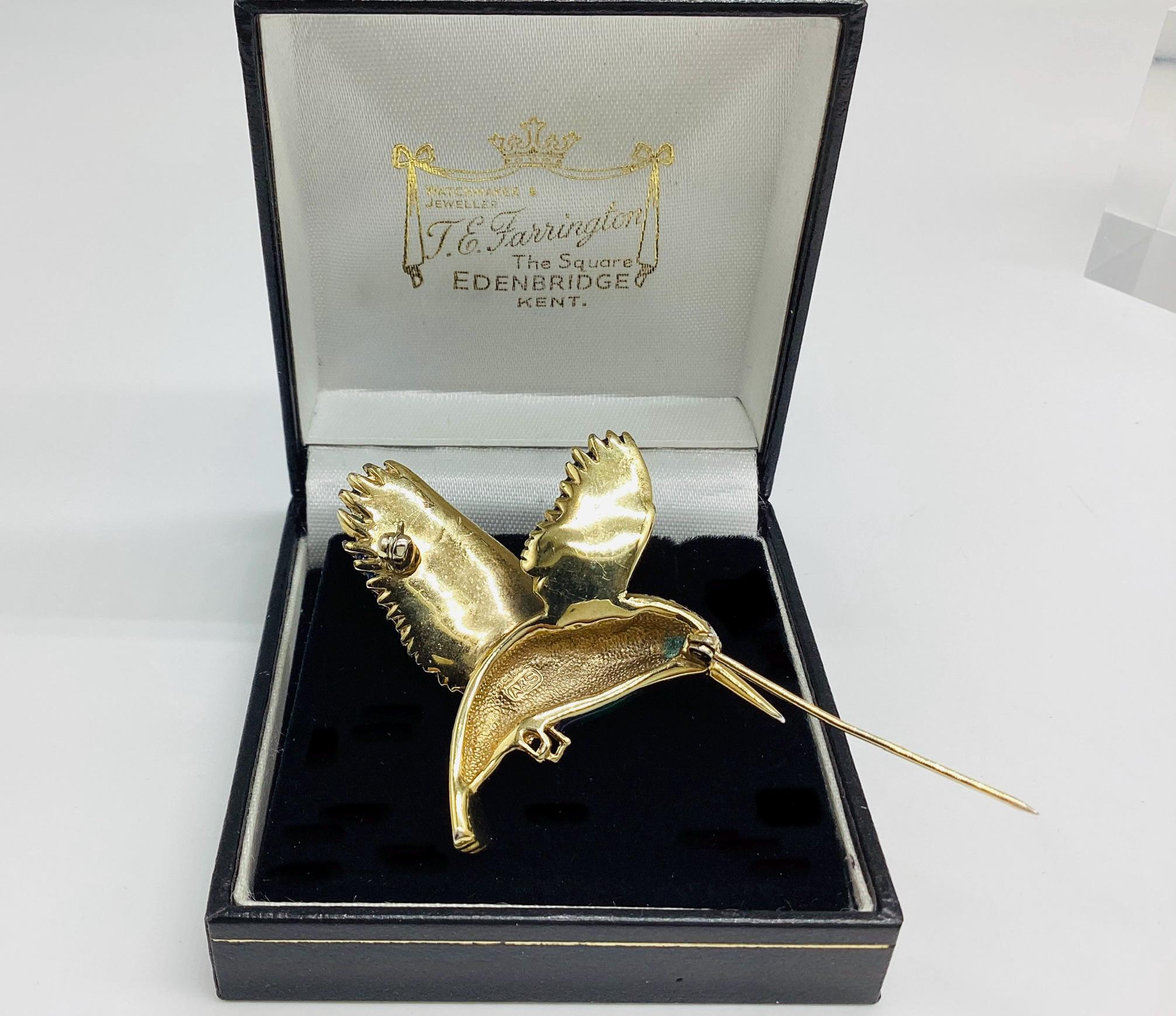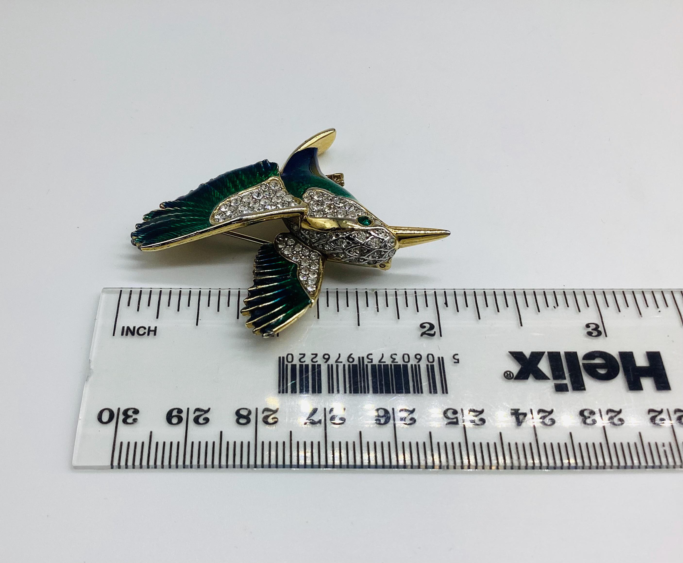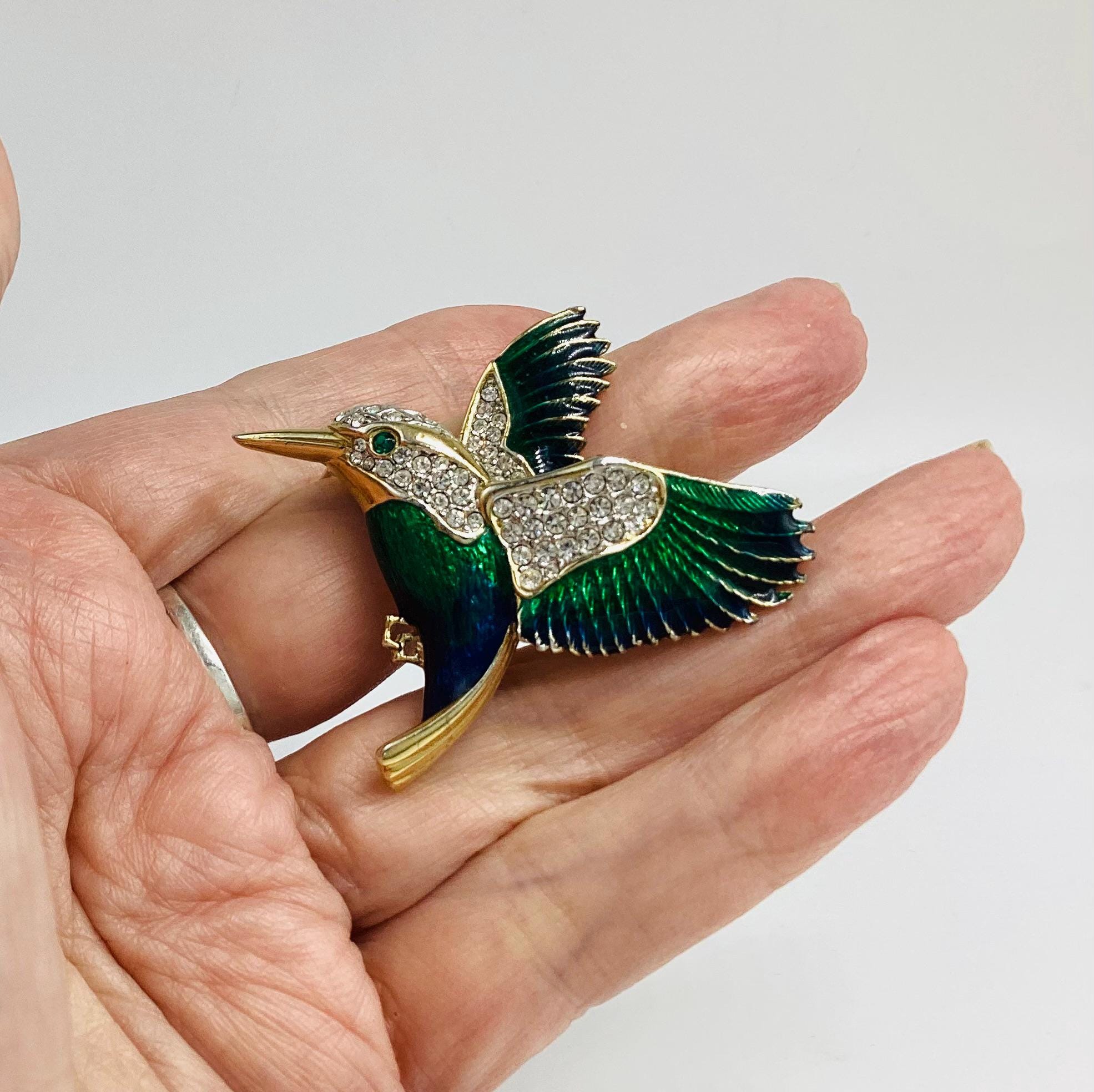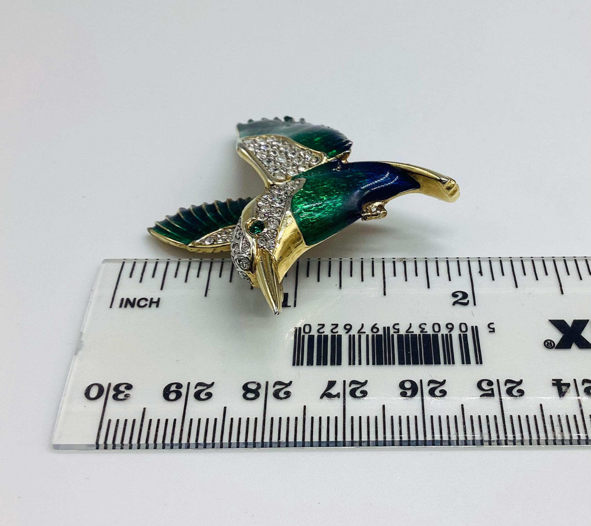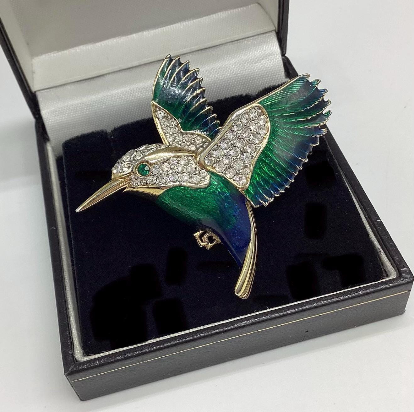 Fabulous Attwood and Sawyer brooch. The beautiful colours of the kingfisher suit the stunning jewel like colours of blue and green of enamel and crystal. A rare and very popular piece of Attwood and Sawyer jewellery. I have a particular love for this maker, well known for the superb quality and attention to detail. Founded in Wales in 1956 by Horace Atwood, Atwood and Sawyer produced copies of precious ornaments from the 18th to 19th centuries. Many pieces were made for the television series “Dallas” and “Dynasty”, as well as exclusive compositions for the beauty contest “Miss World”. The firm produced high-end imitation jewellery and sold their decorations at prestigious retail outlets across the UK, Europe and other countries around the world, as well as on cruise ships and Airliners.