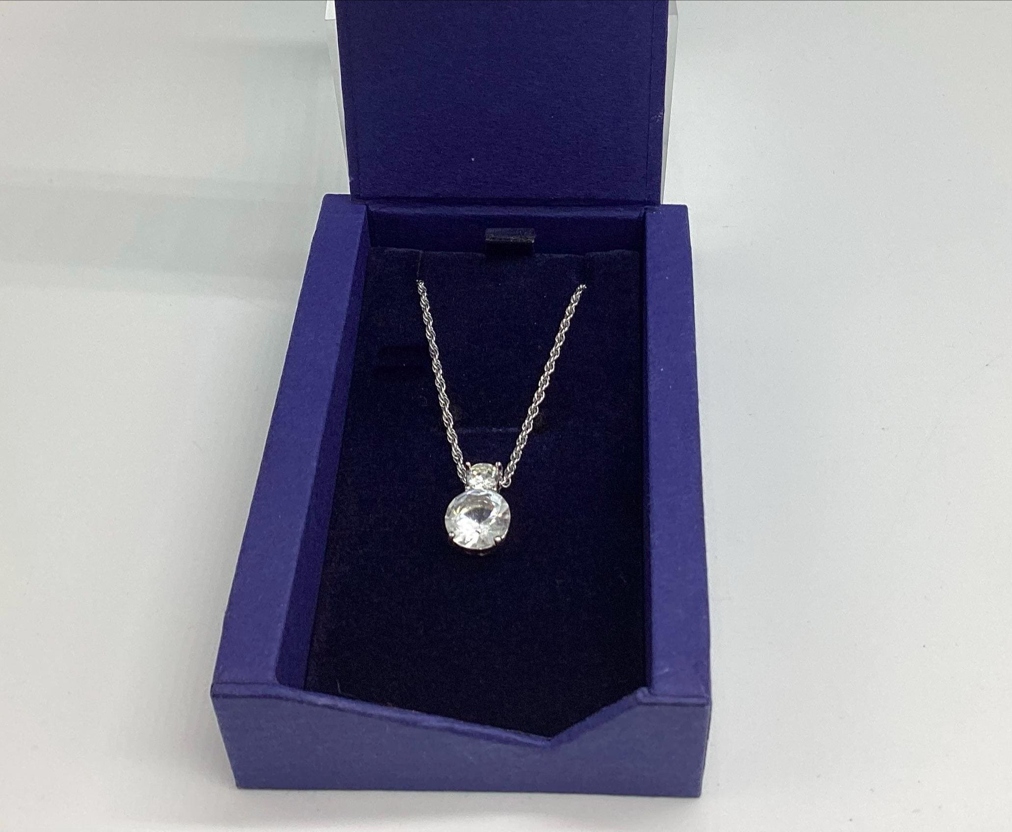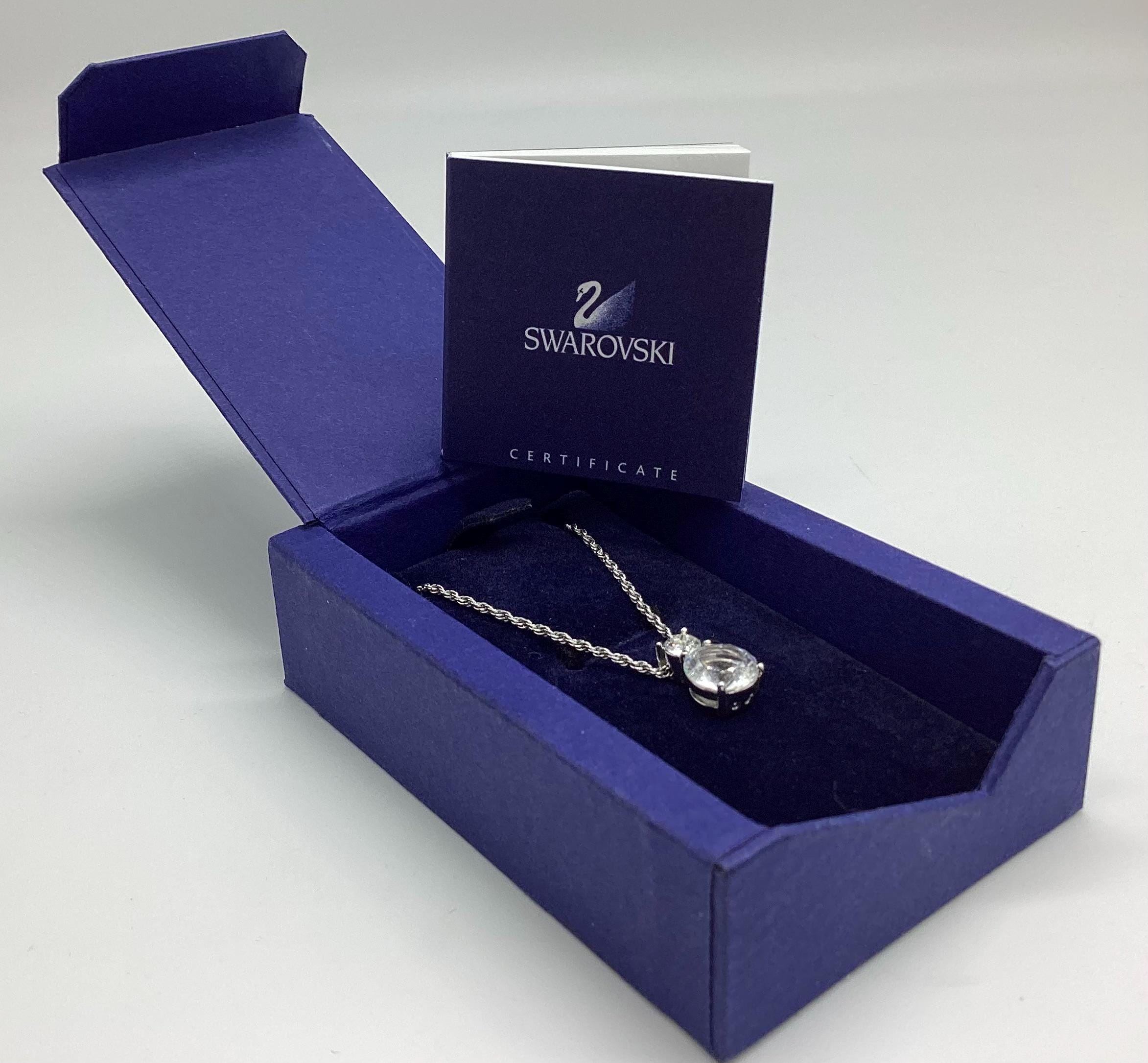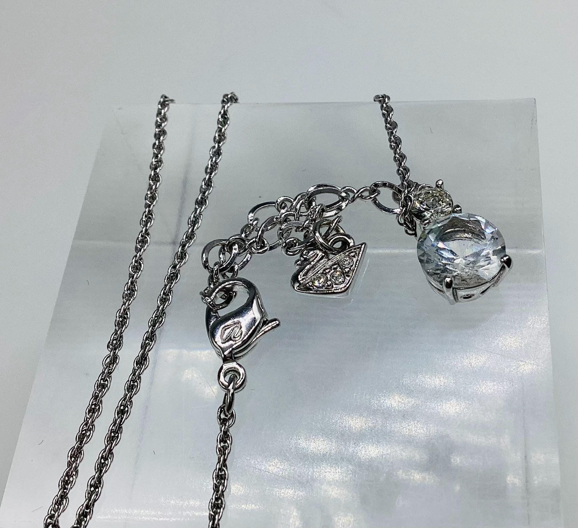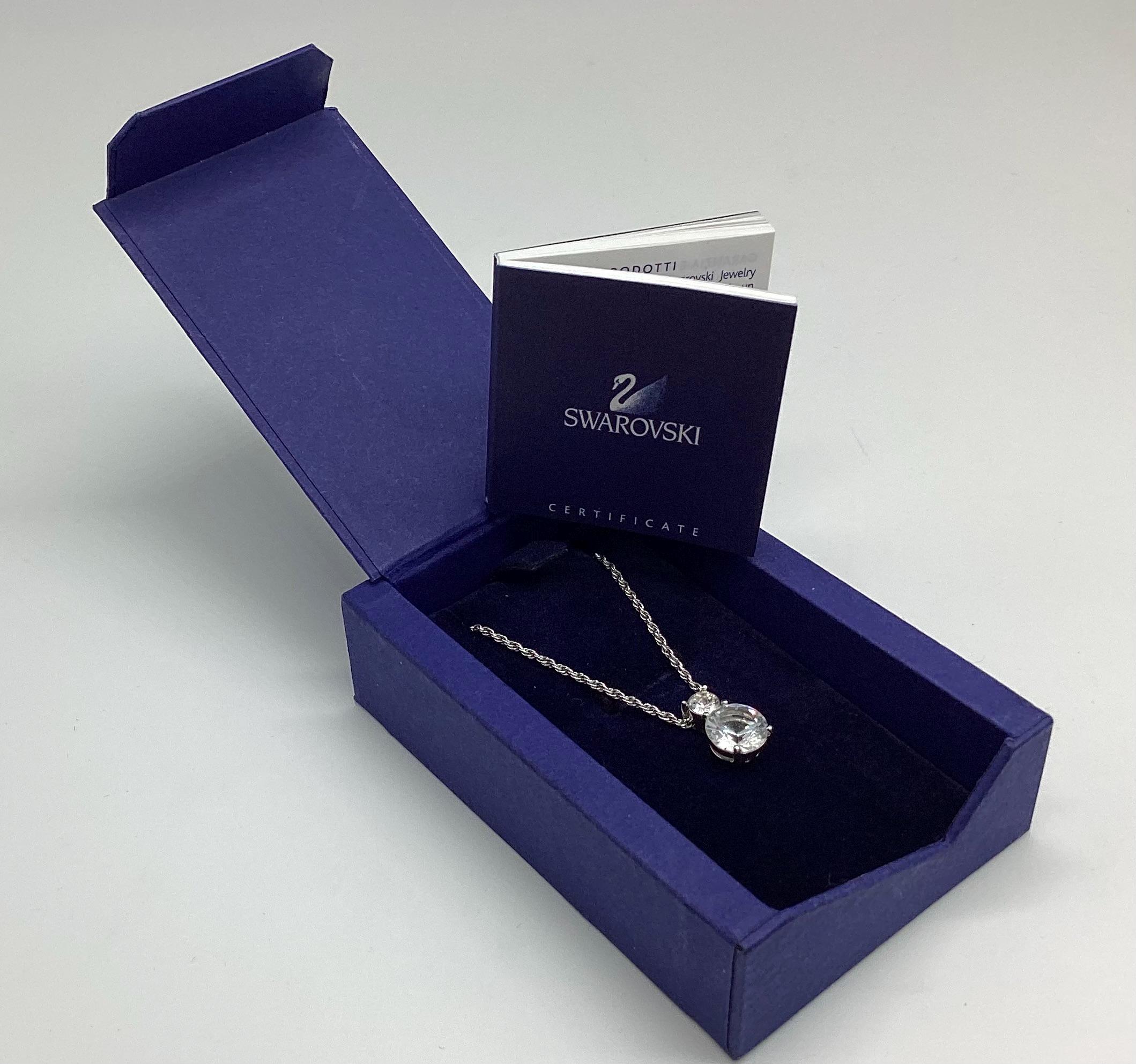 A beautifully sophisticated pendant featuring two stunning Swarovski jewels. This is strung on a signed chain of adjustable length. Signed by the Swarovski swan. Presented boxed and with the Swarovski booklet.