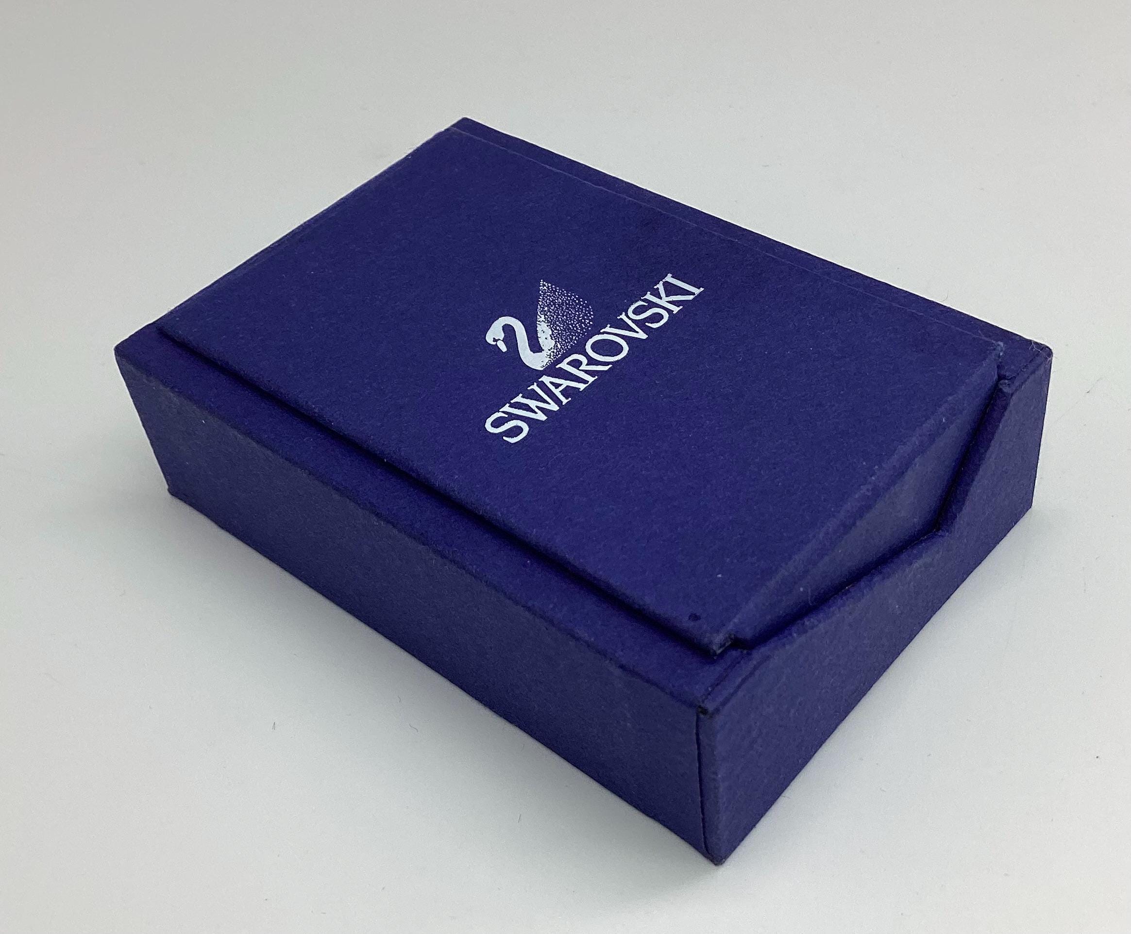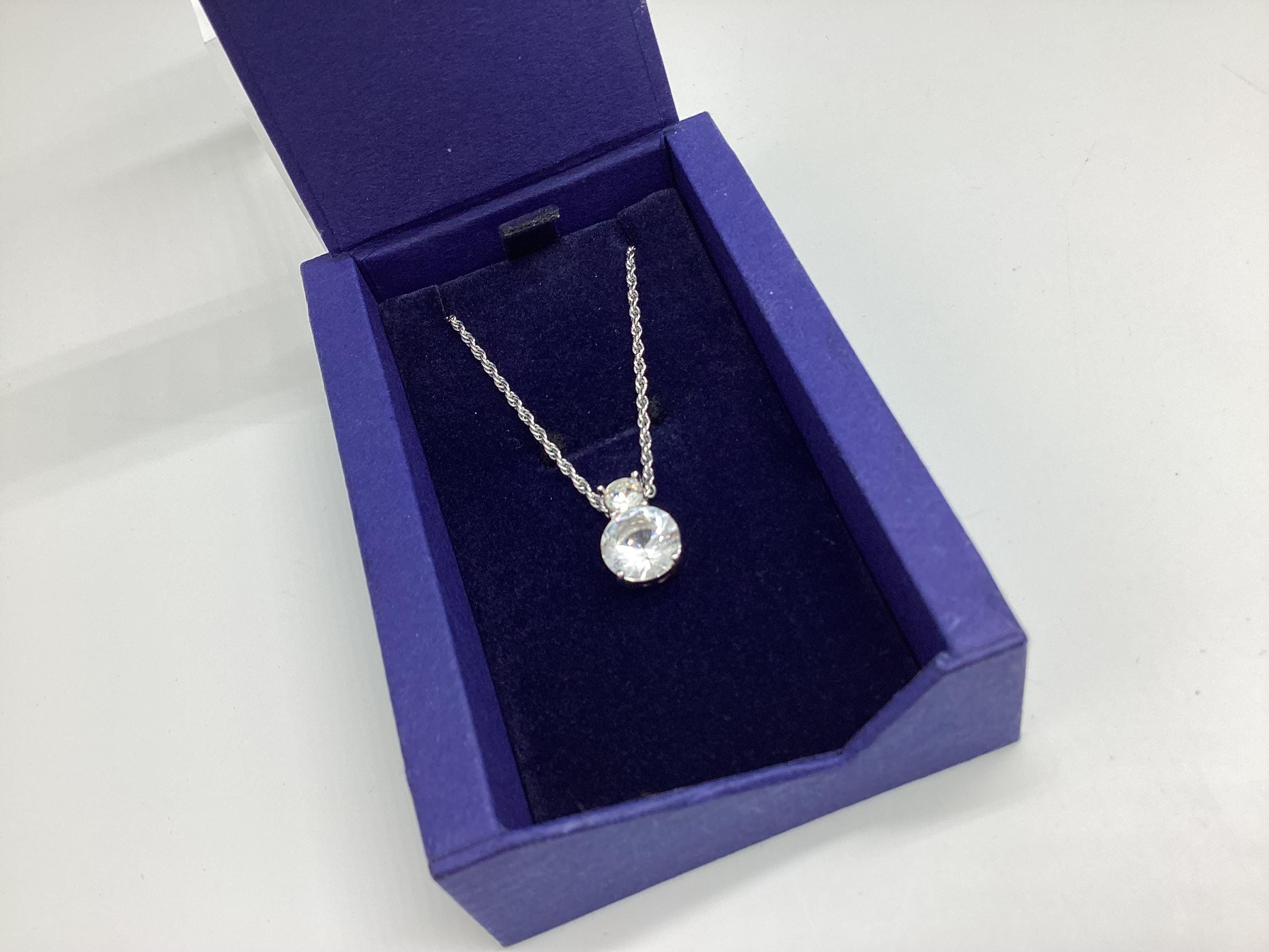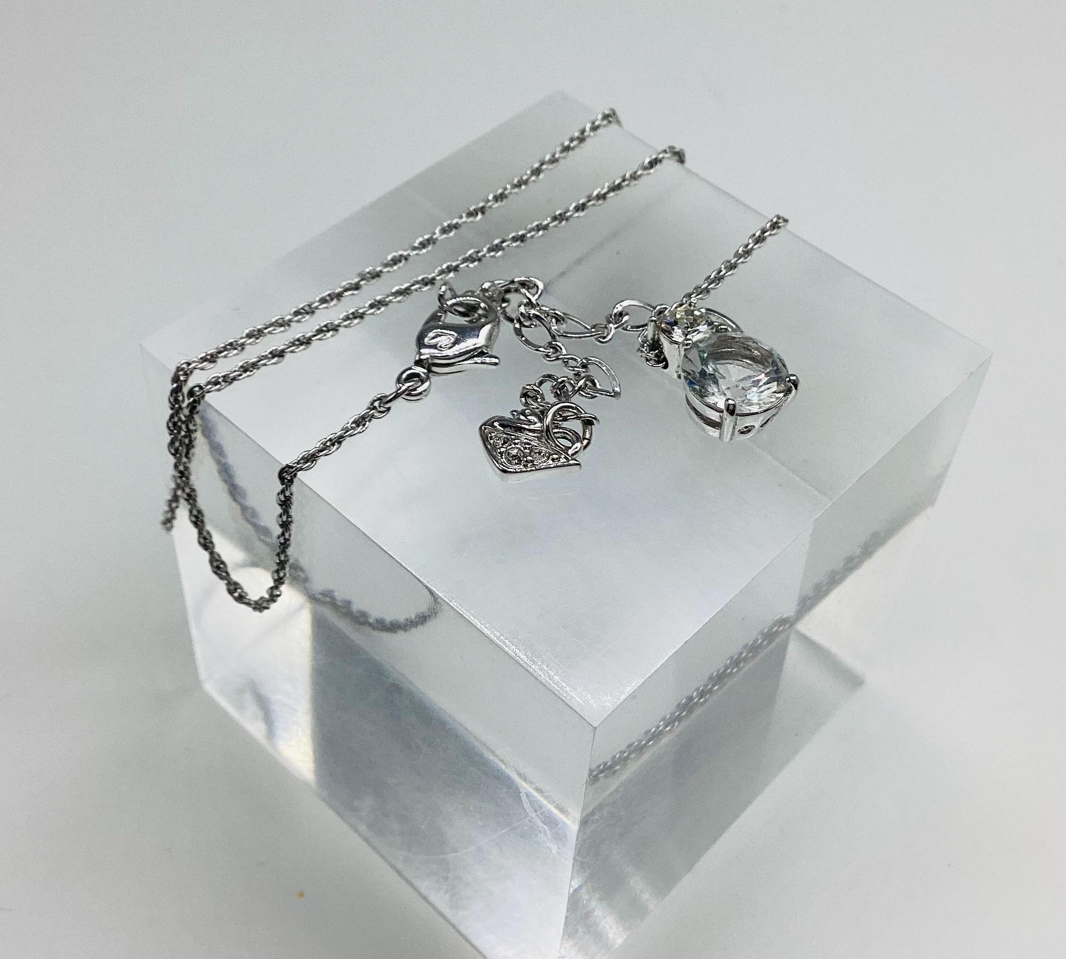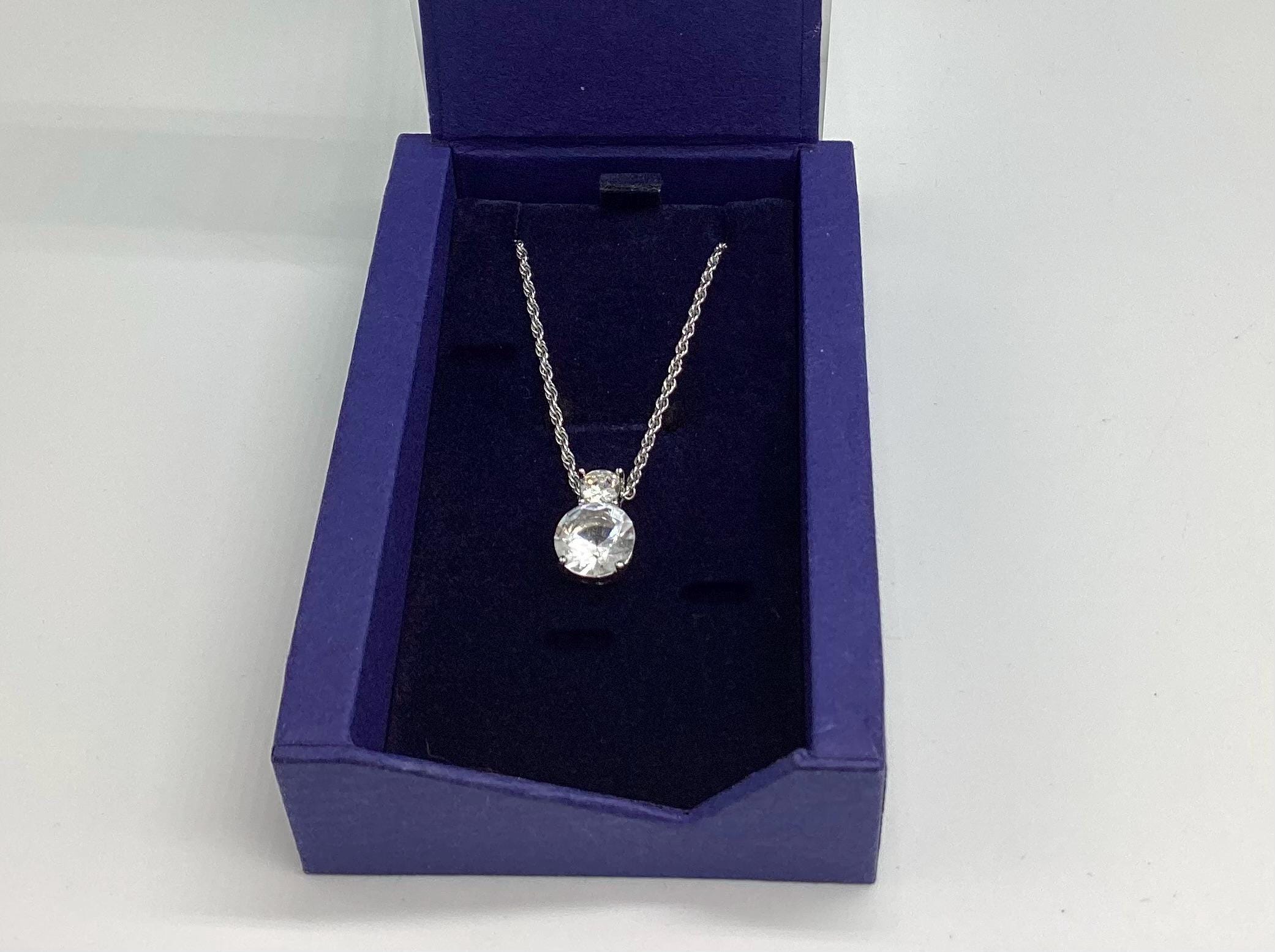 A beautifully sophisticated pendant featuring two stunning Swarovski jewels. This is strung on a signed chain of adjustable length. Signed by the Swarovski swan. Presented boxed and with the Swarovski booklet.