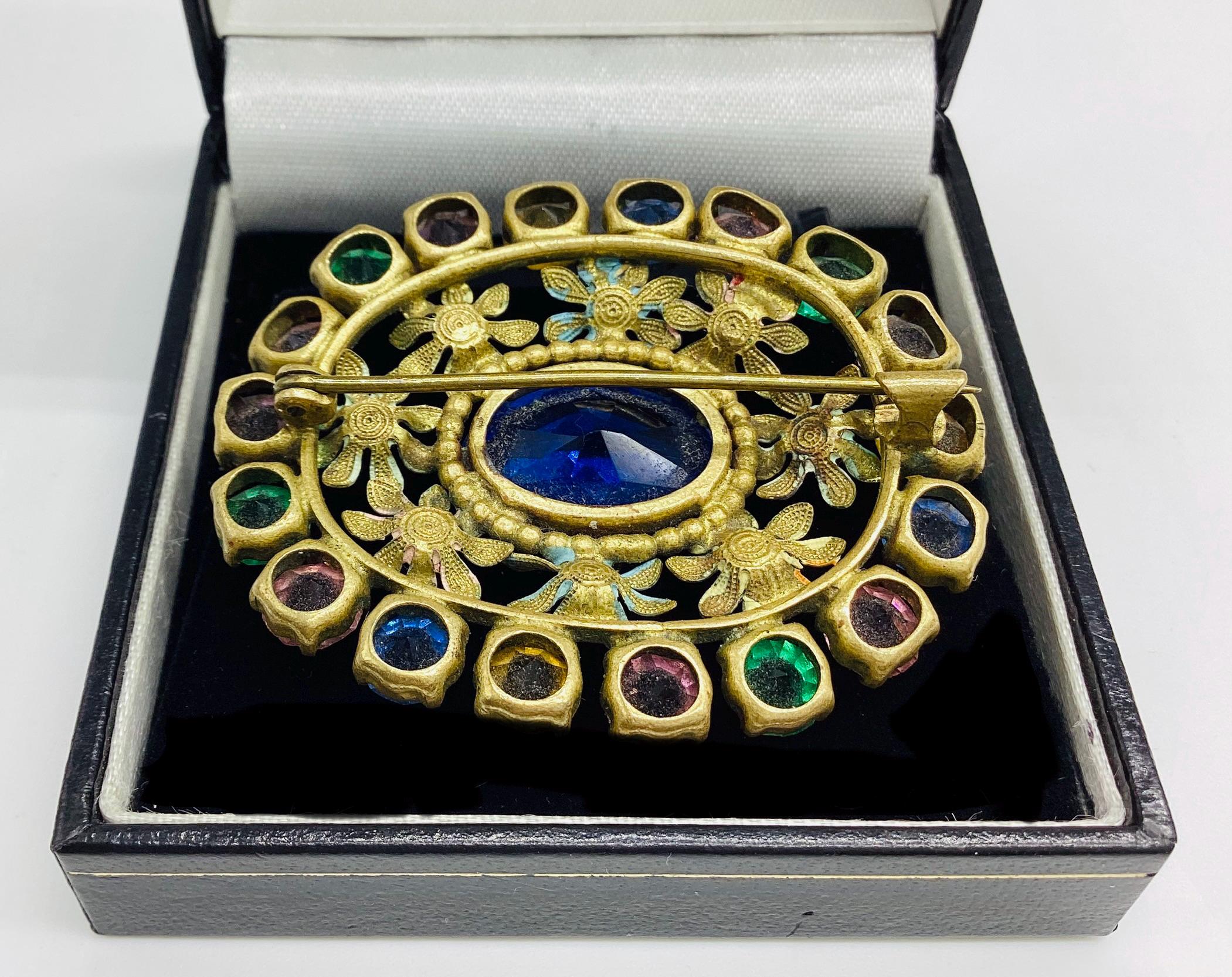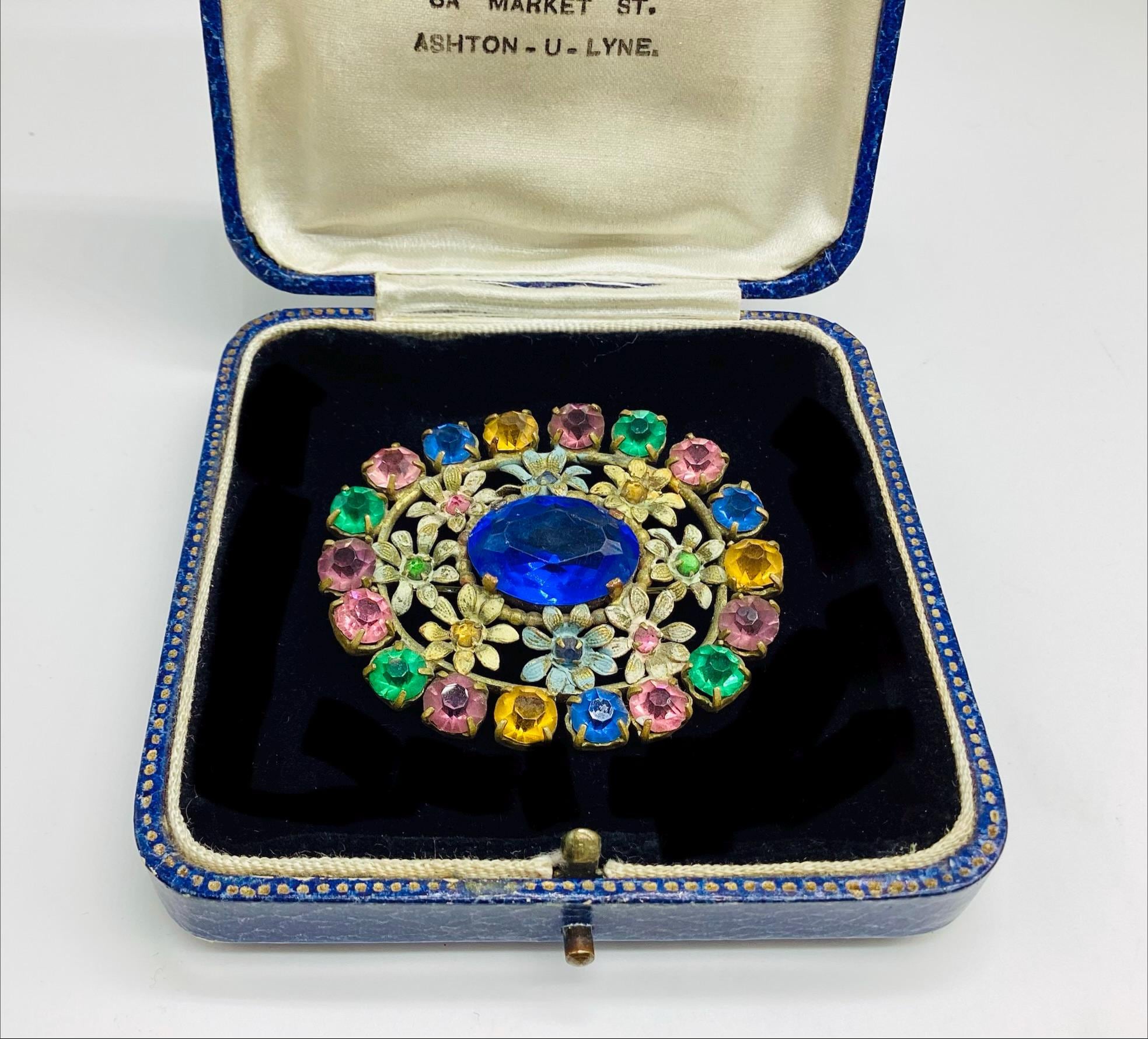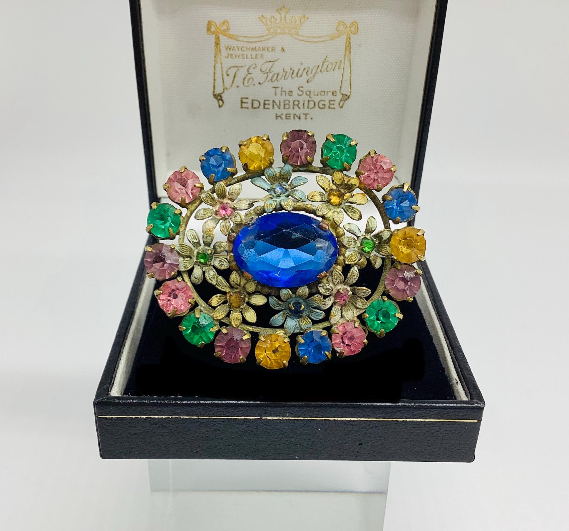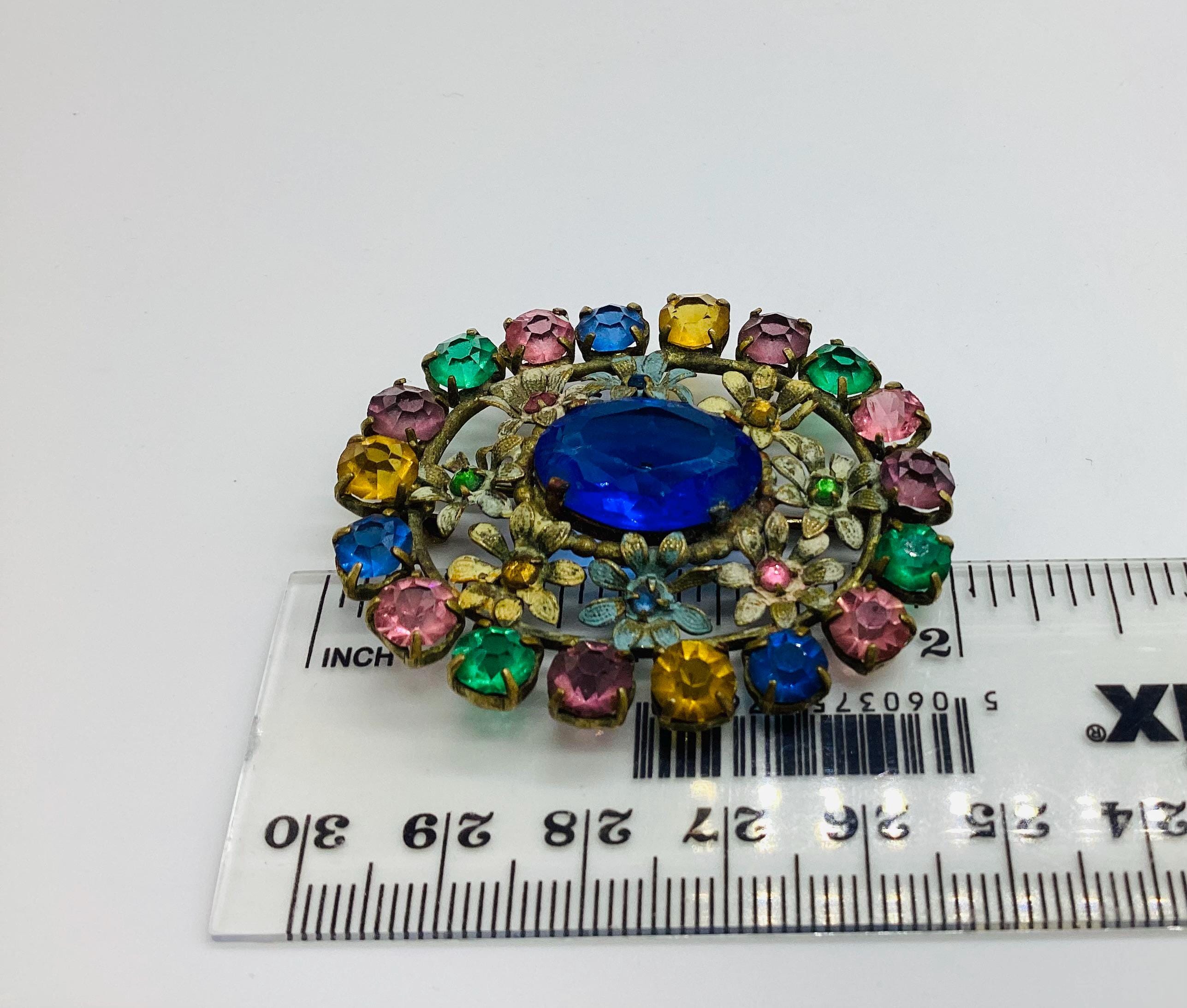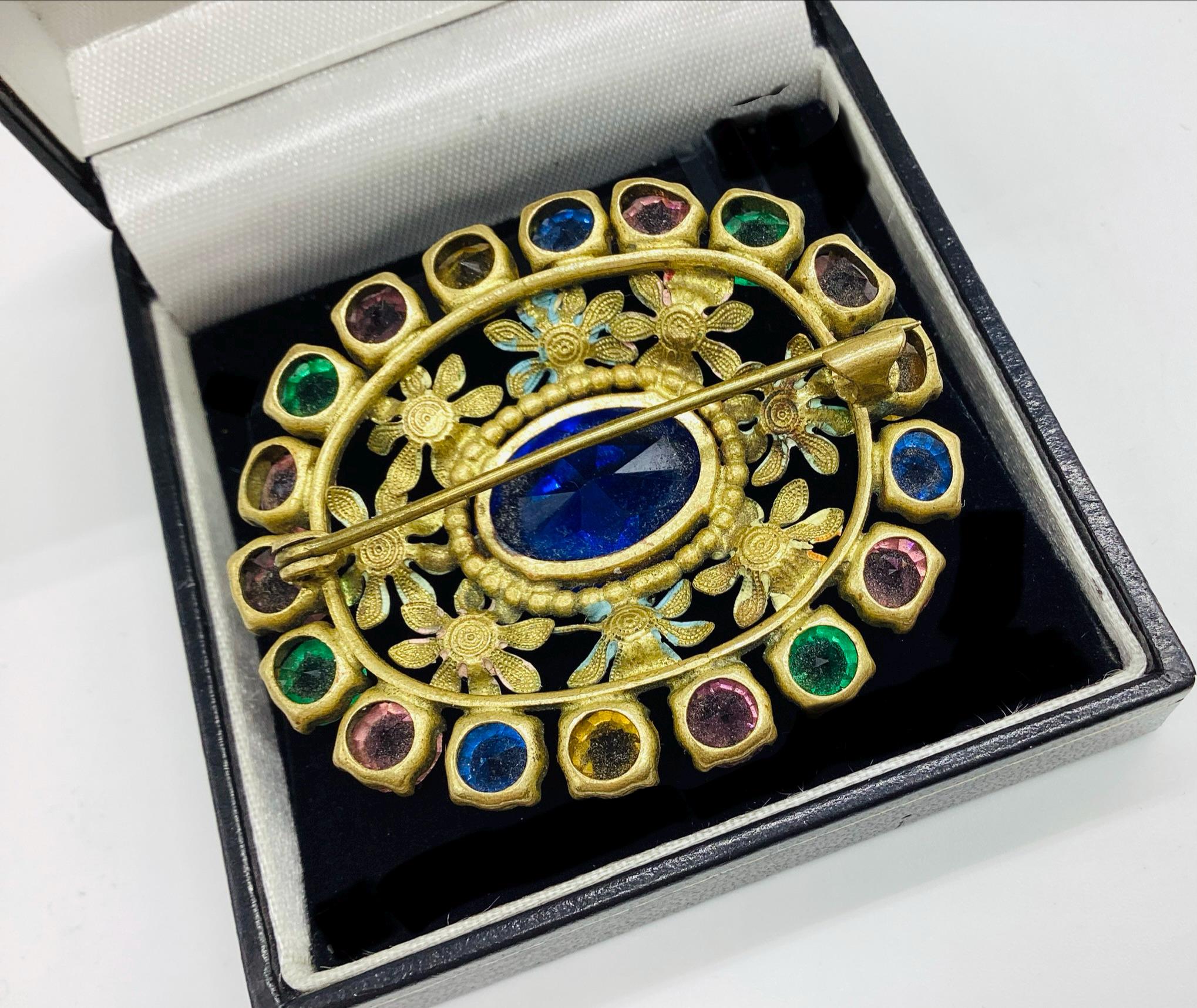 A stunning large Czech glass brooch. A beautiful glass sapphire set in fine brass filigree and surrounded by a halo of rainbow enamel flowers with glass crystals centres. A real show stopper. This brooch is nearly 100 years old and still in super condition with all stones in place. I have several pieces of Czech jewellery. Brooches, necklaces, earrings and bracelets. The history of Bohemian and Czech glass jewellery is interesting and details that the production of jewellery ceased at the beginning of WWII indicating that the vintage and antique descriptions are absolutely genuine . Czechoslovakia became a country in 1918 absorbing Bohemia, which was well known for its quality glass, garnets and beads. The Bohemian glass works produced large quantities of stones and beads as well as complete jewellery which was exported between 1918 and 1939. During the war Czechoslovakia was occupied by the Germans, so the Czech jewellery you find will be dated from before WWII.