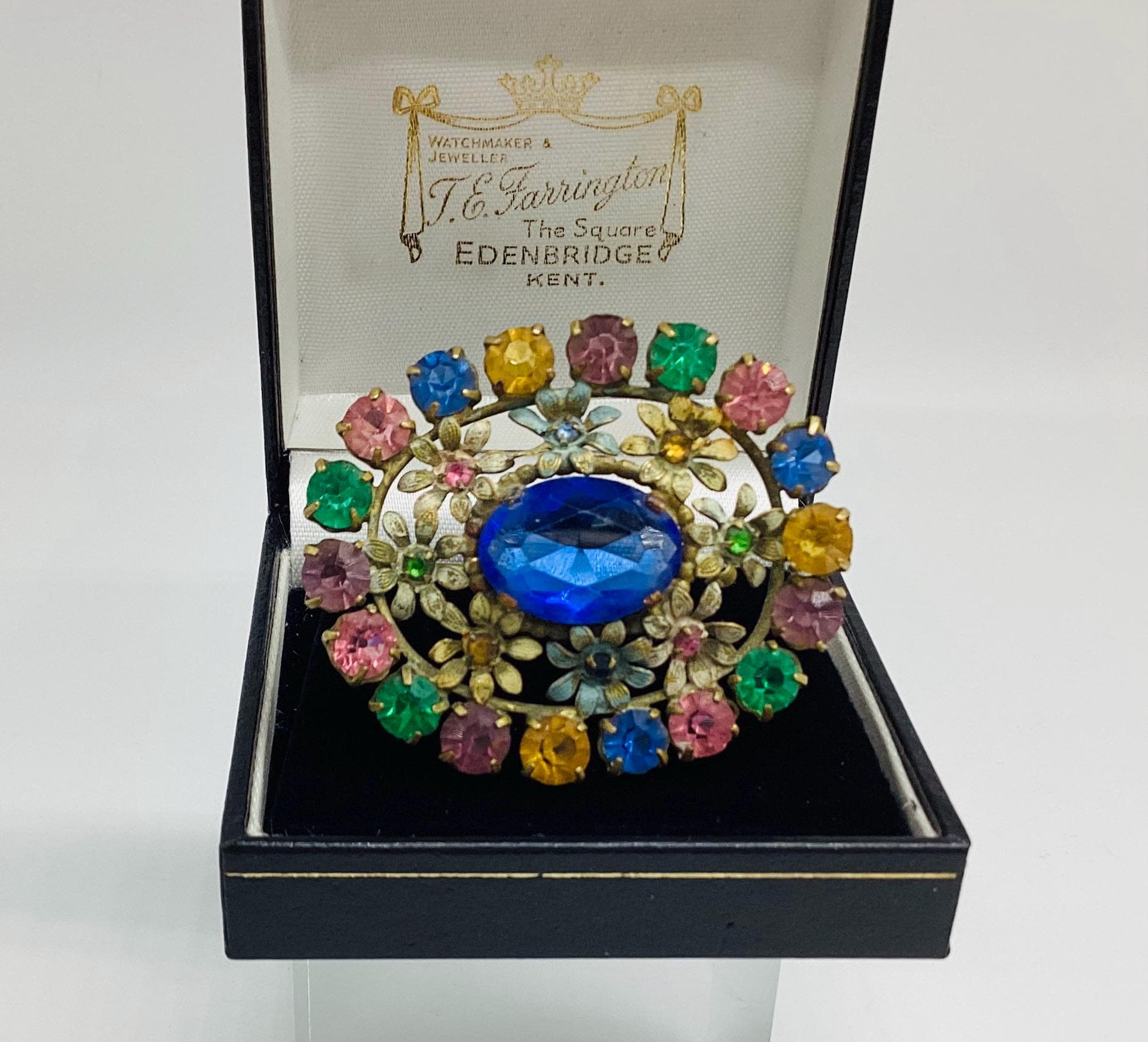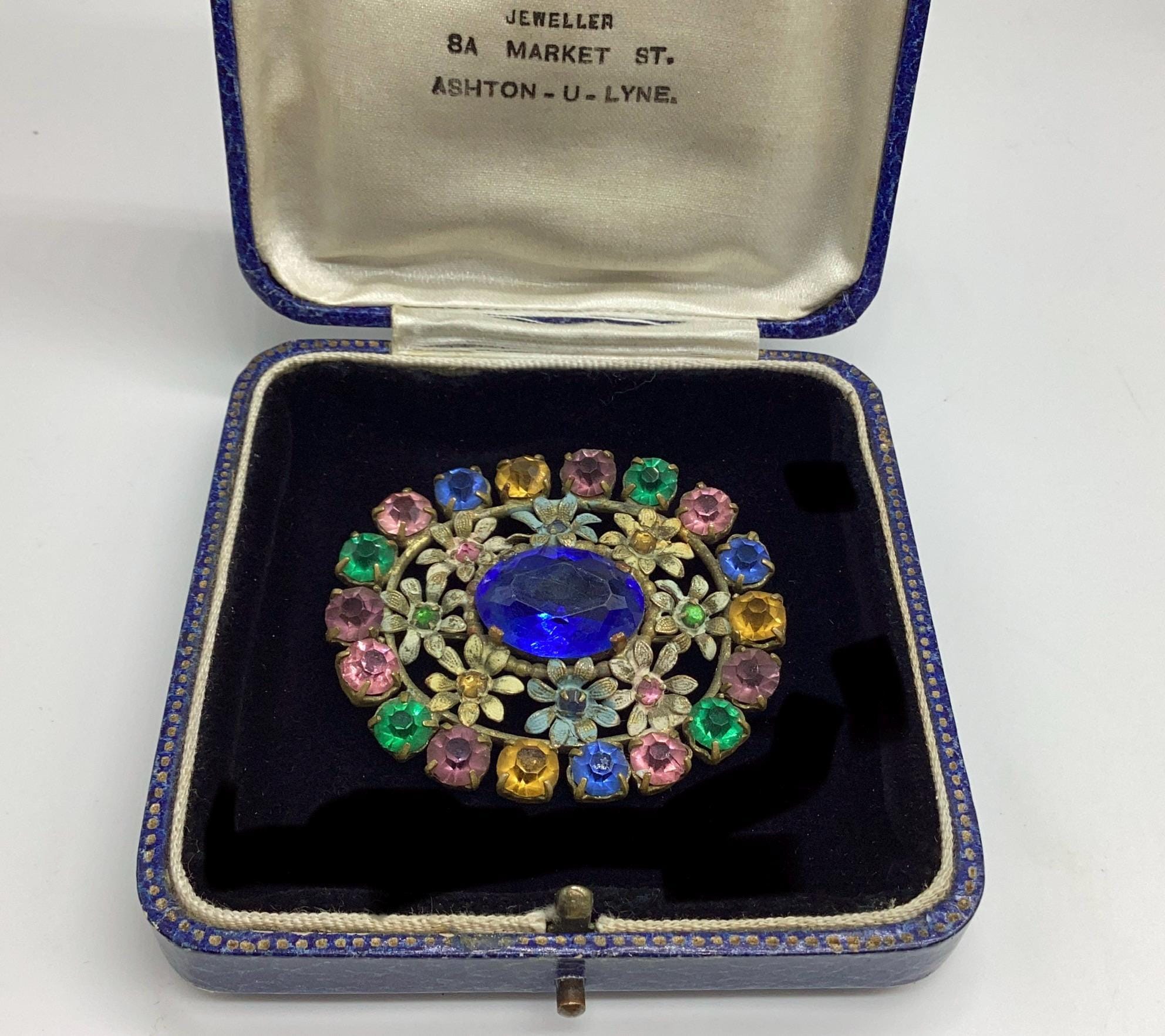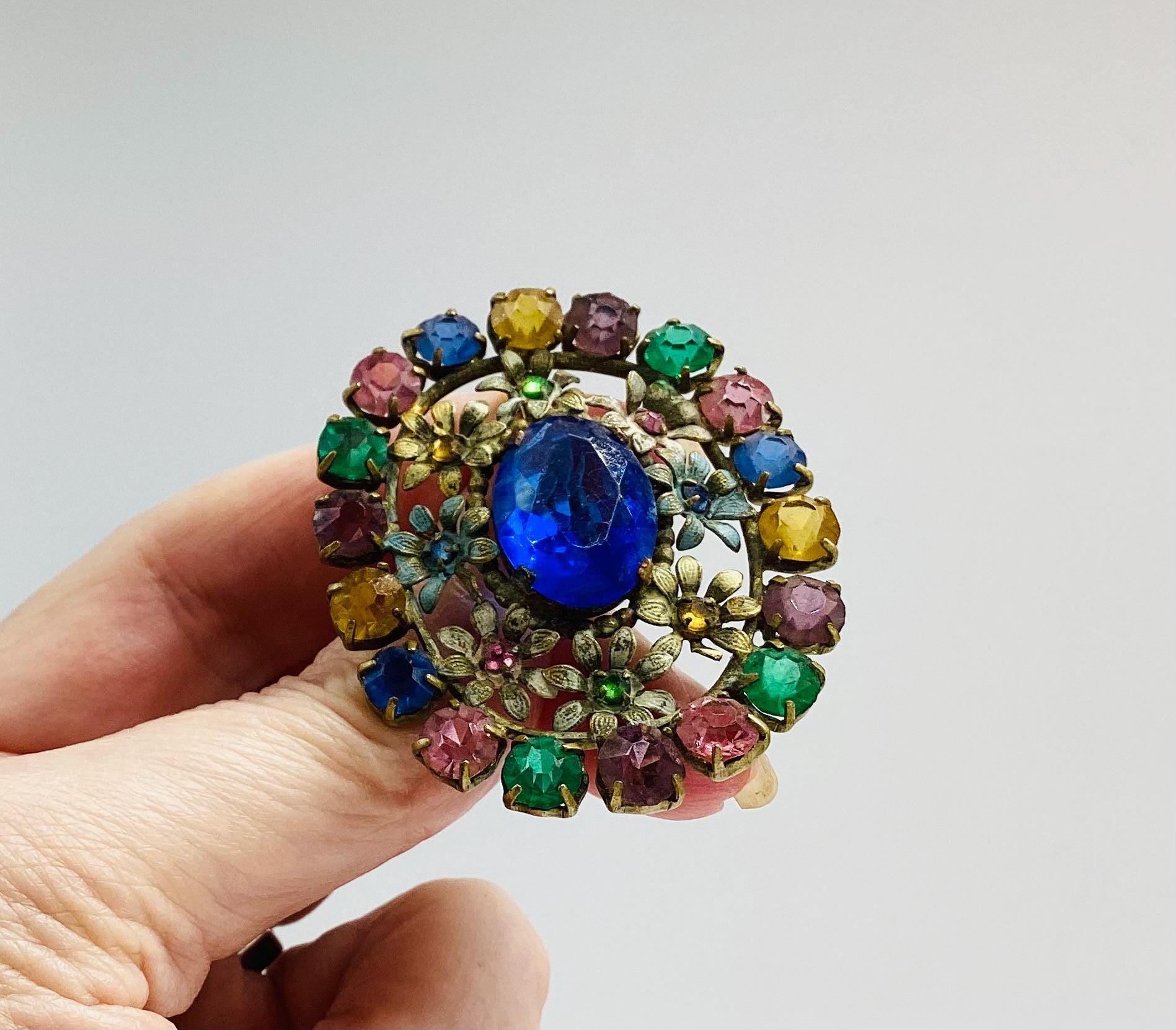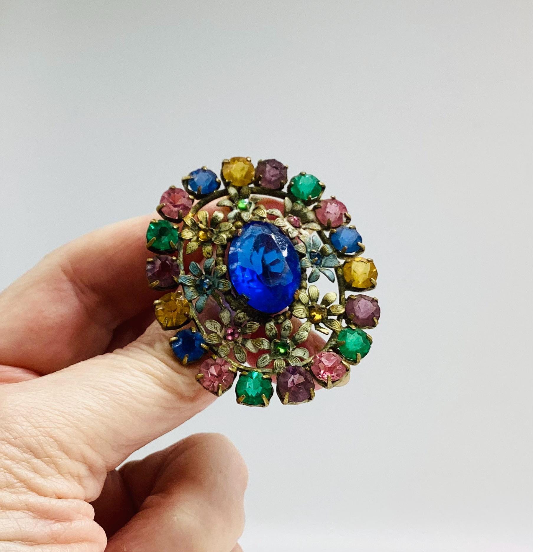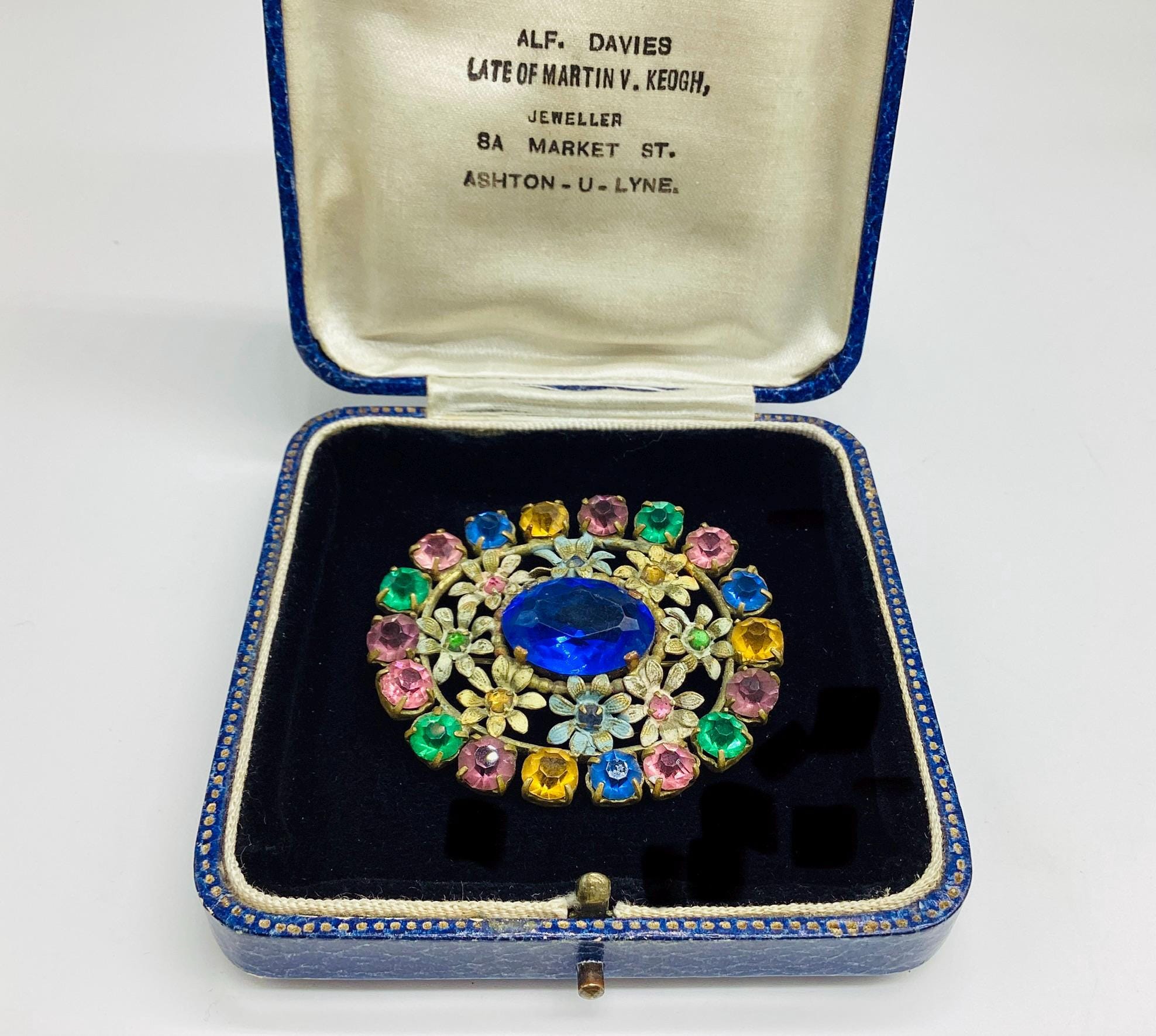 A stunning large Czech glass brooch. A beautiful glass sapphire set in fine brass filigree and surrounded by a halo of rainbow enamel flowers with glass crystals centres. A real show stopper. This brooch is nearly 100 years old and still in super condition with all stones in place. I have several pieces of Czech jewellery. Brooches, necklaces, earrings and bracelets. The history of Bohemian and Czech glass jewellery is interesting and details that the production of jewellery ceased at the beginning of WWII indicating that the vintage and antique descriptions are absolutely genuine . Czechoslovakia became a country in 1918 absorbing Bohemia, which was well known for its quality glass, garnets and beads. The Bohemian glass works produced large quantities of stones and beads as well as complete jewellery which was exported between 1918 and 1939. During the war Czechoslovakia was occupied by the Germans, so the Czech jewellery you find will be dated from before WWII.