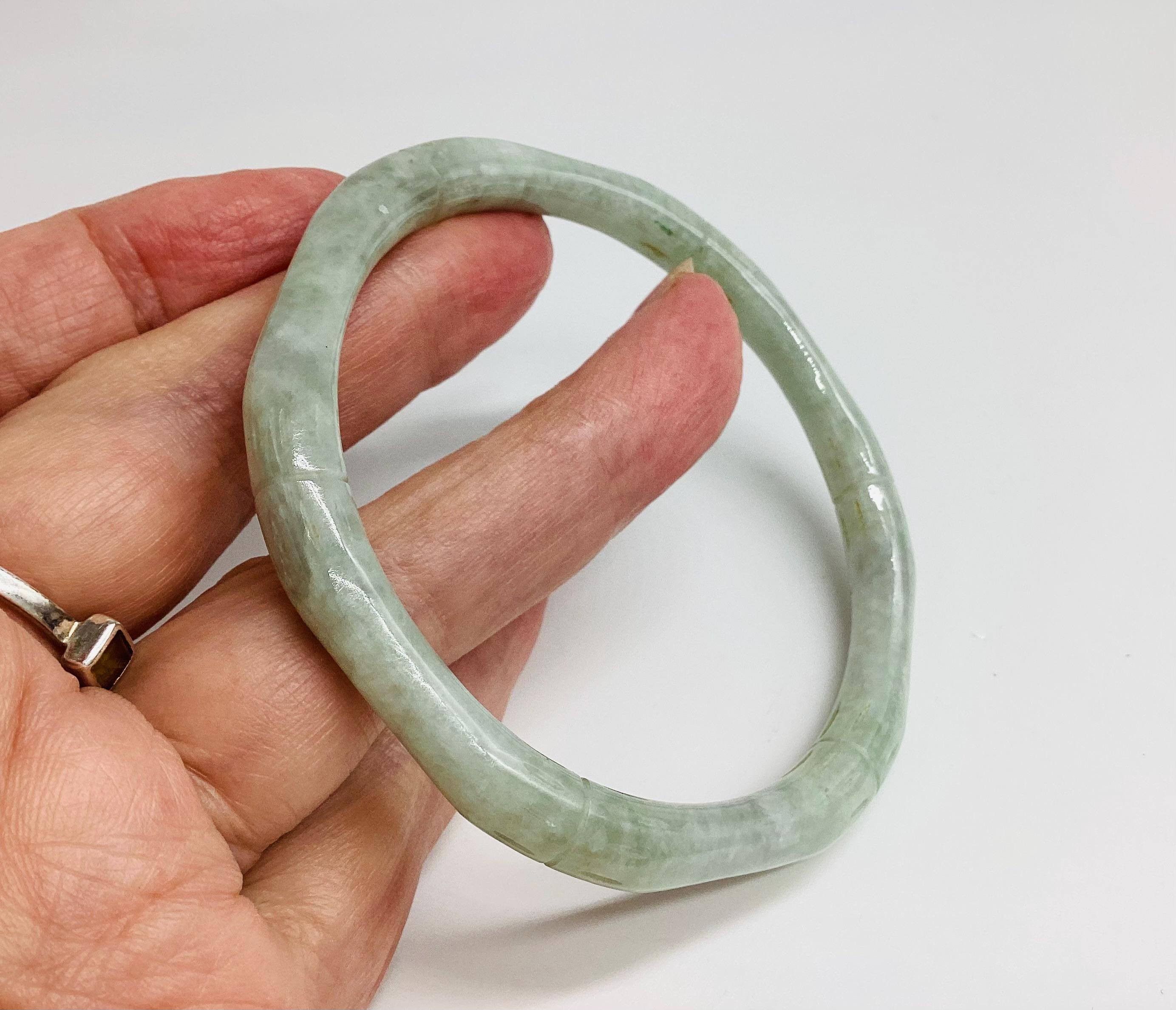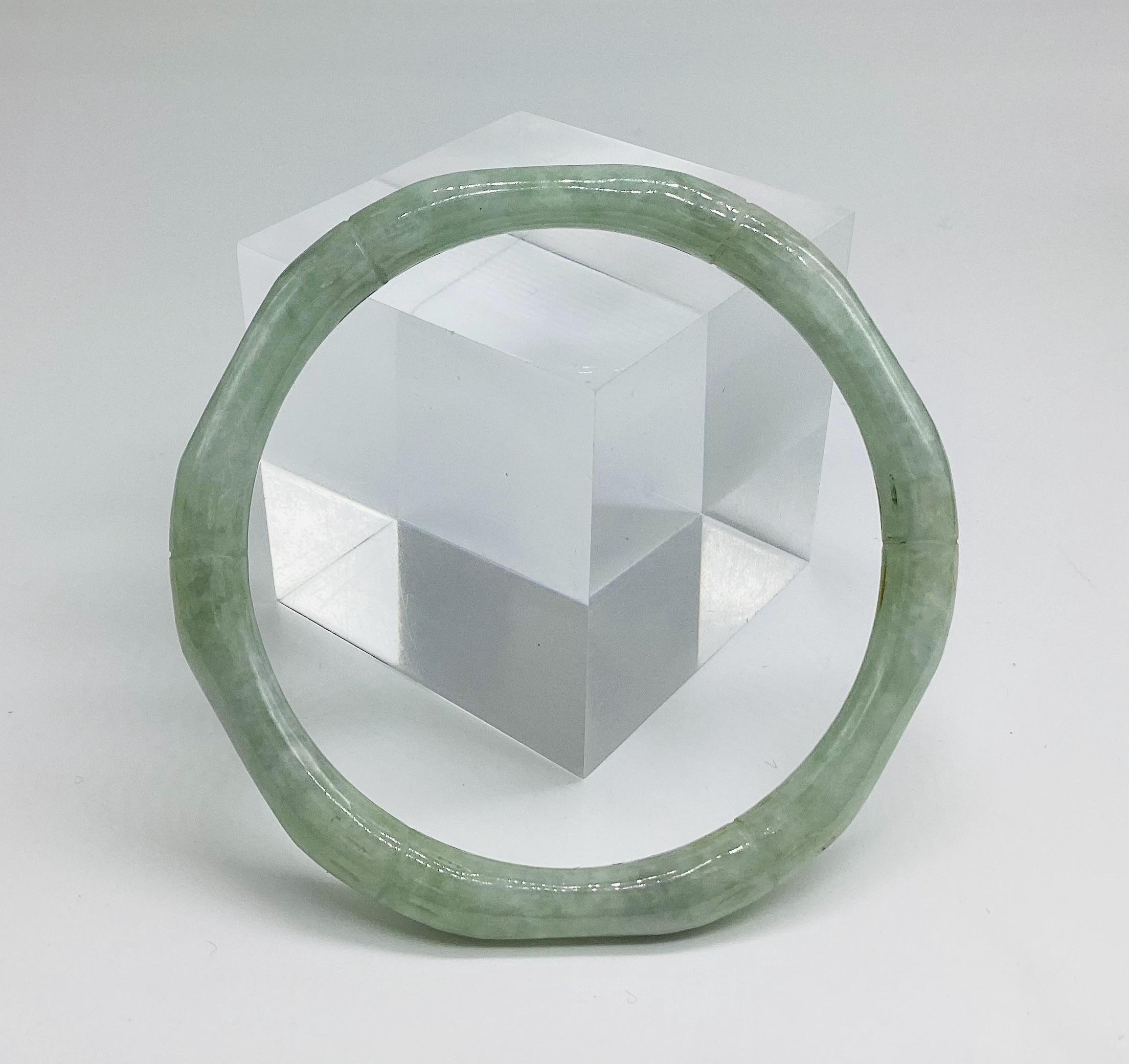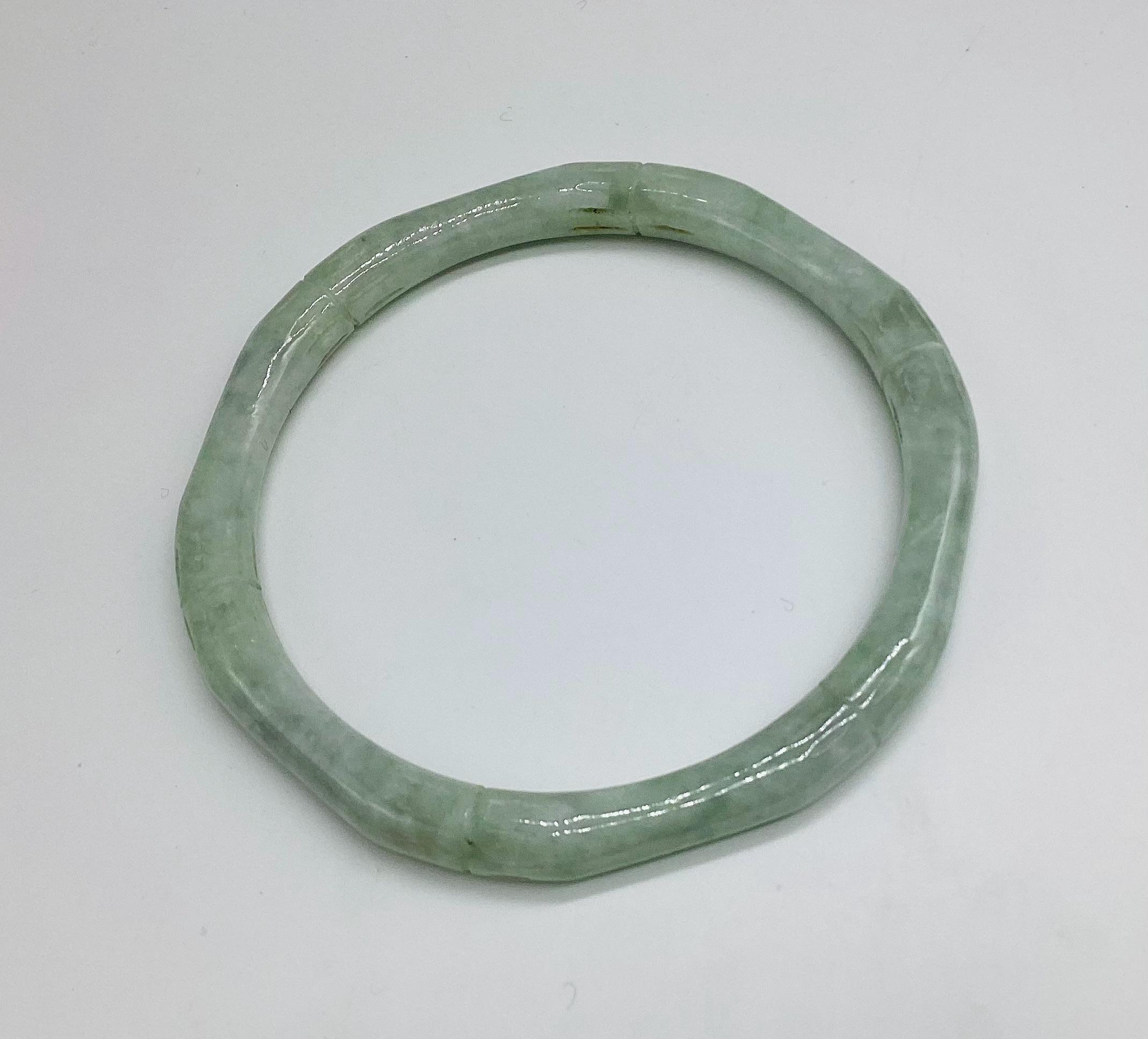 A beautiful sea foam green jade bangle. Unusual and rare piece. Carved to resemble a bamboo bracelet. Beautiful worn alone or stacked with other jade or contrasting bangles.
