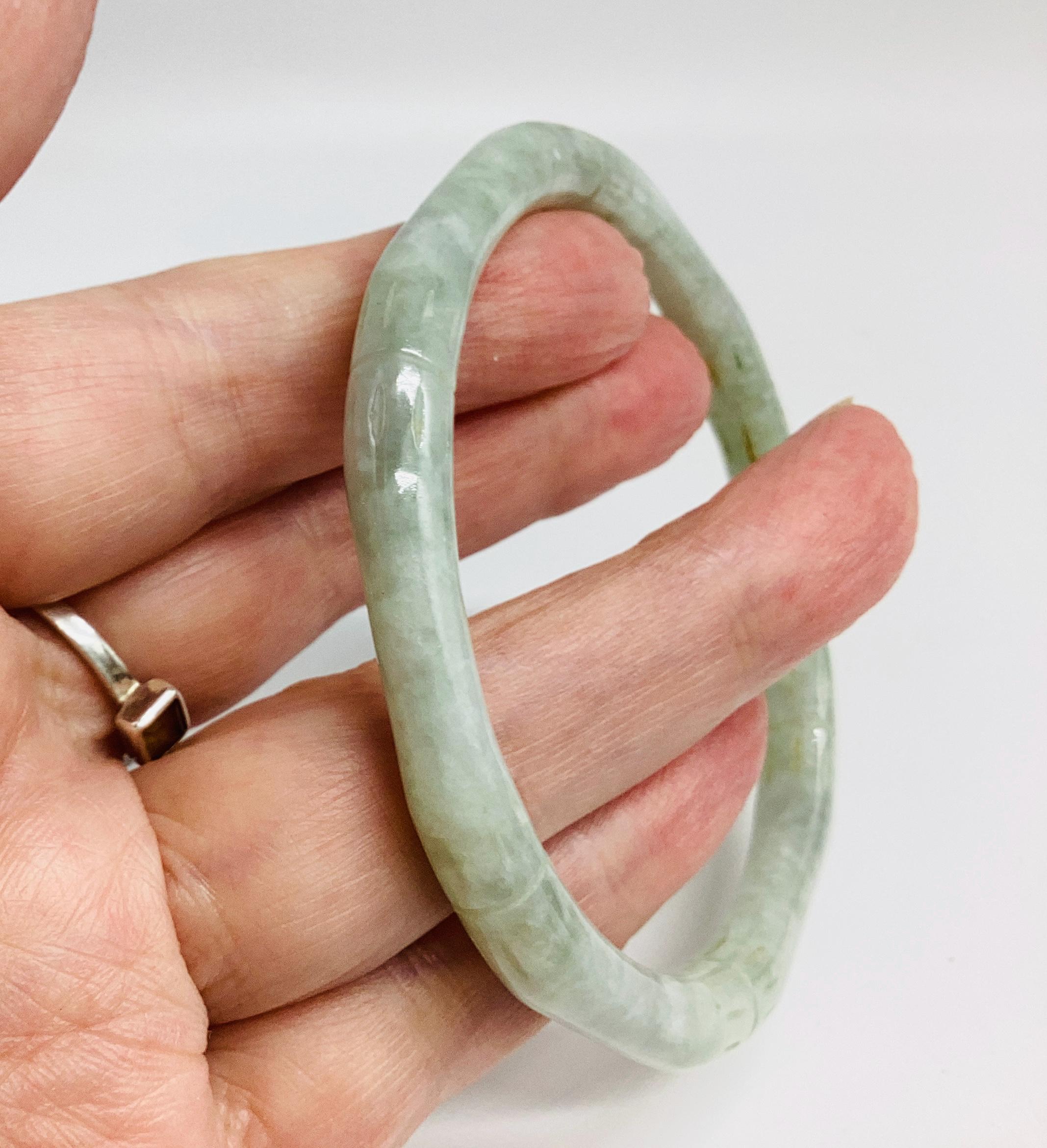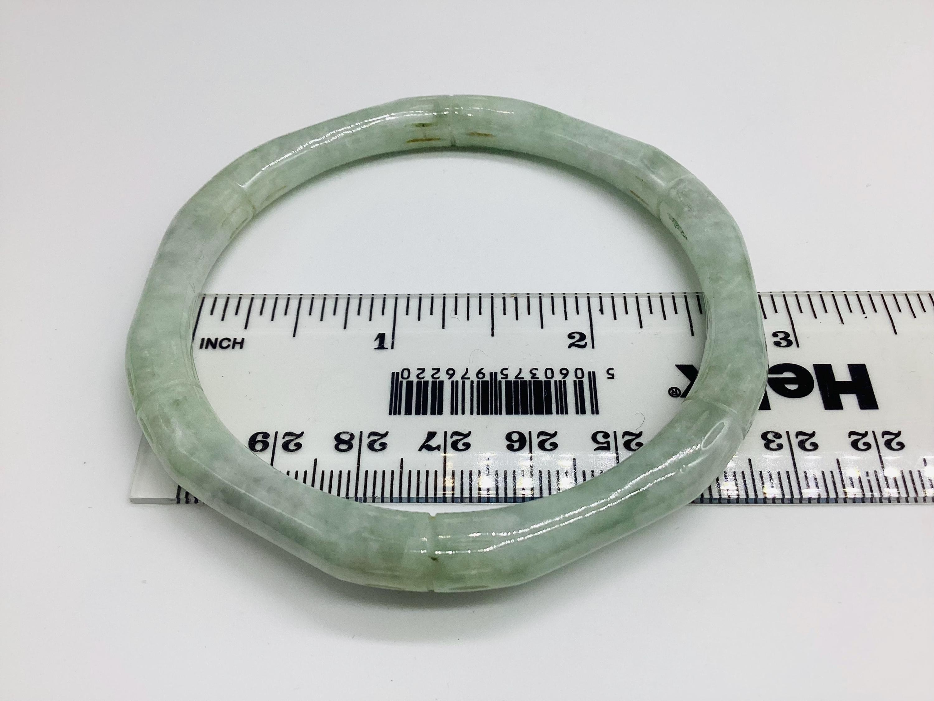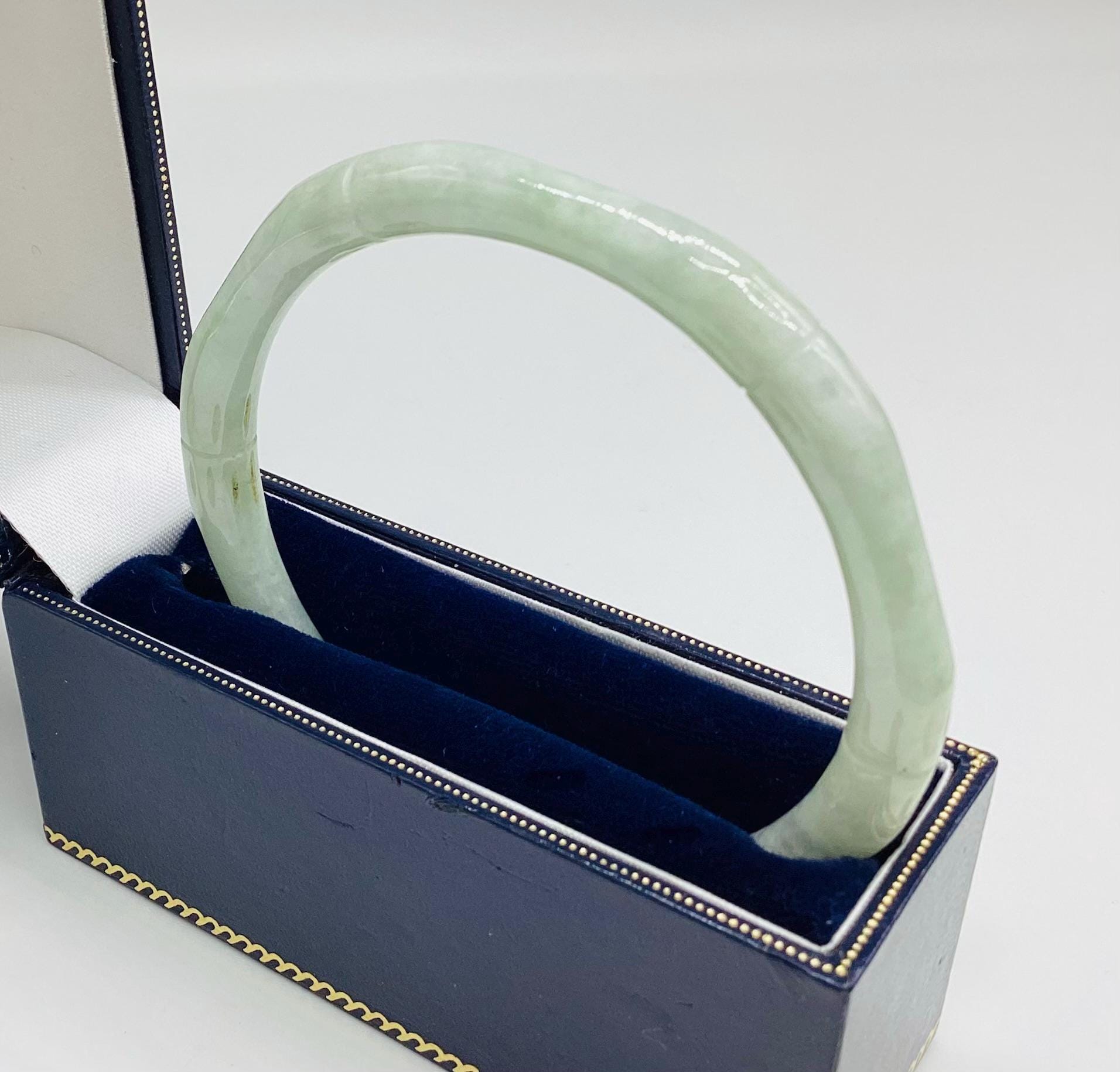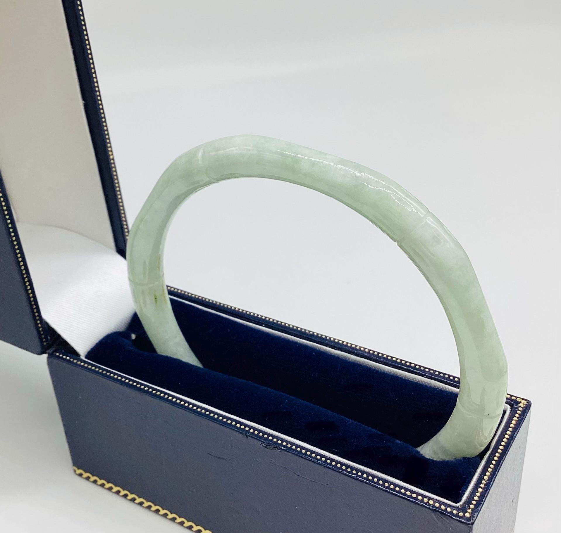 A beautiful sea foam green jade bangle. Unusual and rare piece. Carved to resemble a bamboo bracelet. Beautiful worn alone or stacked with other jade or contrasting bangles.