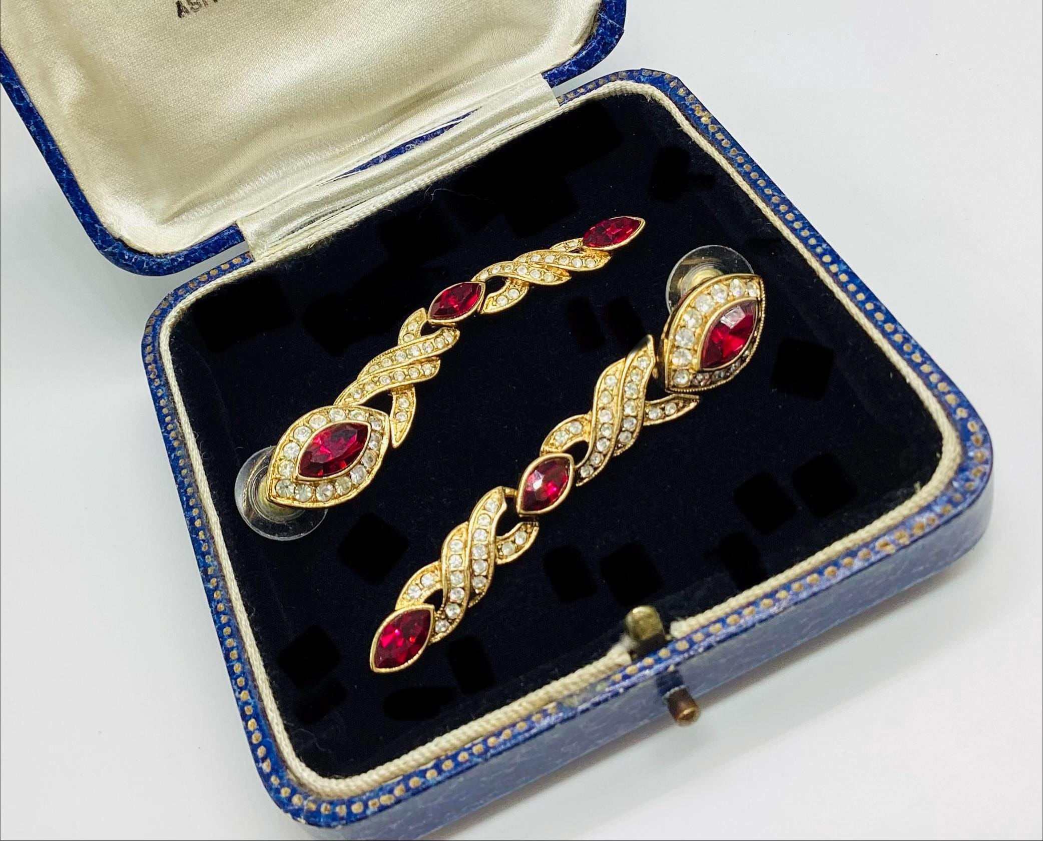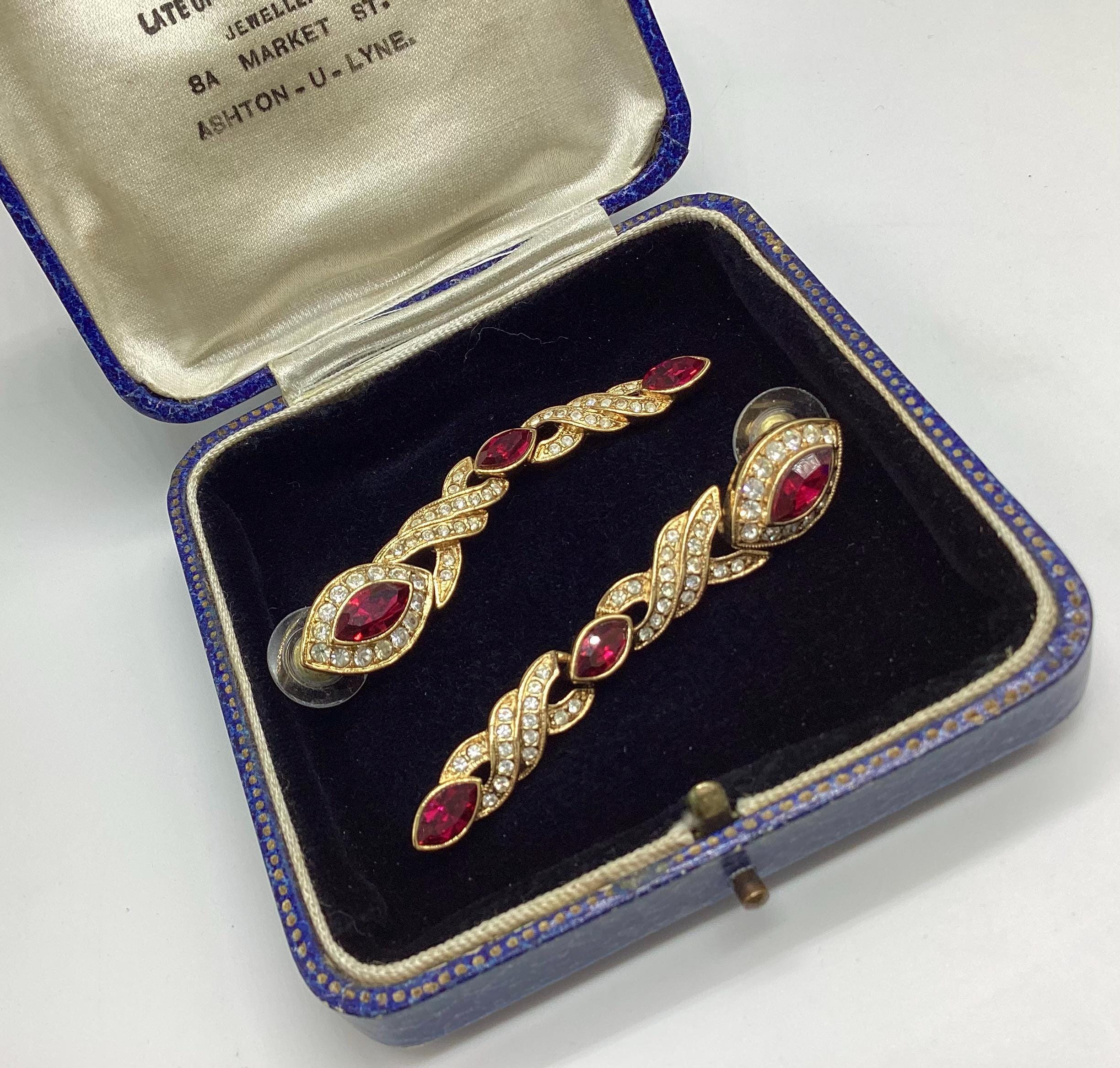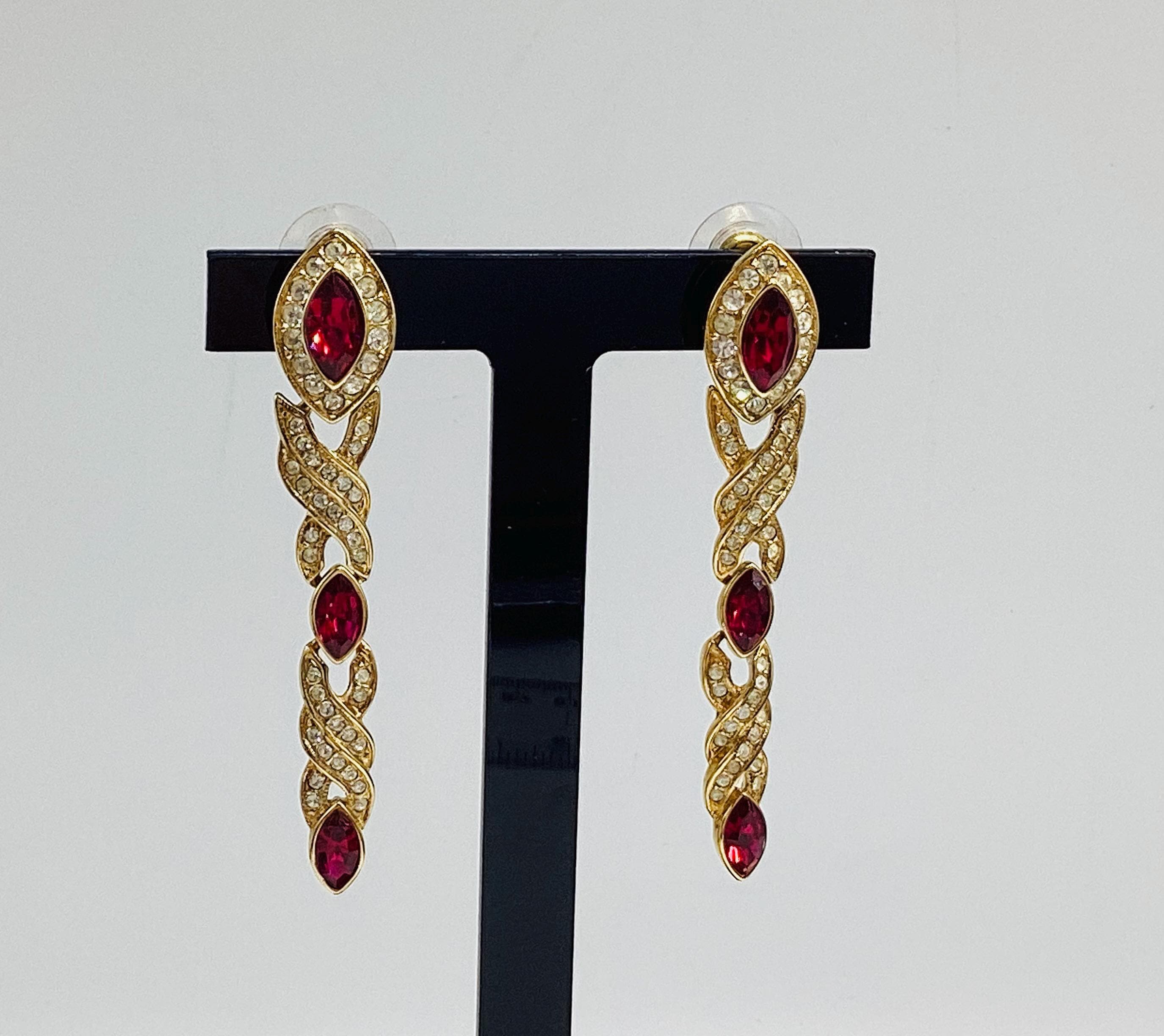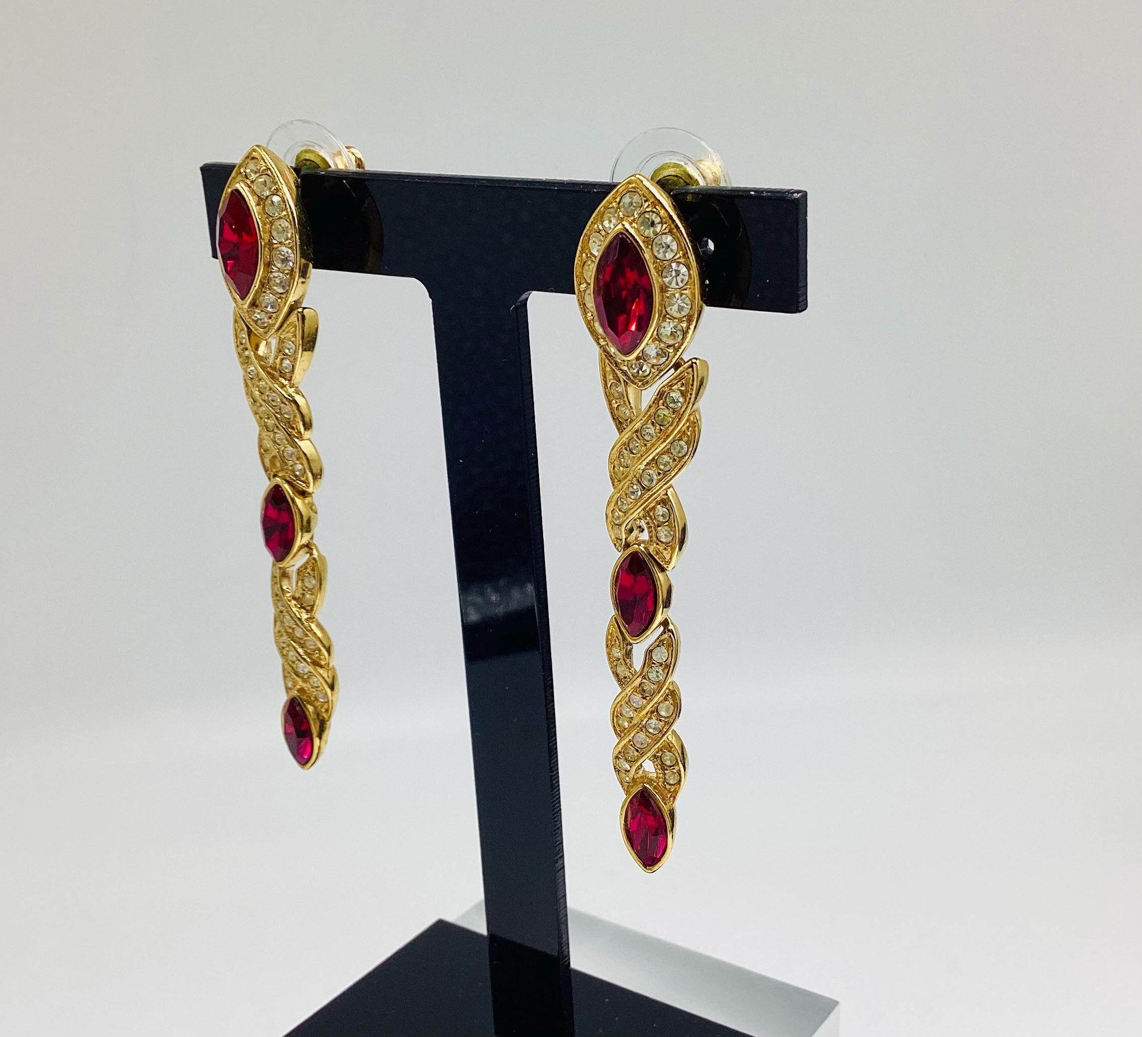 Fabulous glamour in these beautiful Attwood and Sawyer extra long Swarovski crystal earrings. Stunning ruby red and clear crystals in 22ct gold plated settings and in three articulated sections. The piece is signed and in great condition, perfect for any special occasion. I have a particular love for this maker, well known for the superb quality and attention to detail. Founded in Wales in 1956 by Horace Atwood, Atwood and Sawyer produced copies of precious ornaments from the 18th to 19th centuries. Many pieces were made for the television series “Dallas” and “Dynasty”, as well as exclusive compositions for the beauty contest “Miss World”. The firm produced high-end imitation jewellery and sold their decorations at prestigious retail outlets across the UK, Europe and other countries around the world, as well as on cruise ships and Airliners. A special recognition was given to their historical collection of exact copies of the jewellery of the Duchess of Windsor.
