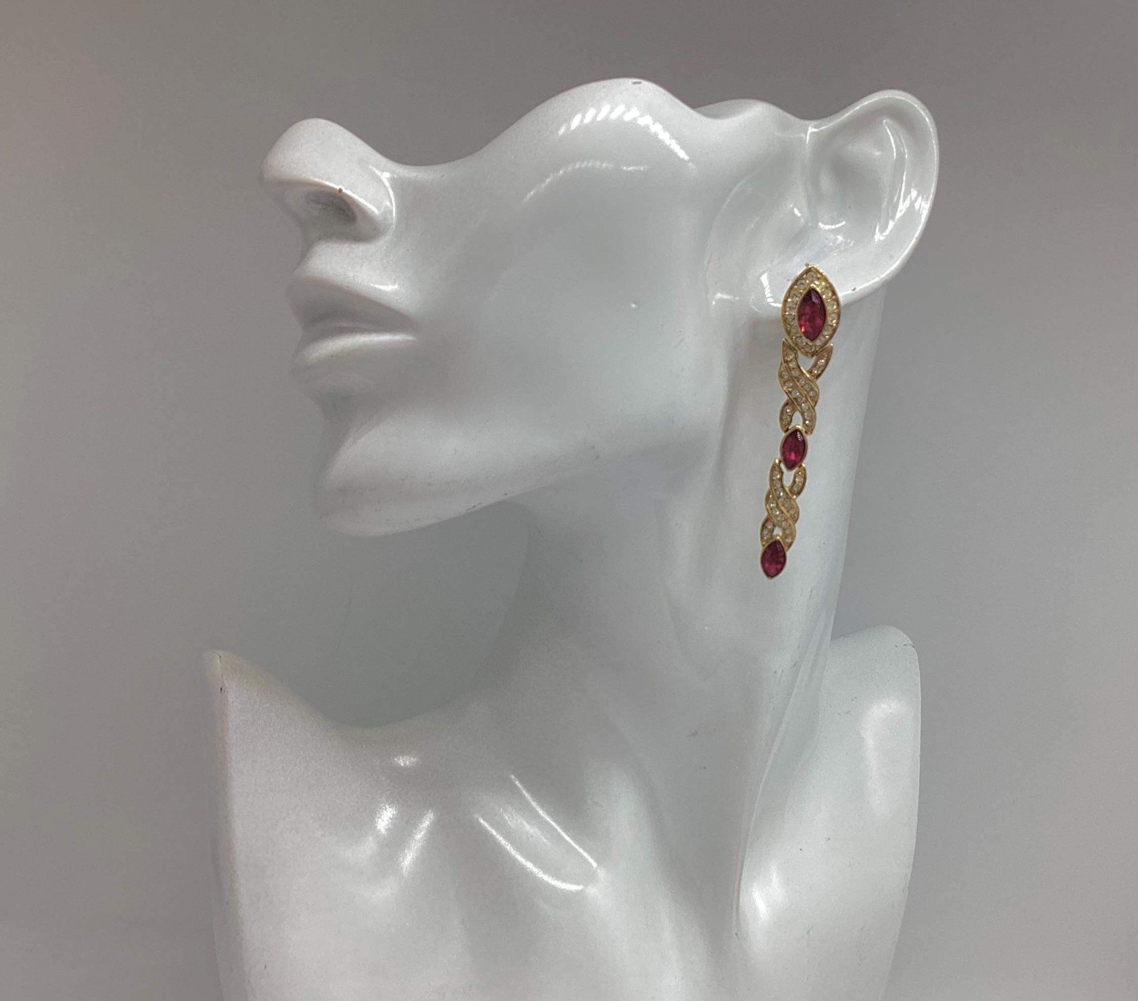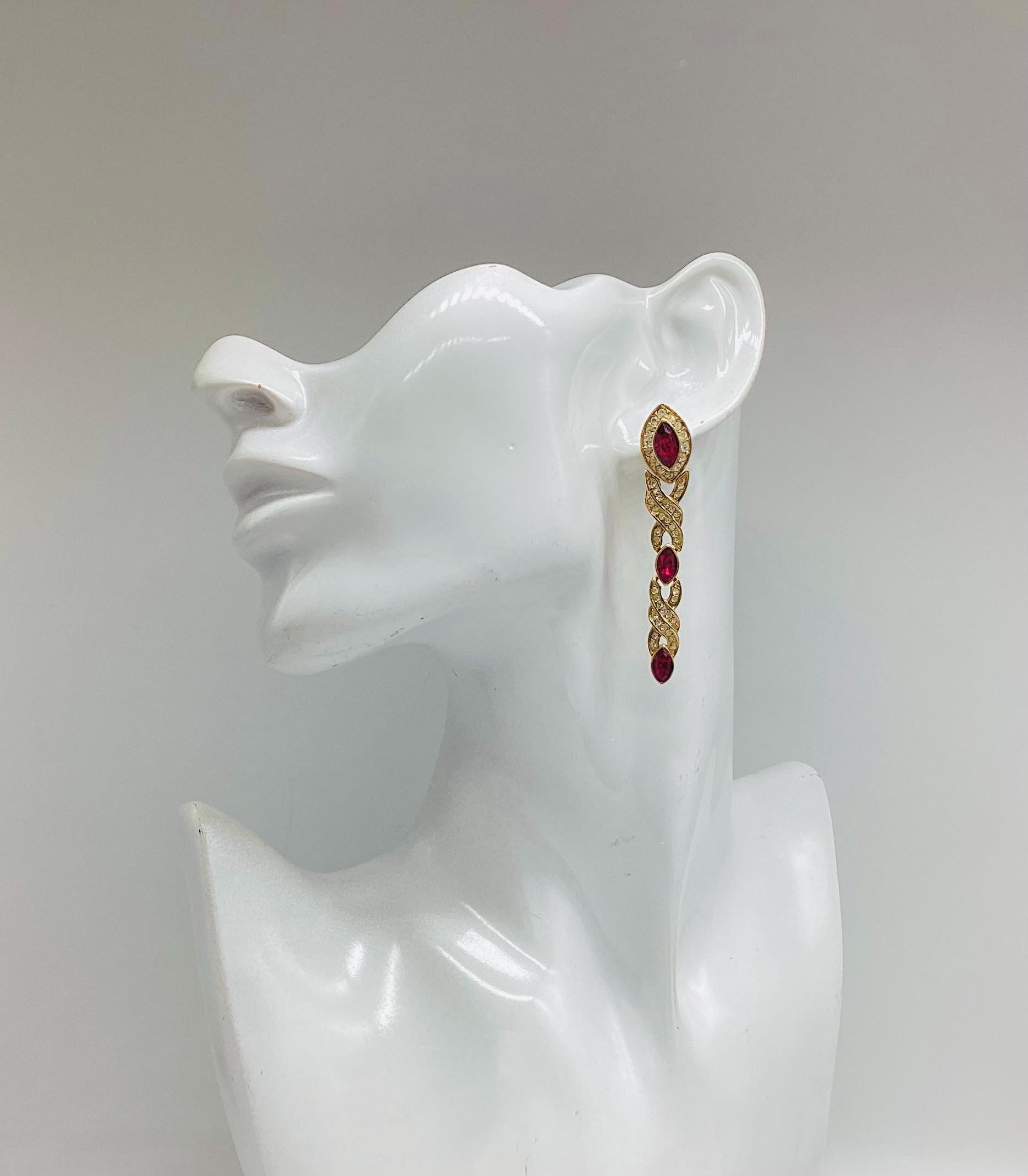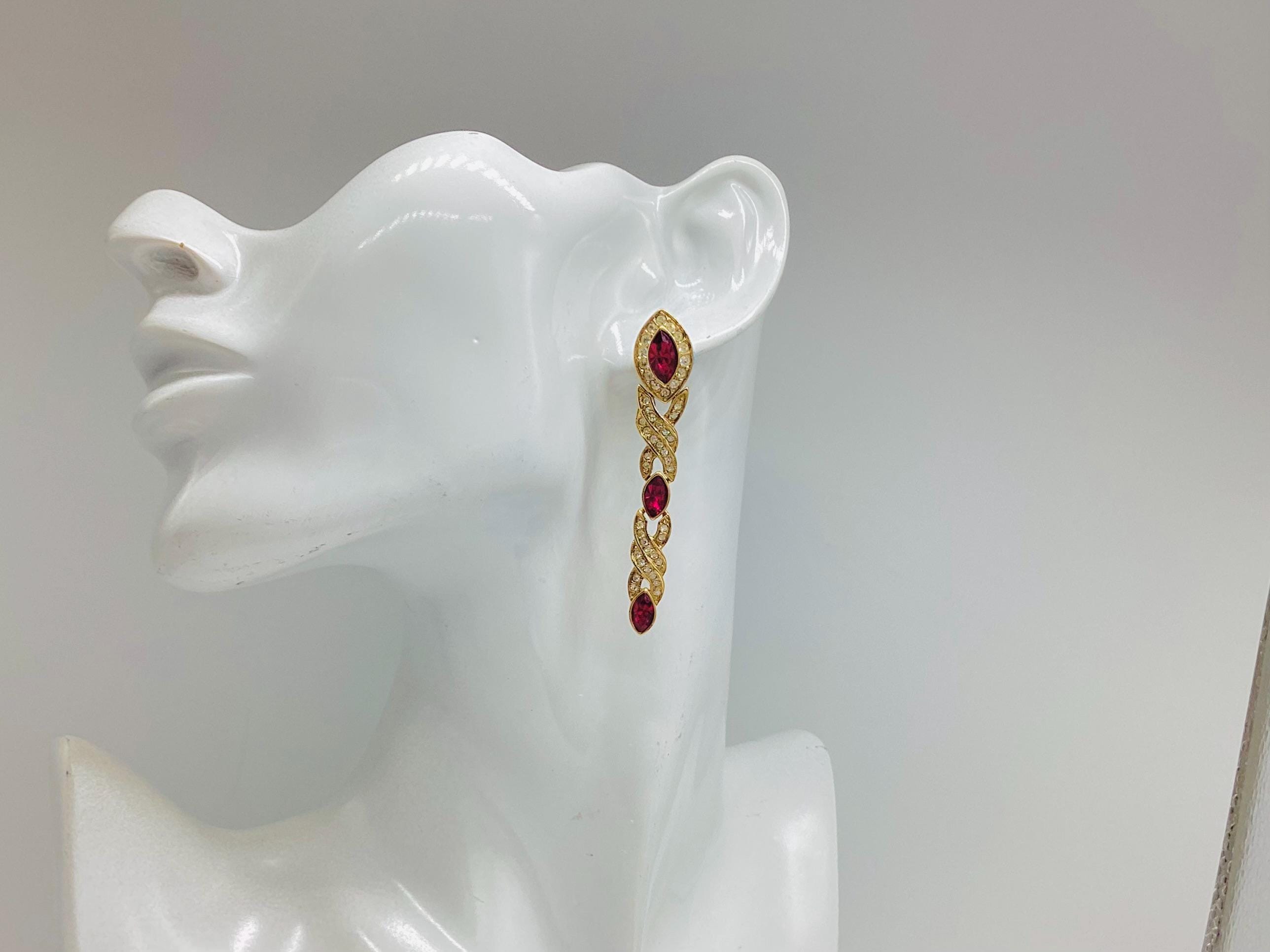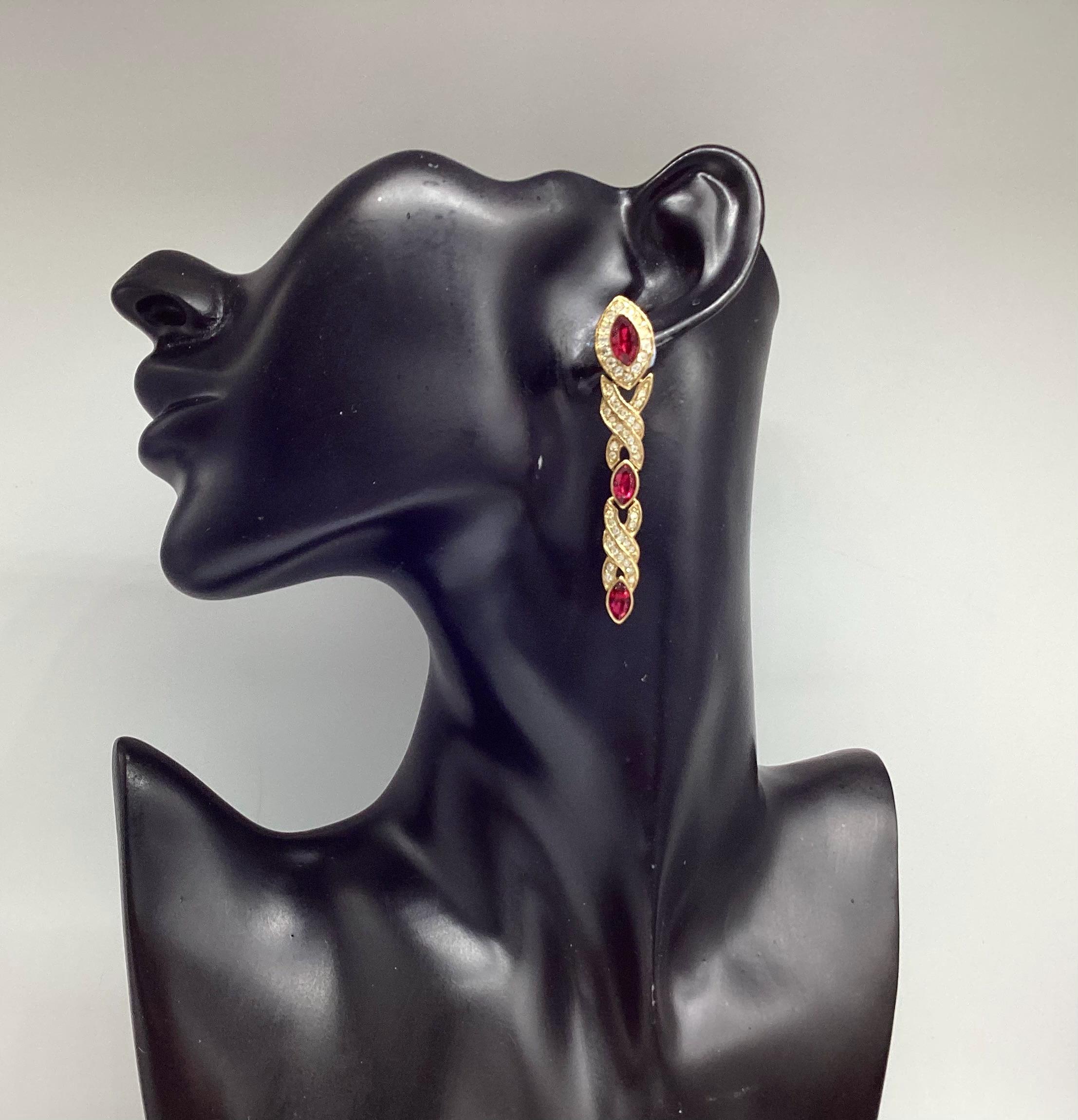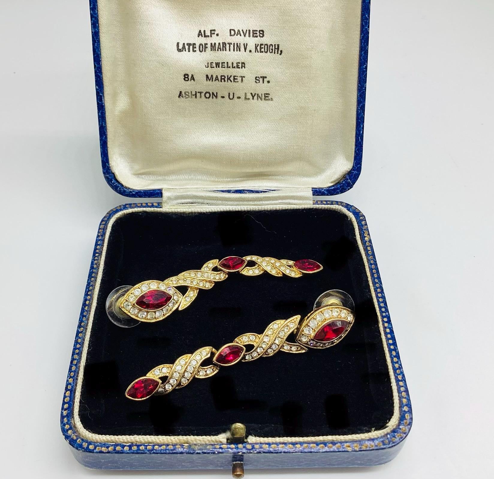Fabulous glamour in these beautiful Attwood and Sawyer extra long Swarovski crystal earrings. Stunning ruby red and clear crystals in 22ct gold plated settings and in three articulated sections. The piece is signed and in great condition, perfect for any special occasion. I have a particular love for this maker, well known for the superb quality and attention to detail. Founded in Wales in 1956 by Horace Atwood, Atwood and Sawyer produced copies of precious ornaments from the 18th to 19th centuries. Many pieces were made for the television series “Dallas” and “Dynasty”, as well as exclusive compositions for the beauty contest “Miss World”. The firm produced high-end imitation jewellery and sold their decorations at prestigious retail outlets across the UK, Europe and other countries around the world, as well as on cruise ships and Airliners. A special recognition was given to their historical collection of exact copies of the jewellery of the Duchess of Windsor.