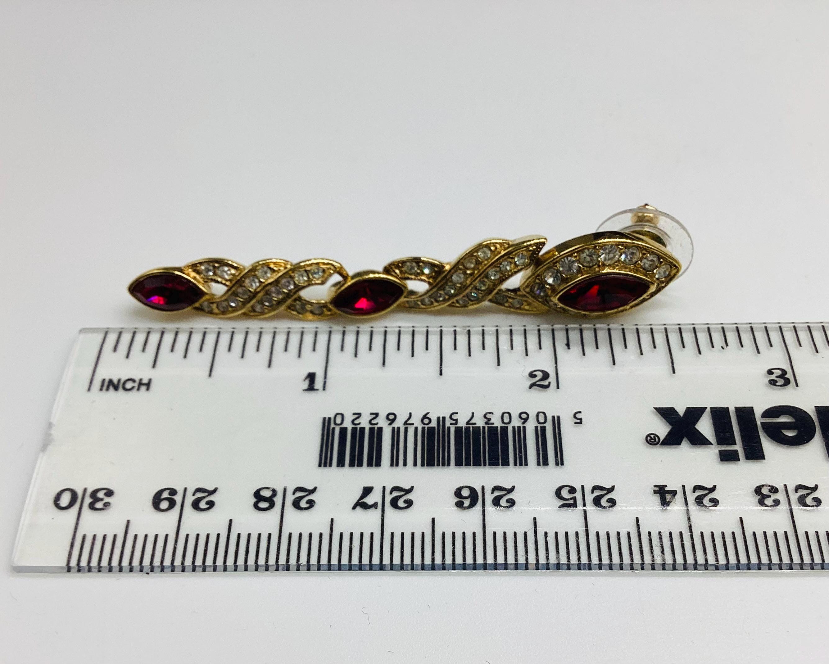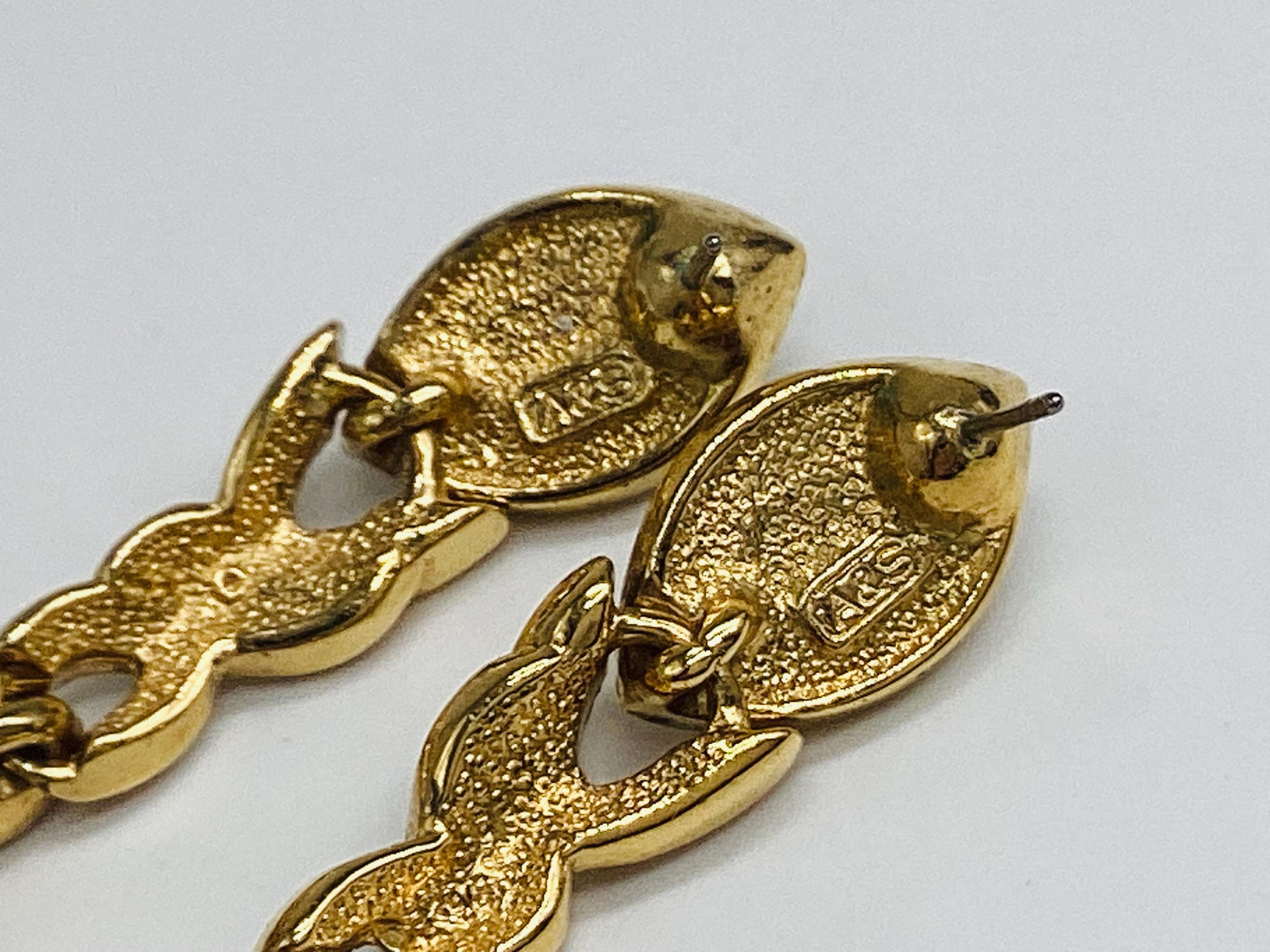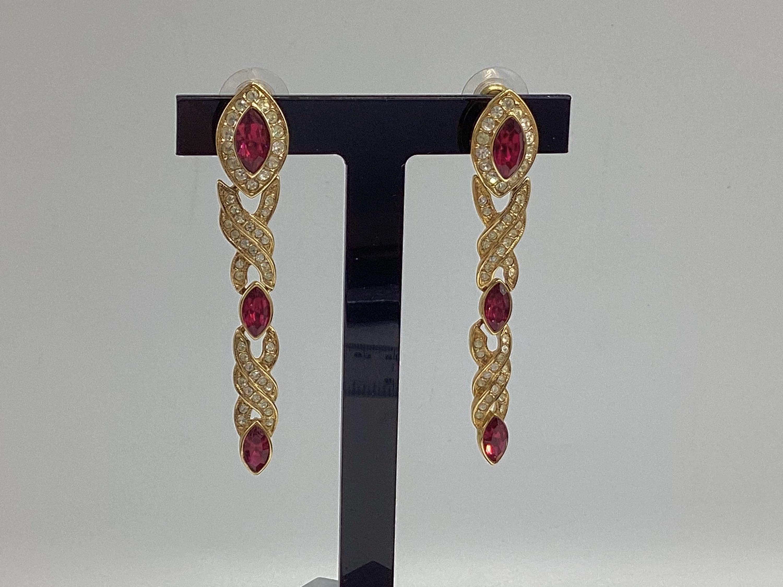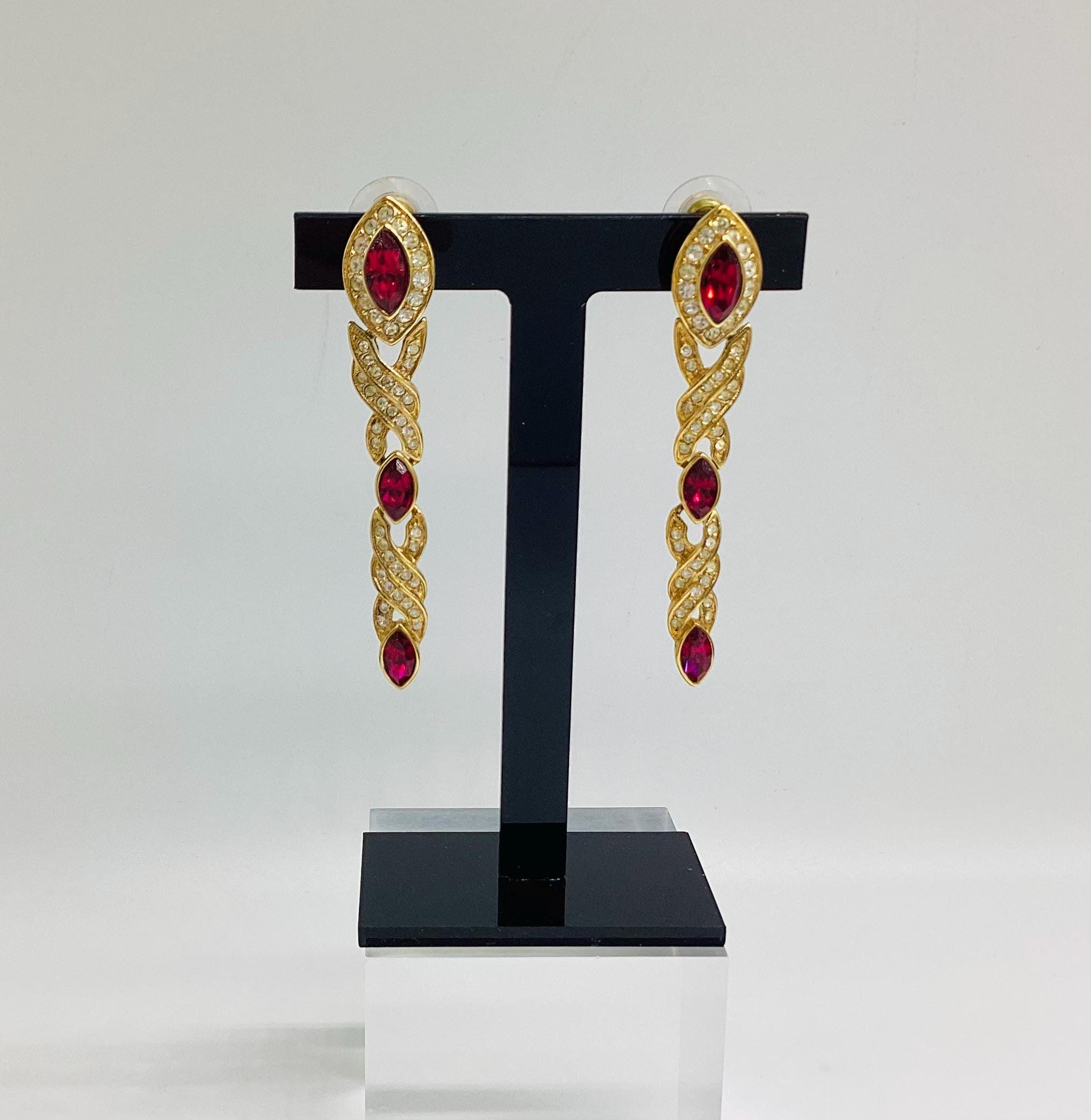 Fabulous glamour in these beautiful Attwood and Sawyer extra long Swarovski crystal earrings. Stunning ruby red and clear crystals in 22ct gold plated settings and in three articulated sections. The piece is signed and in great condition, perfect for any special occasion. I have a particular love for this maker, well known for the superb quality and attention to detail. Founded in Wales in 1956 by Horace Atwood, Atwood and Sawyer produced copies of precious ornaments from the 18th to 19th centuries. Many pieces were made for the television series “Dallas” and “Dynasty”, as well as exclusive compositions for the beauty contest “Miss World”. The firm produced high-end imitation jewellery and sold their decorations at prestigious retail outlets across the UK, Europe and other countries around the world, as well as on cruise ships and Airliners. A special recognition was given to their historical collection of exact copies of the jewellery of the Duchess of Windsor.