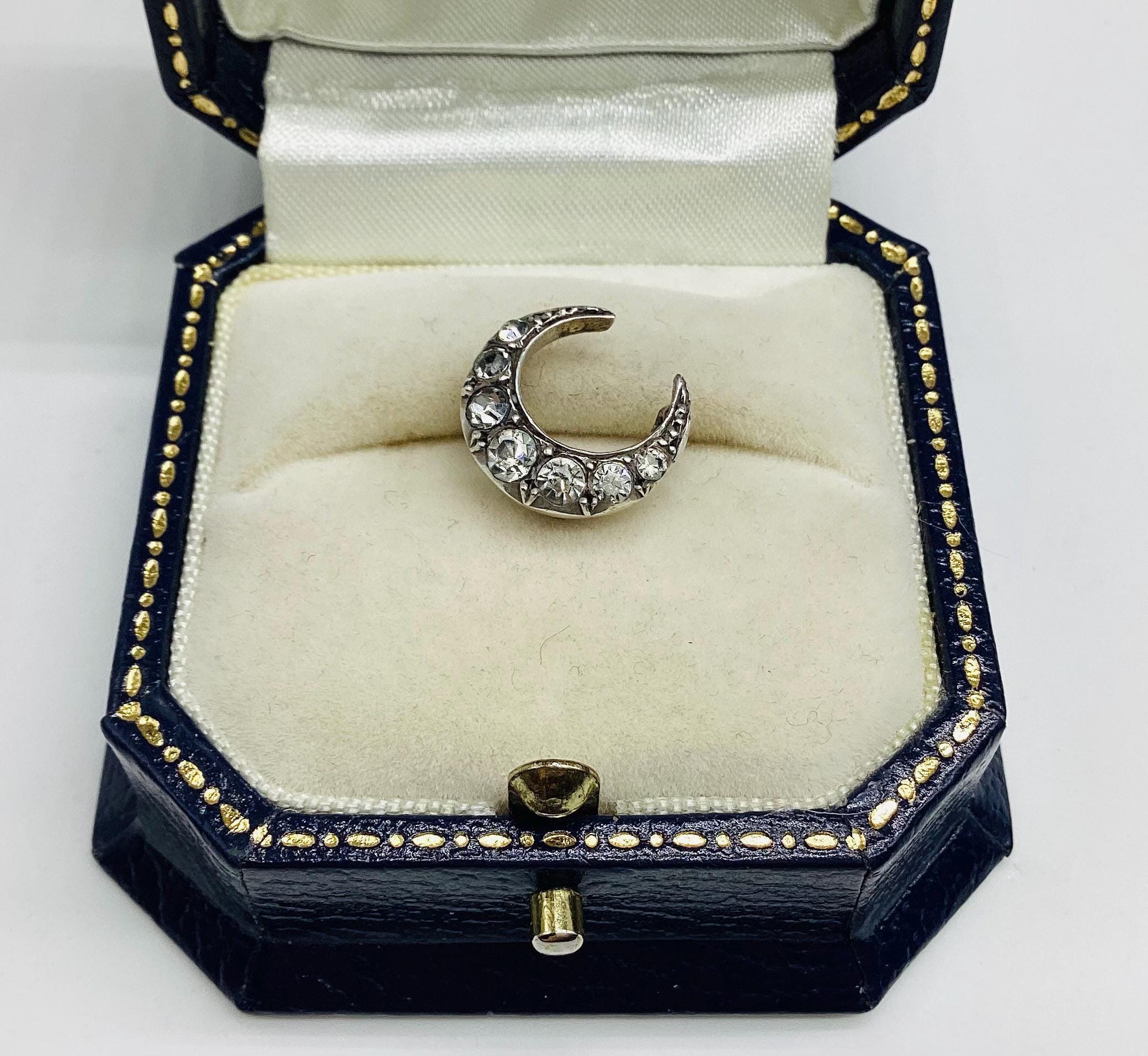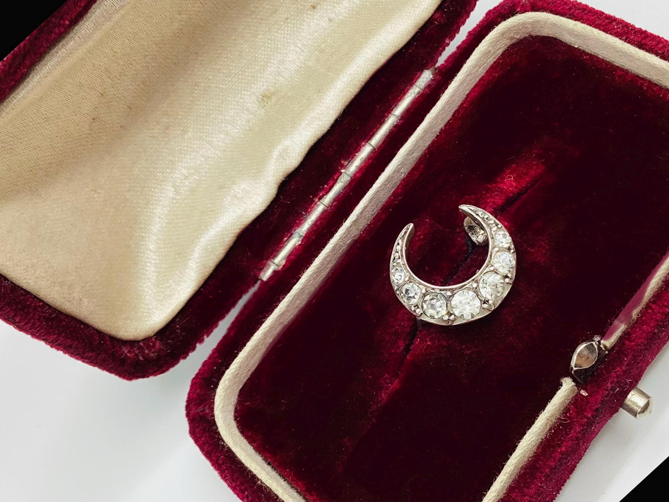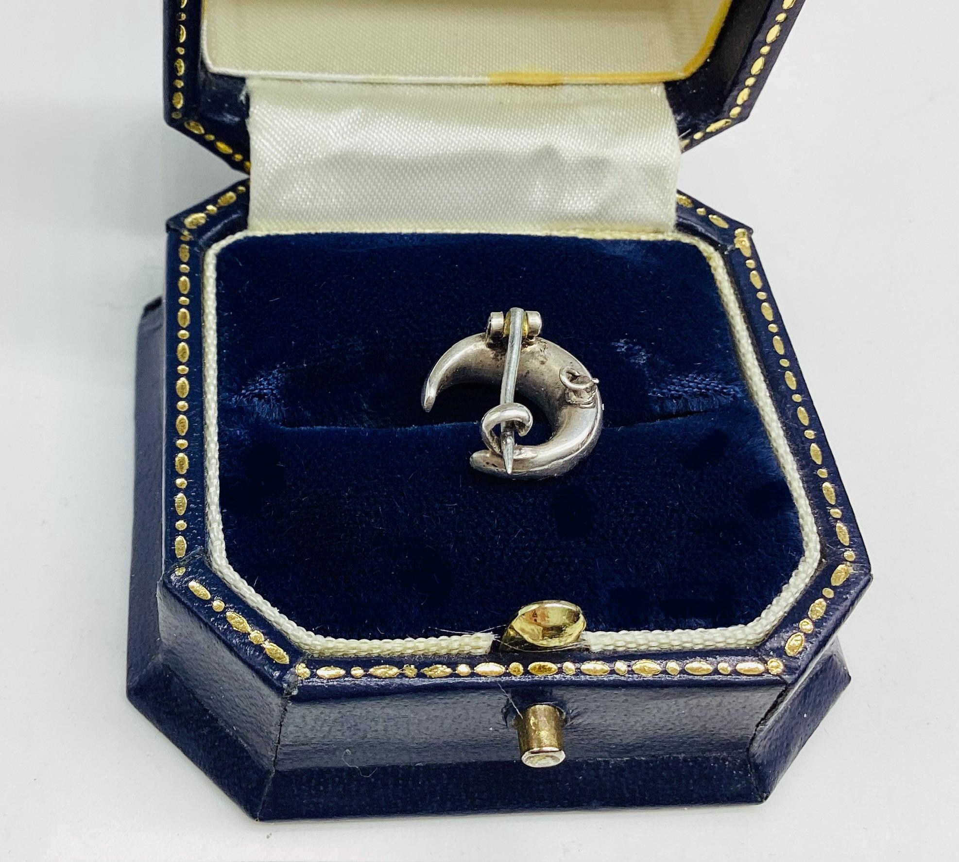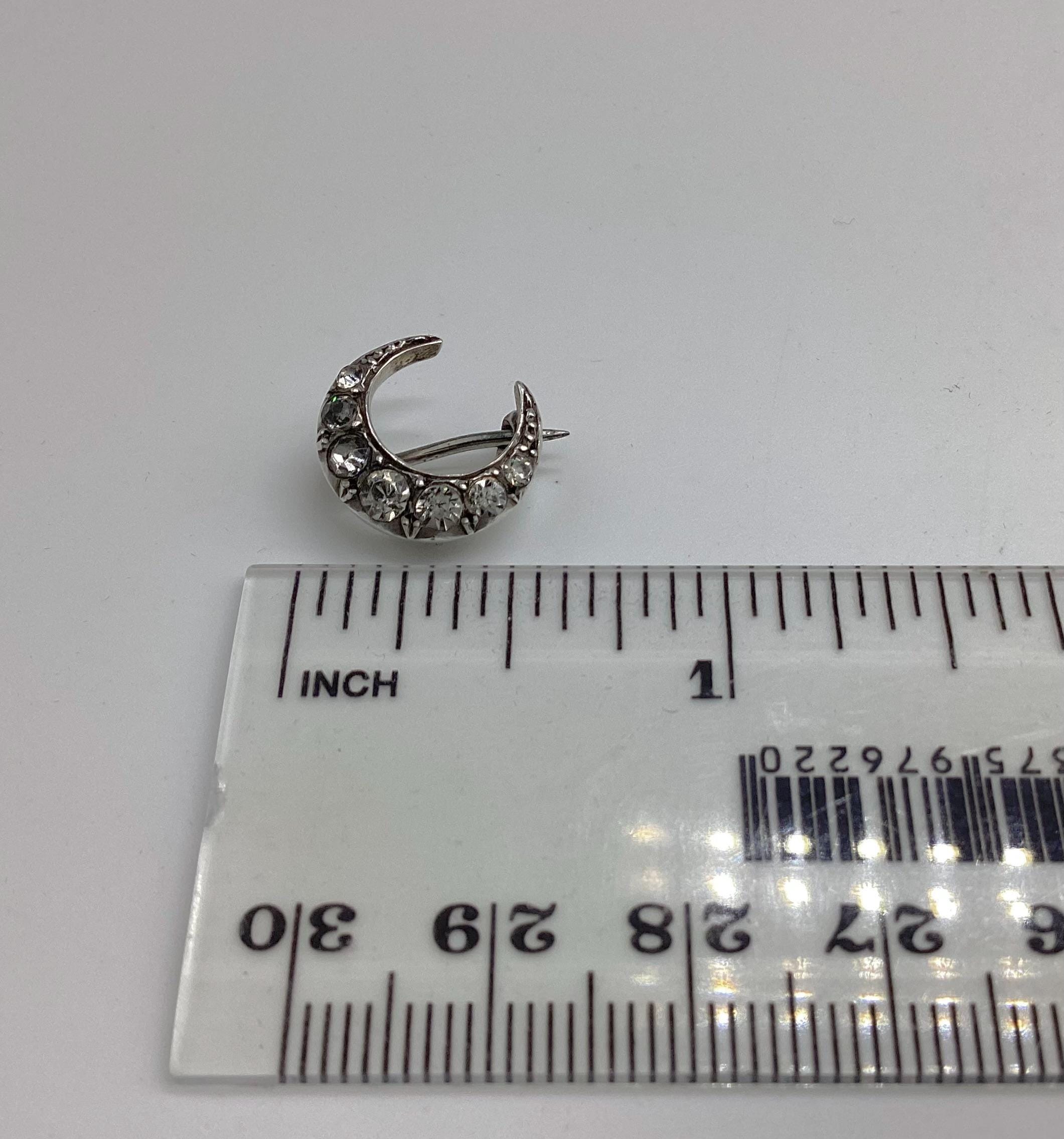 The most beautiful and tiniest Victorian brooch I have seen. Clean paste stones in a 925 silver crescent setting. This fantastically made brooch even has a loop for a safety chain or to convert to a necklace. A rare and desirable piece of antique silver jewellery.