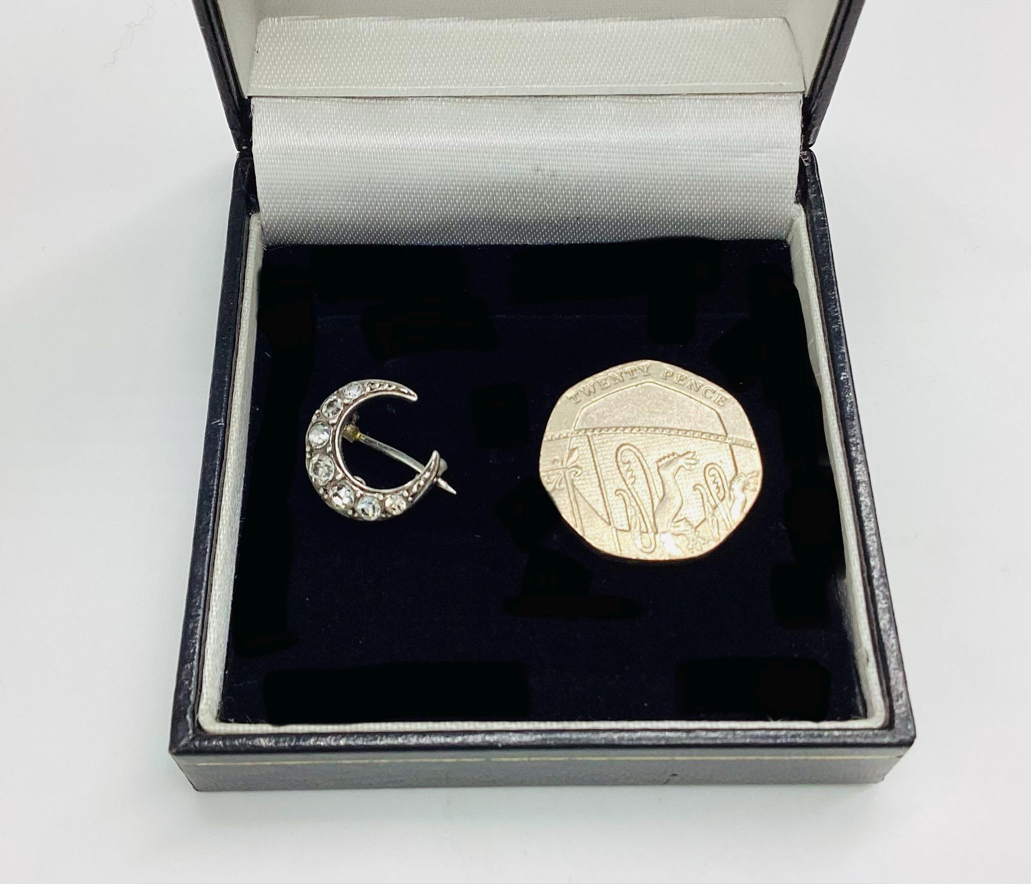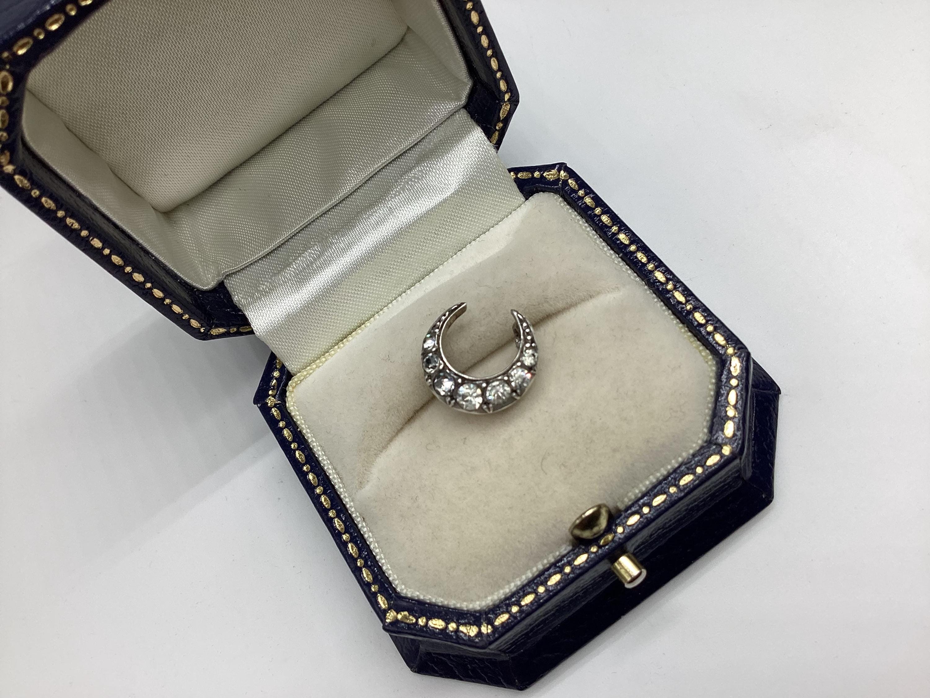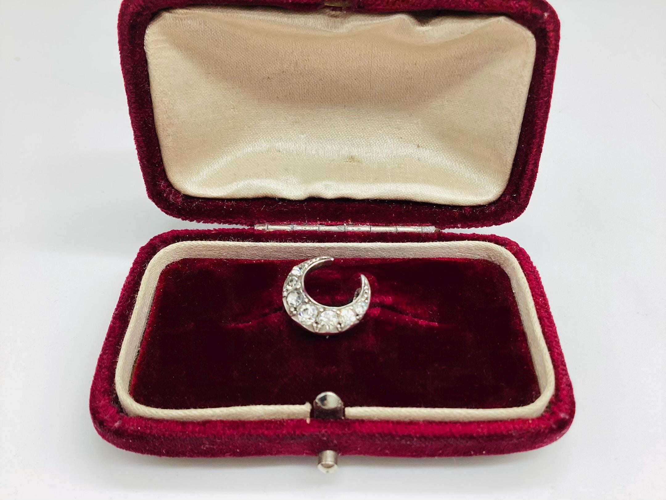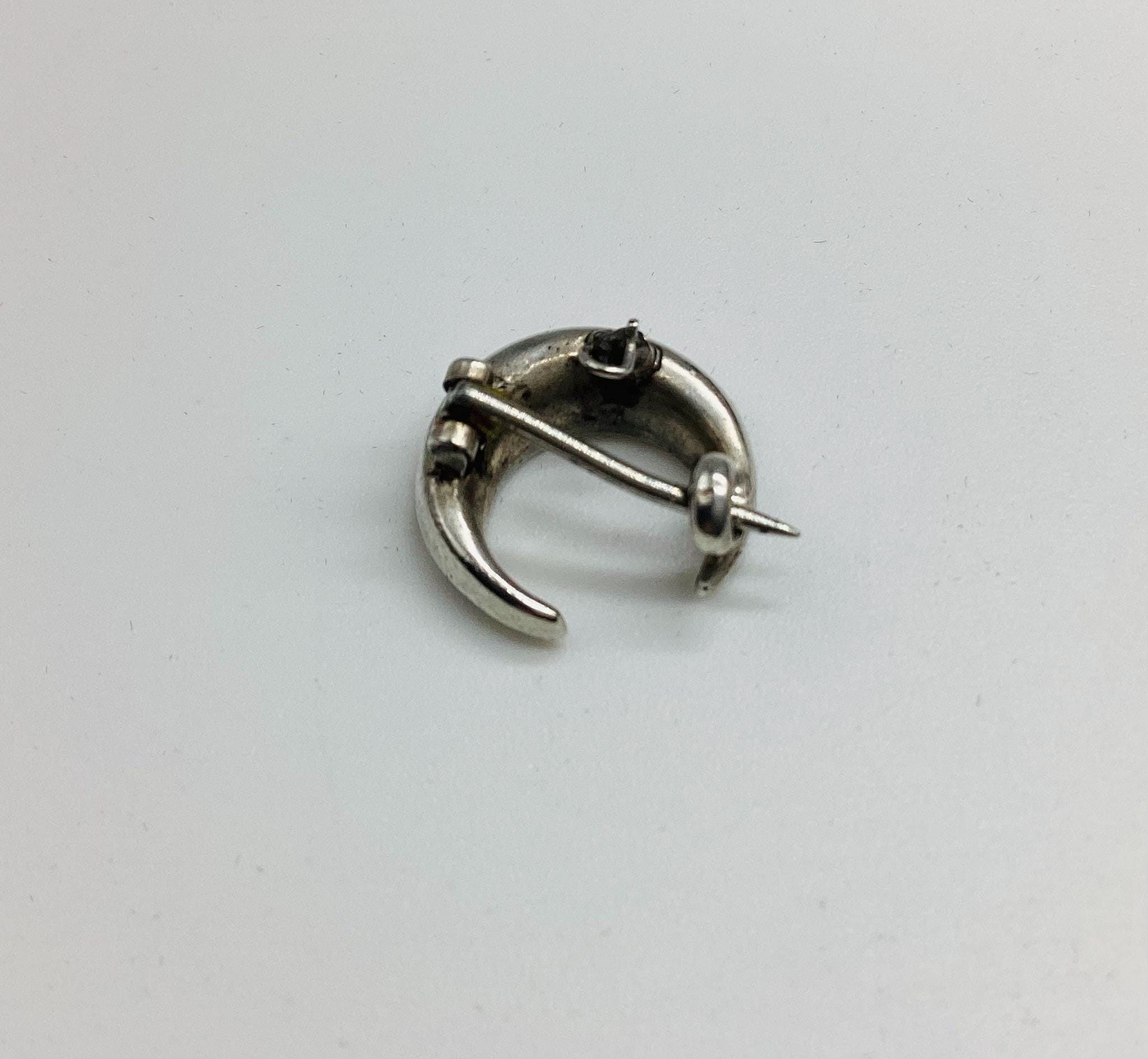 The most beautiful and tiniest Victorian brooch I have seen. Clean paste stones in a 925 silver crescent setting. This fantastically made brooch even has a loop for a safety chain or to convert to a necklace. A rare and desirable piece of antique silver jewellery.