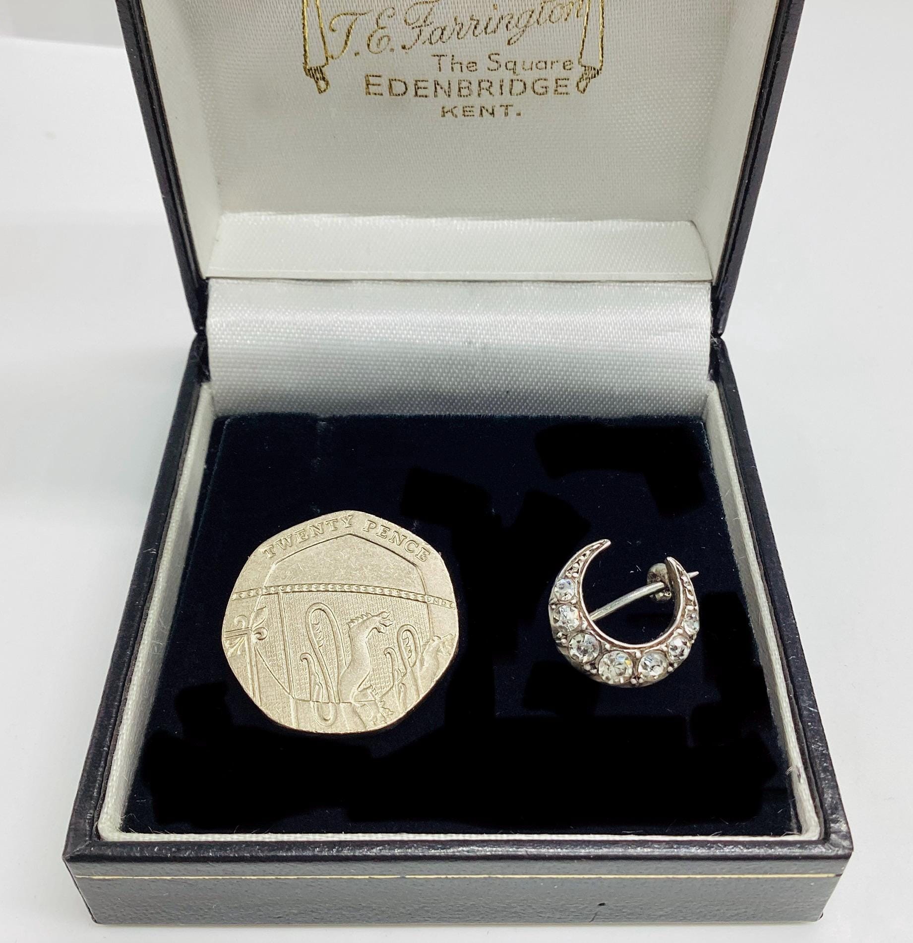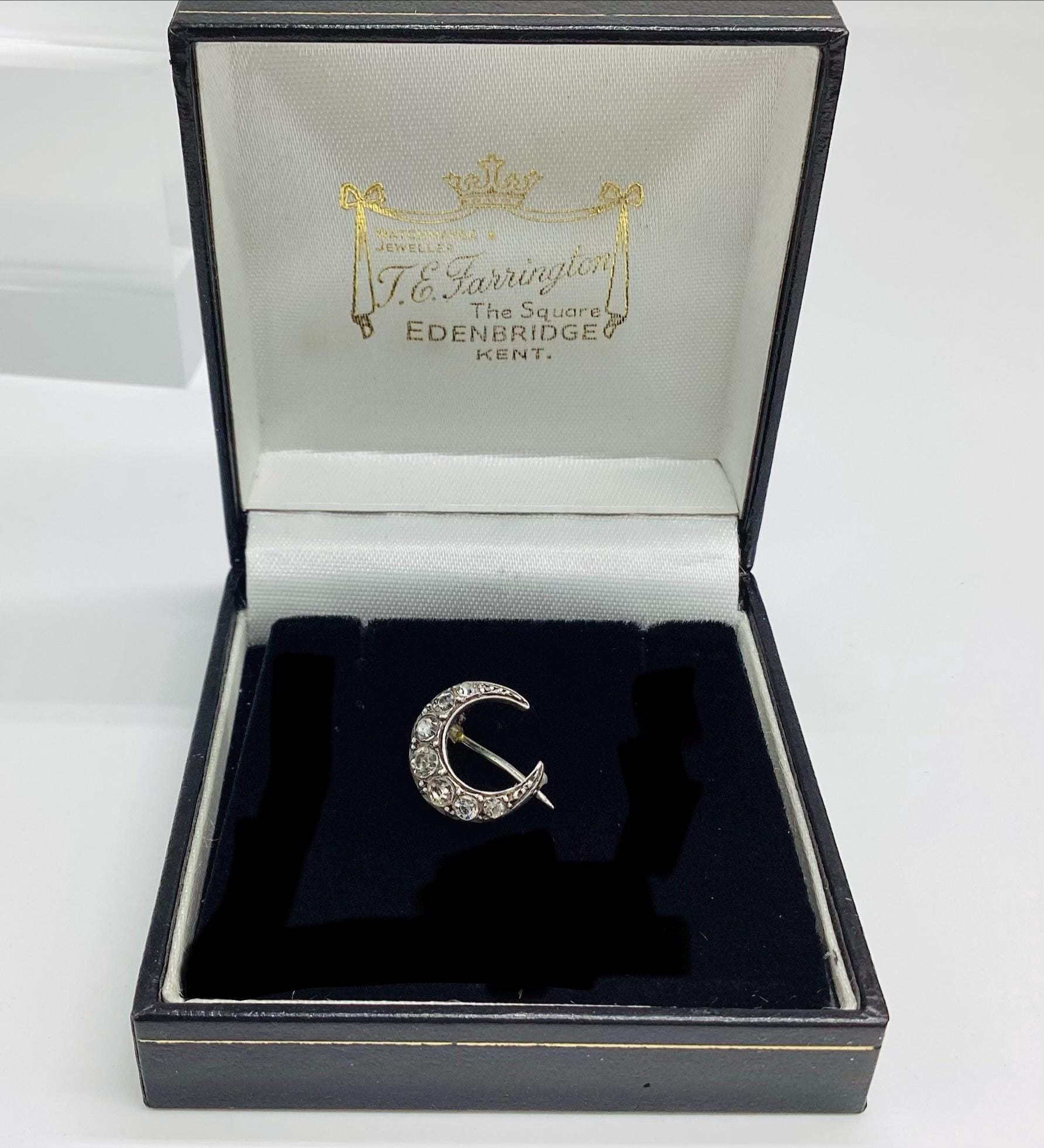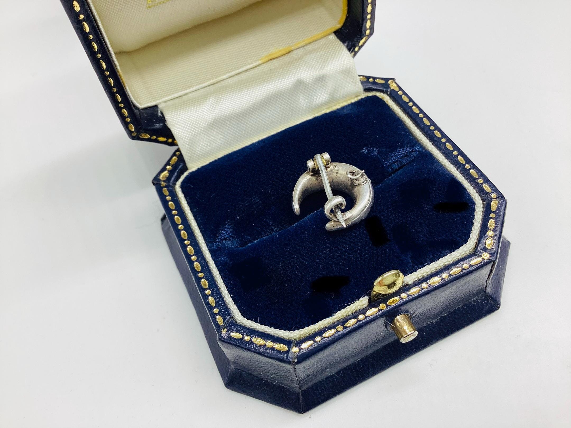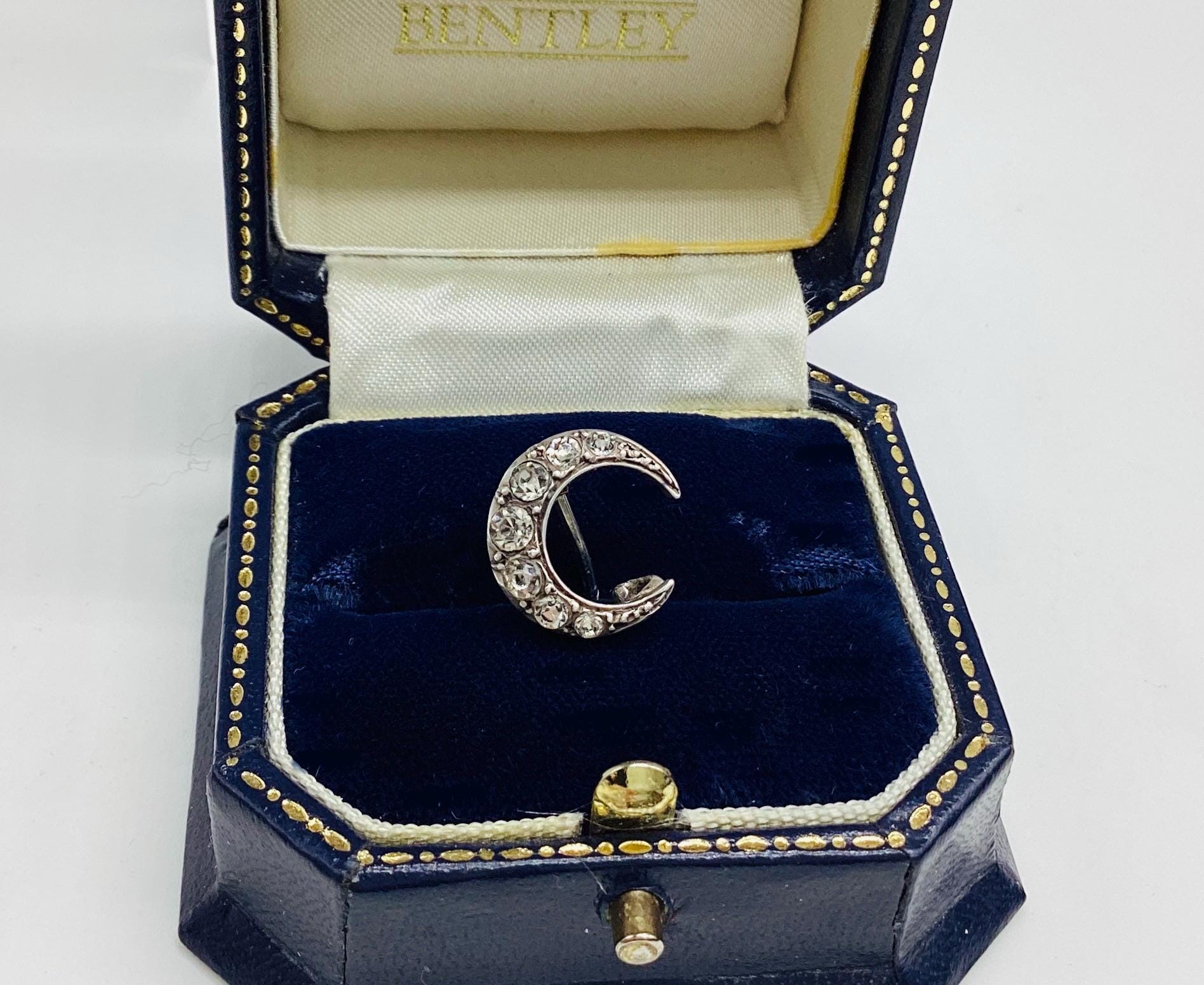 The most beautiful and tiniest Victorian brooch I have seen. Clean paste stones in a 925 silver crescent setting. This fantastically made brooch even has a loop for a safety chain or to convert to a necklace. A rare and desirable piece of antique silver jewellery.