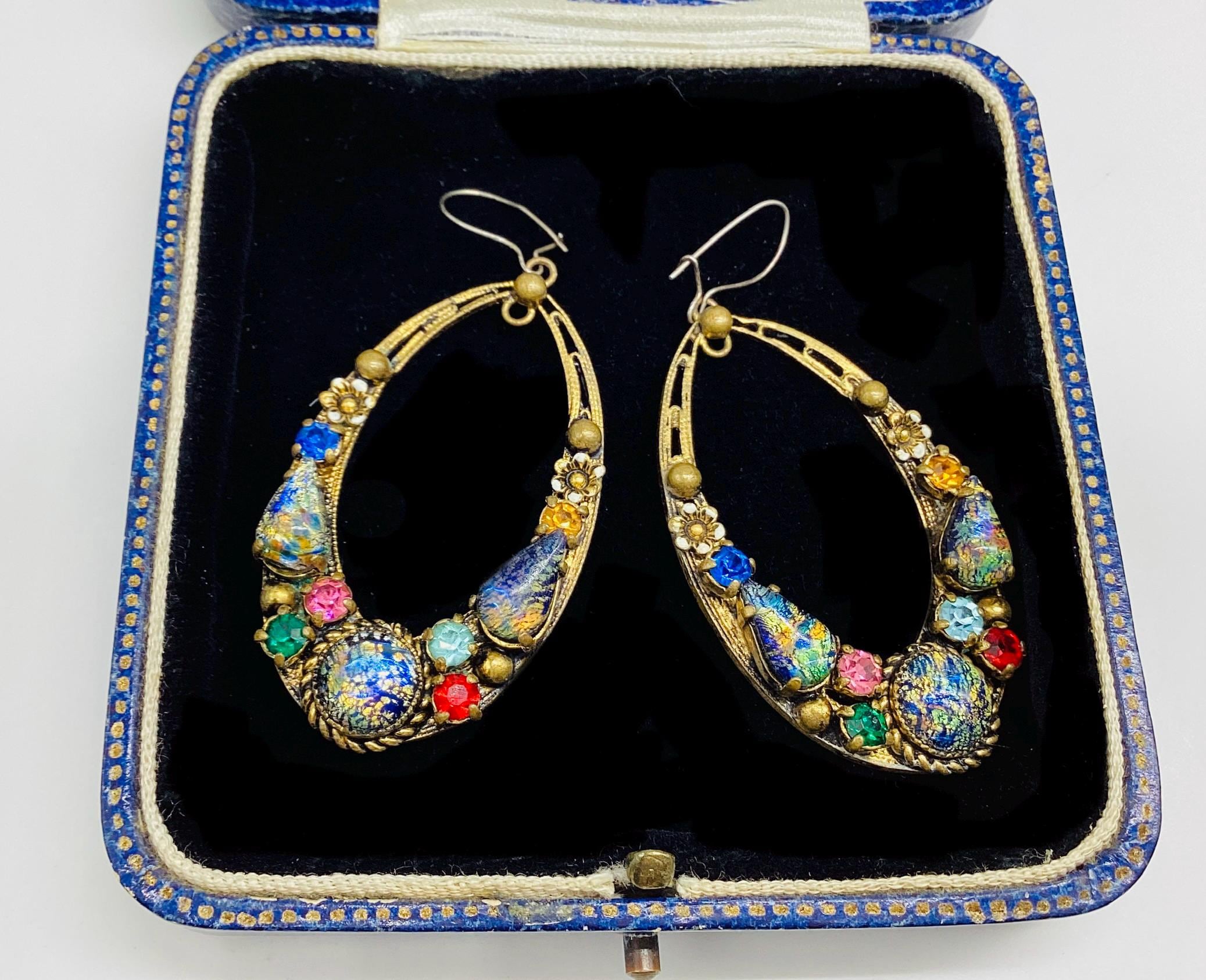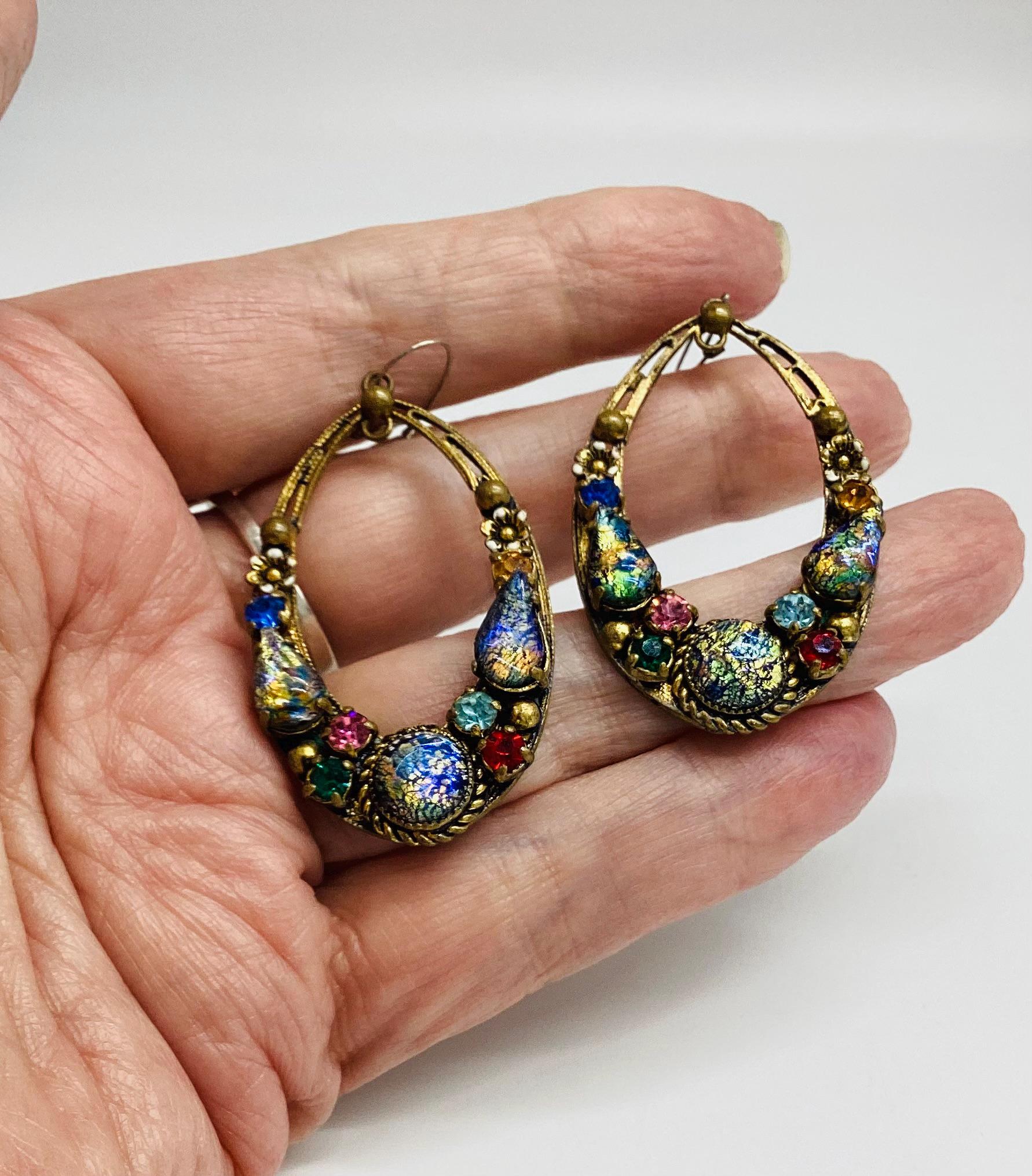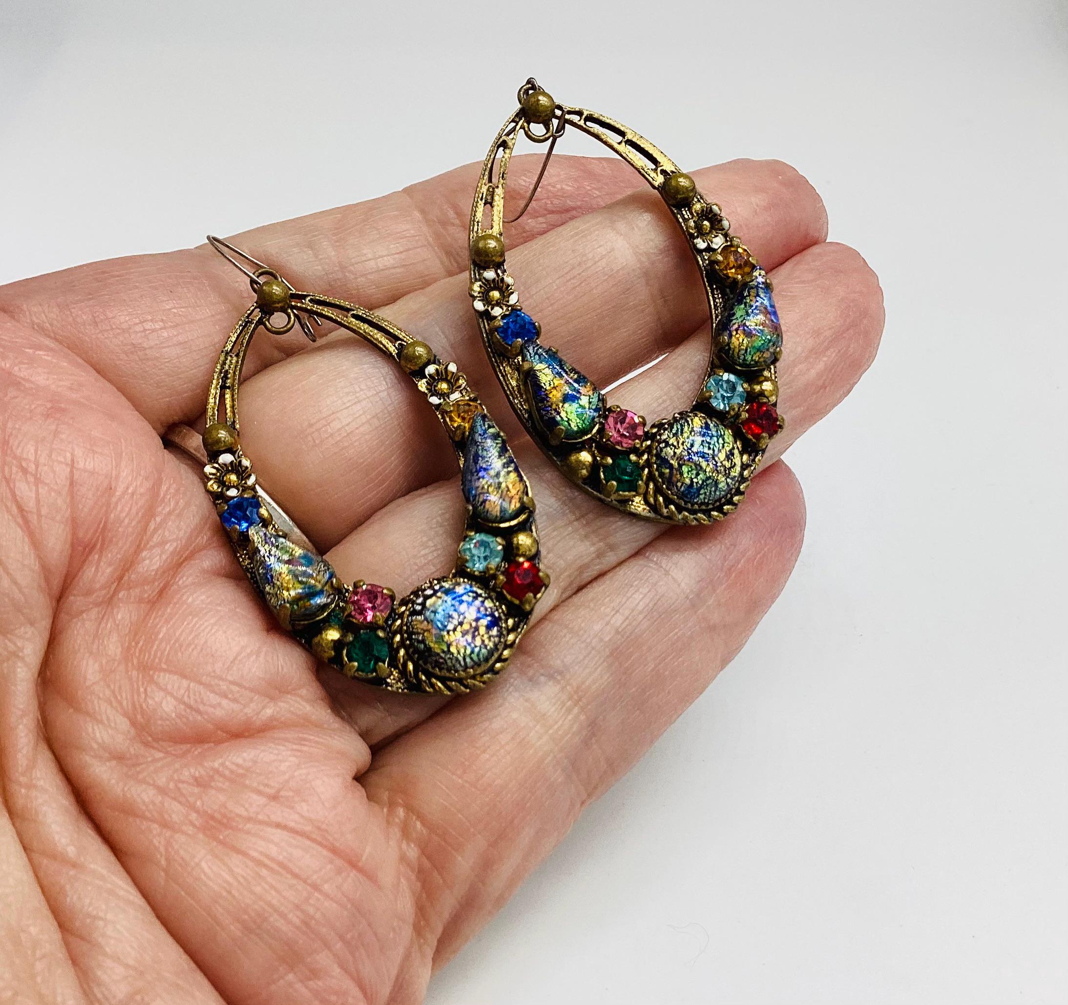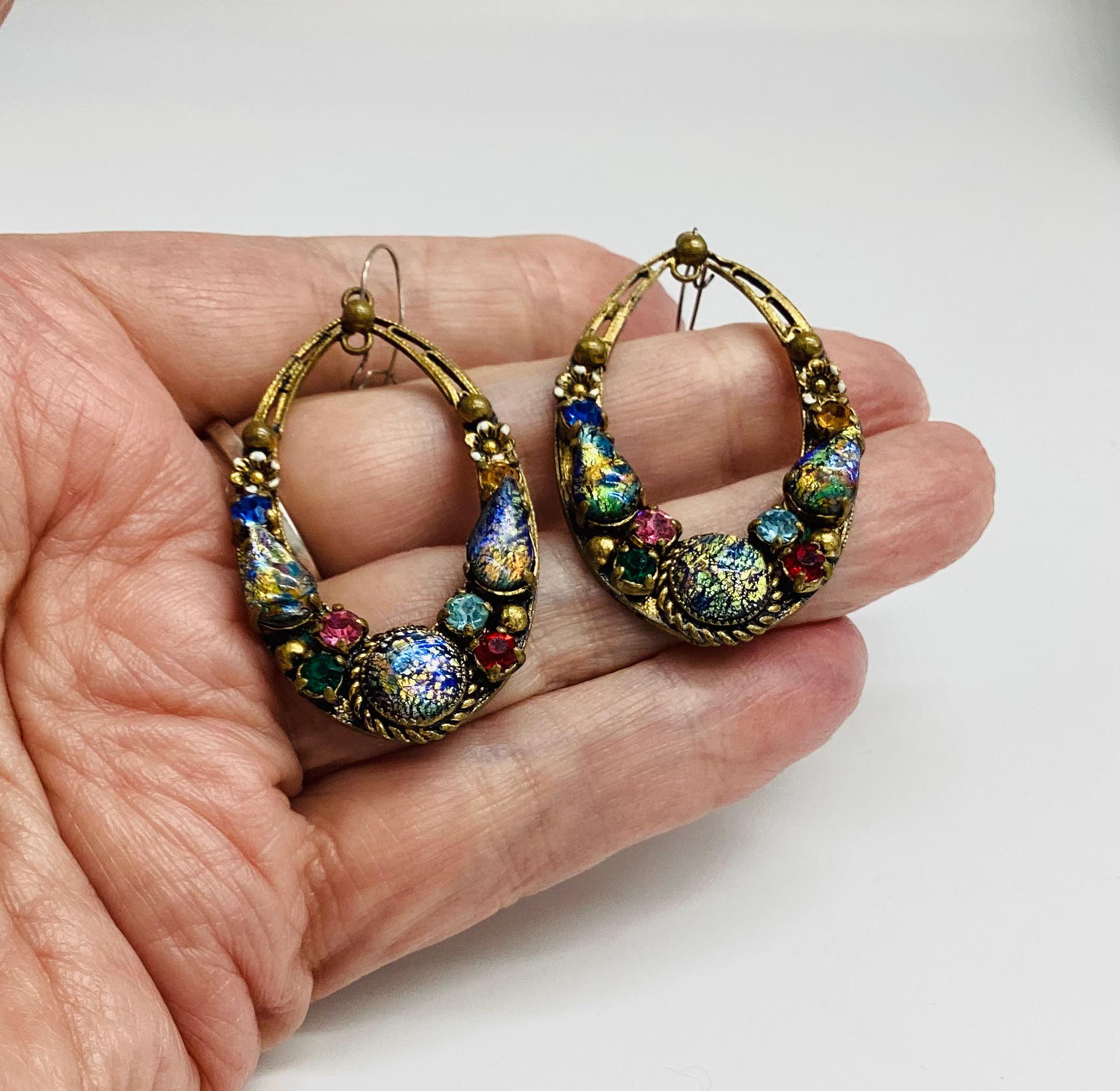 Czech glass earrings seem to be quite hard to find and these are outstanding. Multicoloured glass stones stones set in brass filigree hoops. One of the particular attractions of these earrings is the beautiful and rare dragons breath stones. These are an outstanding pair of collectible and very wearable vintage earrings.