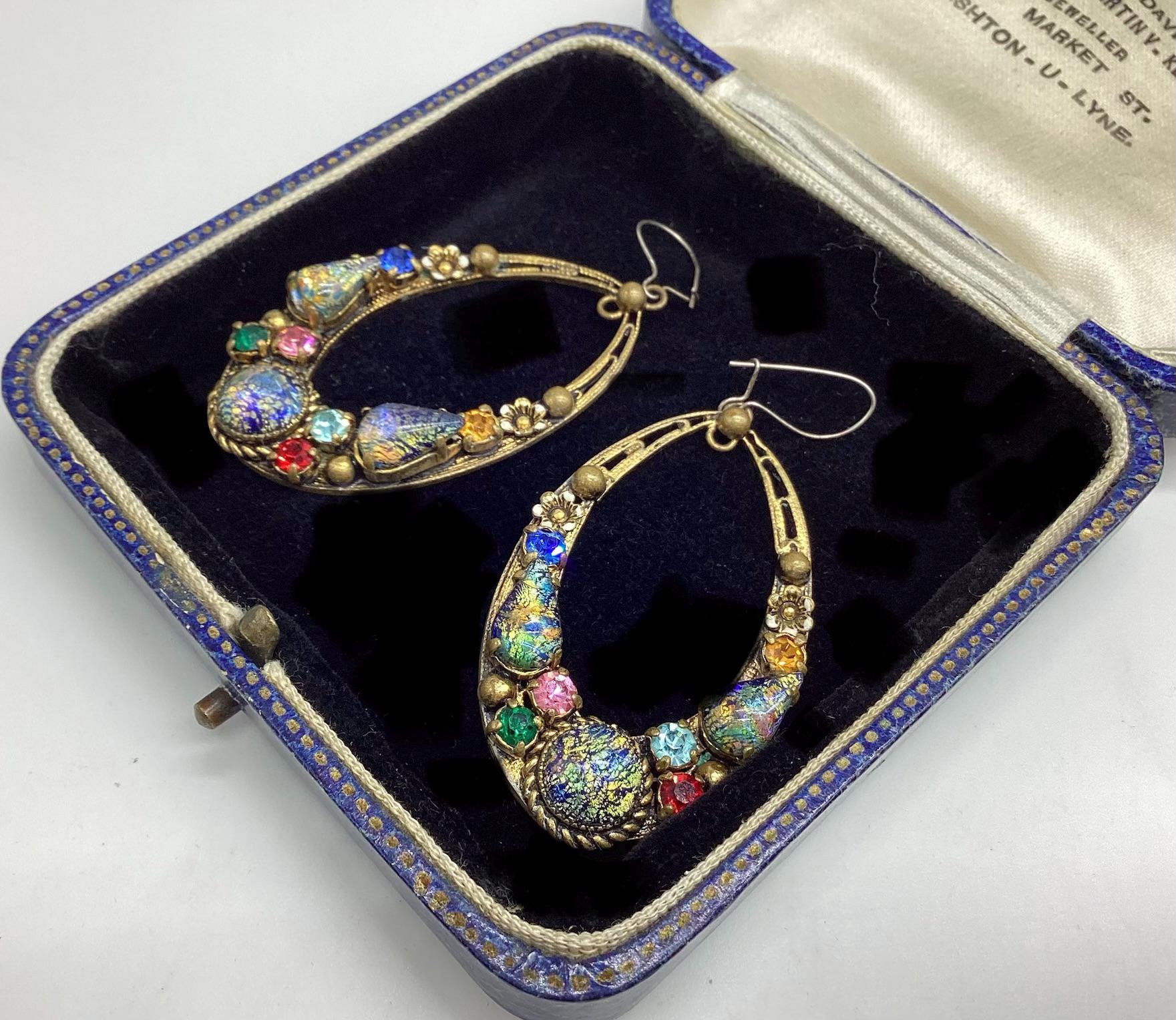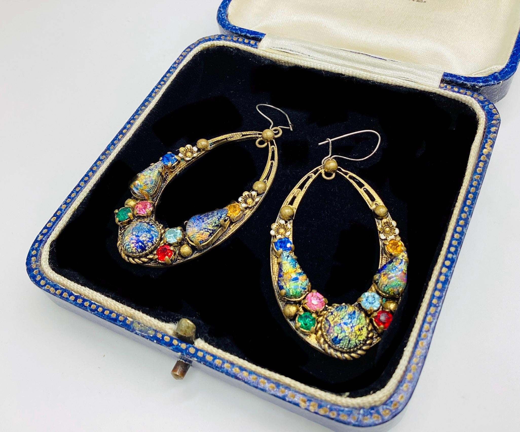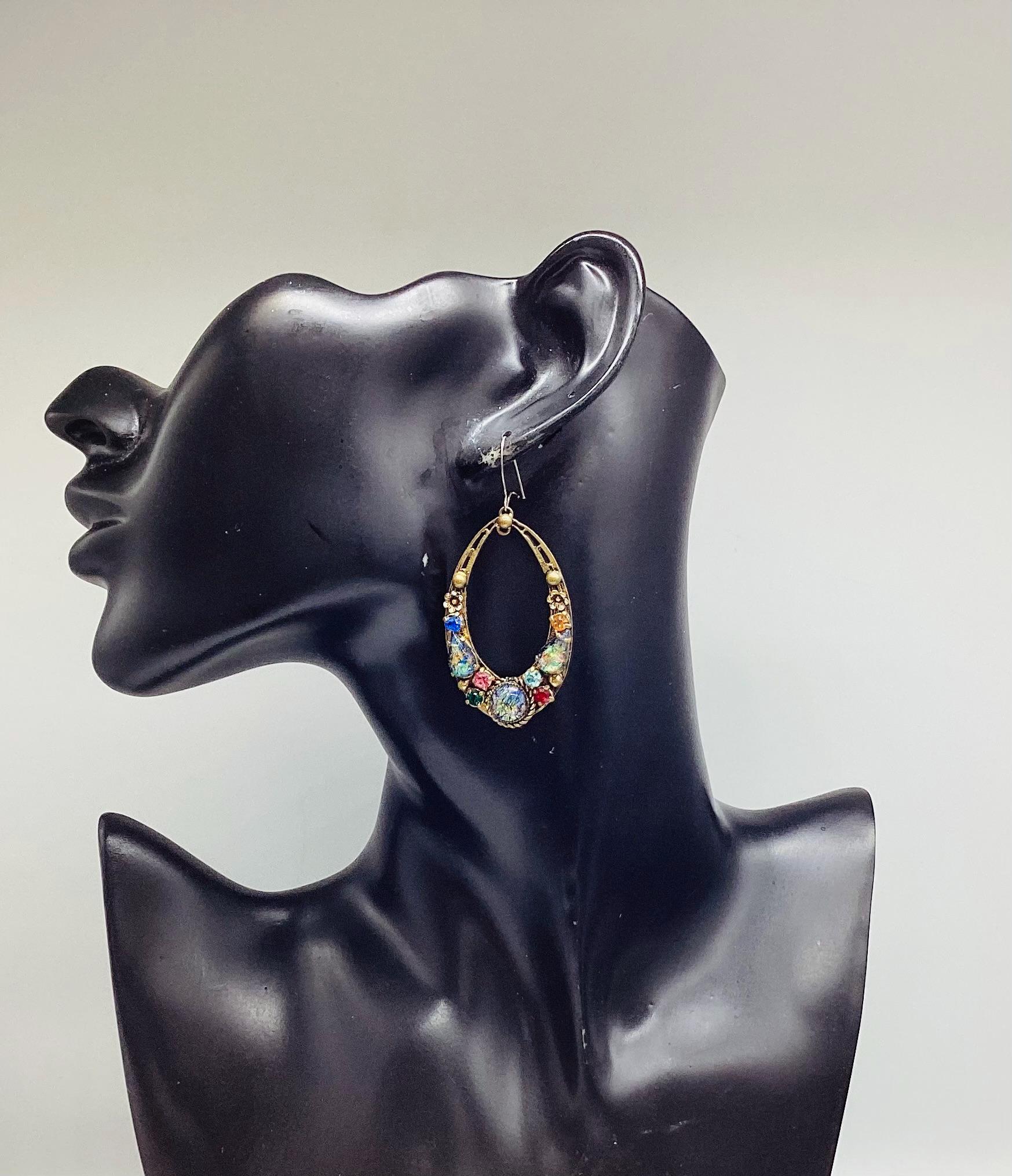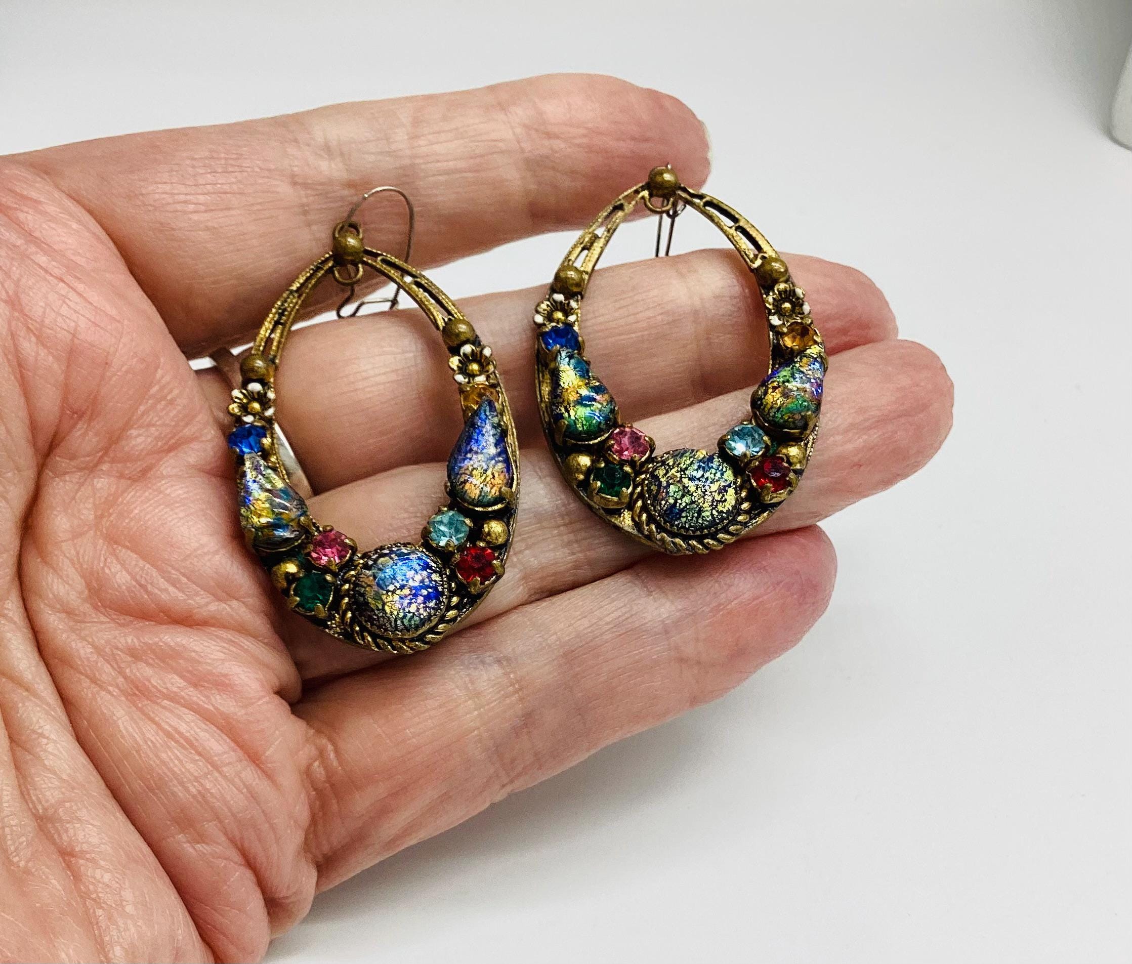Czech glass earrings seem to be quite hard to find and these are outstanding. Multicoloured glass stones stones set in brass filigree hoops. One of the particular attractions of these earrings is the beautiful and rare dragons breath stones. These are an outstanding pair of collectible and very wearable vintage earrings.