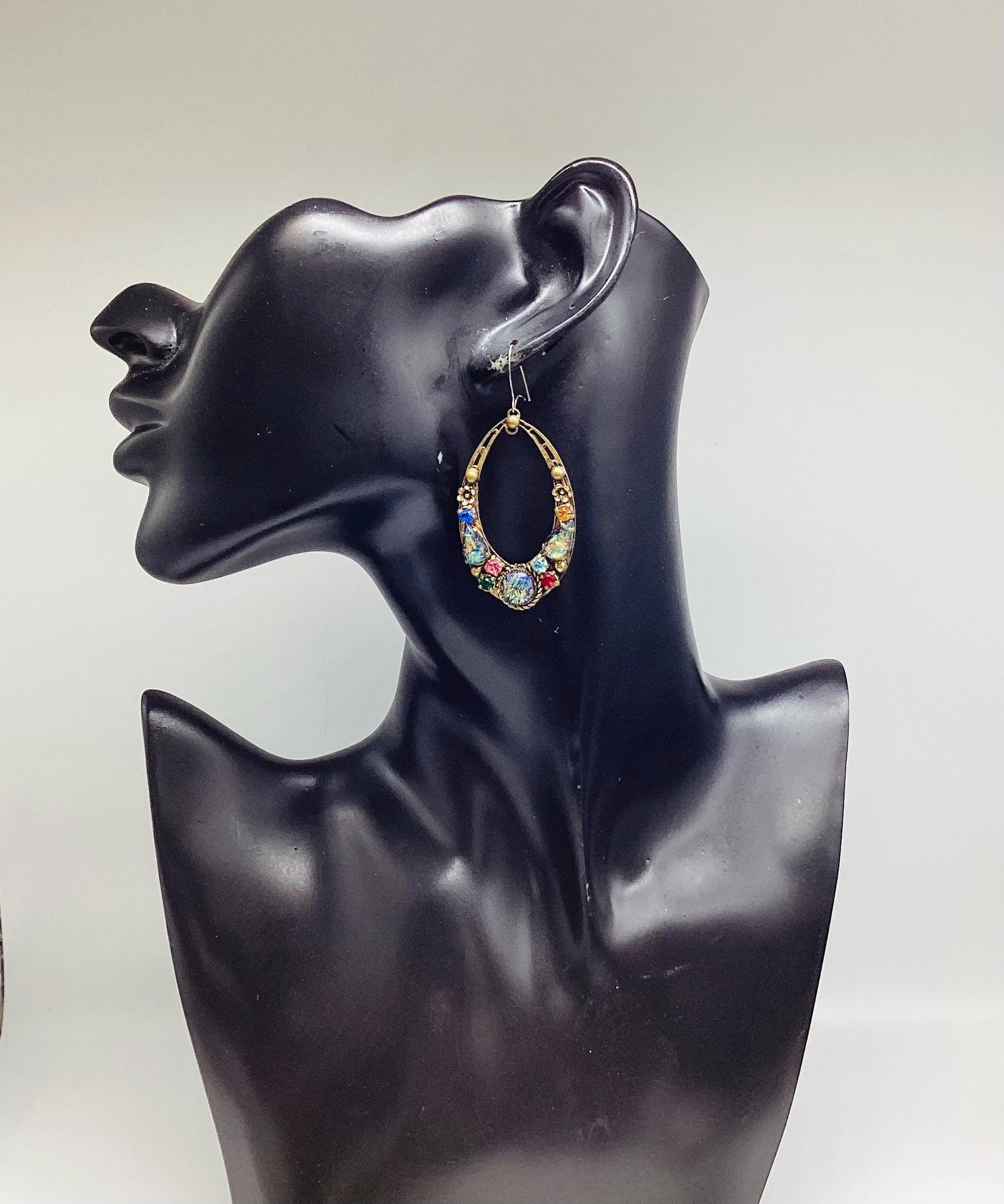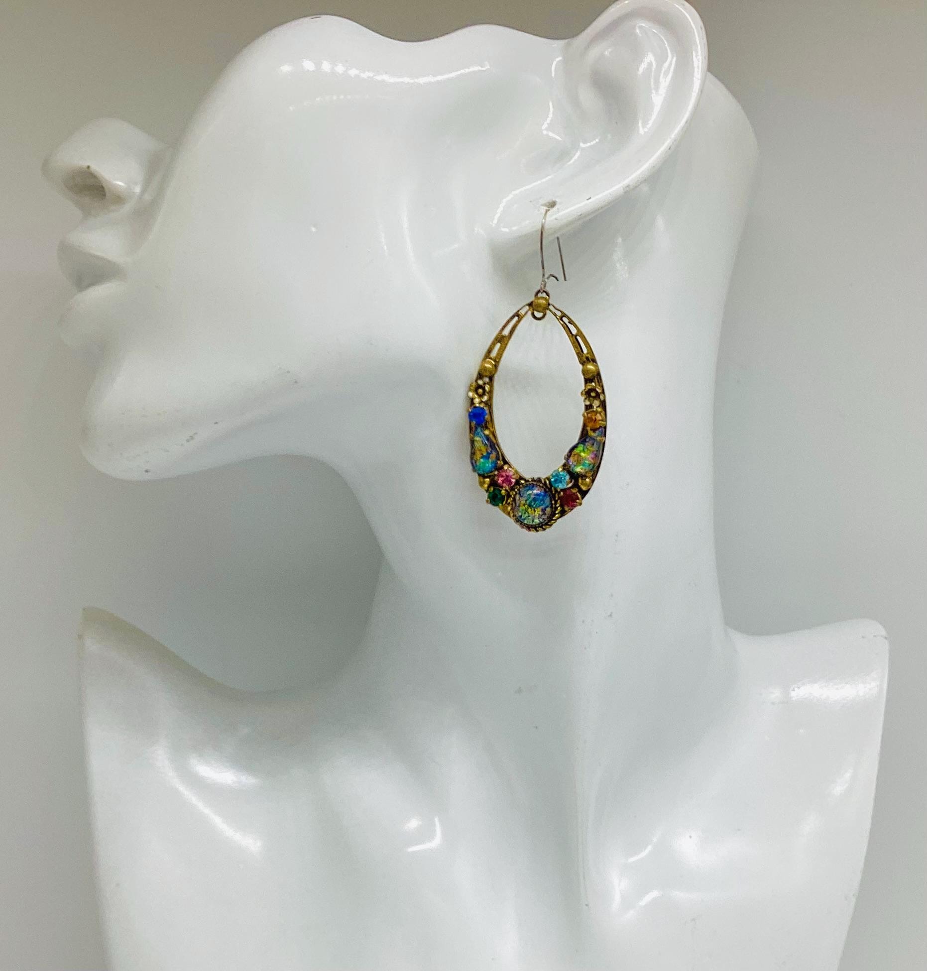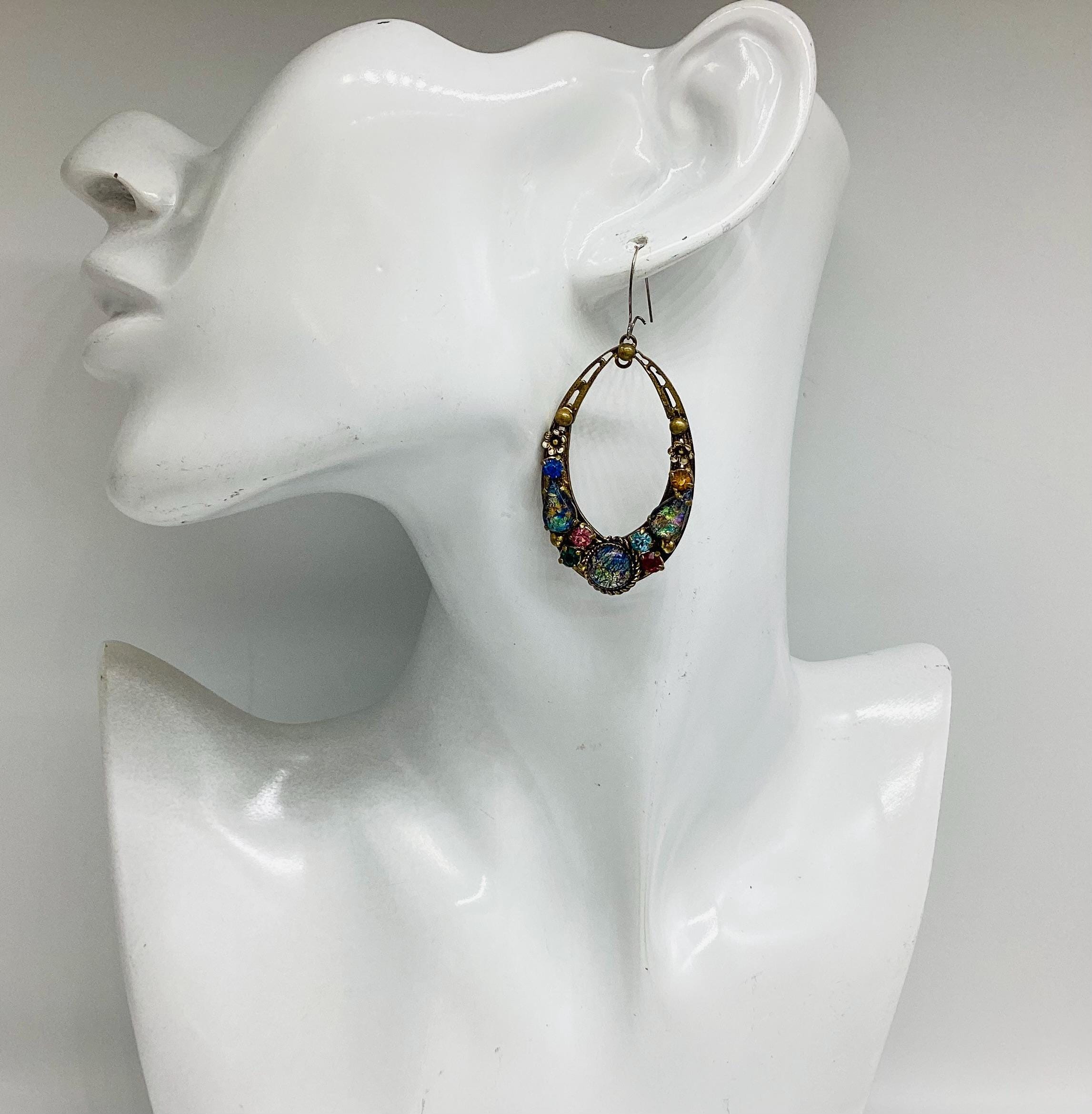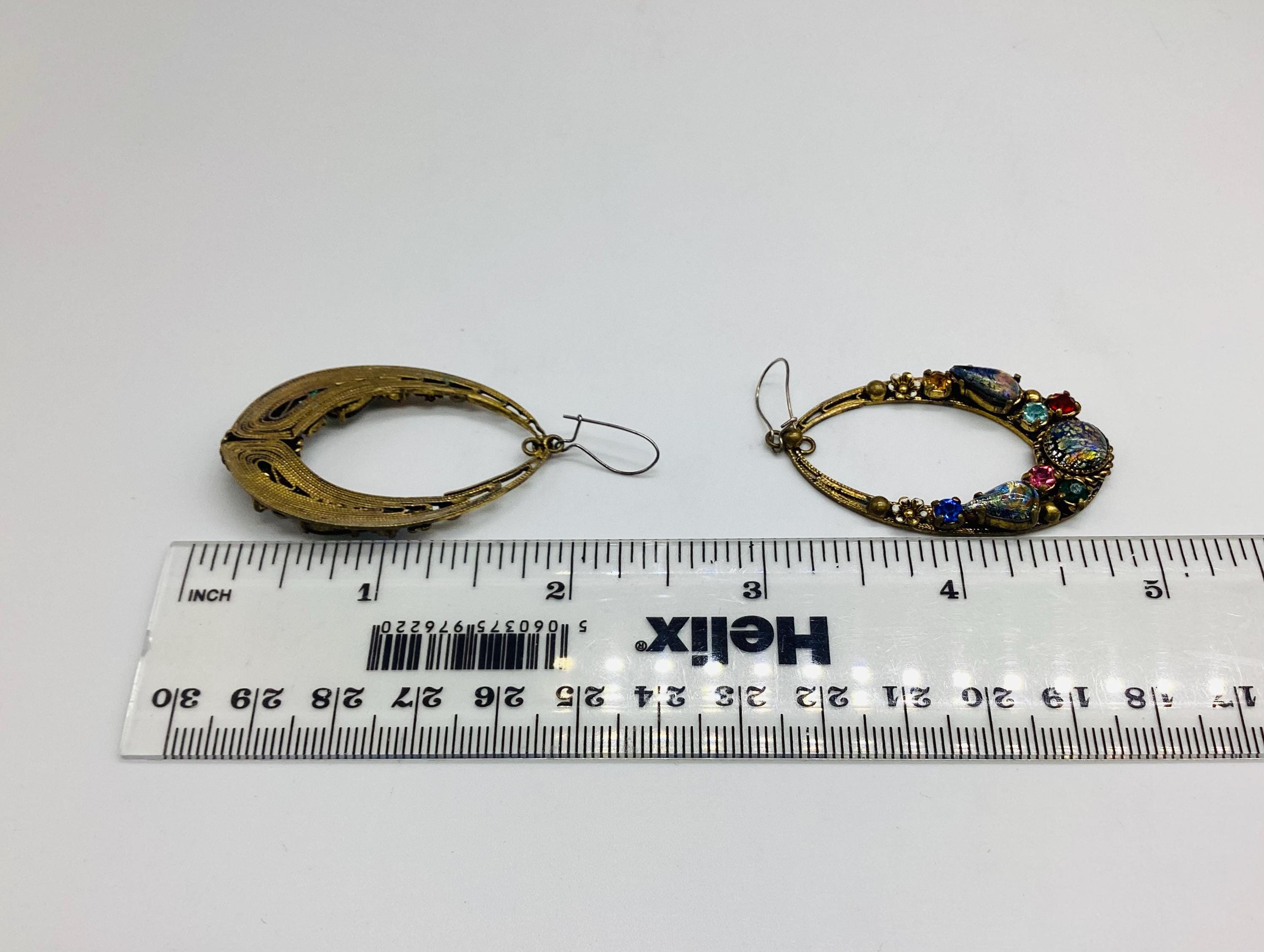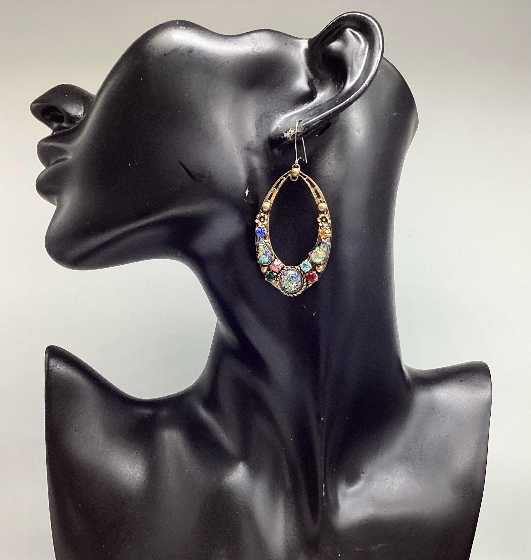 Czech glass earrings seem to be quite hard to find and these are outstanding. Multicoloured glass stones stones set in brass filigree hoops. One of the particular attractions of these earrings is the beautiful and rare dragons breath stones. These are an outstanding pair of collectible and very wearable vintage earrings.