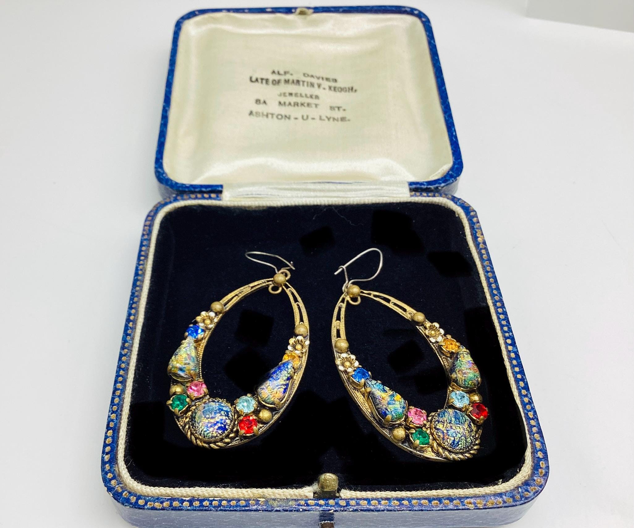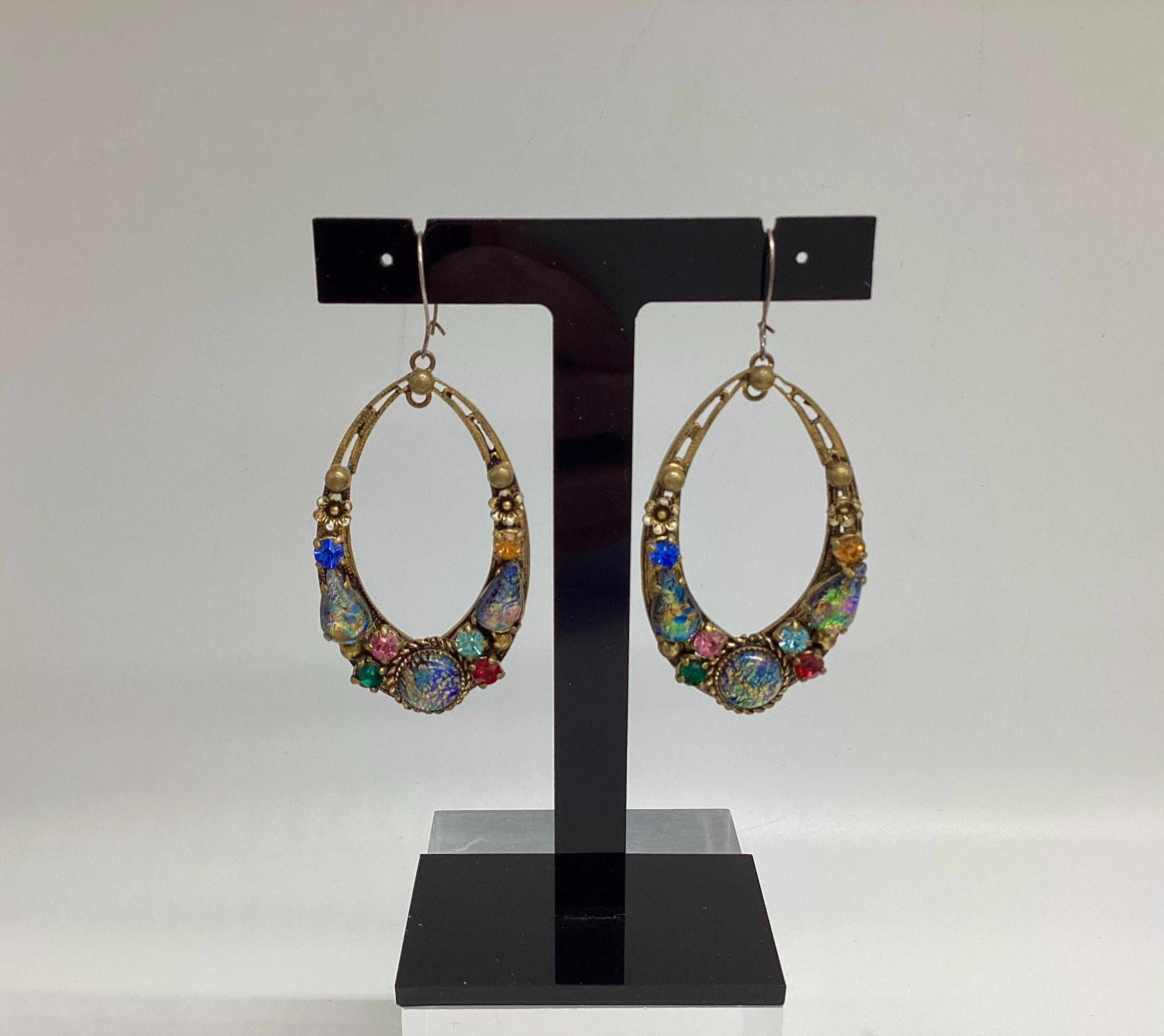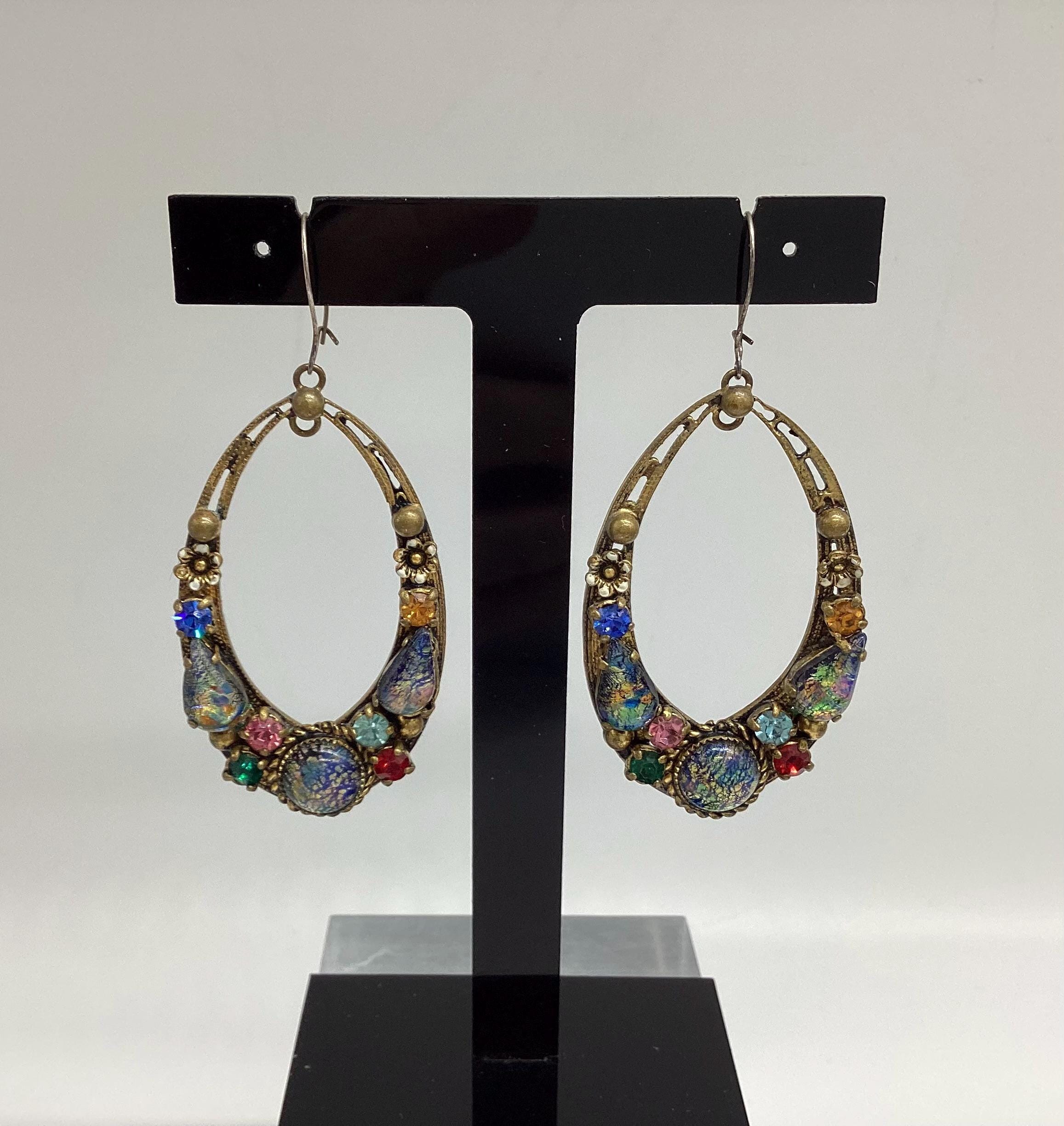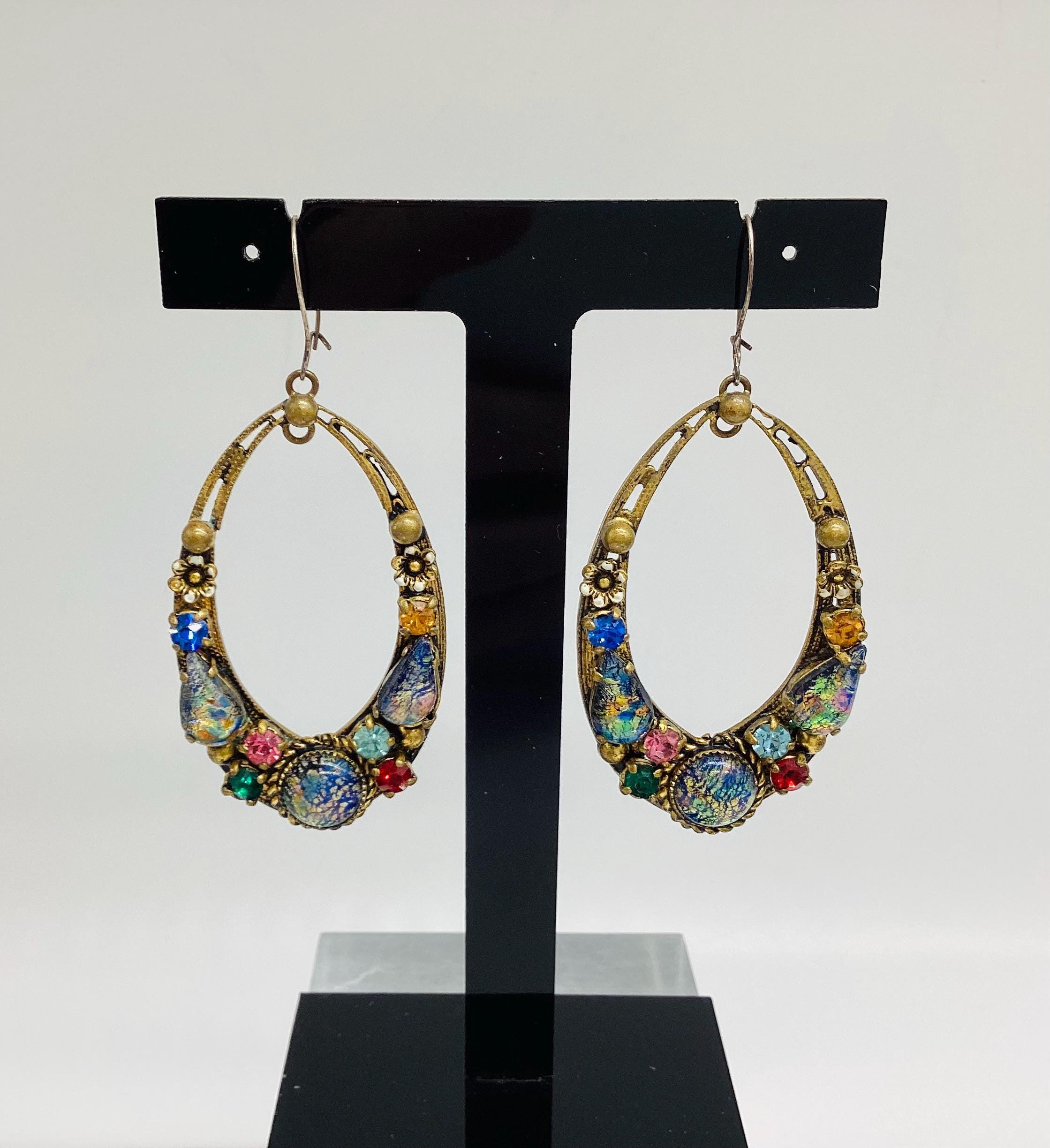 Czech glass earrings seem to be quite hard to find and these are outstanding. Multicoloured glass stones stones set in brass filigree hoops. One of the particular attractions of these earrings is the beautiful and rare dragons breath stones. These are an outstanding pair of collectible and very wearable vintage earrings.